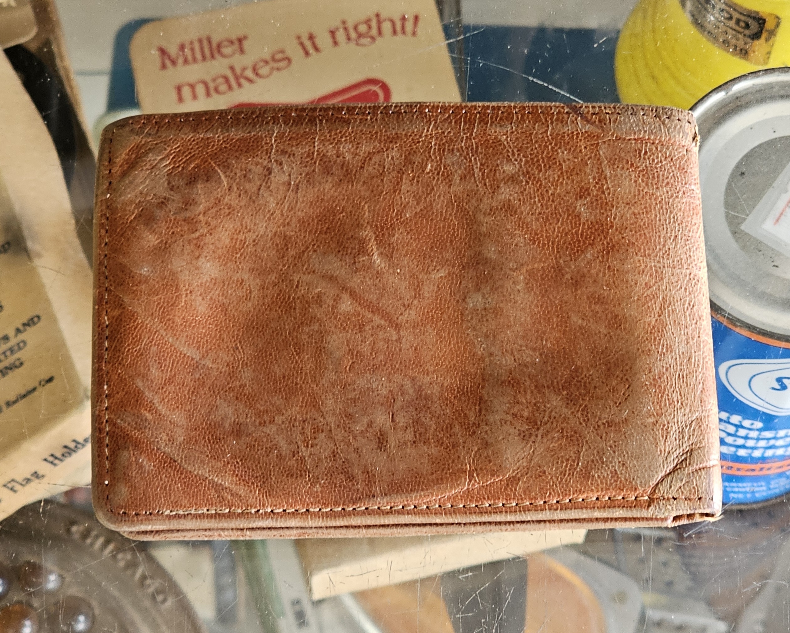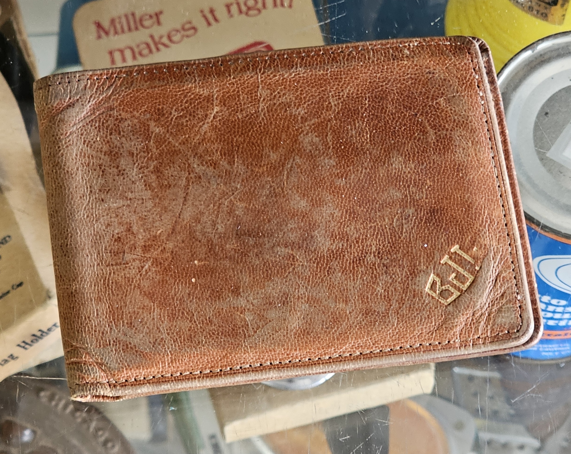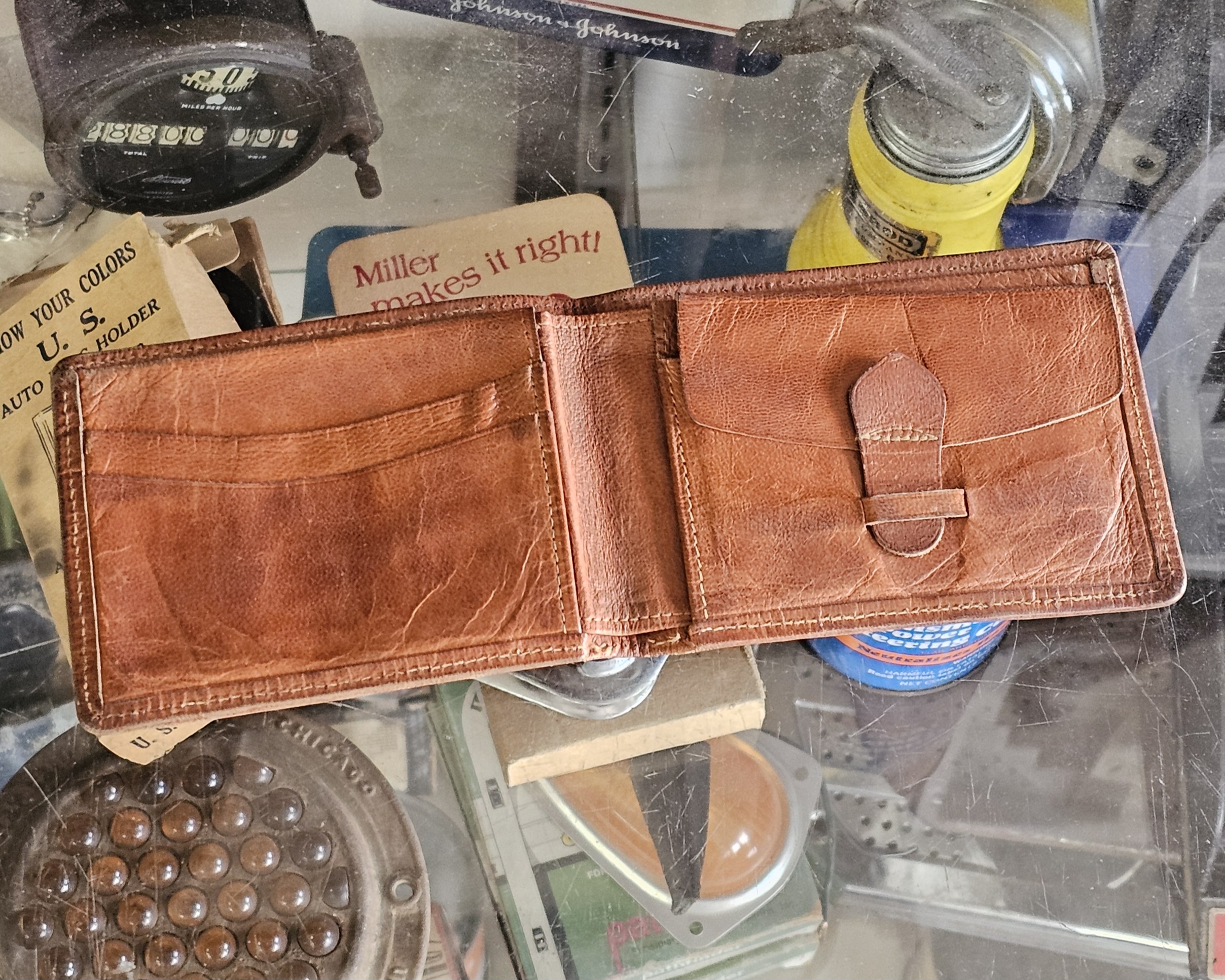 1940s Brown Leather Wallet This is an original old wallet in very good shape for the age. Has initials BJL on front corner. Inside has 3 pockets and a little leather clasp pocket and the paper money area. For someone who prefers vintage to modern copies.