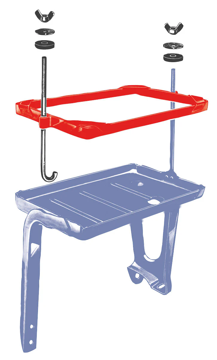 1941-48 Battery Hold Down Washer Kit  Also fits 1941-47 Pickup.  With thick rubber cushion washers, wing nuts and flat washers.  One kit does both sides and includes a hold-down hook.  Let Grumps-Garage help with your early Ford and American goods for all areas of your home.
