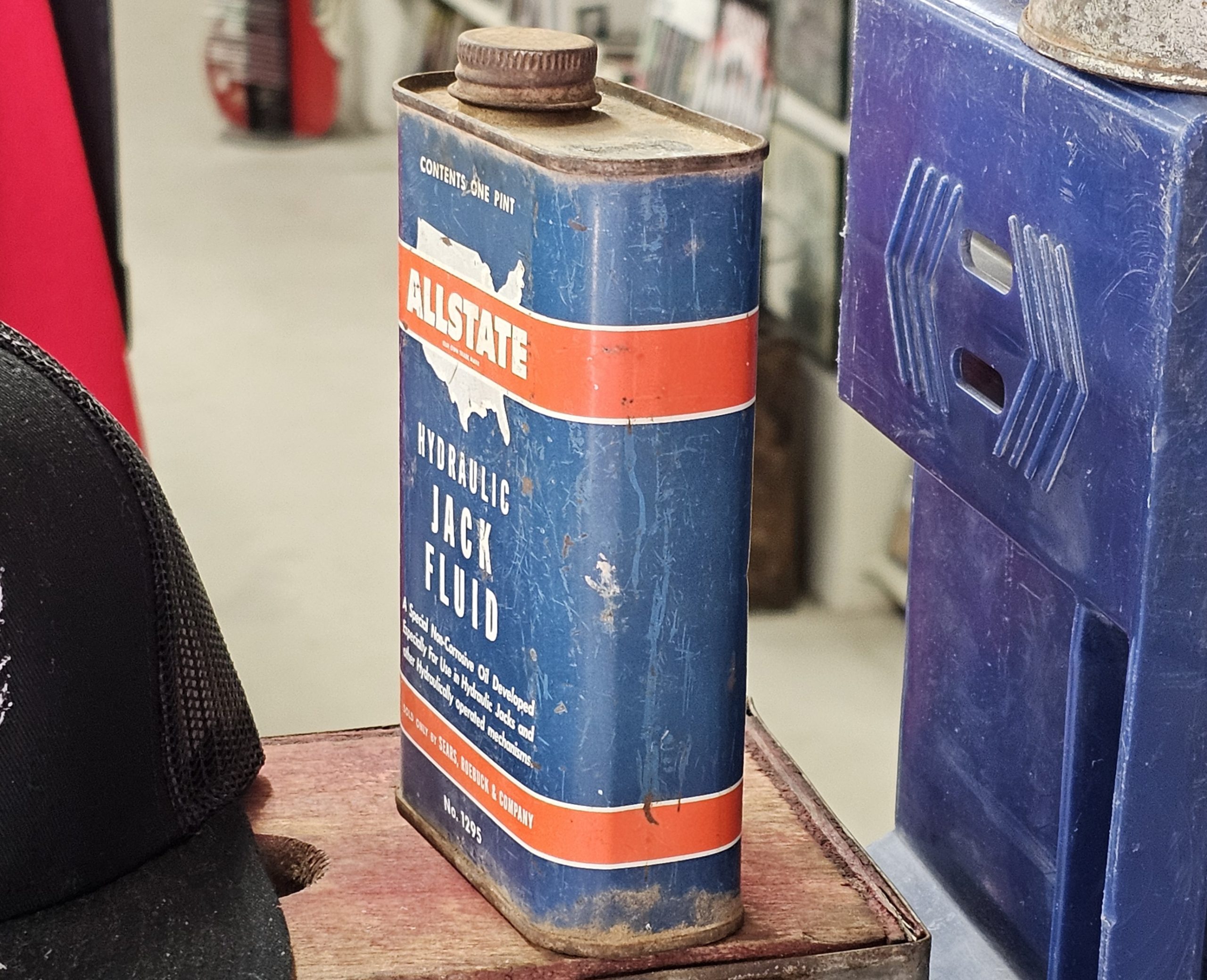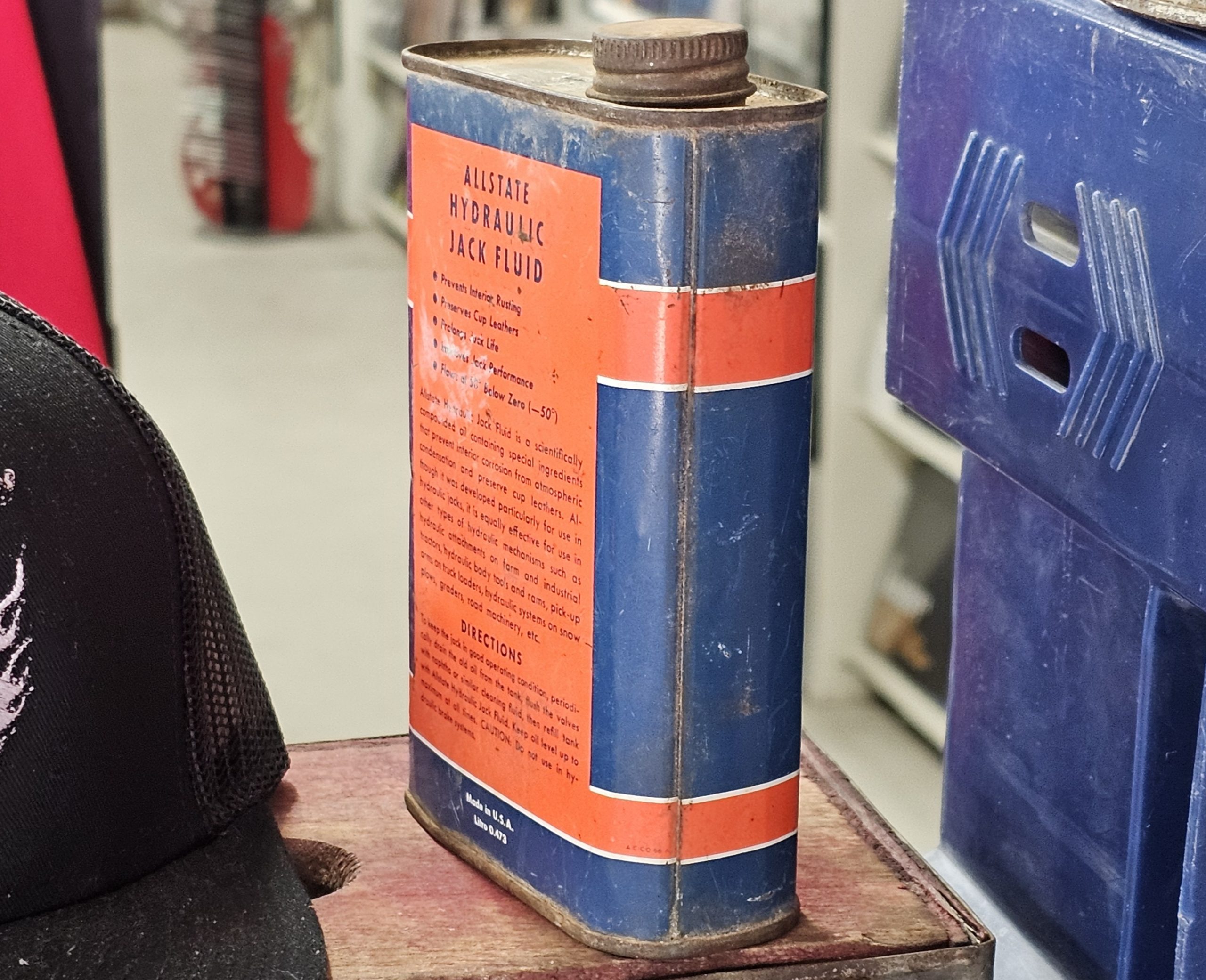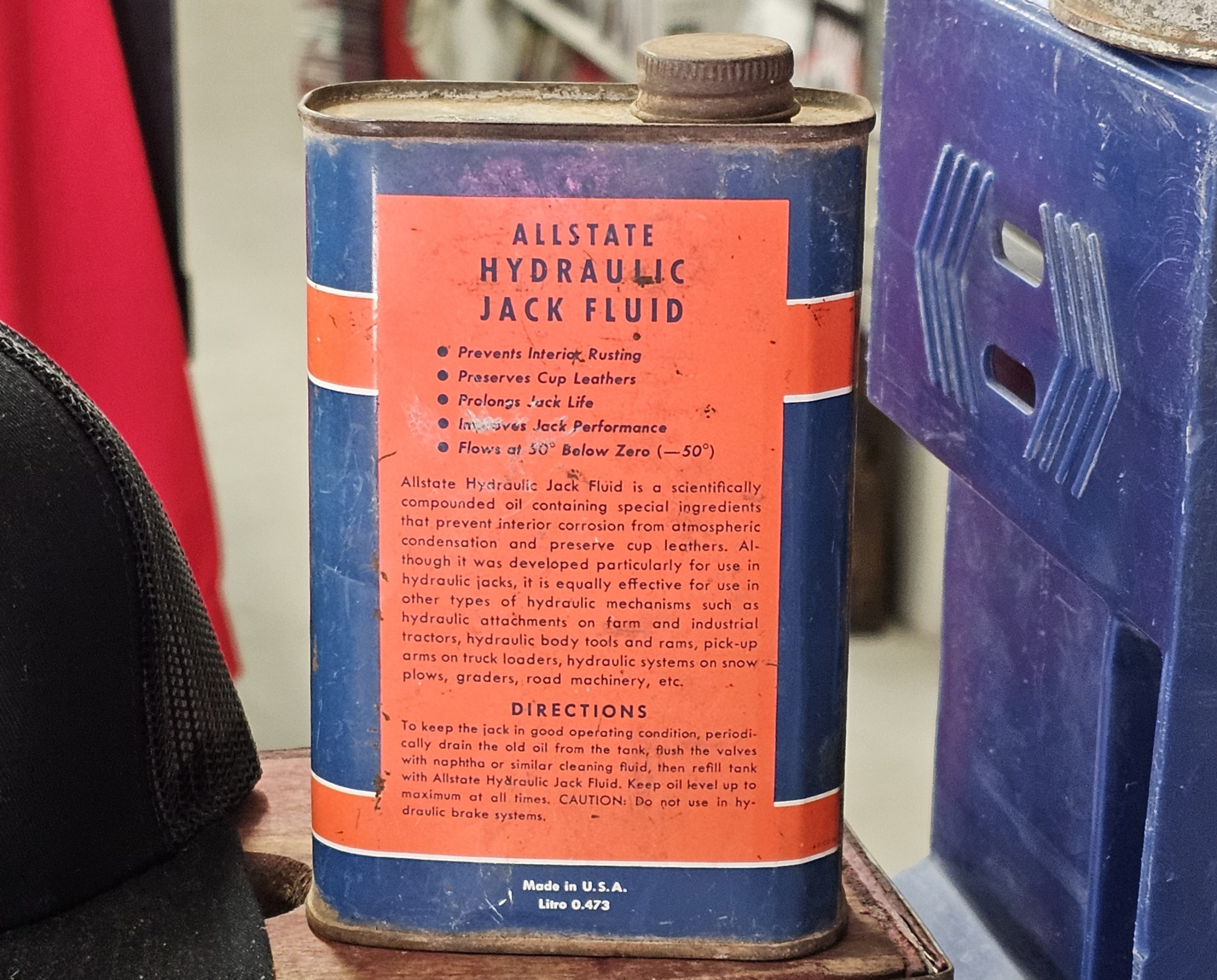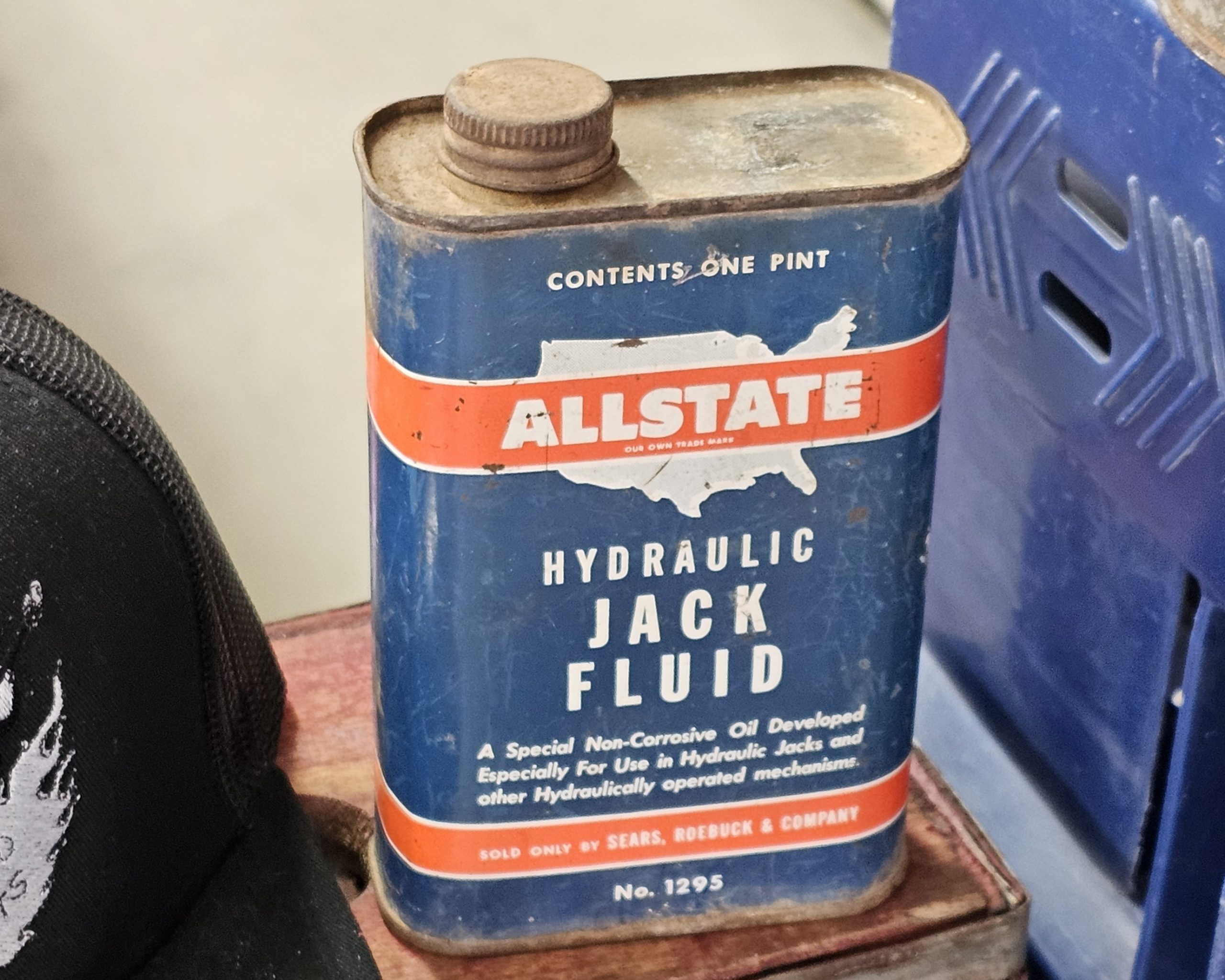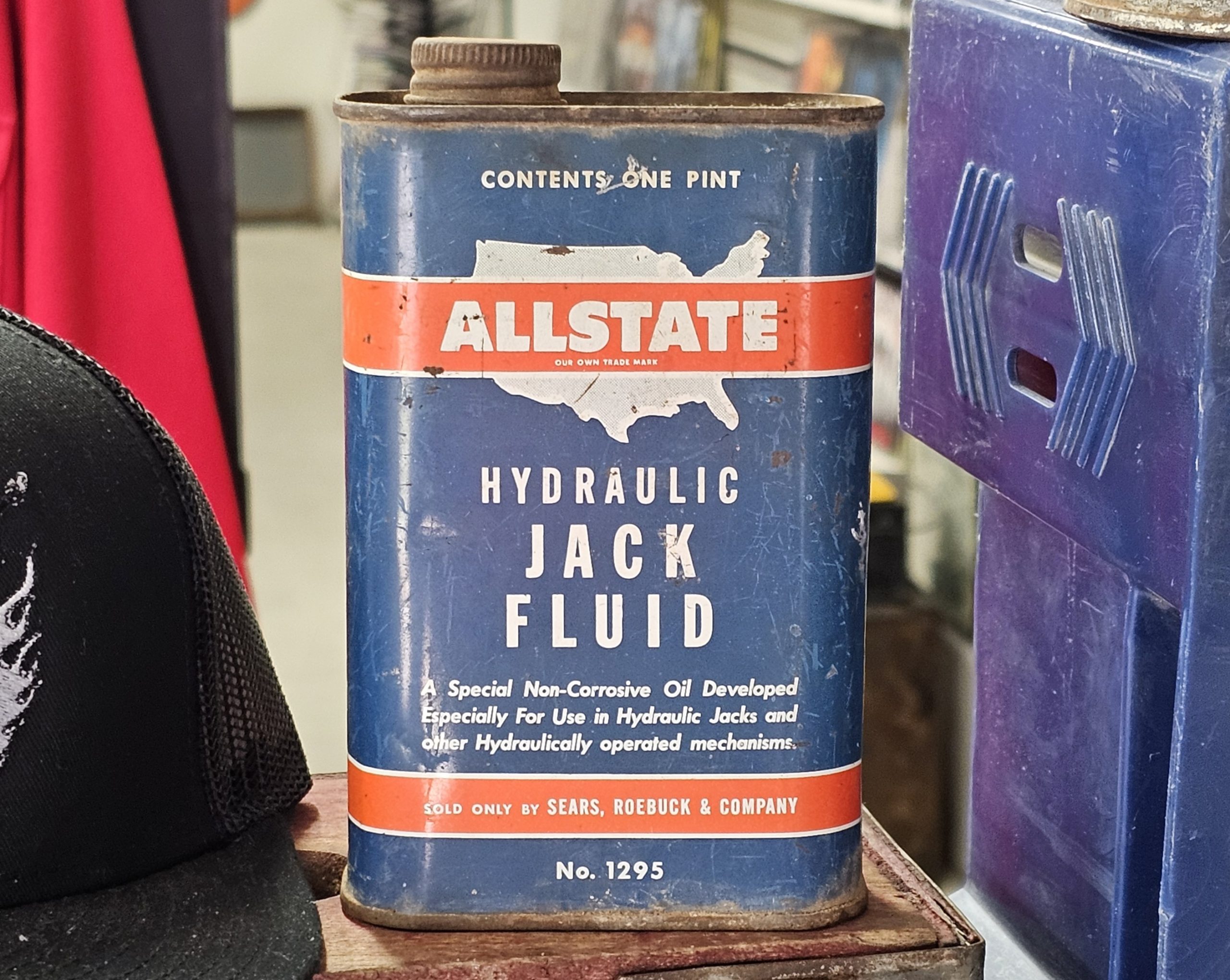 Allstate Hydraulic Jack Fluid Can Good shape with minimal scratching around. Originally sold by Sears, Roebuck & Company. Allstate Hydraulic Jack Fluid, No. 1295, in a one-pint metal can. A special non-corrosive oil developed for use in hydraulic jacks and other hydraulically operated mechanisms.