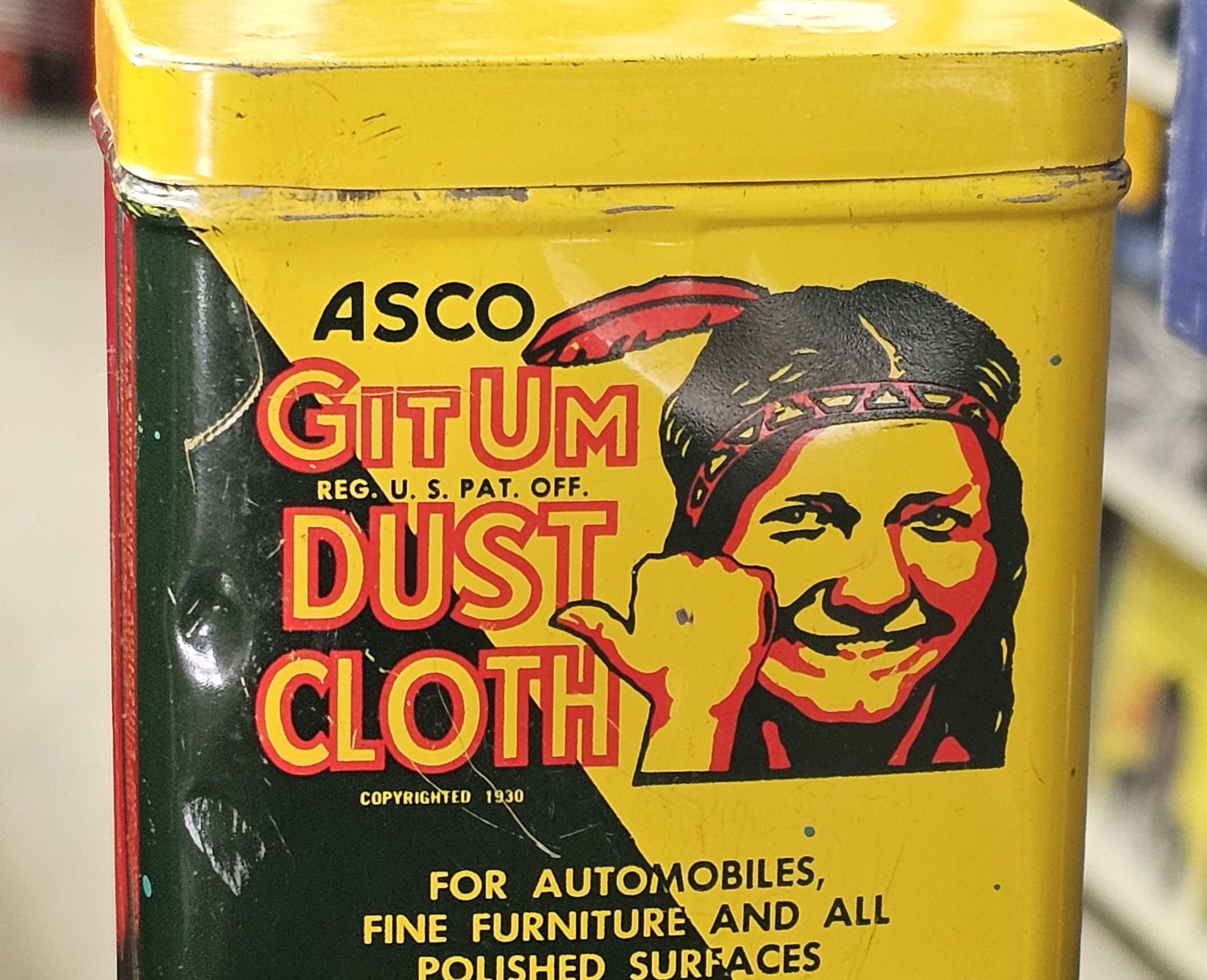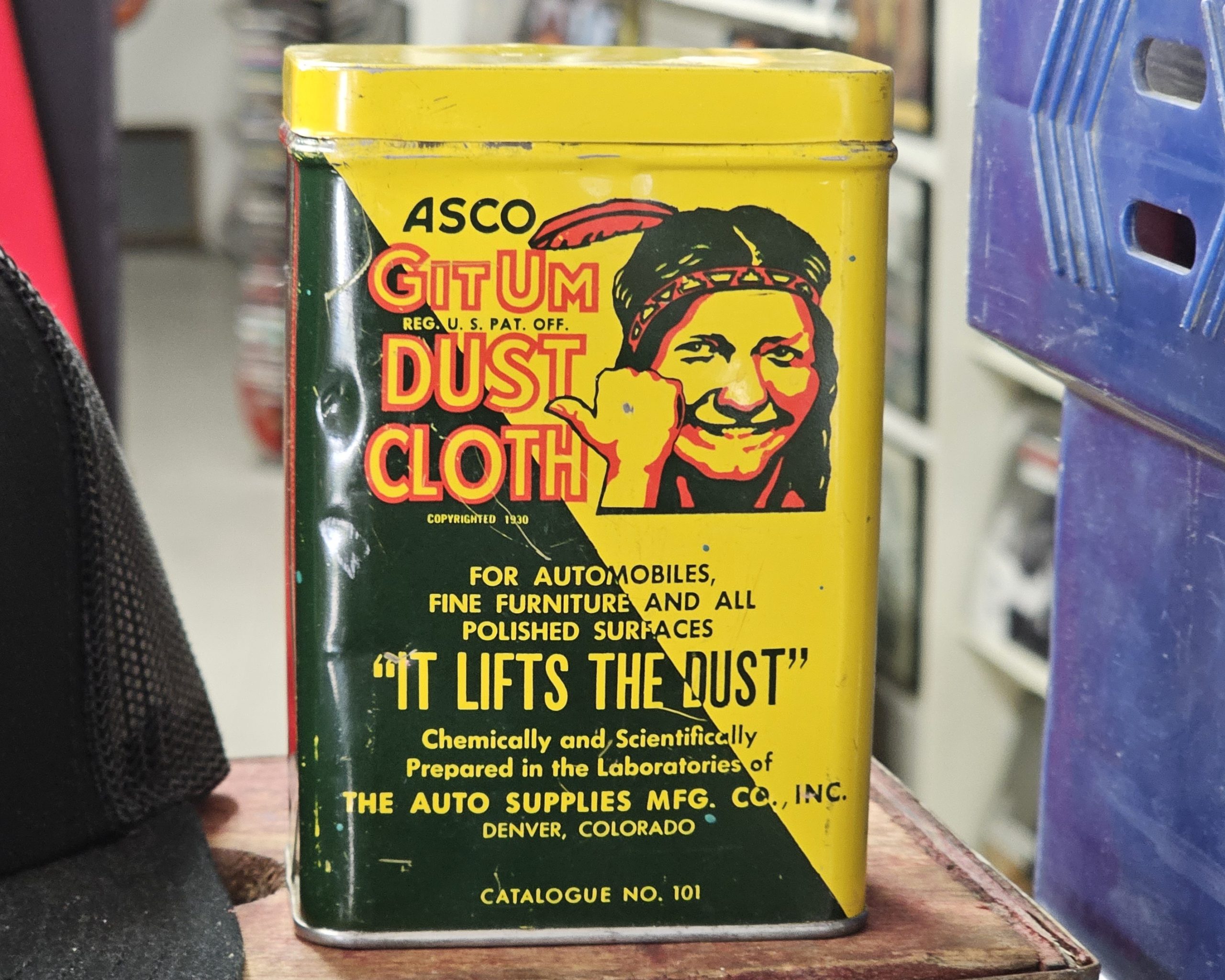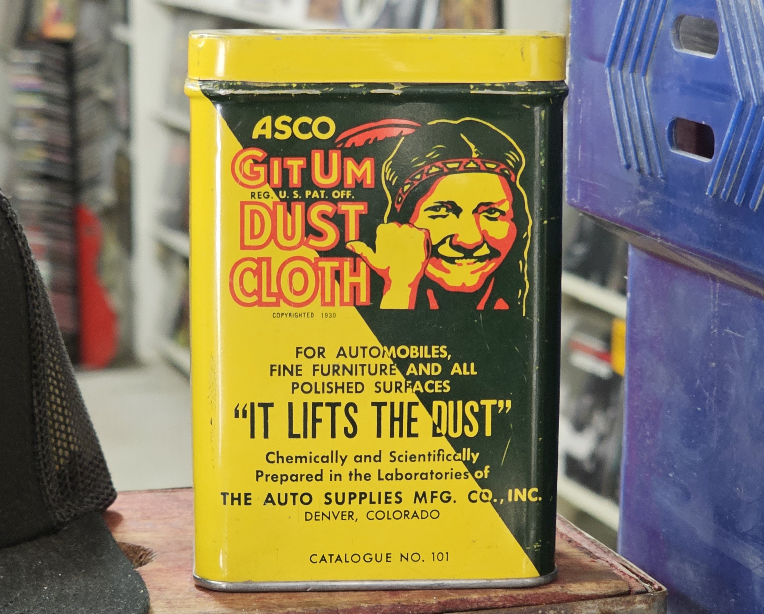 ASCO Git Um Dust Cloth Tin In very good shape, color and graphics are great. Some small denting on back pictured. Original price sticker residue on top. Native American art and states "It Lifts The Dust" for automobiles, fine furniture and all polished surfaces. CANCO can, 1950s.
