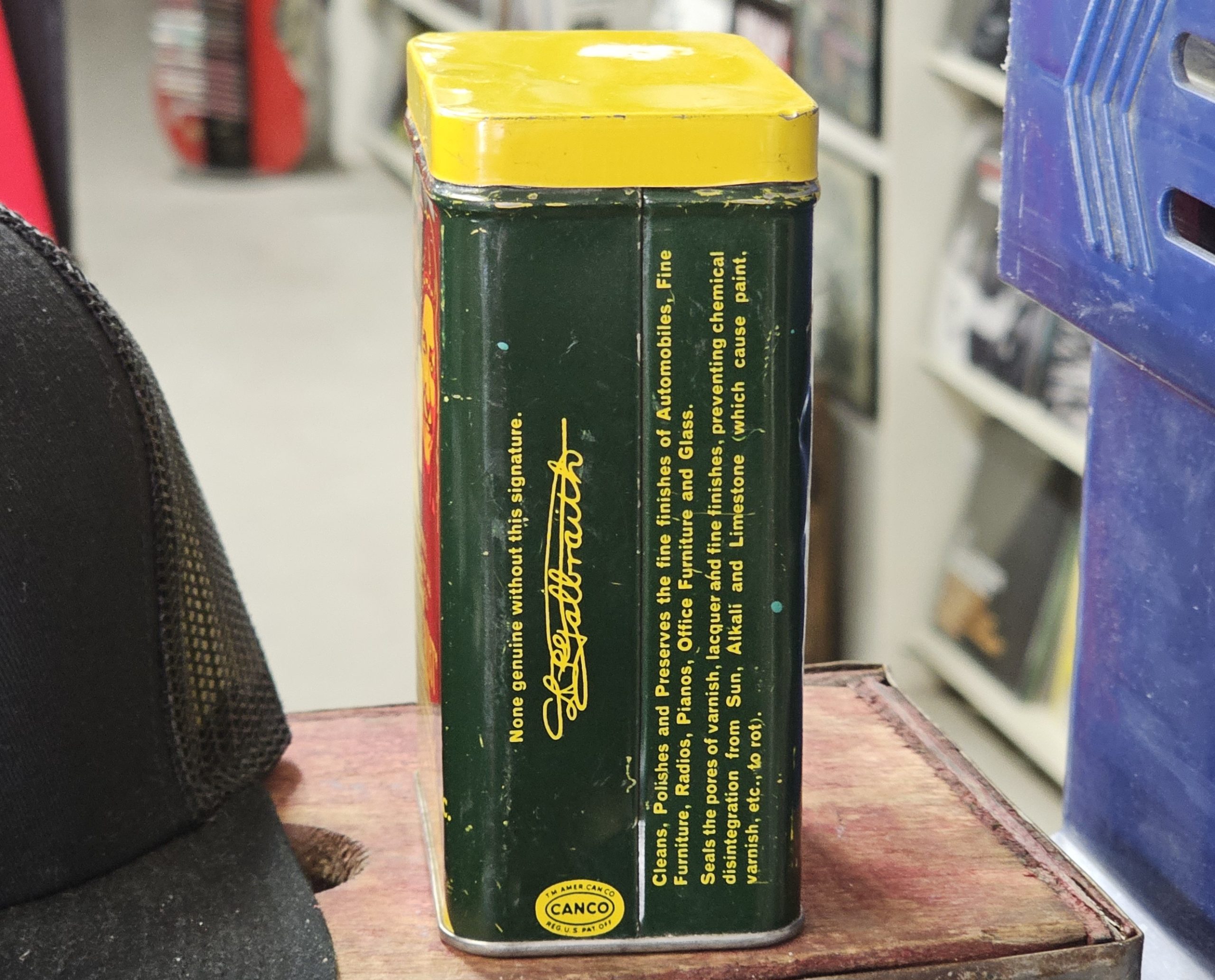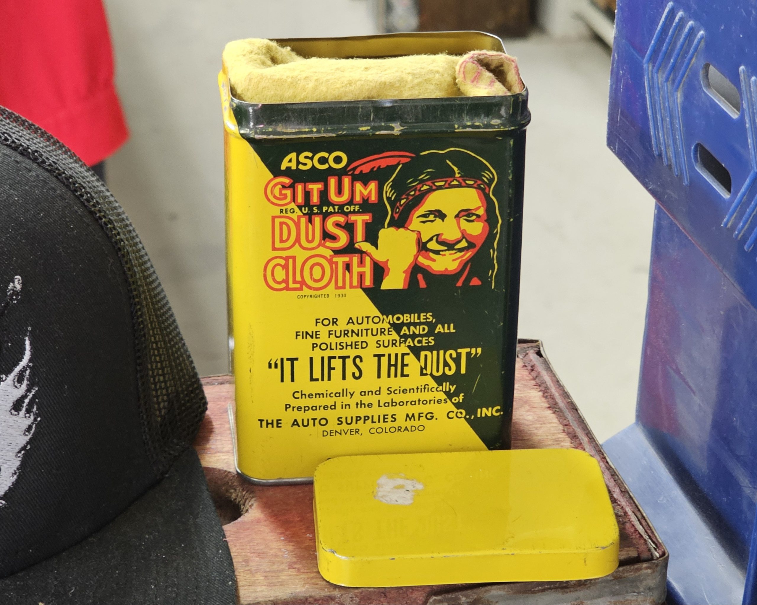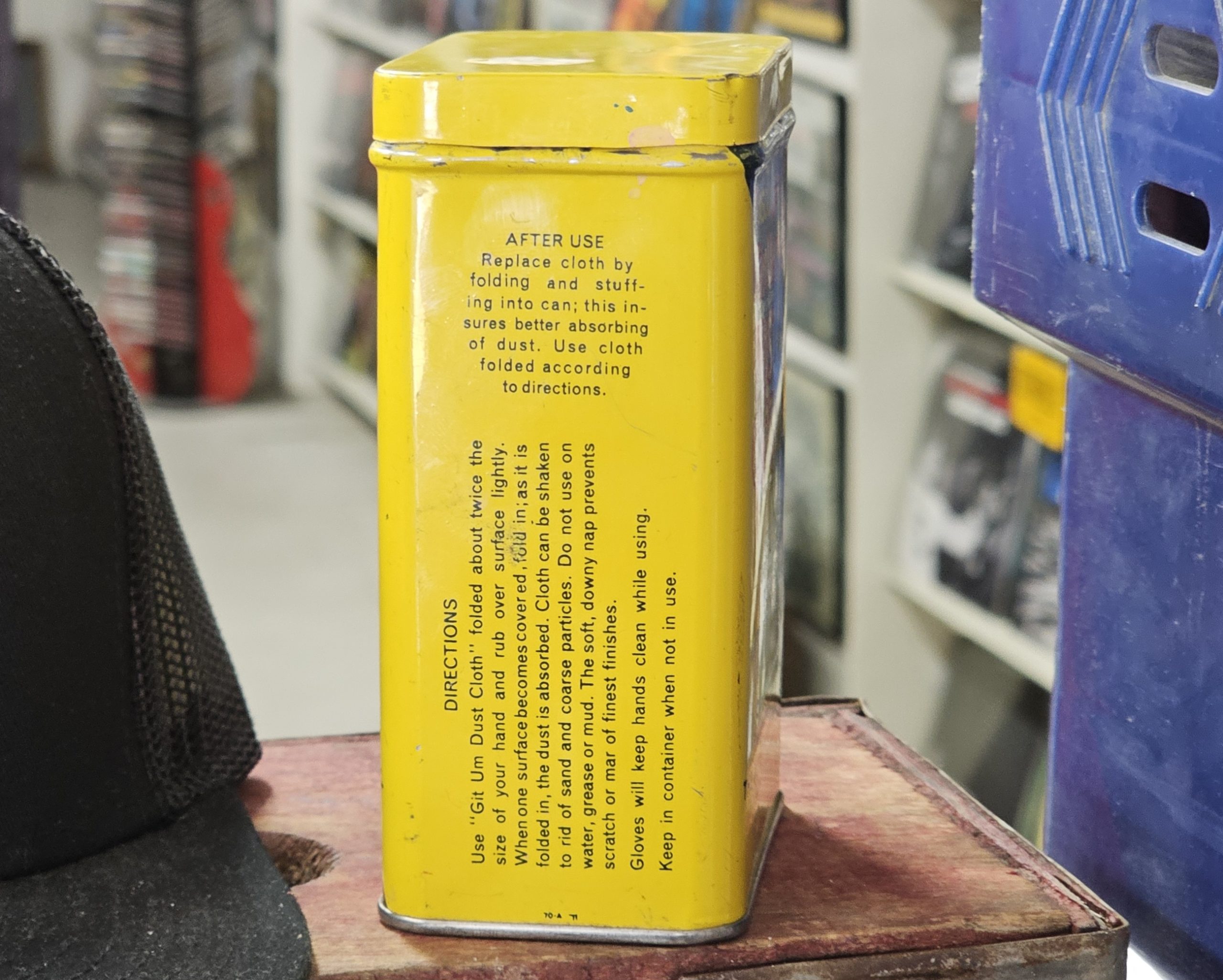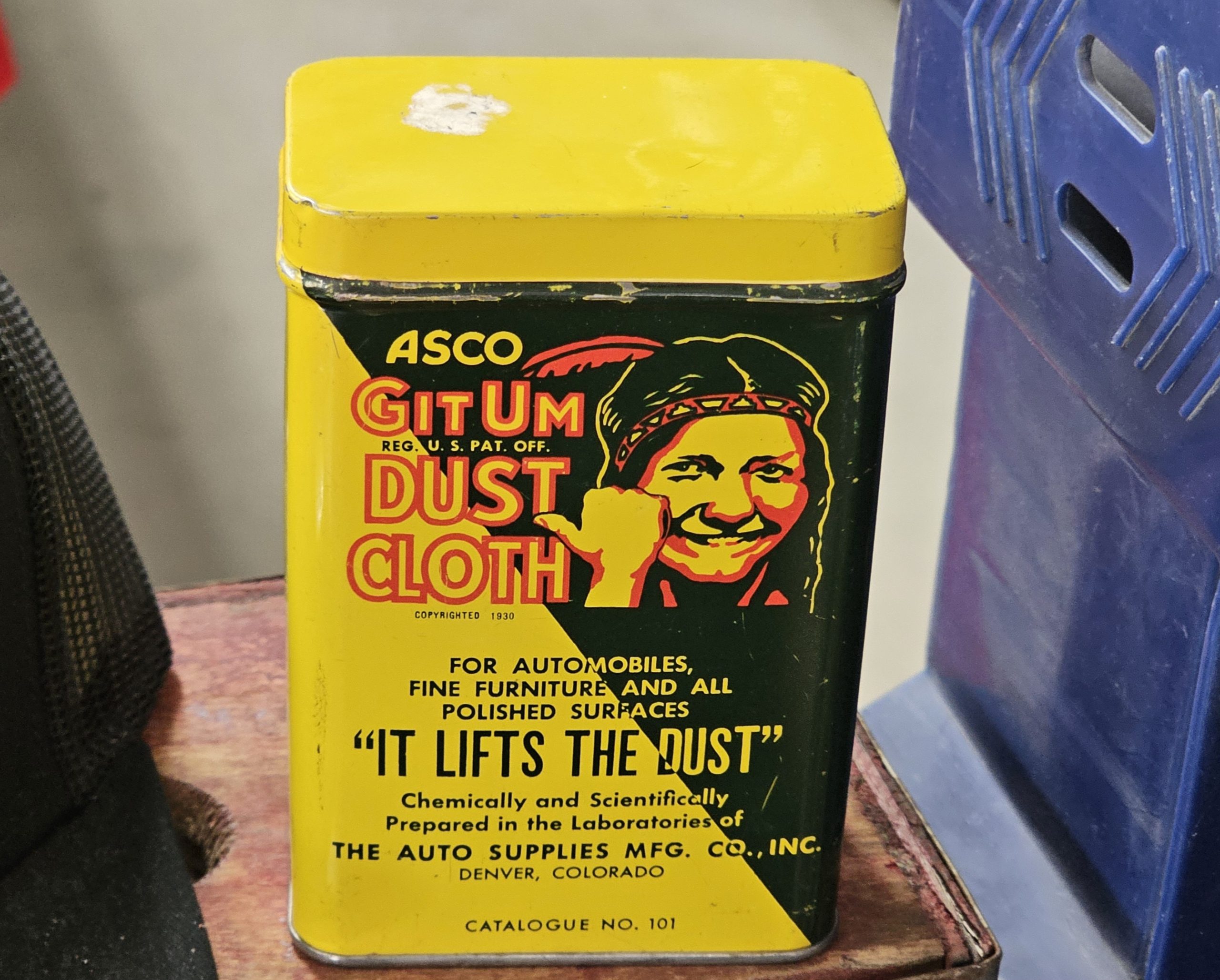 ASCO Git Um Dust Cloth Tin In very good shape, color and graphics are great. Some small denting on back pictured. Original price sticker residue on top. Native American art and states "It Lifts The Dust" for automobiles, fine furniture and all polished surfaces. CANCO can, 1950s.