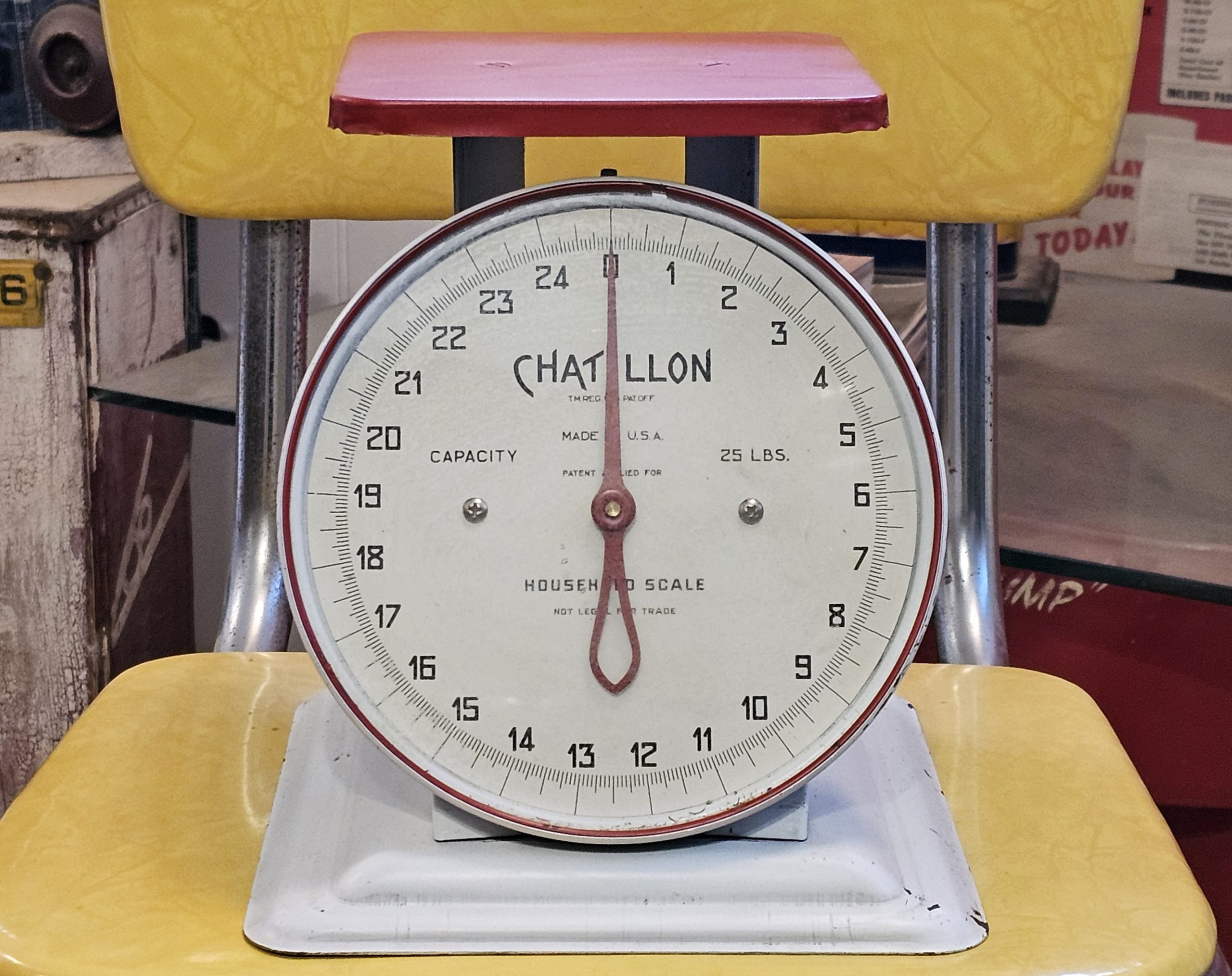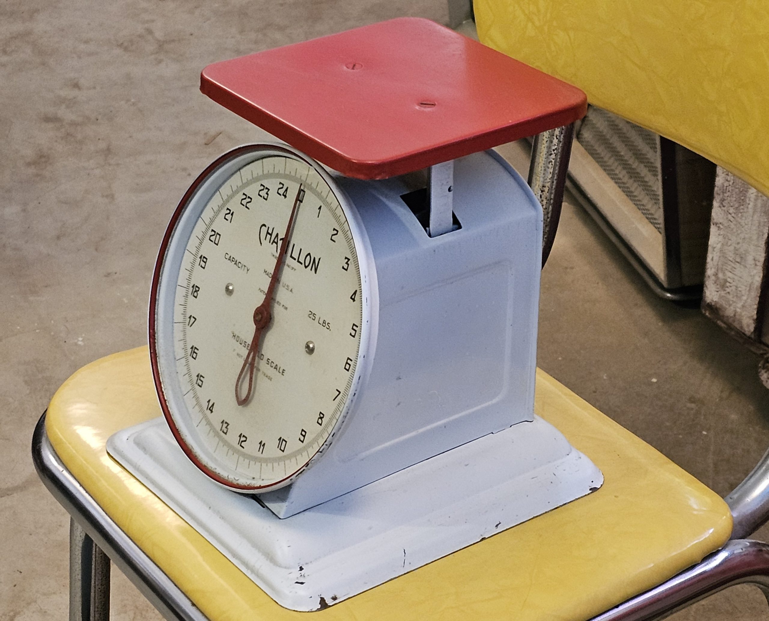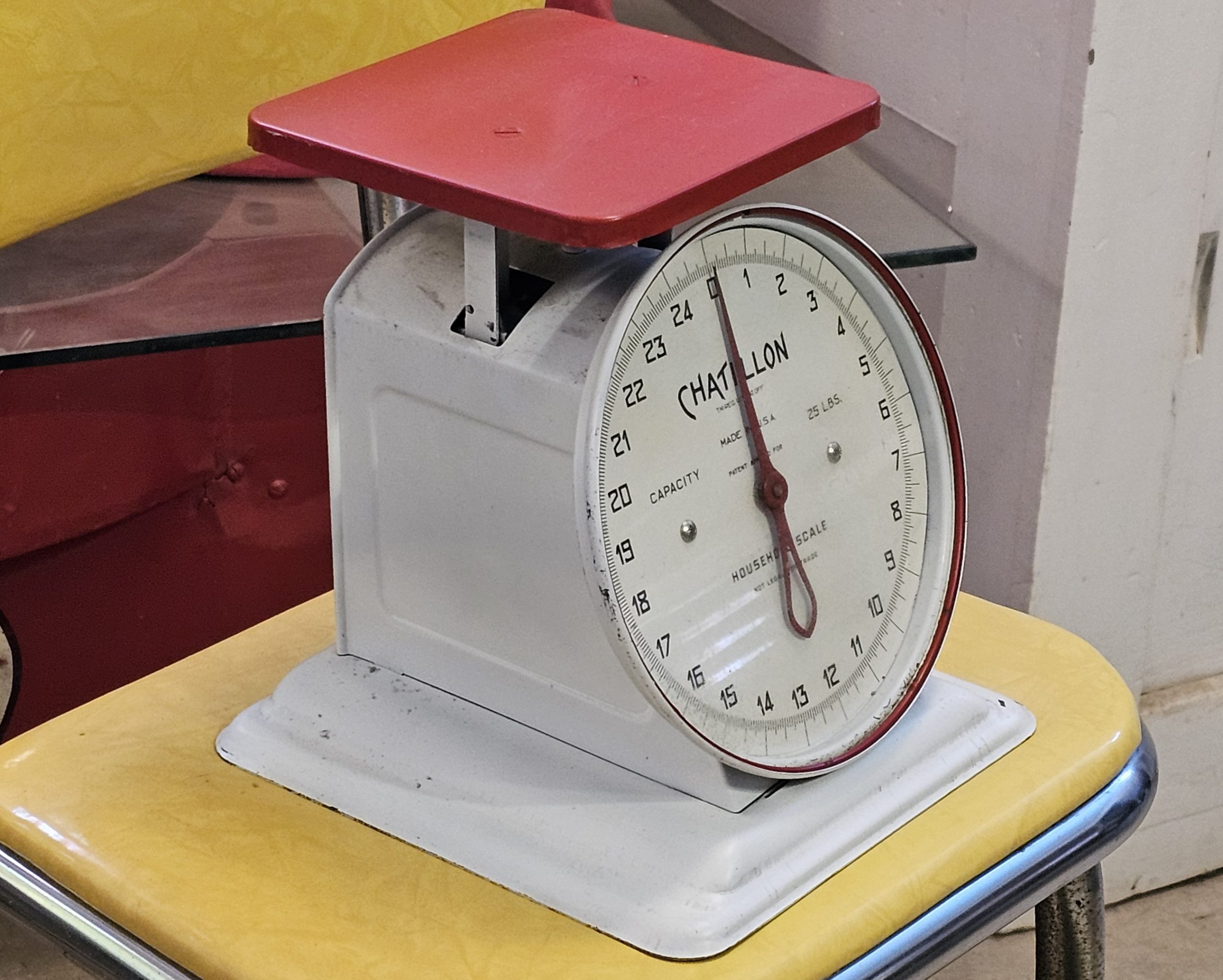 Chatillion Red White Kitchen Scale 25LB Chatillon brand scale with a maximum capacity of 25 pounds (LBS). From the late 1950s-early 60s. Darn near new condition and reads wonderfully. This is an analog dial scale designed for household or kitchen use, featuring a platform for placing items to be weighed. The dial clearly indicates "MADE IN USA".