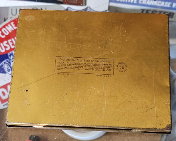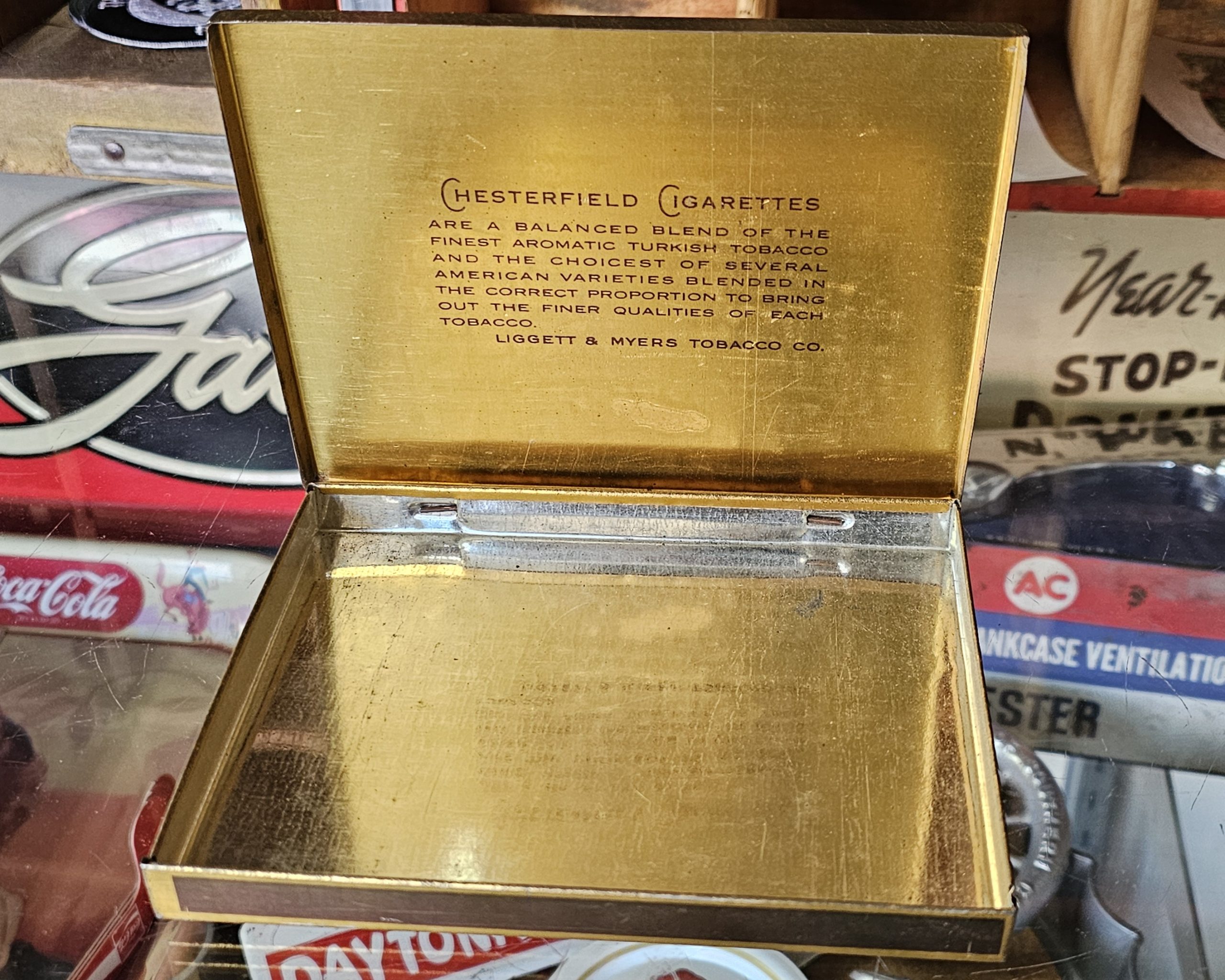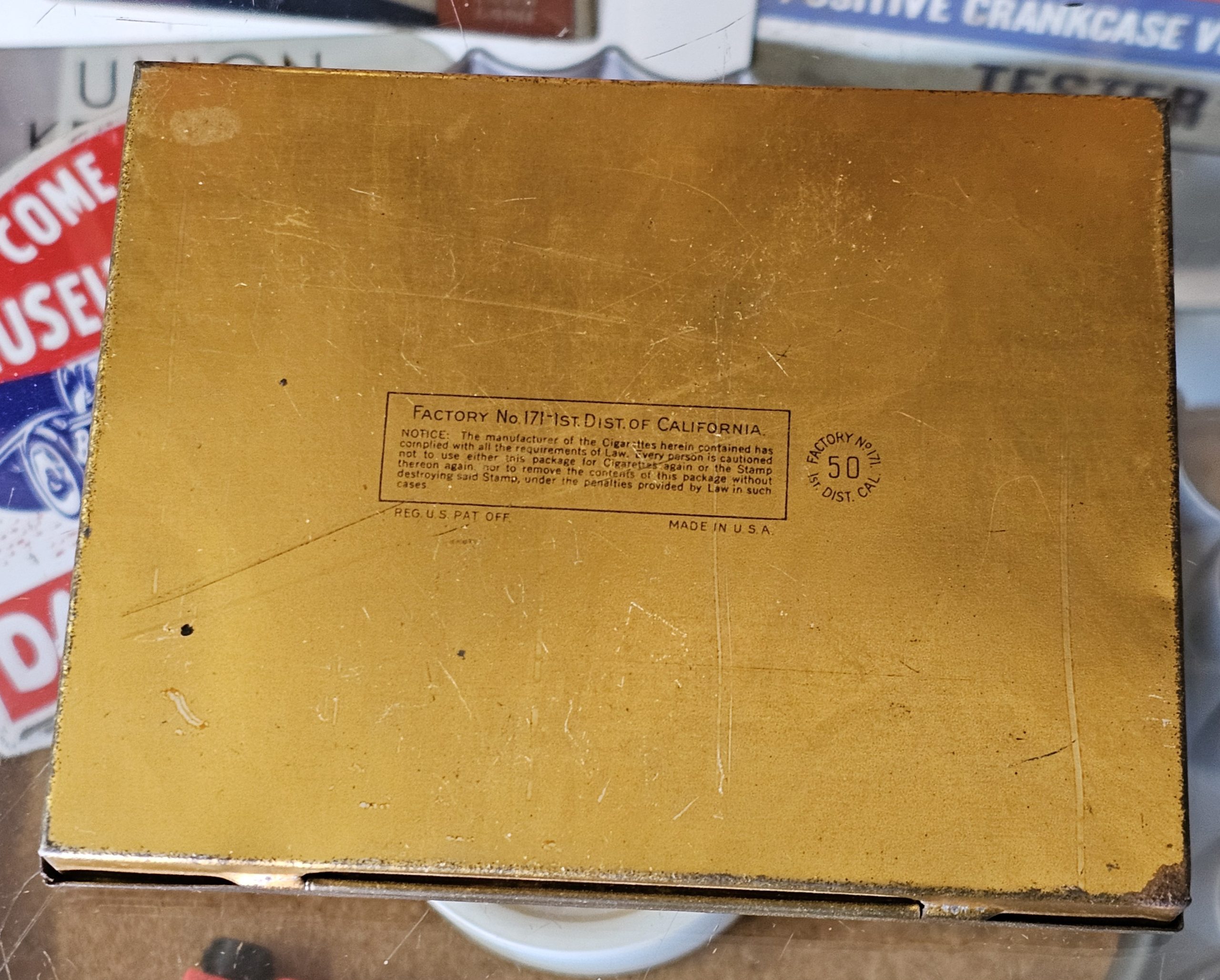Chesterfield Cigarettes Tin This is a super clean tin, from Factory No. 171-1st Dist. of California. It is a 1930s-1940s tin with a hinged top. Designed to hold 50 cigarettes inside. Produced by Liggett& Myers Tobacco Co. Measures ~5 3/4" X 4 1/2" X 3/4".