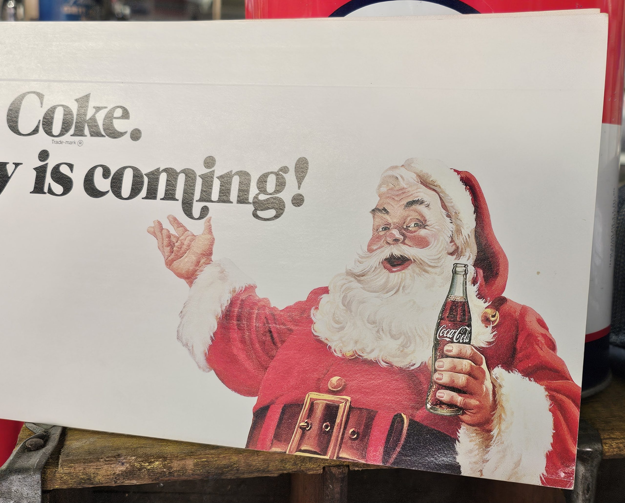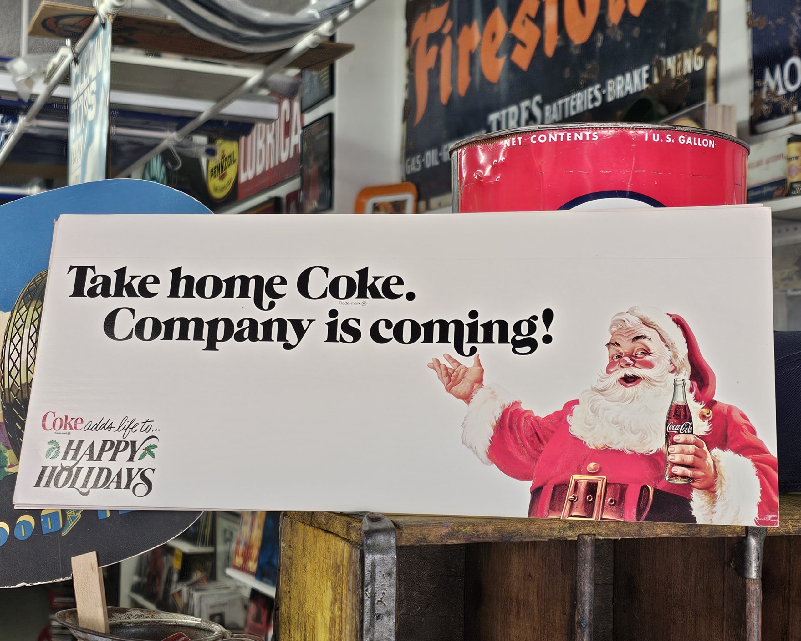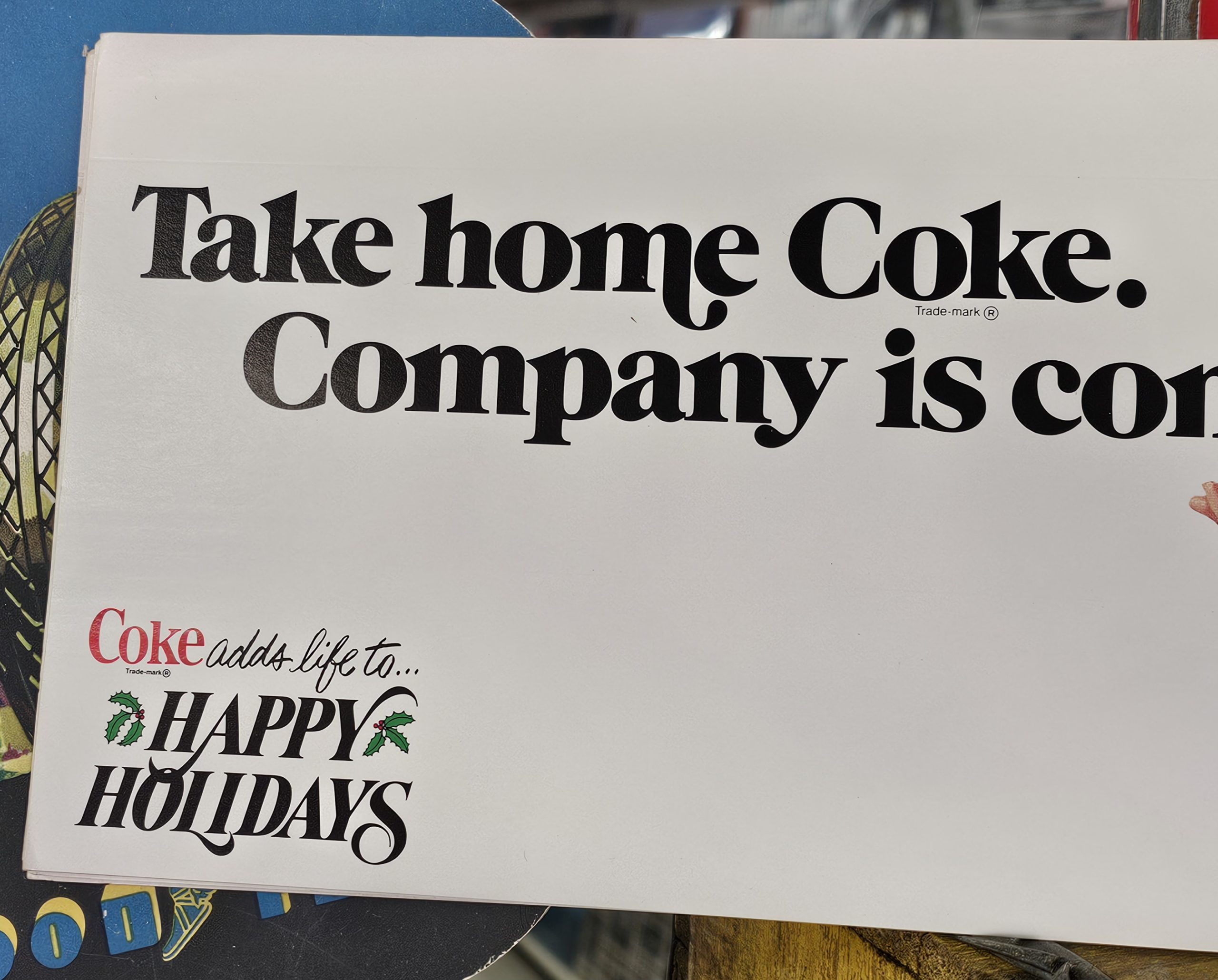 Coca-Cola Happy Holidays Shelf Talker These signs were for markets to promote Coke for the holiday season. Heavy card stock could be folded at top or use adhesive strip on back to hold. "Coke adds life to..." slogan is from 1976. Sold individually, these are new old stock. Measures 15" X 6 1/4". For the vintage soda, Coke or Santa clause collector.