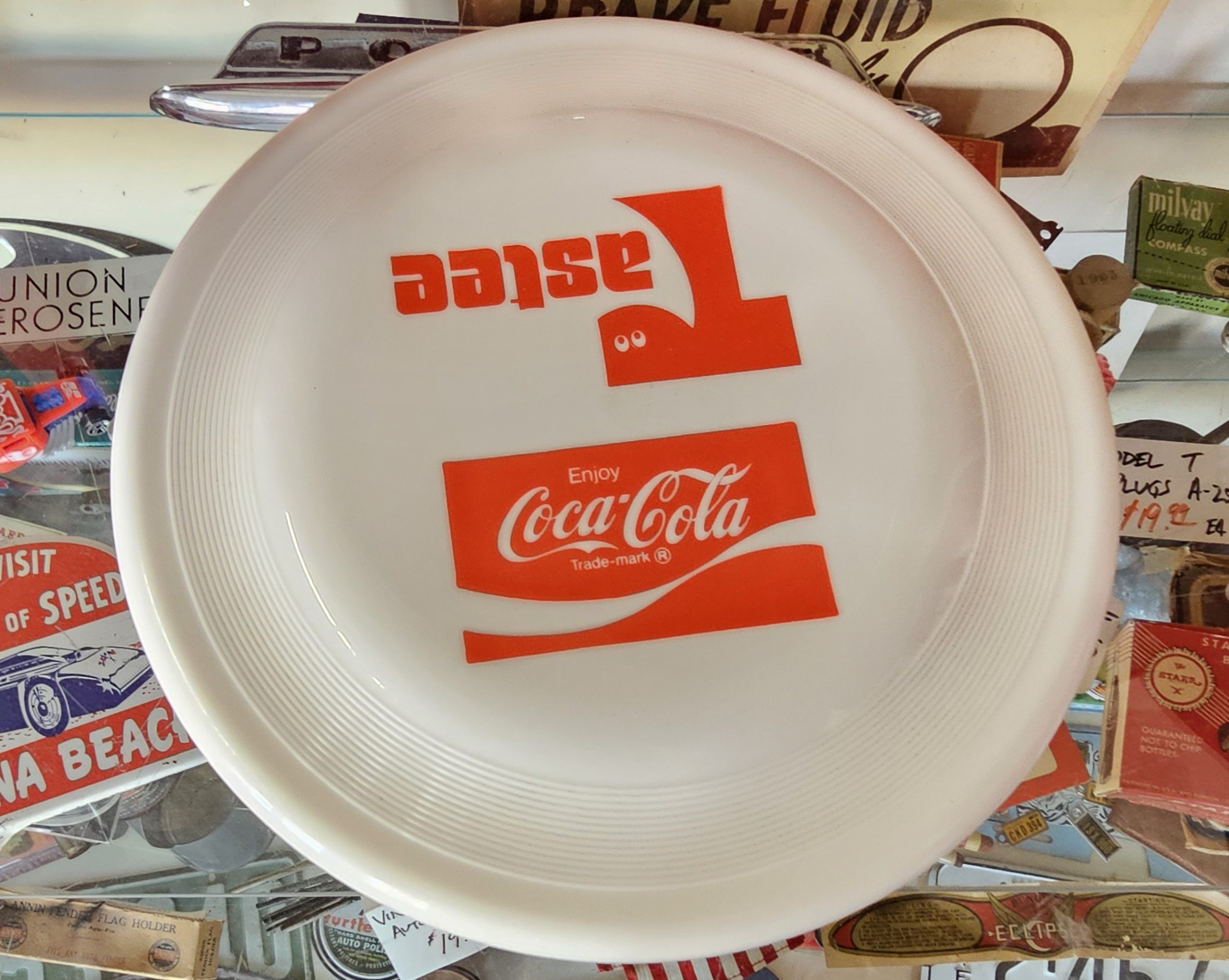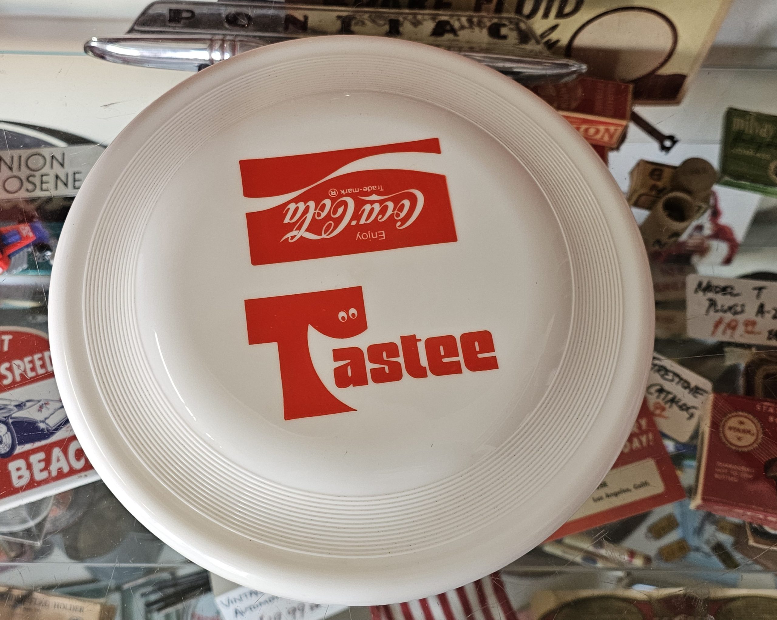 Coca-Cola Tastee Freeze Wham-O Frisbee  Cross promotional 1970s toy.  Manufactured by Wham-O for Coca-Cola, these would have been available for purchase or giveaway at the restaurant to promote them and of course Coke.  Great for the soda or toy collector.