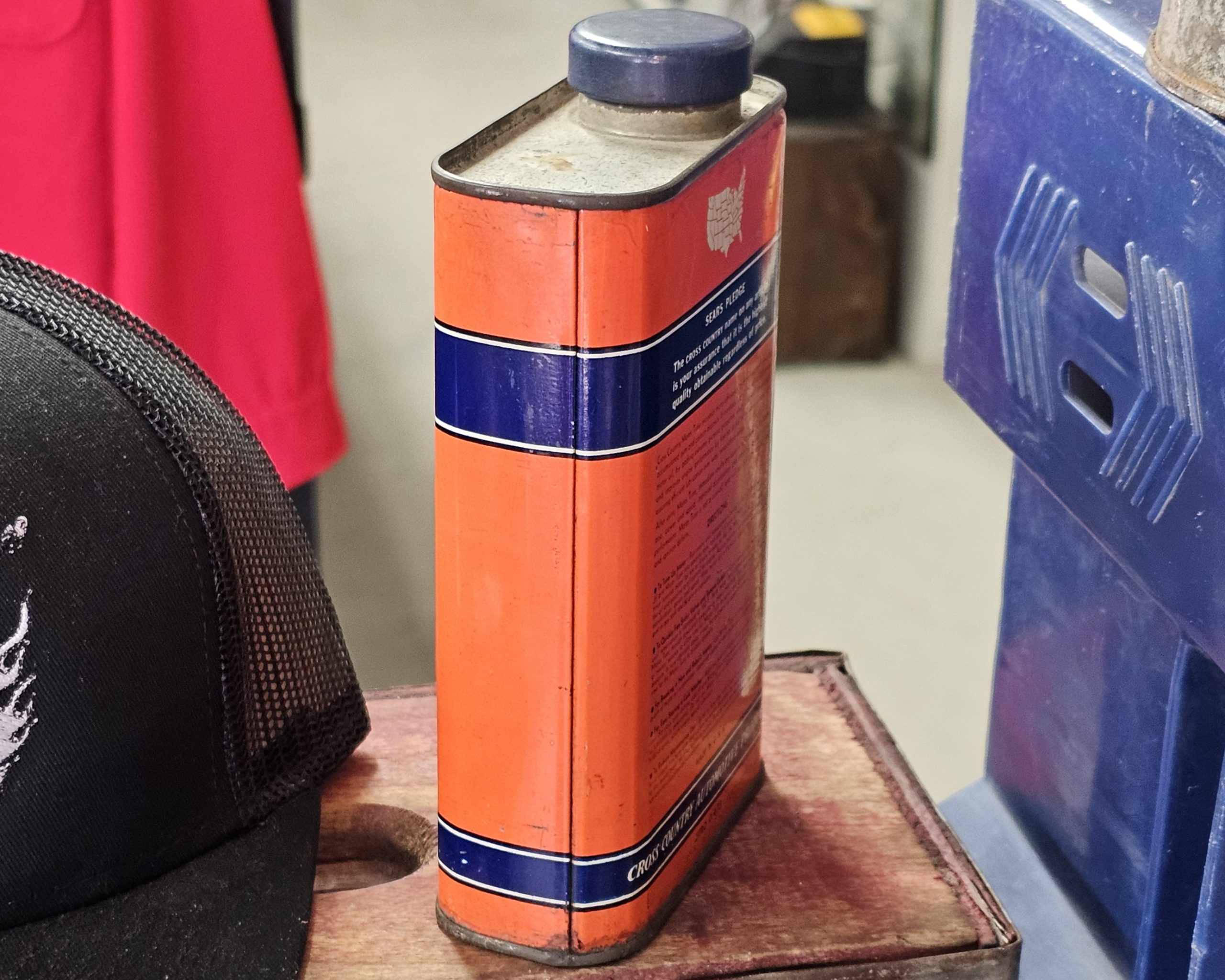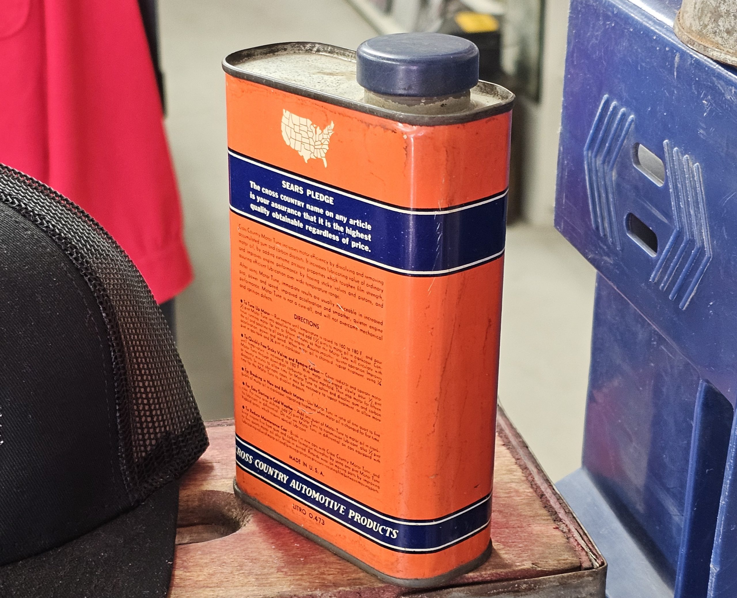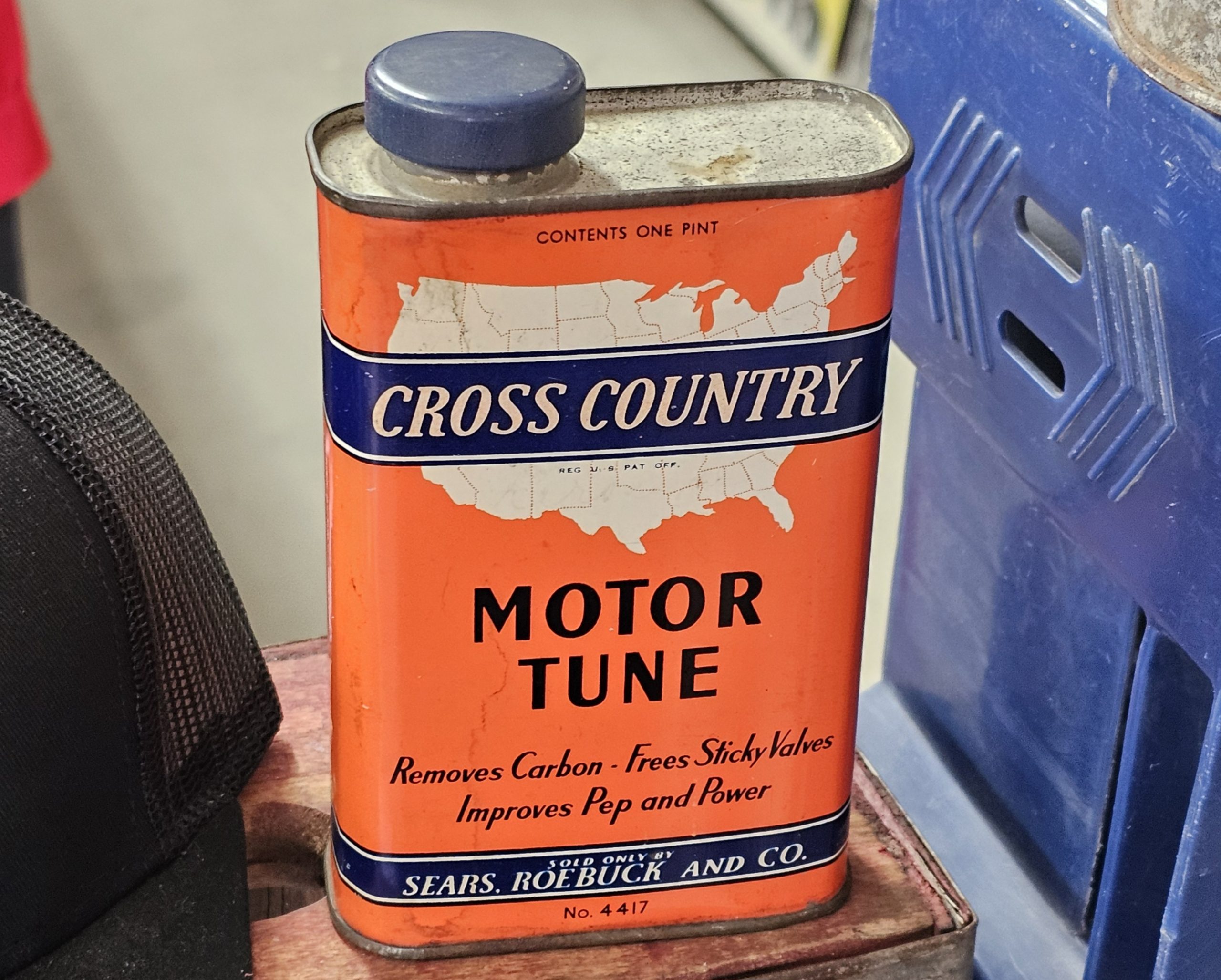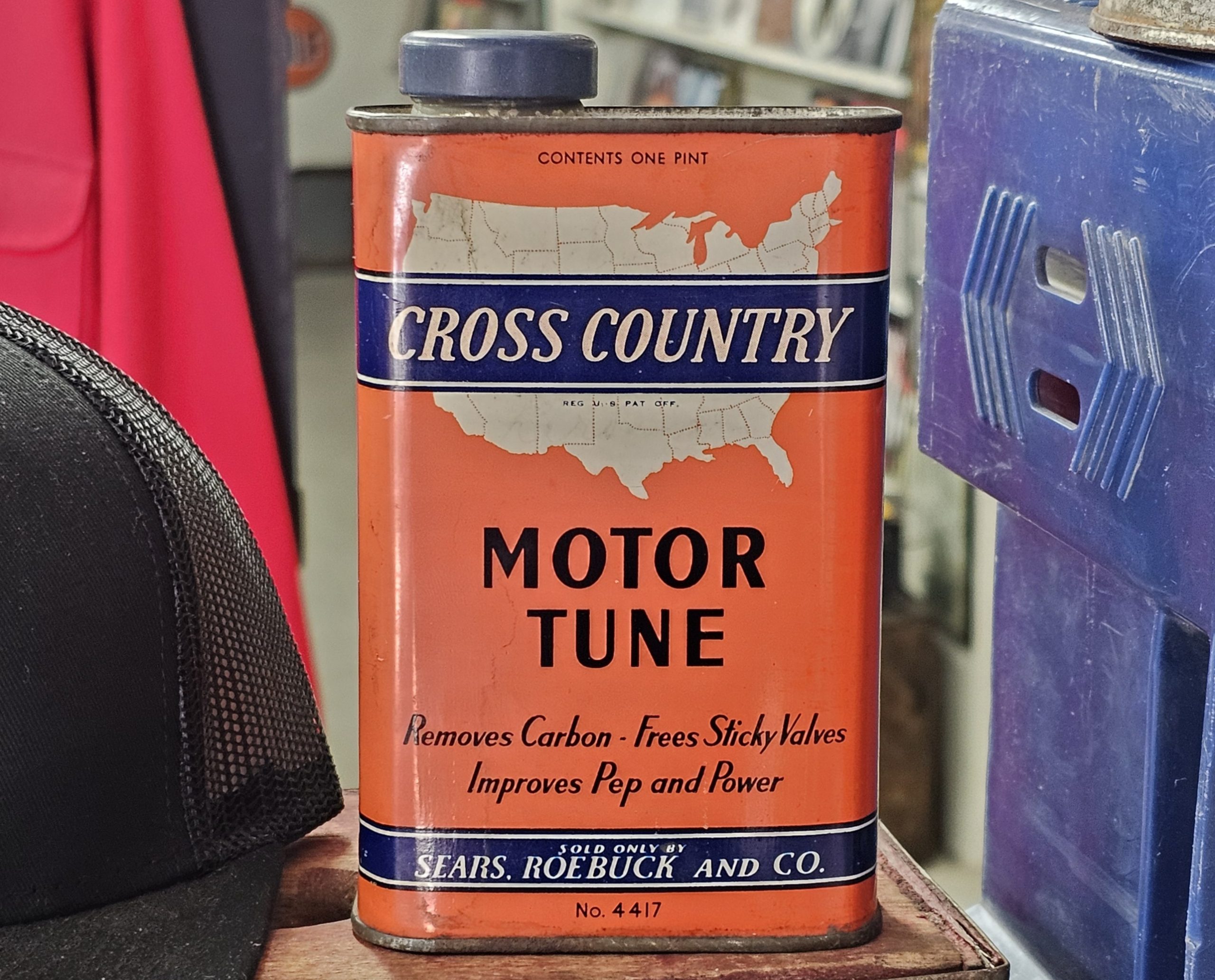 Cross Country Motor Tune Can In fantastic original condition with cap. It is empty, but no issues to speak of as it is in great shape. This product was designed to "Remove Carbon - Free Sticky Valves - Improve Pep and Power" in engines. The can is a one-pint size and features a map of the United States on its design. Sold only by Sears, Roebuck And Co.