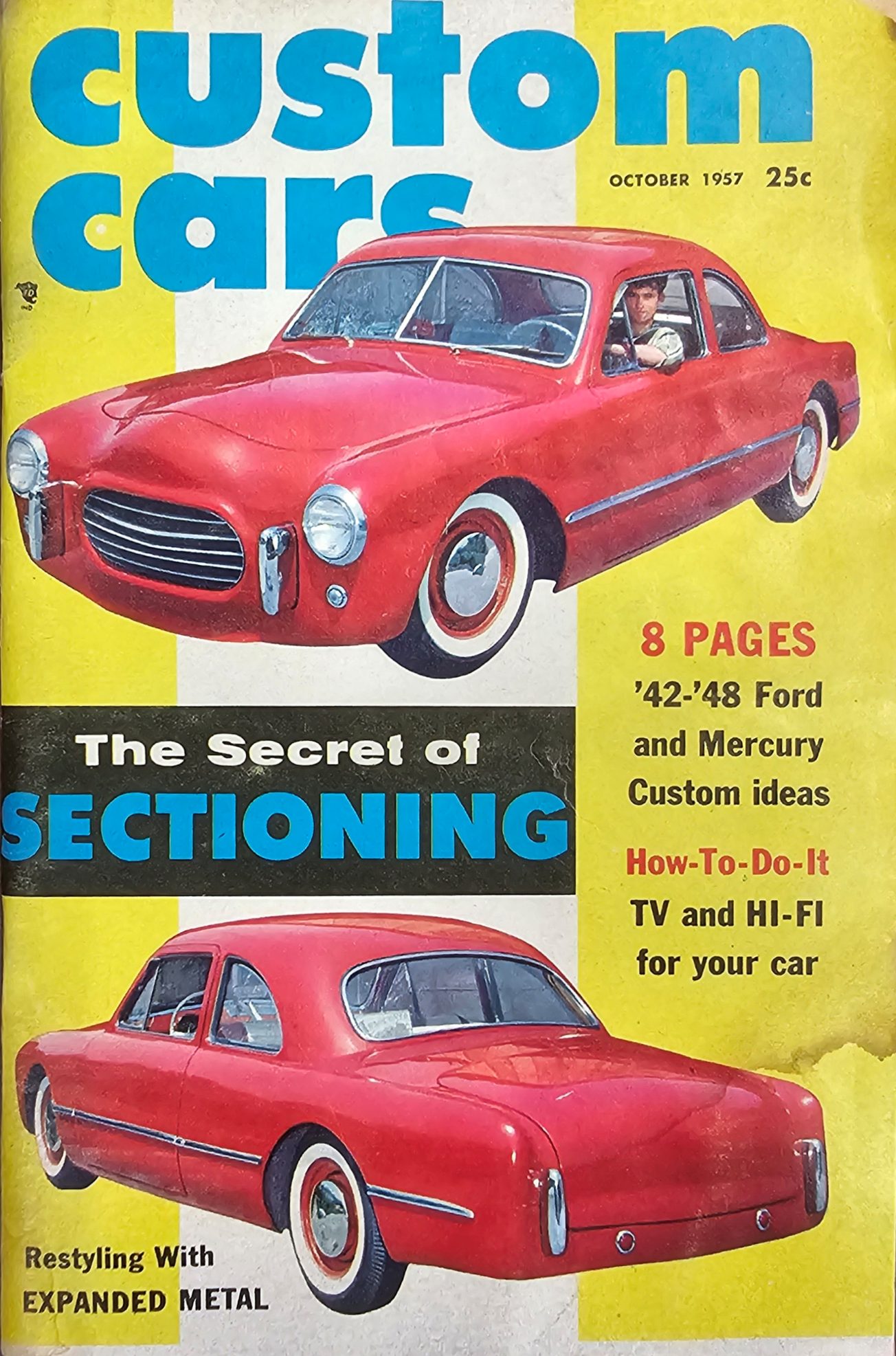 Custom Cars Magazine October 1957  This is an original 25 cent magazine in very good shape.  65 pages of articles on how to do different upgrades to your hot rod, advertising from shops and articles on several custom builds with the owner and builder.  Grumps So-Cal.