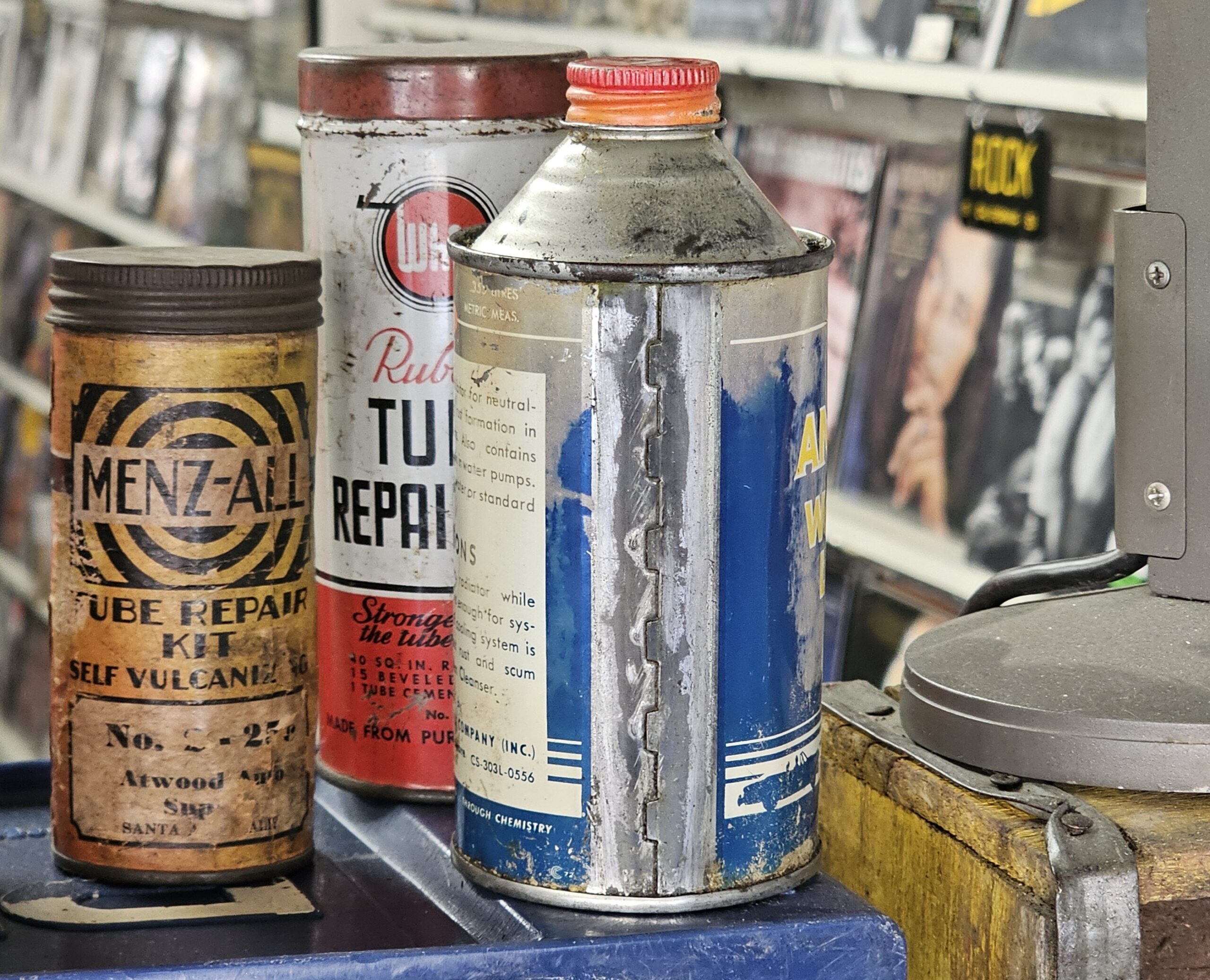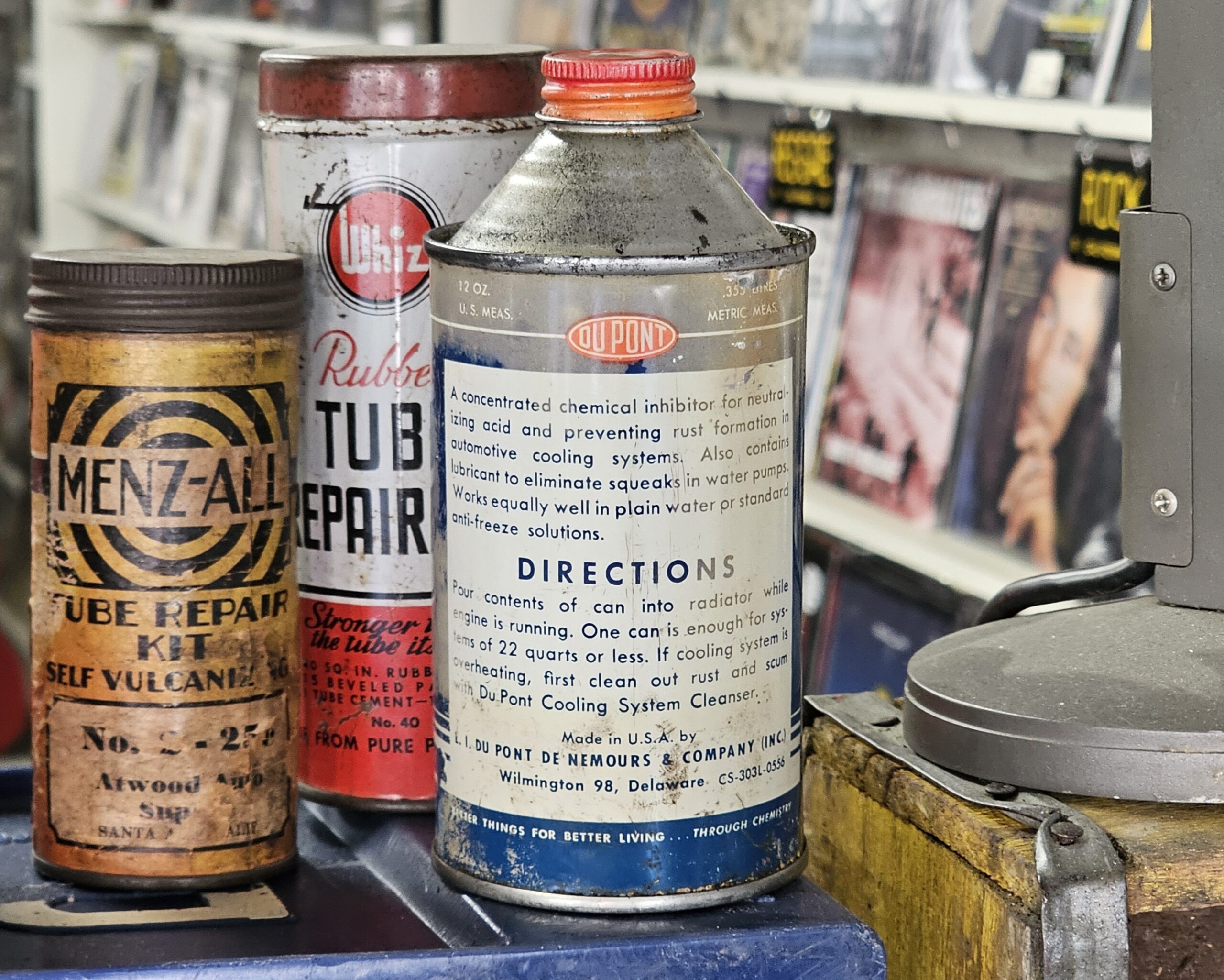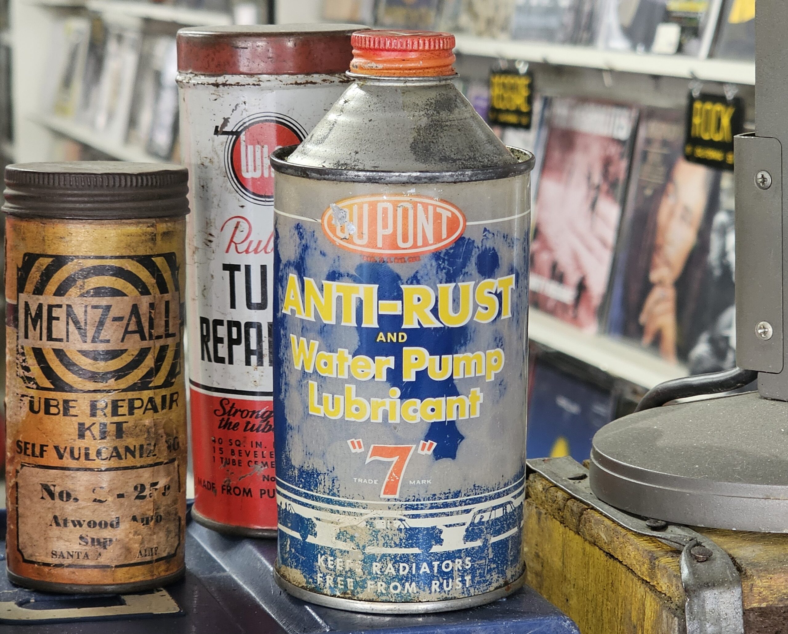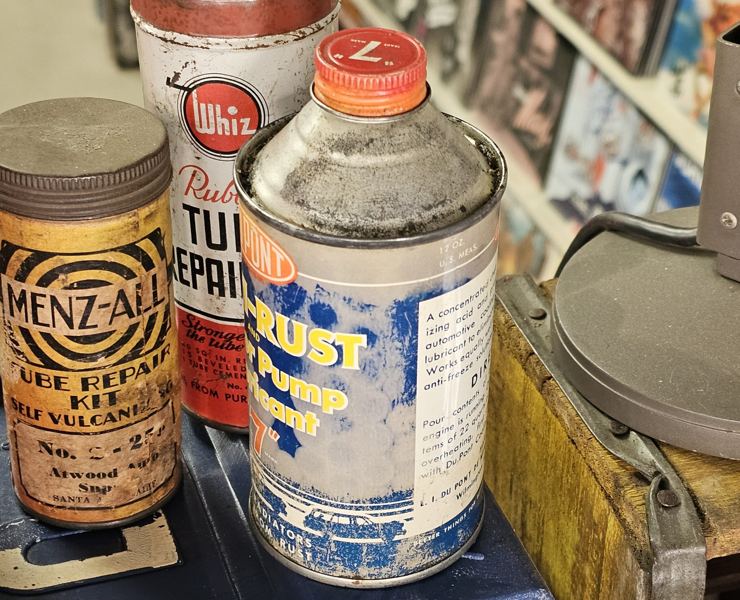 Dupont Anti-Rust Water Pump Lubricant Can This cone top is new old stock. As pictures show, there is discoloration throughout the Blue color of can. Has original '7' cap. Bottom is concave and not flat. Makes for great vintage décor. Grumps Collectibles So-Cal.