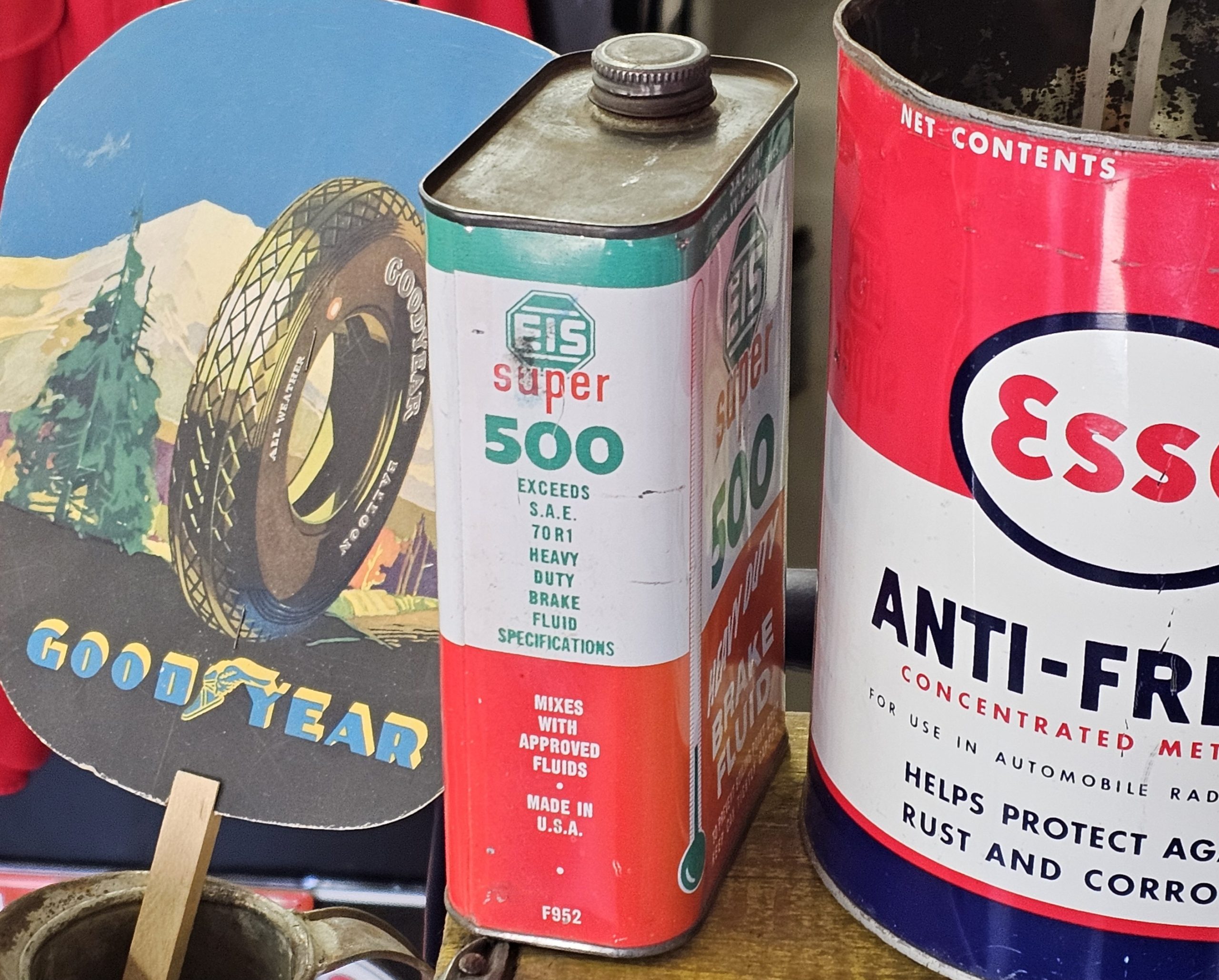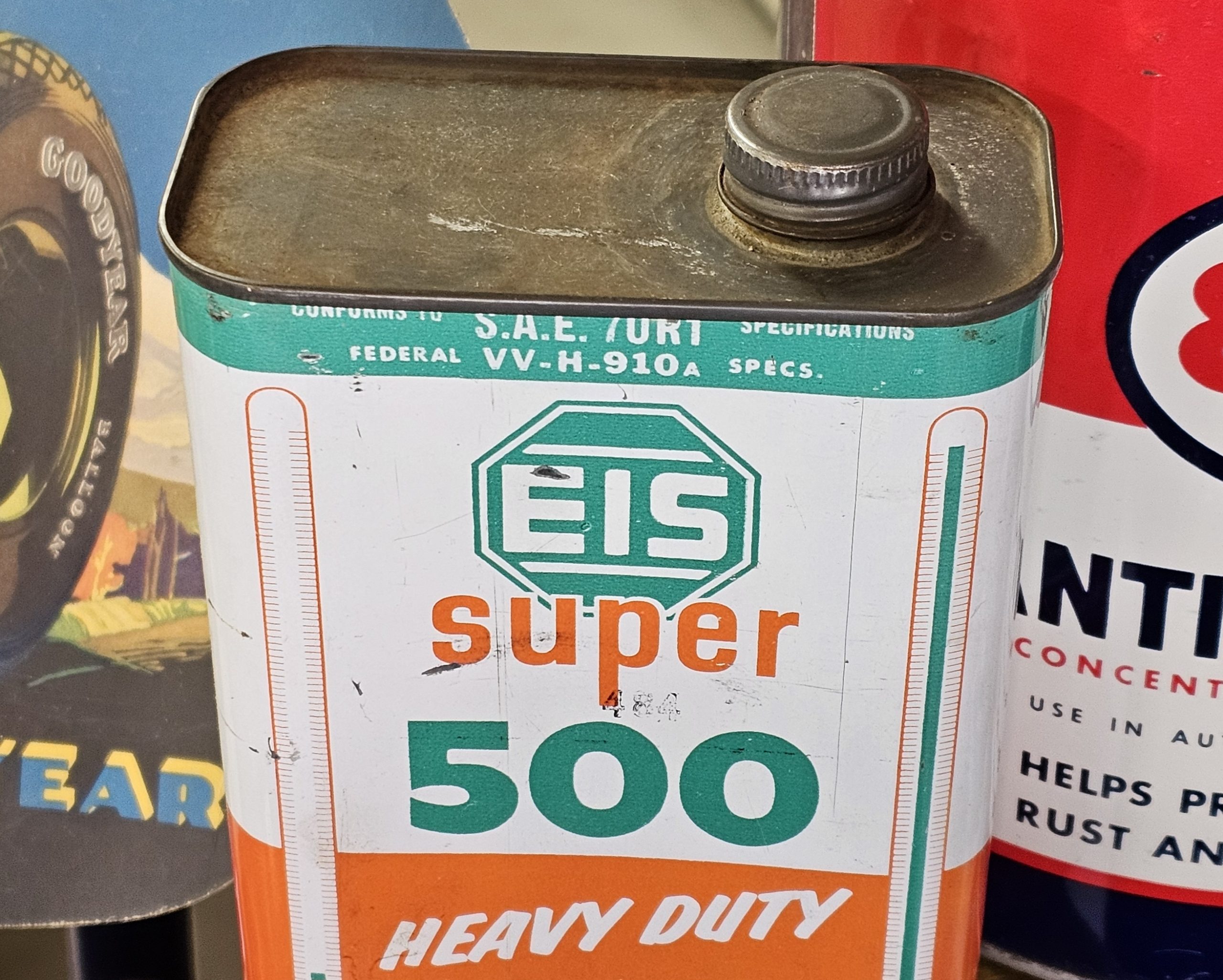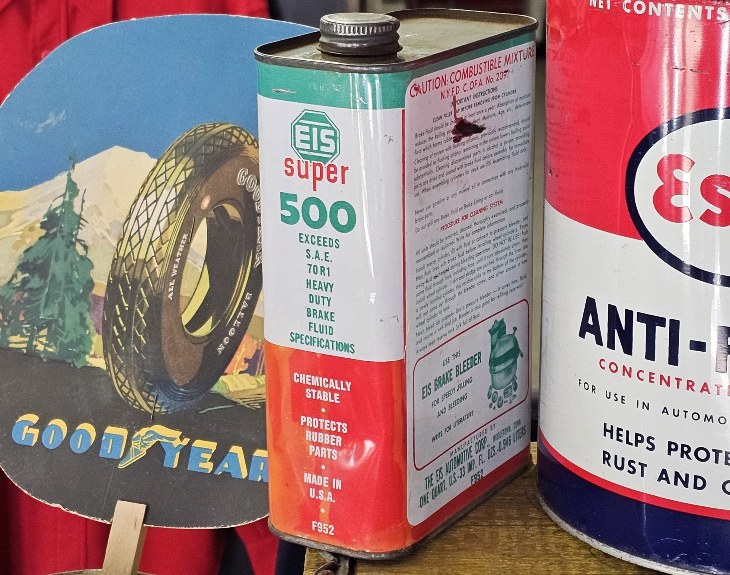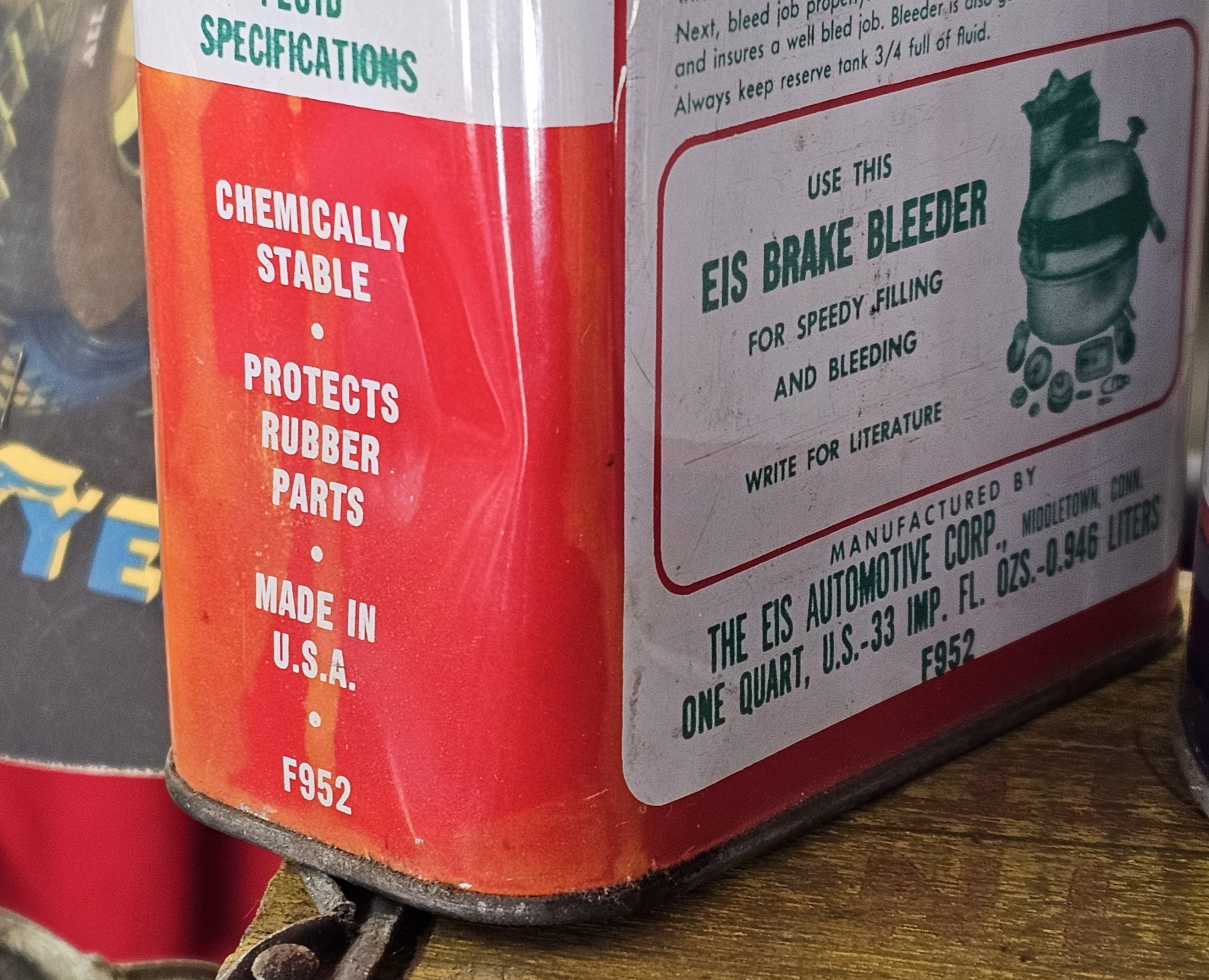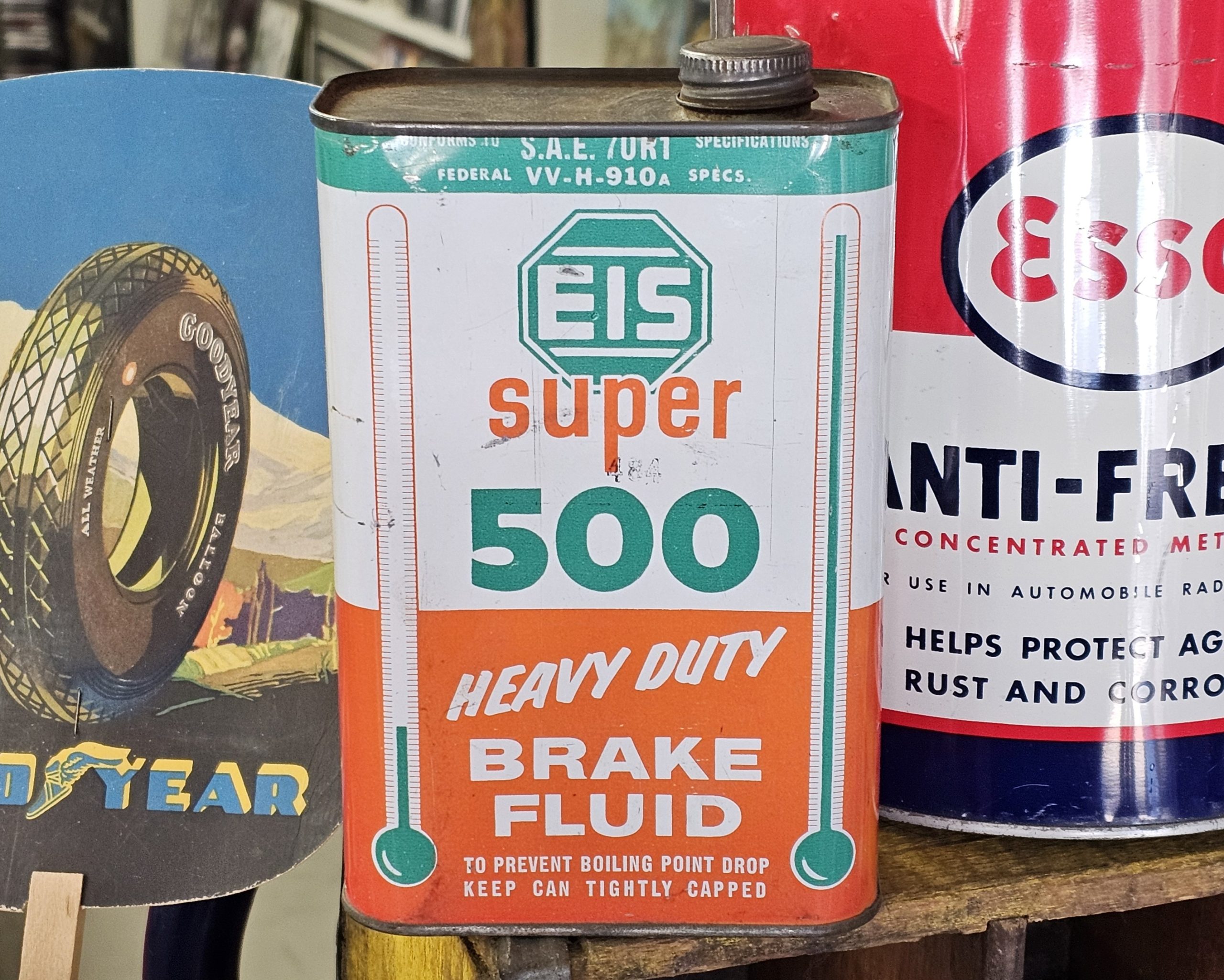 EIS Super 500 Brake Fluid Can Neat graphics on this quart Heavy Duty Brake Fluid can from the EIS Automotive Corp. Good shape, Does have some scratching around and minor denting on one side. Perfect vintage garage décor. We do have a gallon version of EIS Brake Fluid.