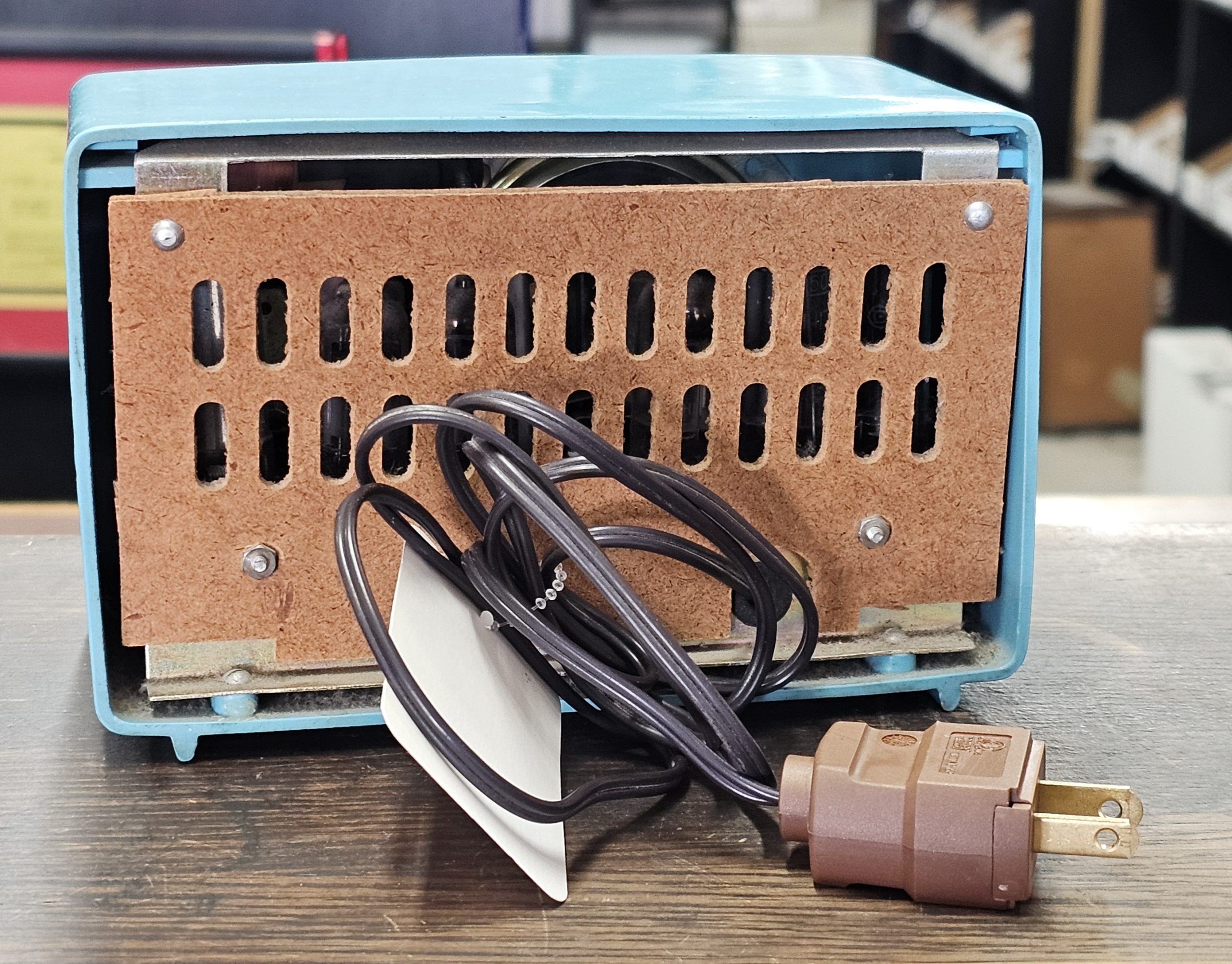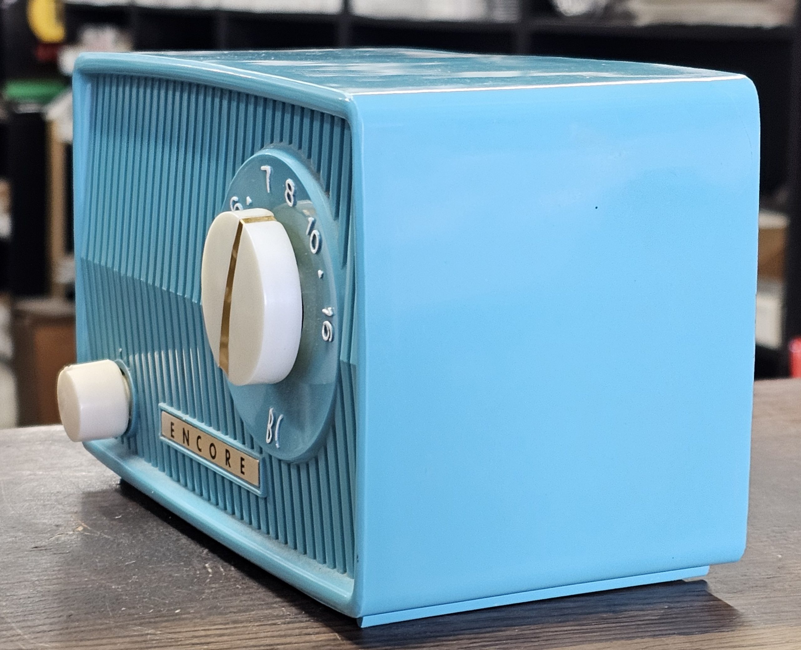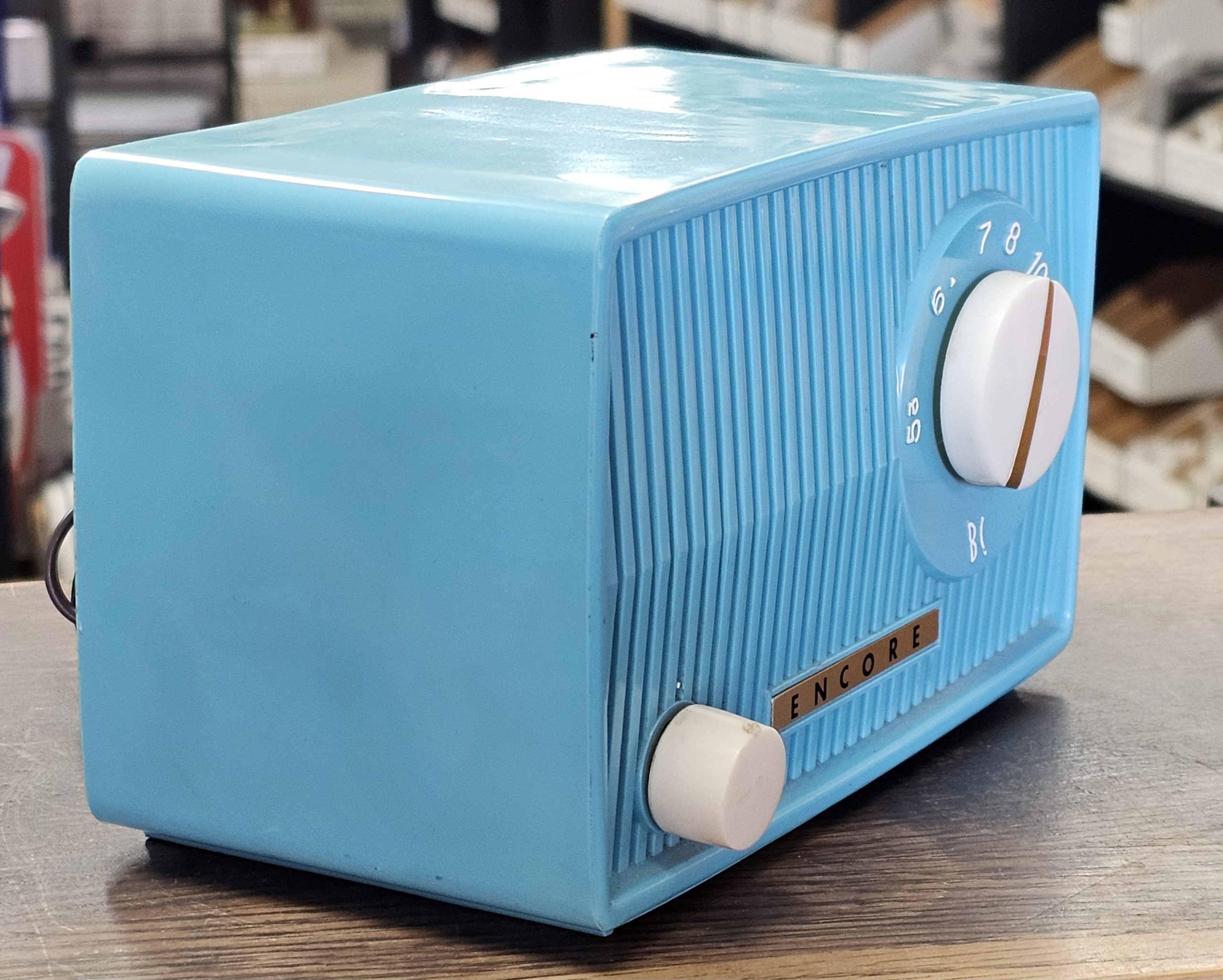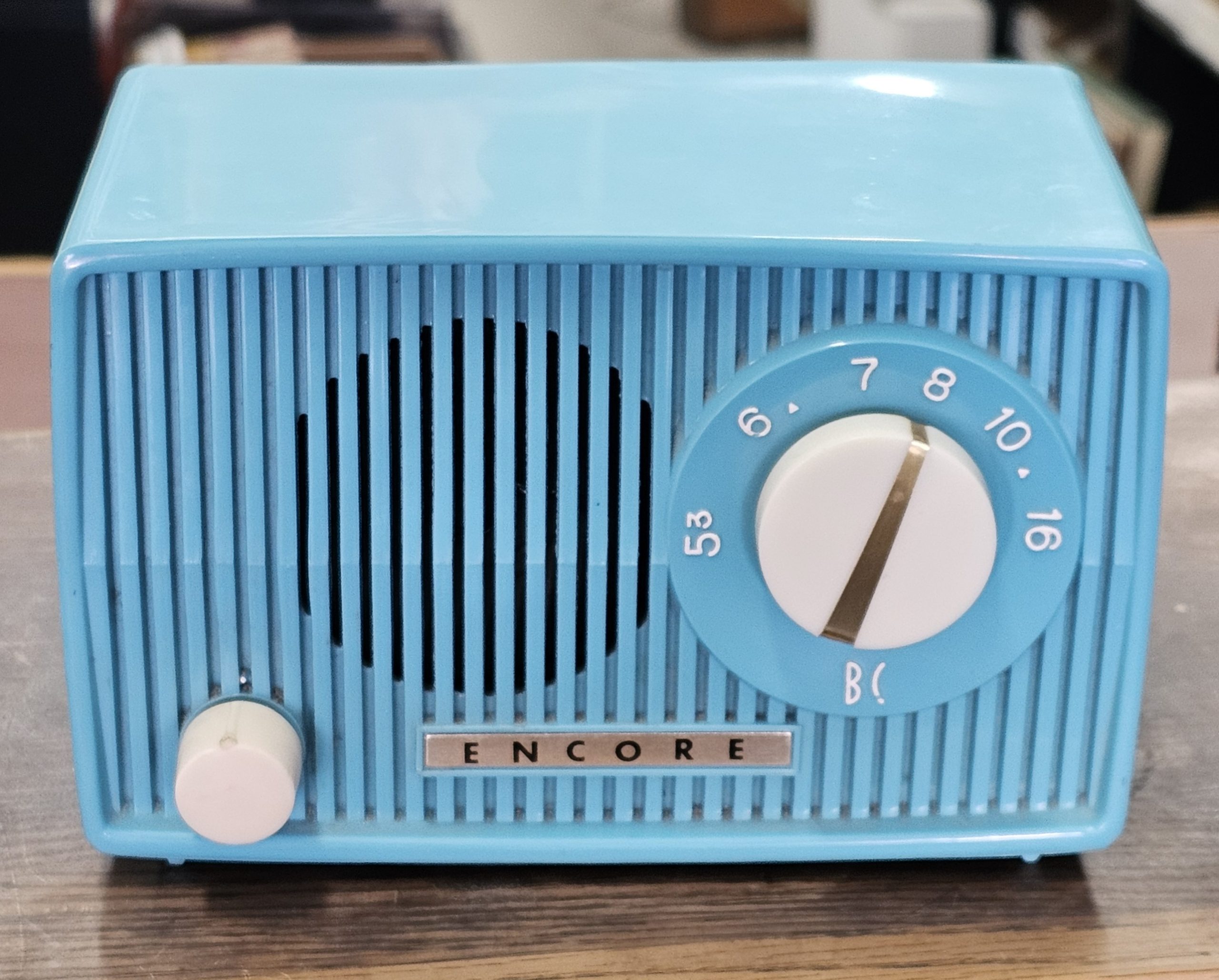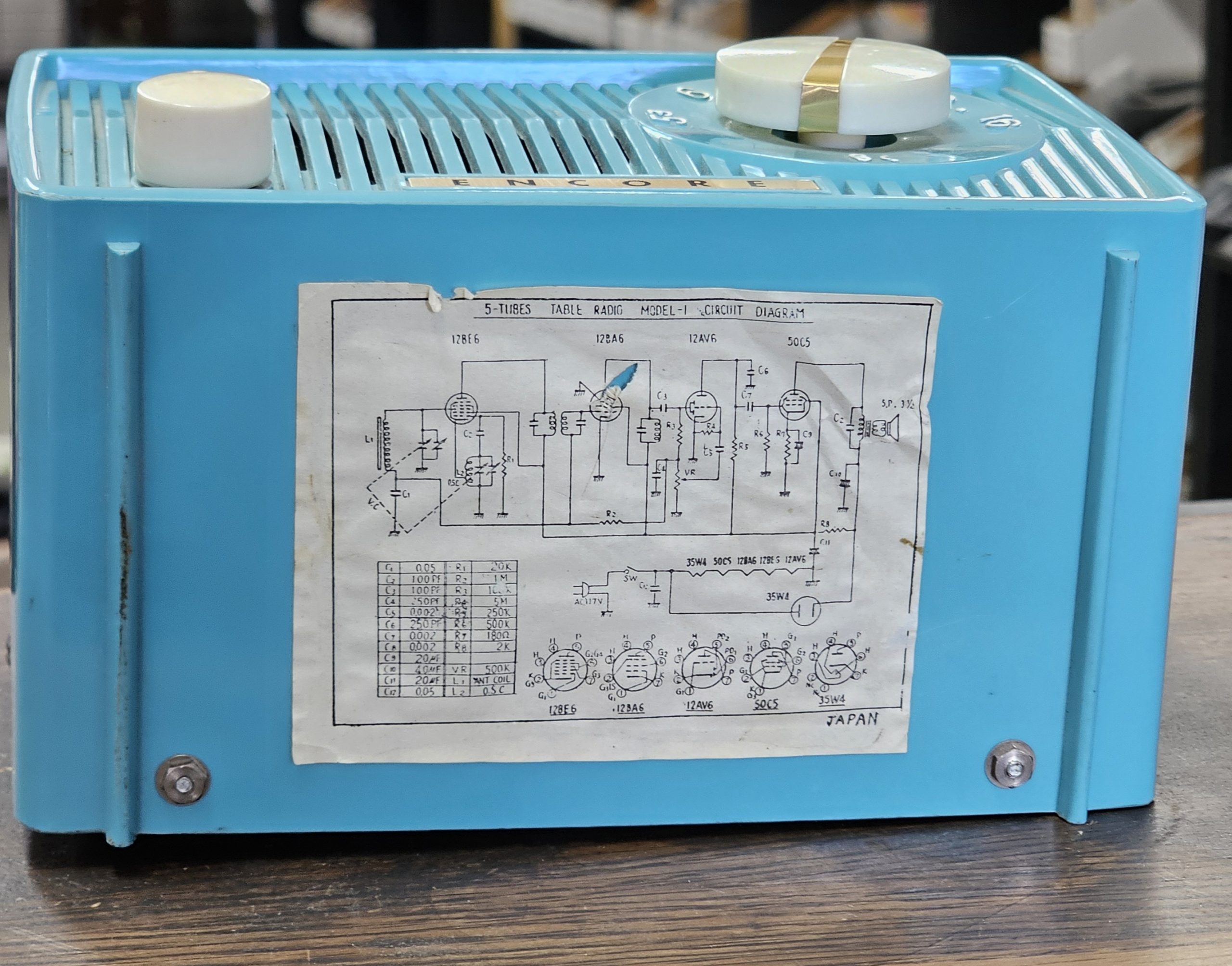 Encore Zephyr Model 1 Midget Radio  Had to replace the plug, but plays well as video below shows.  No chips or cracks, fantastic condition.  This is a compact tube radio, known for its small size (around six inches wide).  It features an AM band tuner and was manufactured in Japan.  These inexpensive midget radios were widely sold during the late 1950s and 1960s.