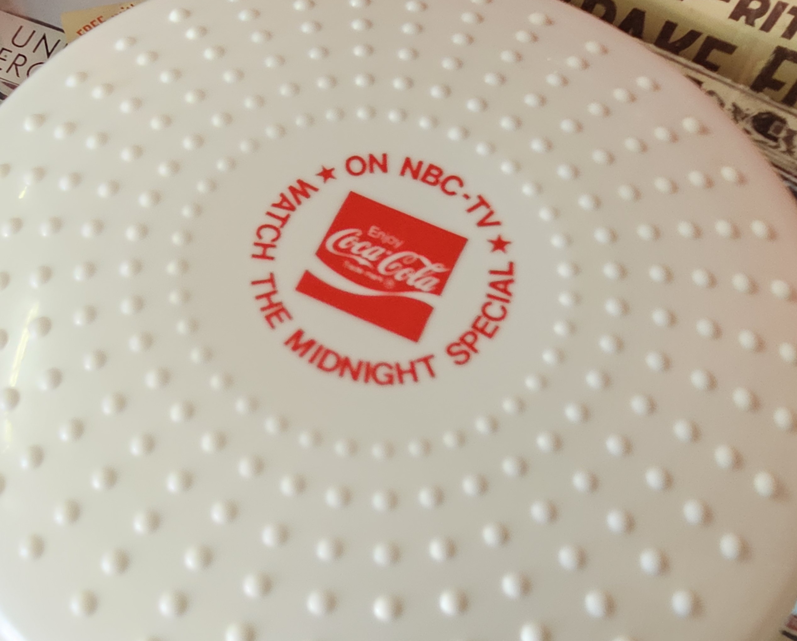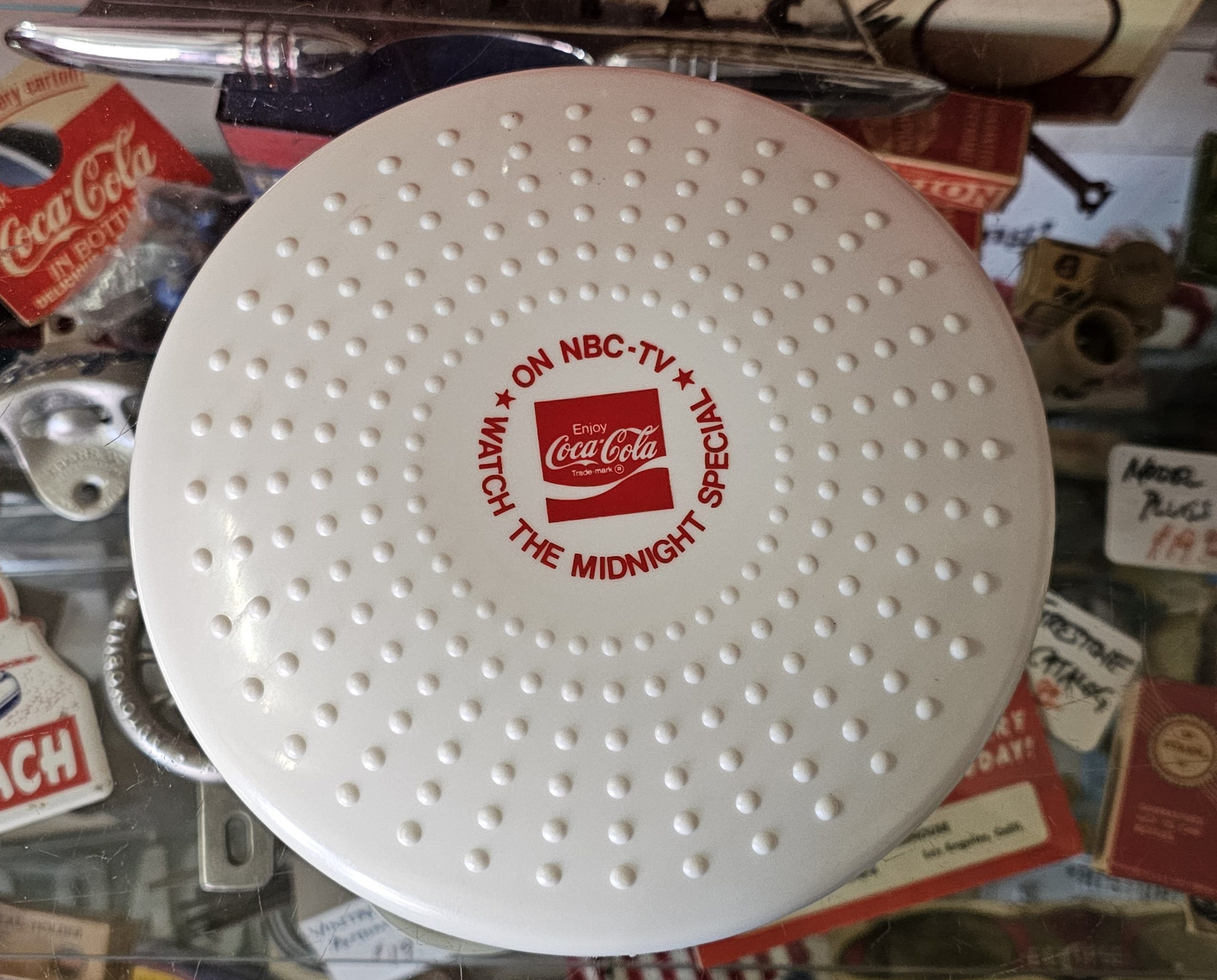 Enjoy Coca-Cola NBC-TV Frisbee  This is a 1970s cross promotional white with red logo frisbee that advertised to watch the NBC show that ran from 1972-81.  Really neat advertising for soda, toy or TV collectors.  Great shape, measures 7 3/4" diameter.  No manufacturer markings found.