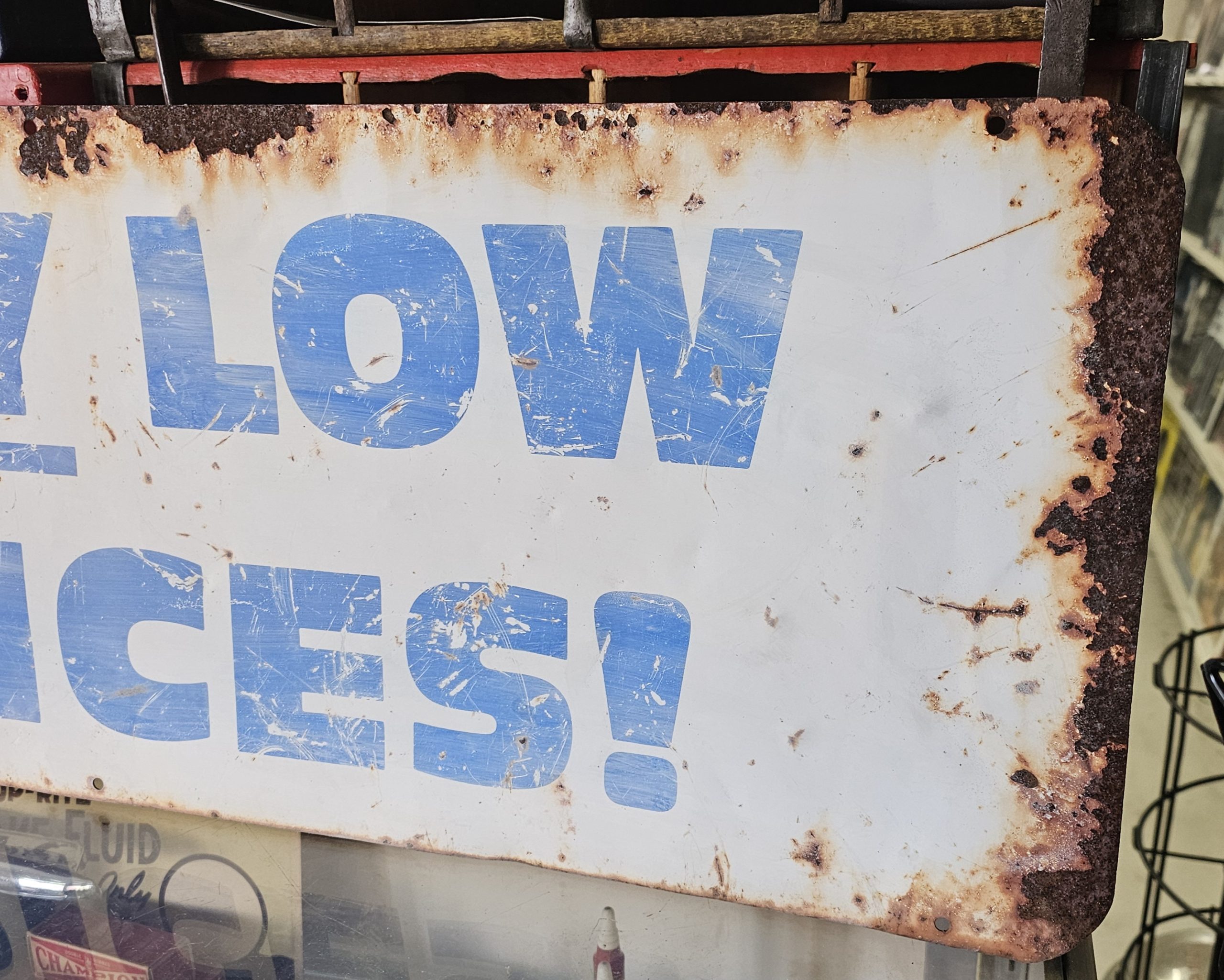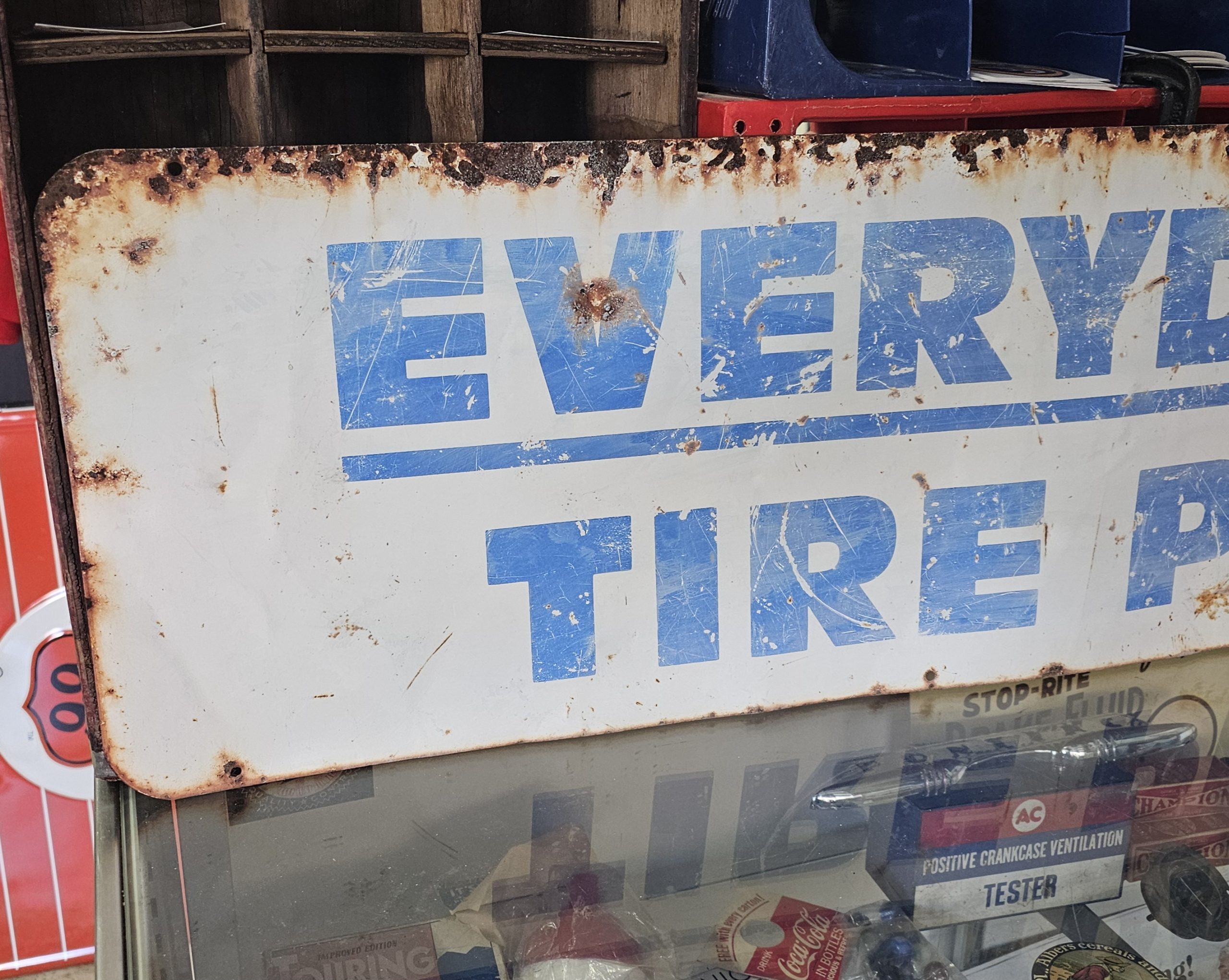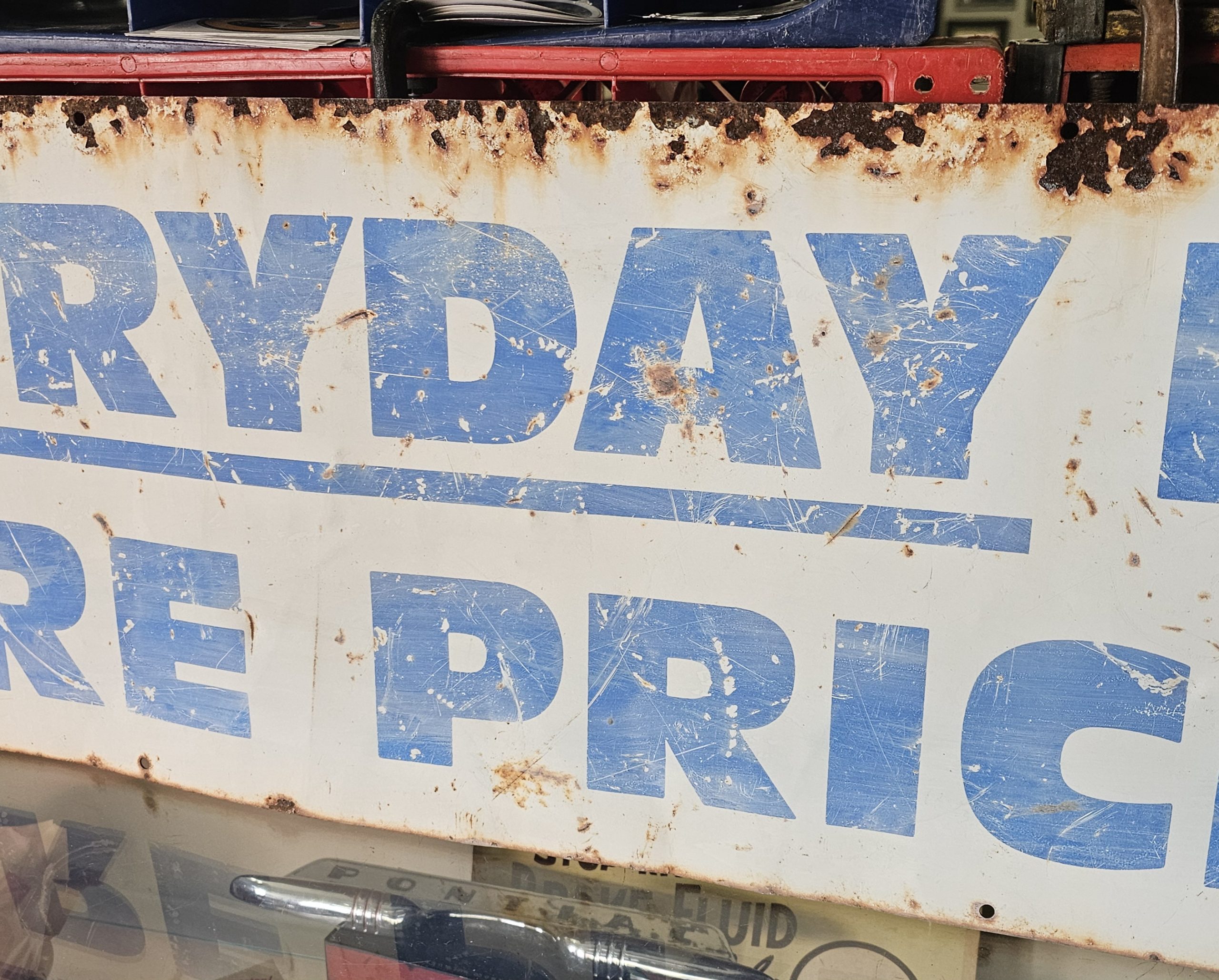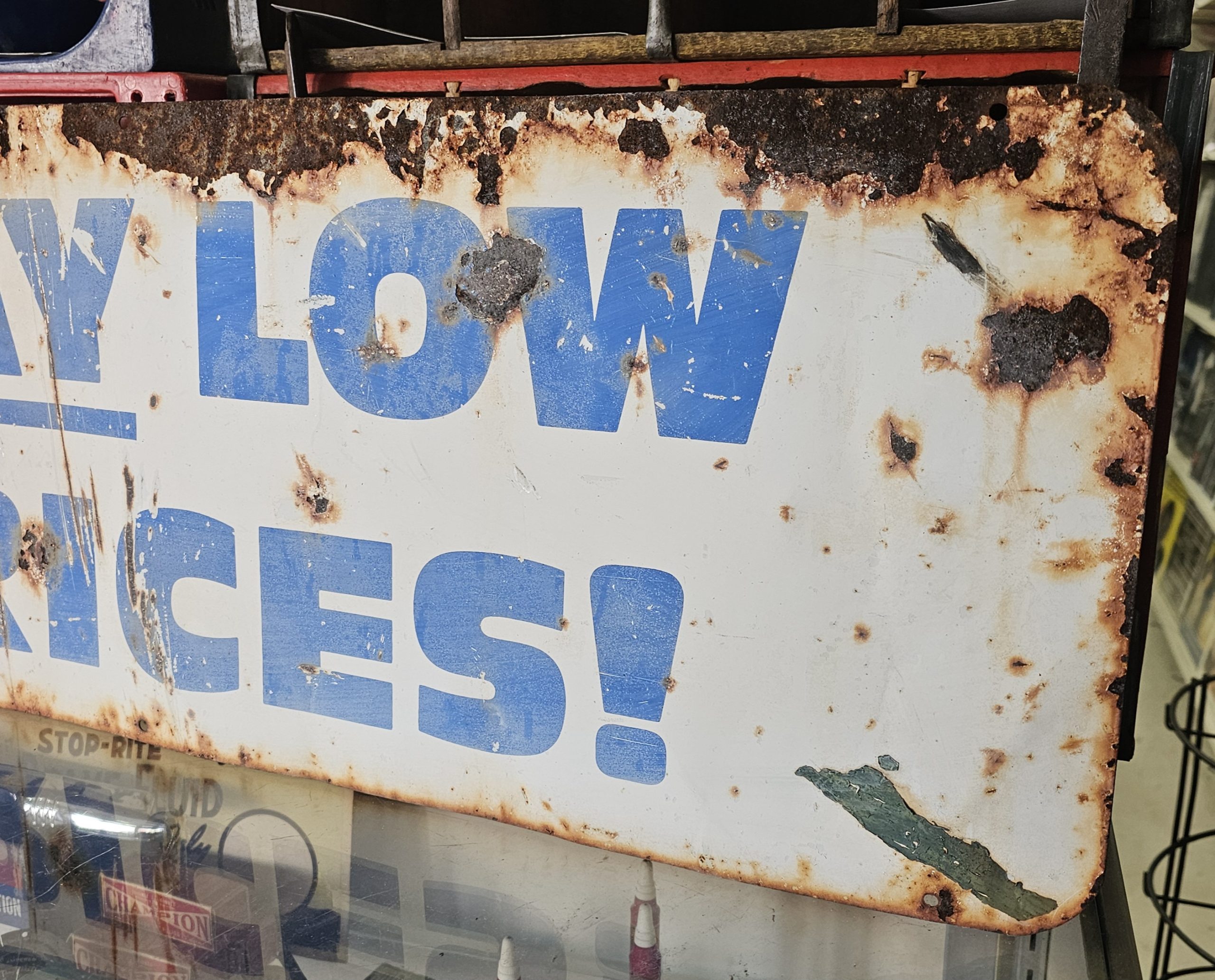 Everyday Low Tire Prices This is an original double sided metal sign. It is in good shape for its age, believe it to be 1960s. Hang it or display it in a stand to show off both sides. Measures 48" X 11 1/2". As pictured, it has issues all around the outer edges, but still a fairly cool addition to any sign collection.