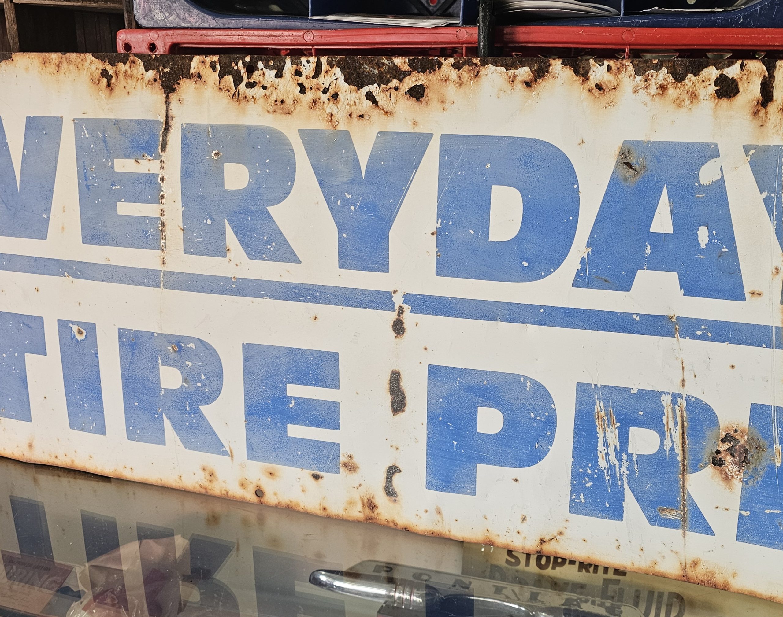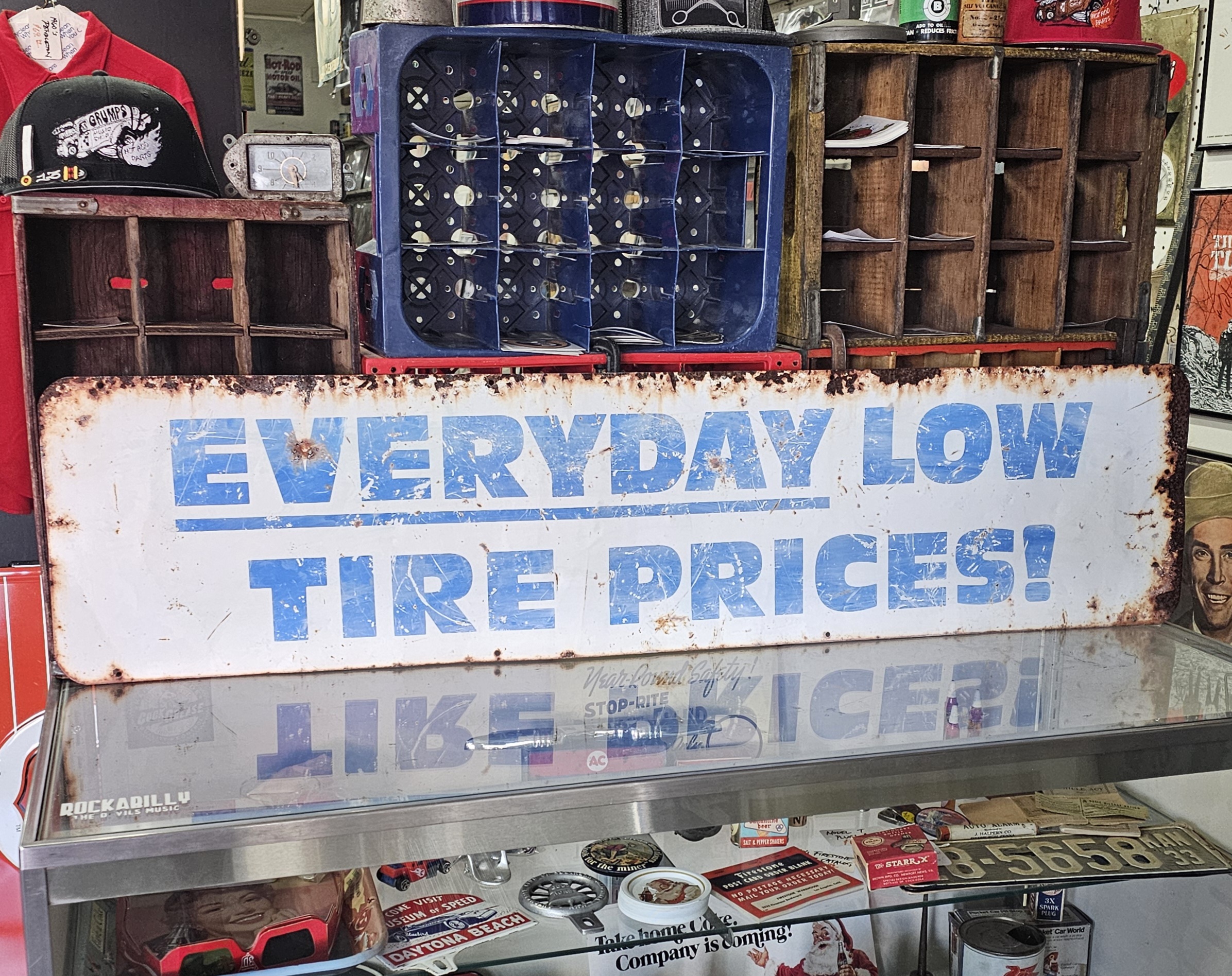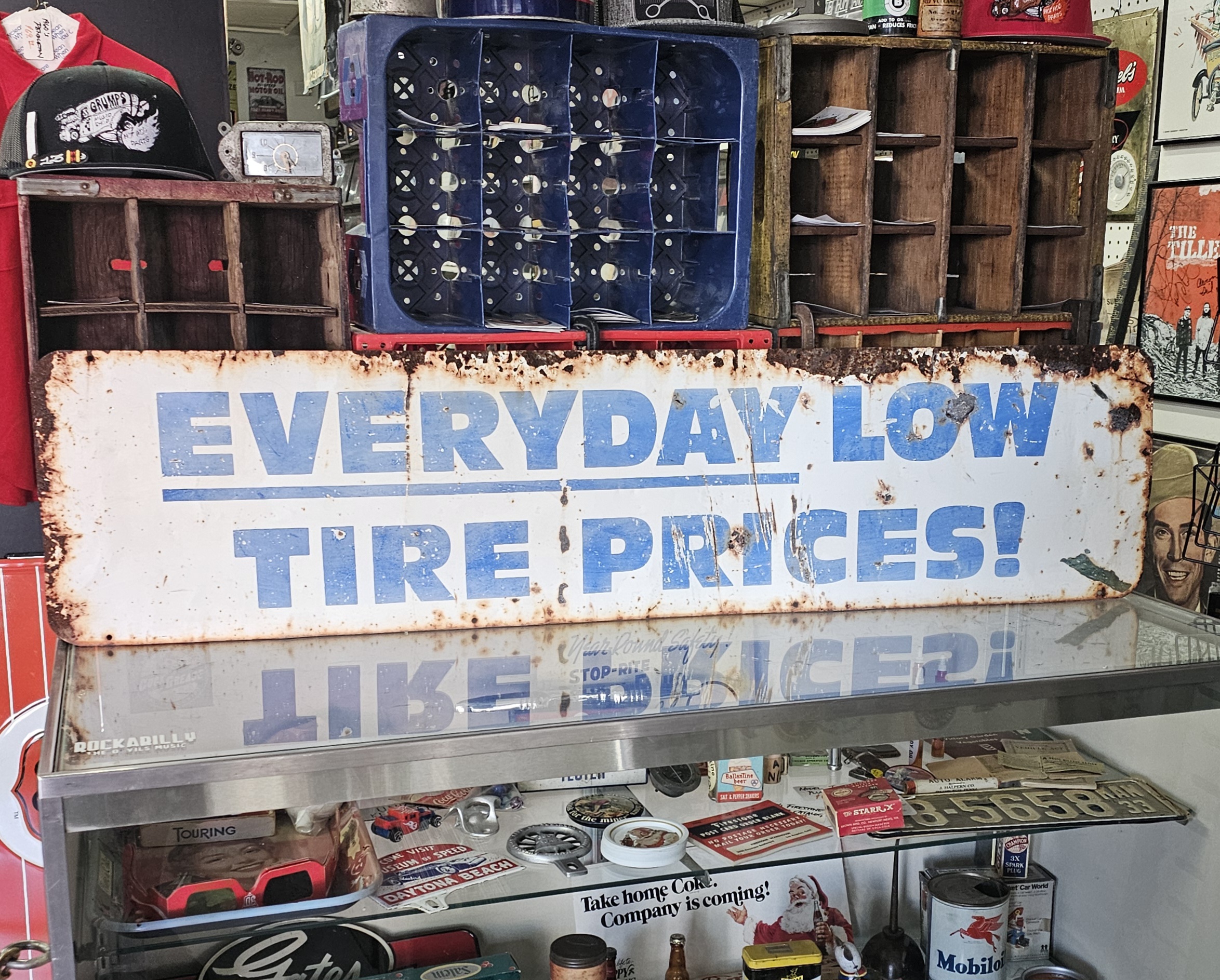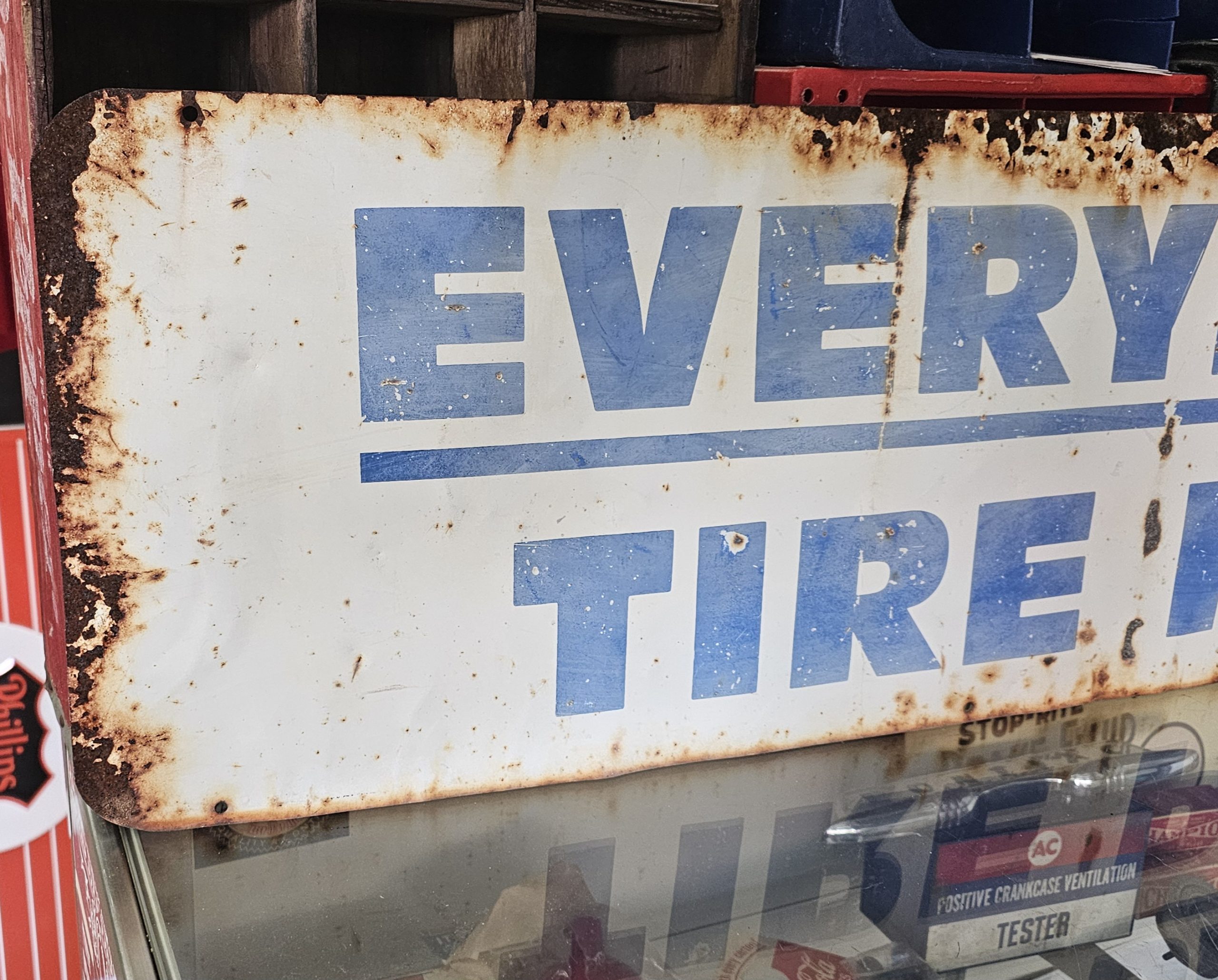 Everyday Low Tire Prices This is an original double sided metal sign. It is in good shape for its age, believe it to be 1960s. Hang it or display it in a stand to show off both sides. Measures 48" X 11 1/2". As pictured, it has issues all around the outer edges, but still a fairly cool addition to any sign collection.