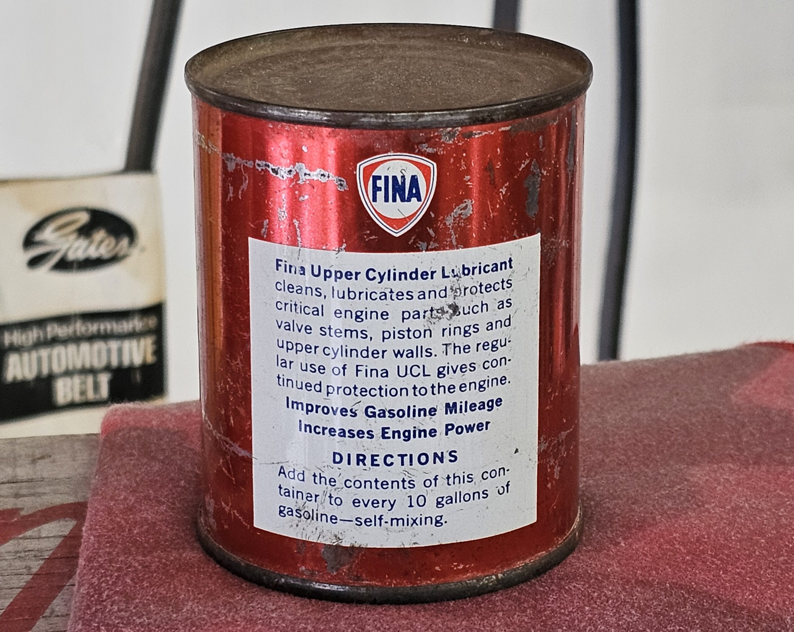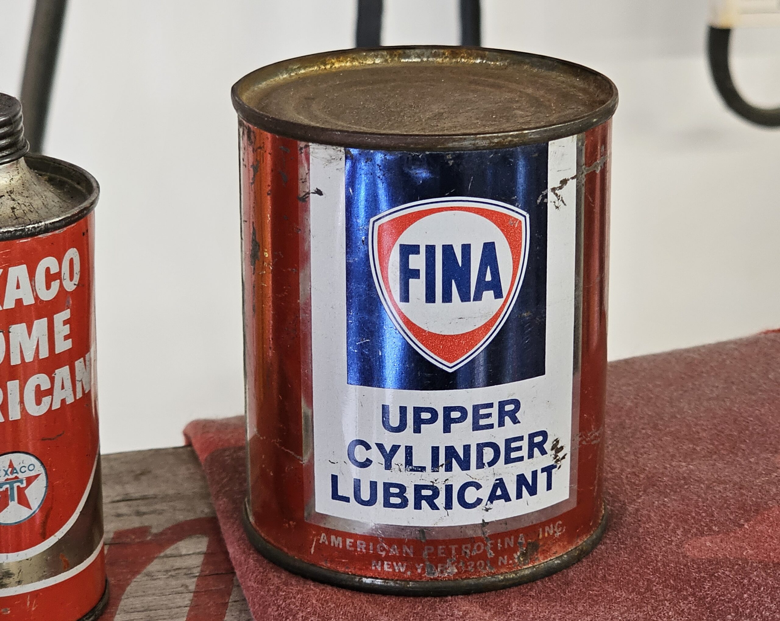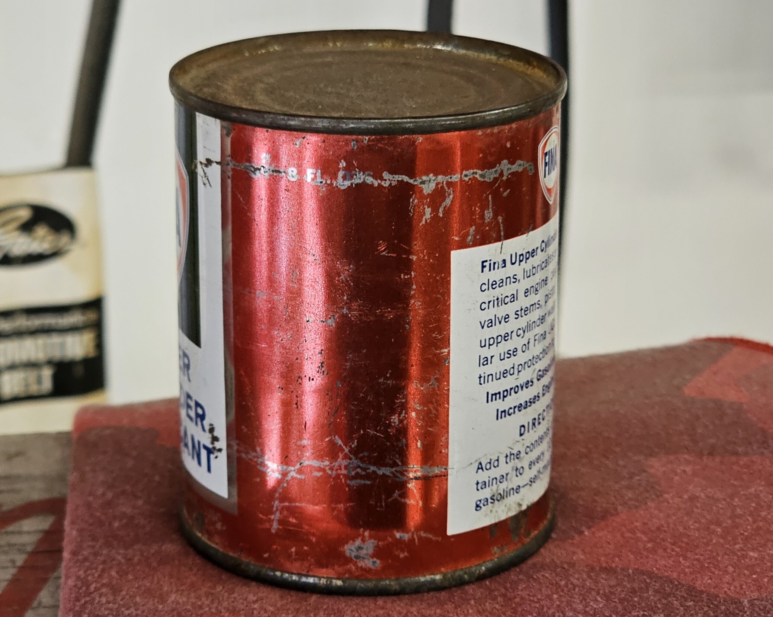 FINA Upper Cylinder Lubricant Can New old stock, but does have some scratching. The can is an 8 oz size. It is an original item from the American Petrofina Inc. It is a type of fuel additive designed to lubricate the upper parts of an engine's cylinders. Upper cylinder lubricants are used to prevent wear on metal parts and can improve fuel efficiency.