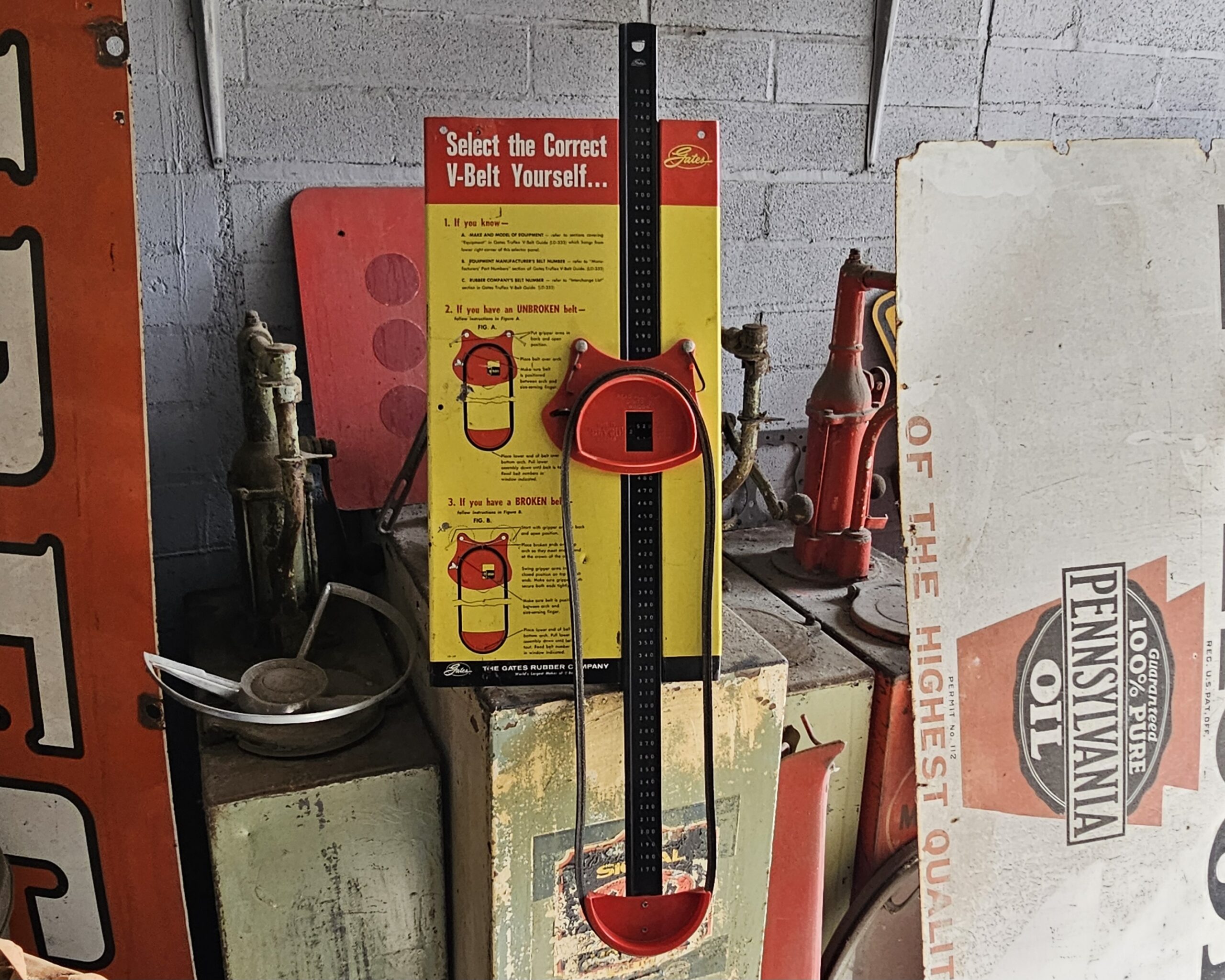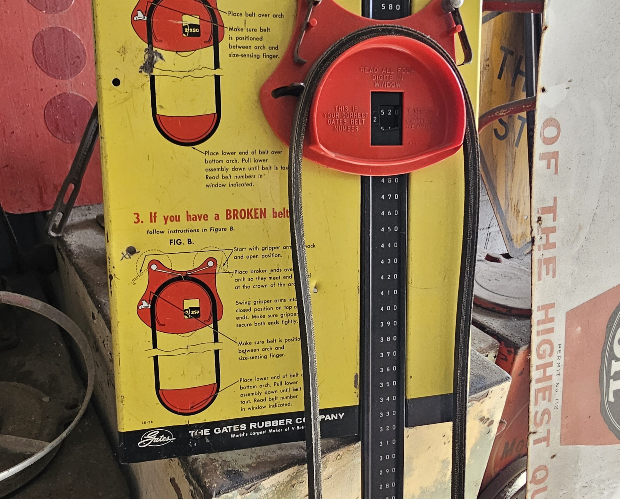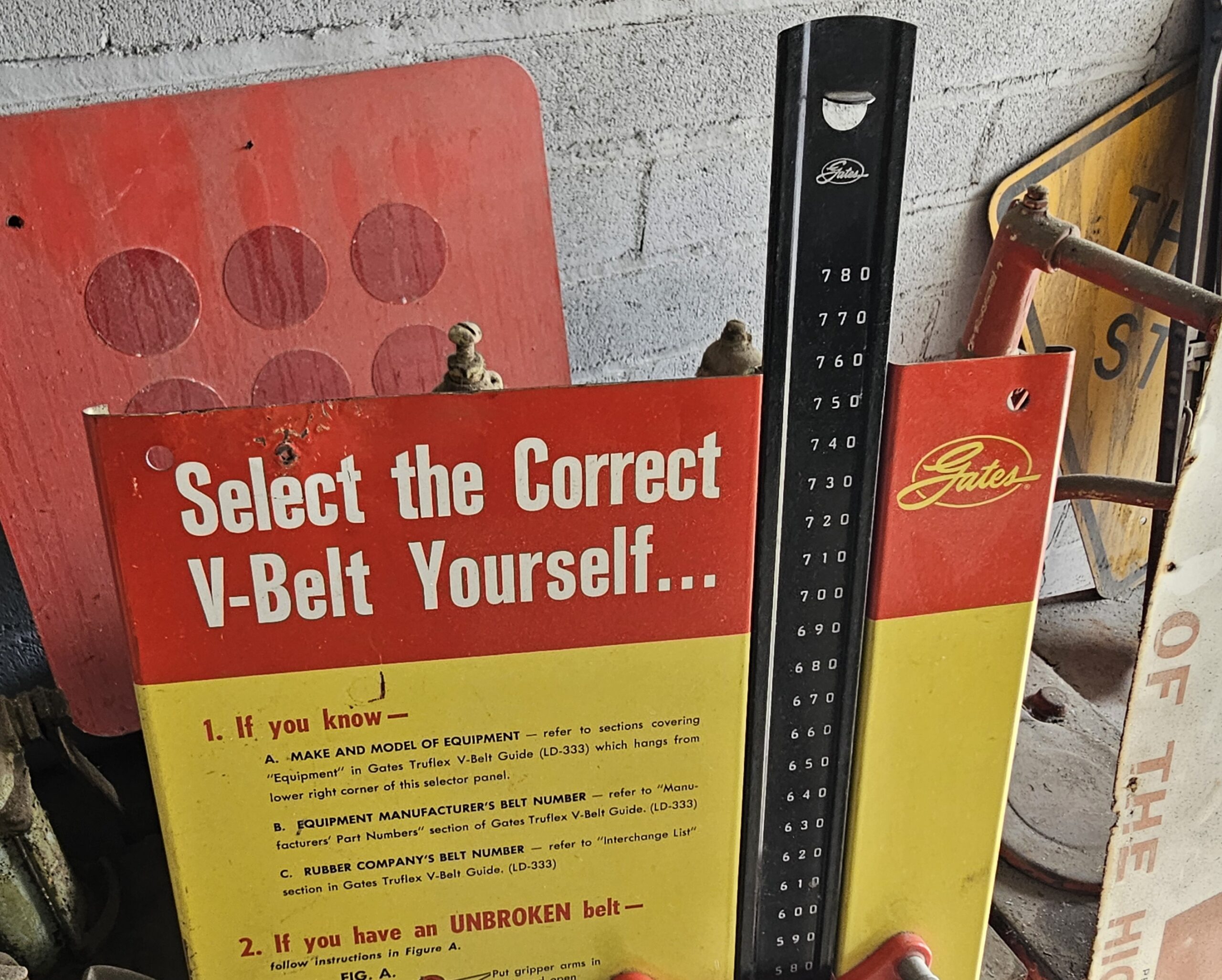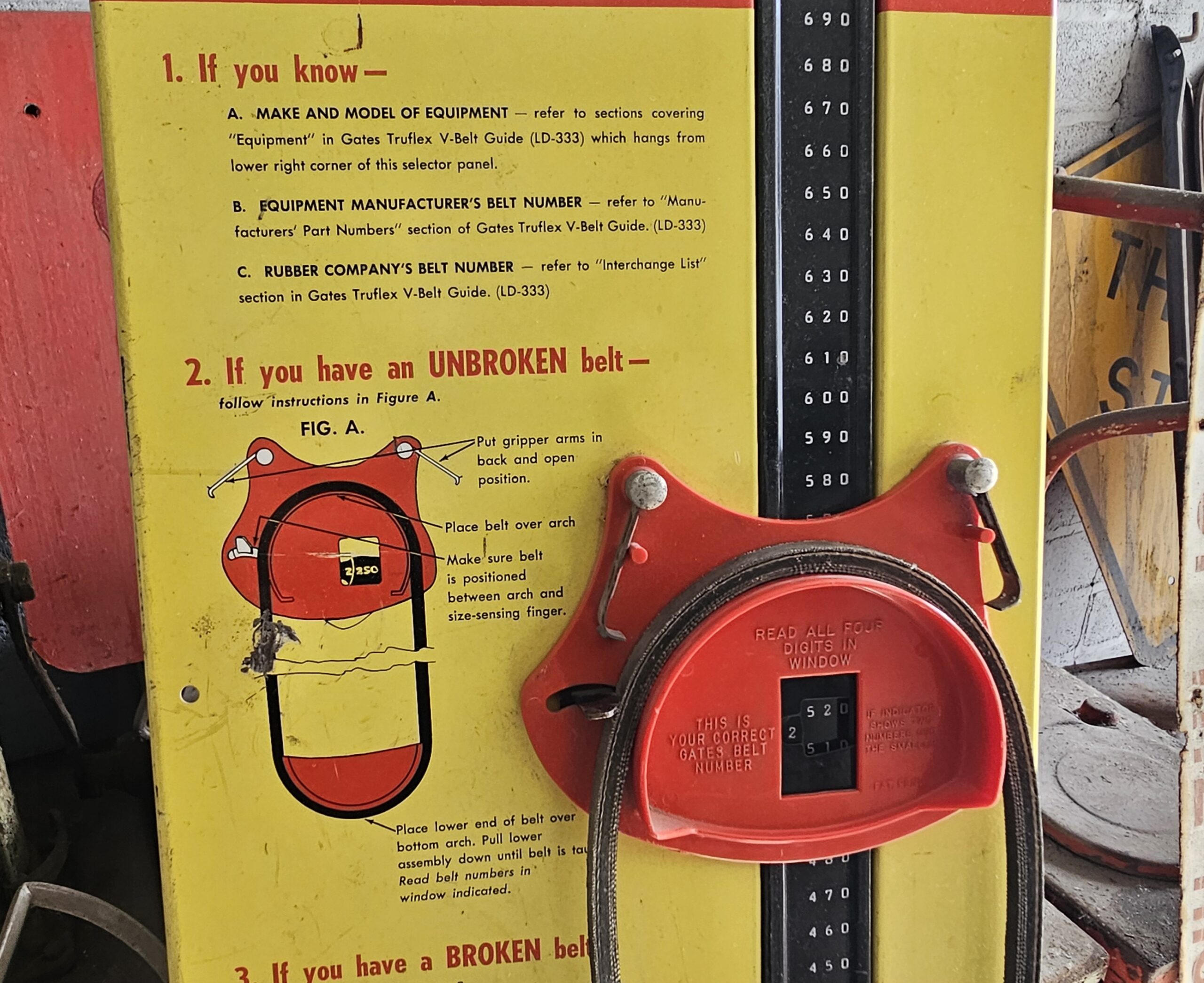 Gates Fan V-Belt Length Finder, Tin Good shape original. Has some denting, after all these were used in automotive shops and stores. Color is fantastic, does include the belt. Grumps Collectibles So-Cal.