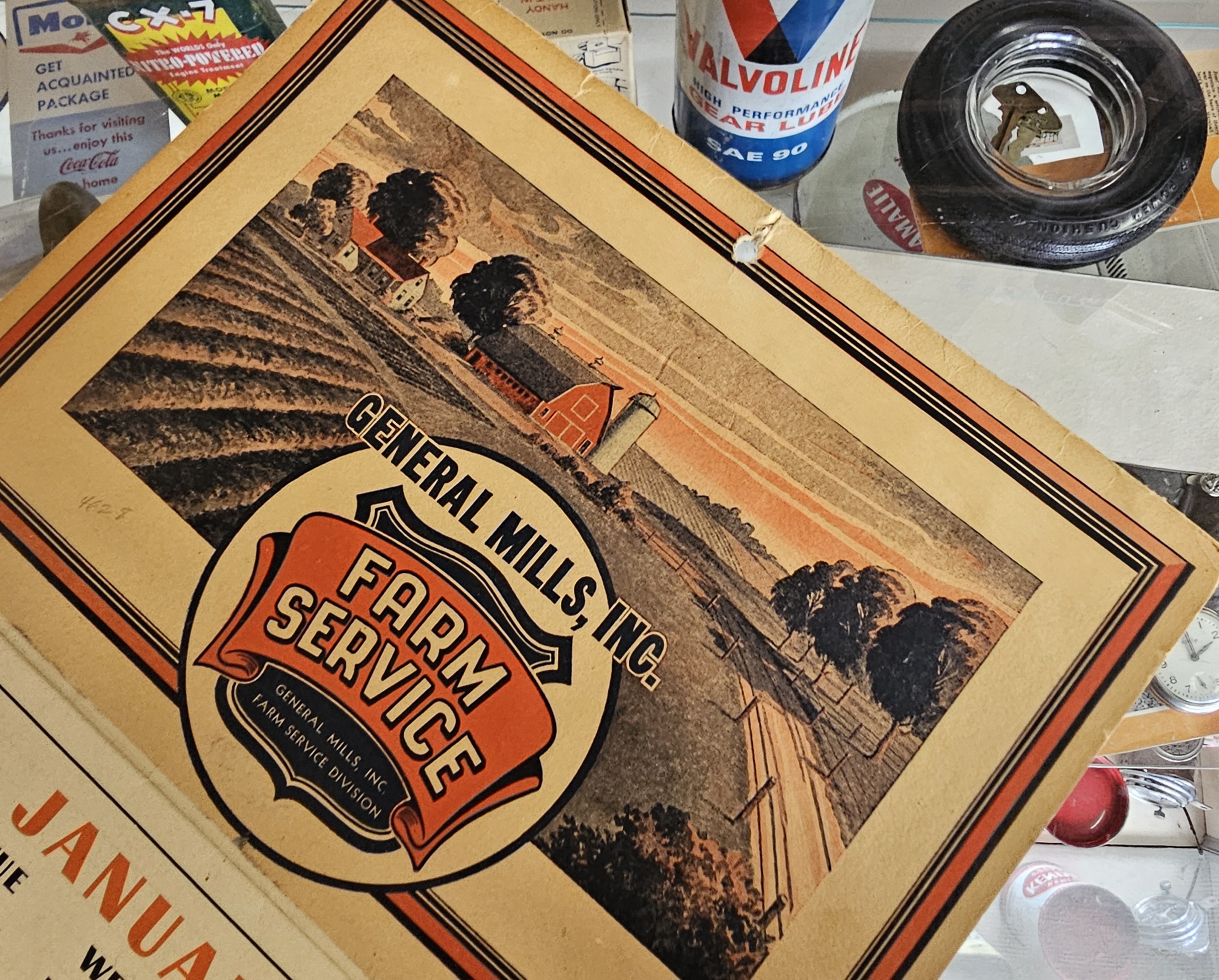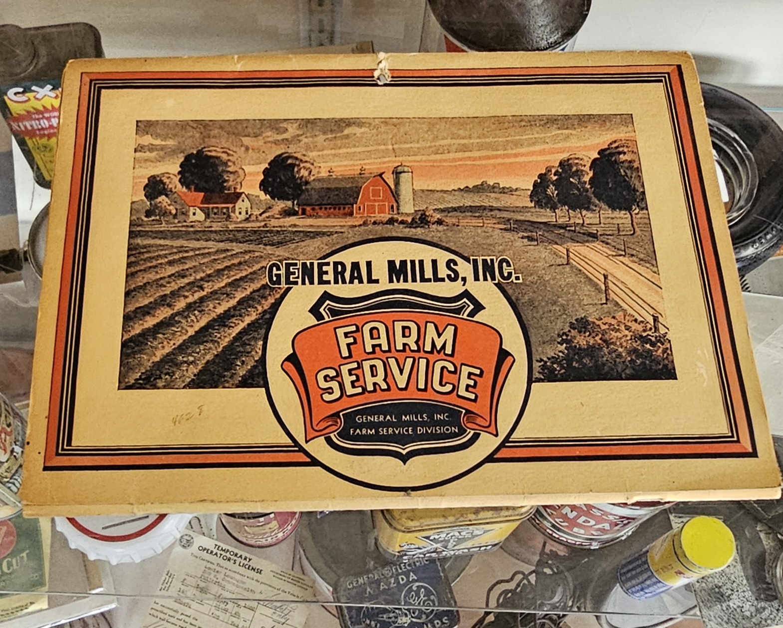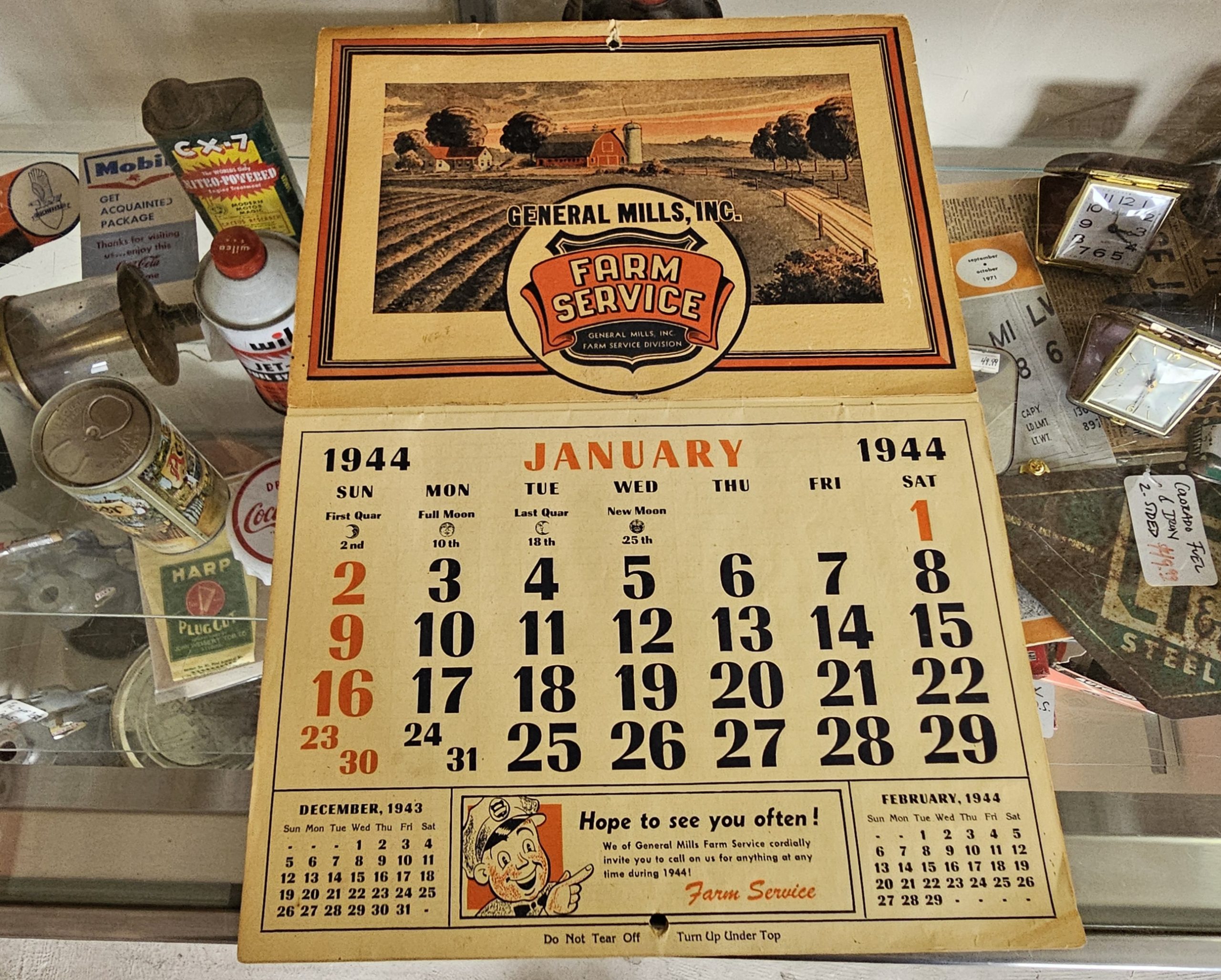 General Mills Farm Service Calendar 1944 This is an original calendar and was used monthly on moneys paid out side. Has all months and a bunch of helpful facts for food and weights plus more. Shows aging and hanging hole is torn, but graphics hold strong.