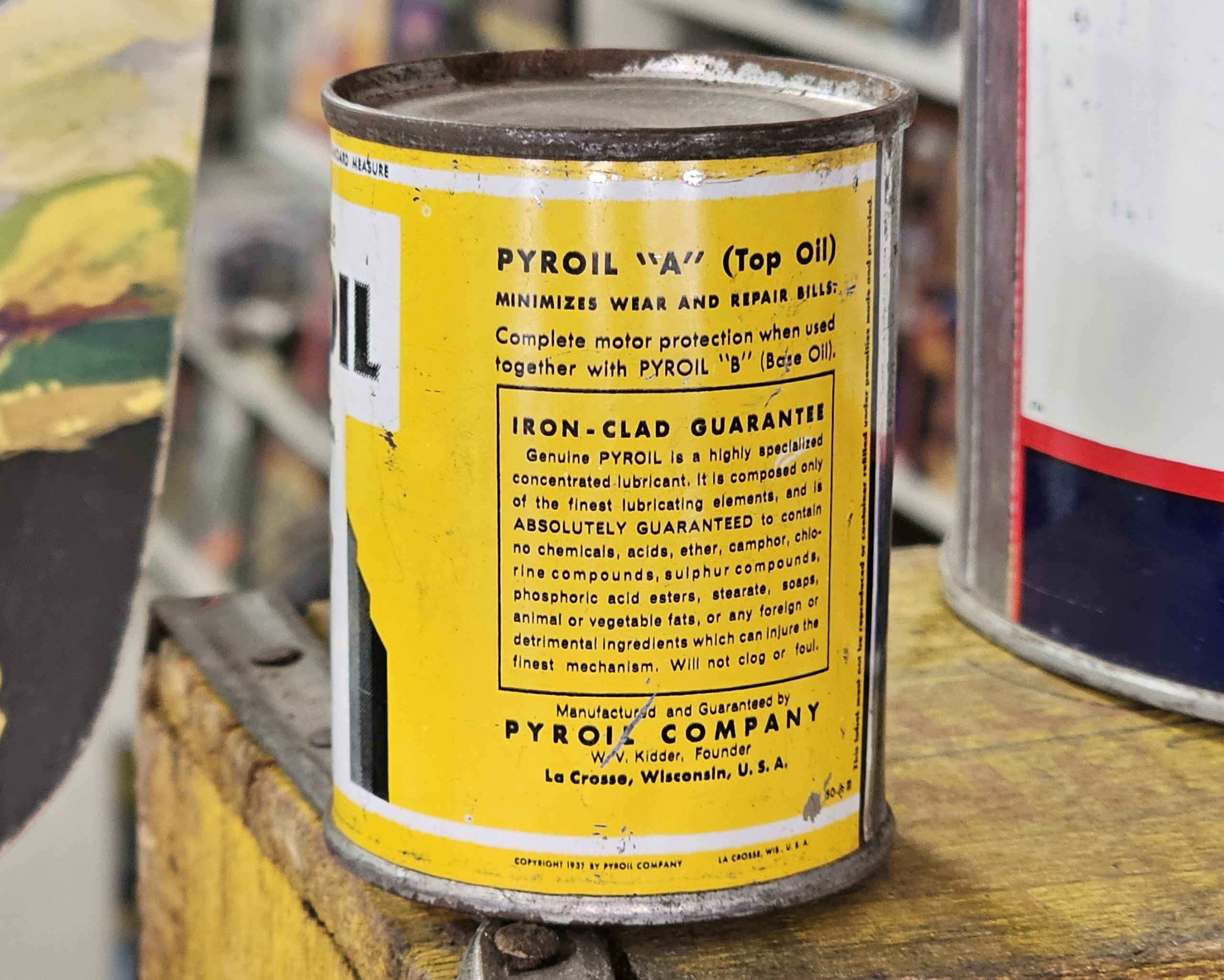 Genuine A Pyroil Top Oil Can A new old stock 3 Fluid Ounce can. Graphics are still great with the exception of one dent pictured on the rear left. Advertises it minimizes wear and repair bills. Manufactured by Pyroil Company La Crosse, Wisconsin U.S.A.