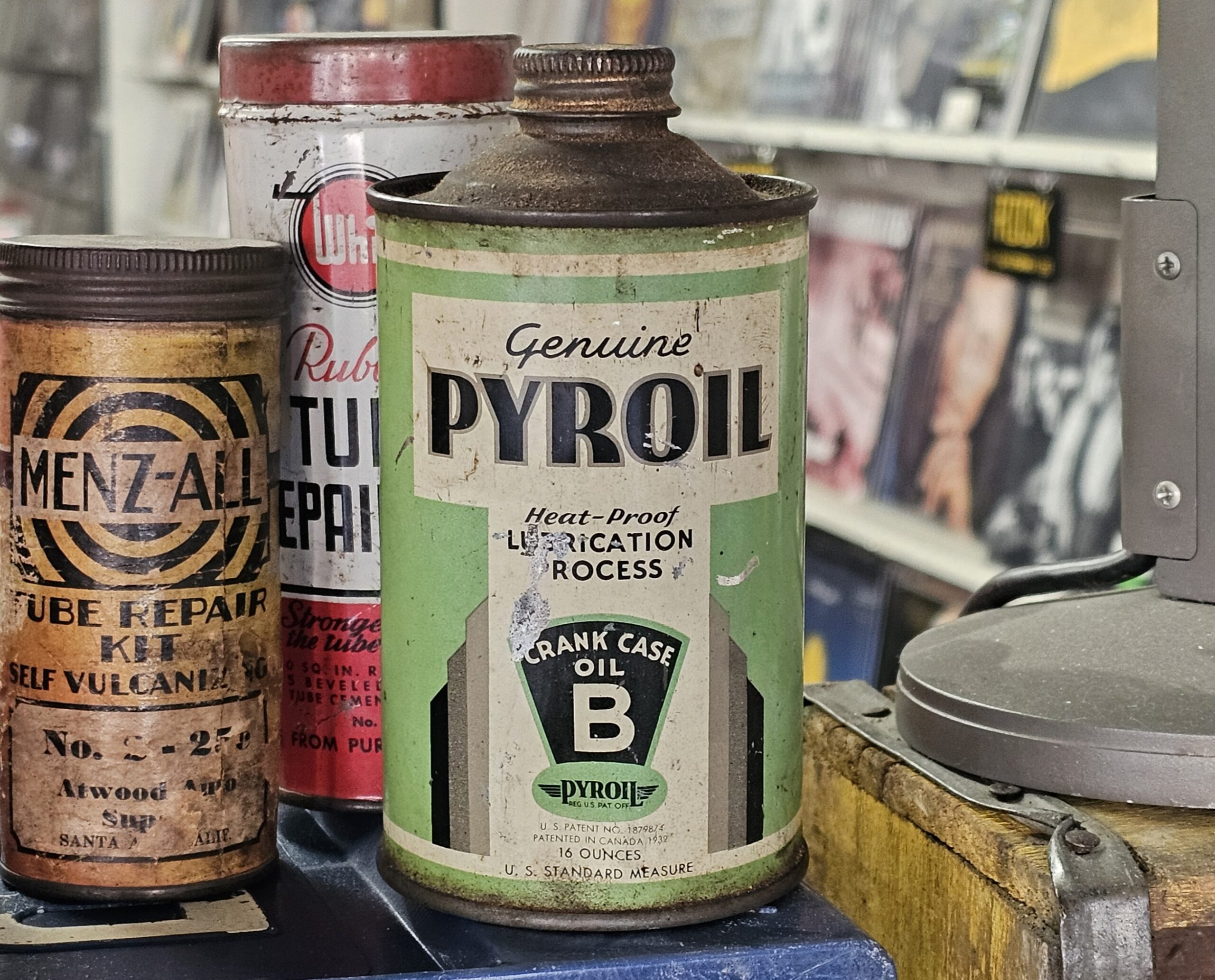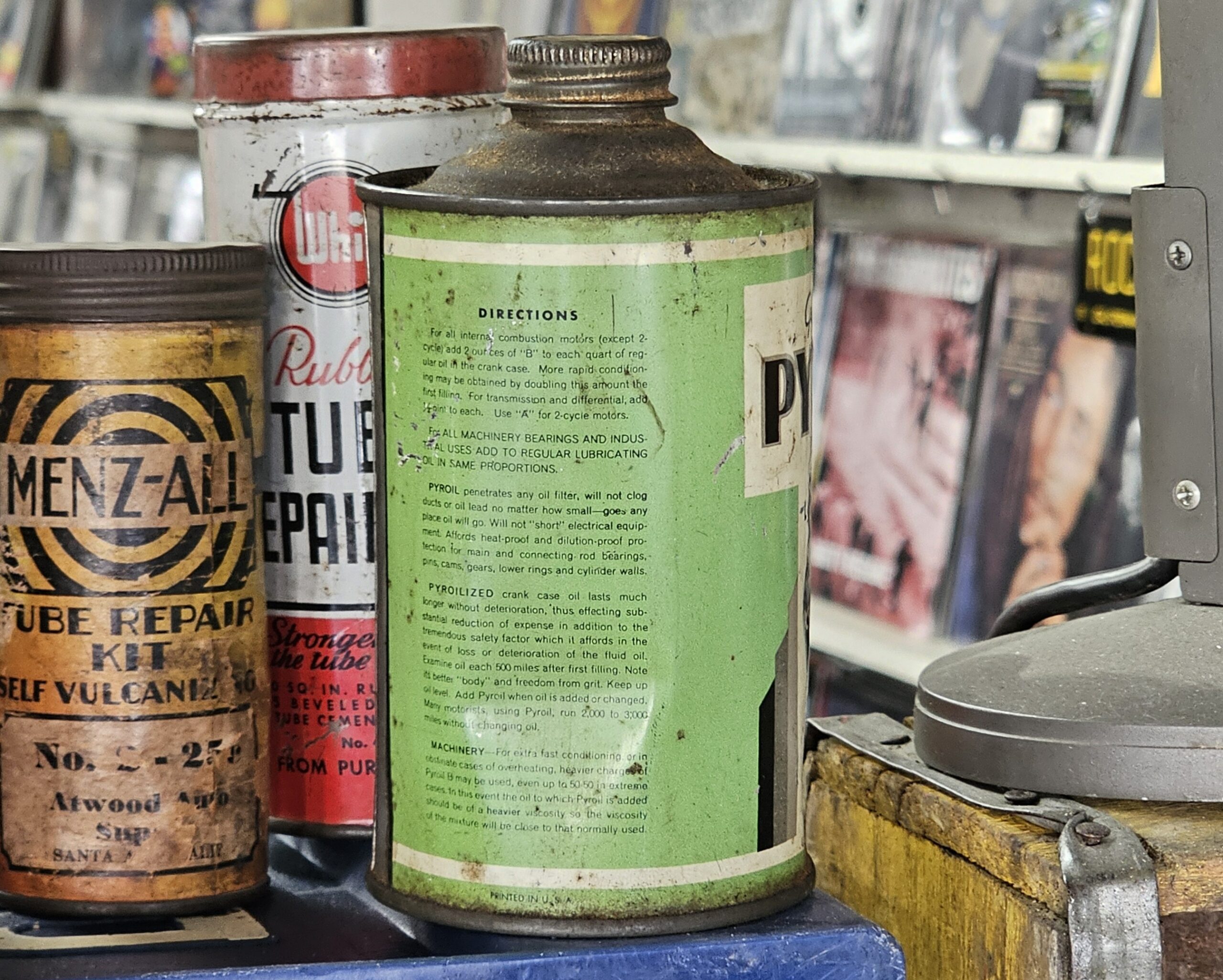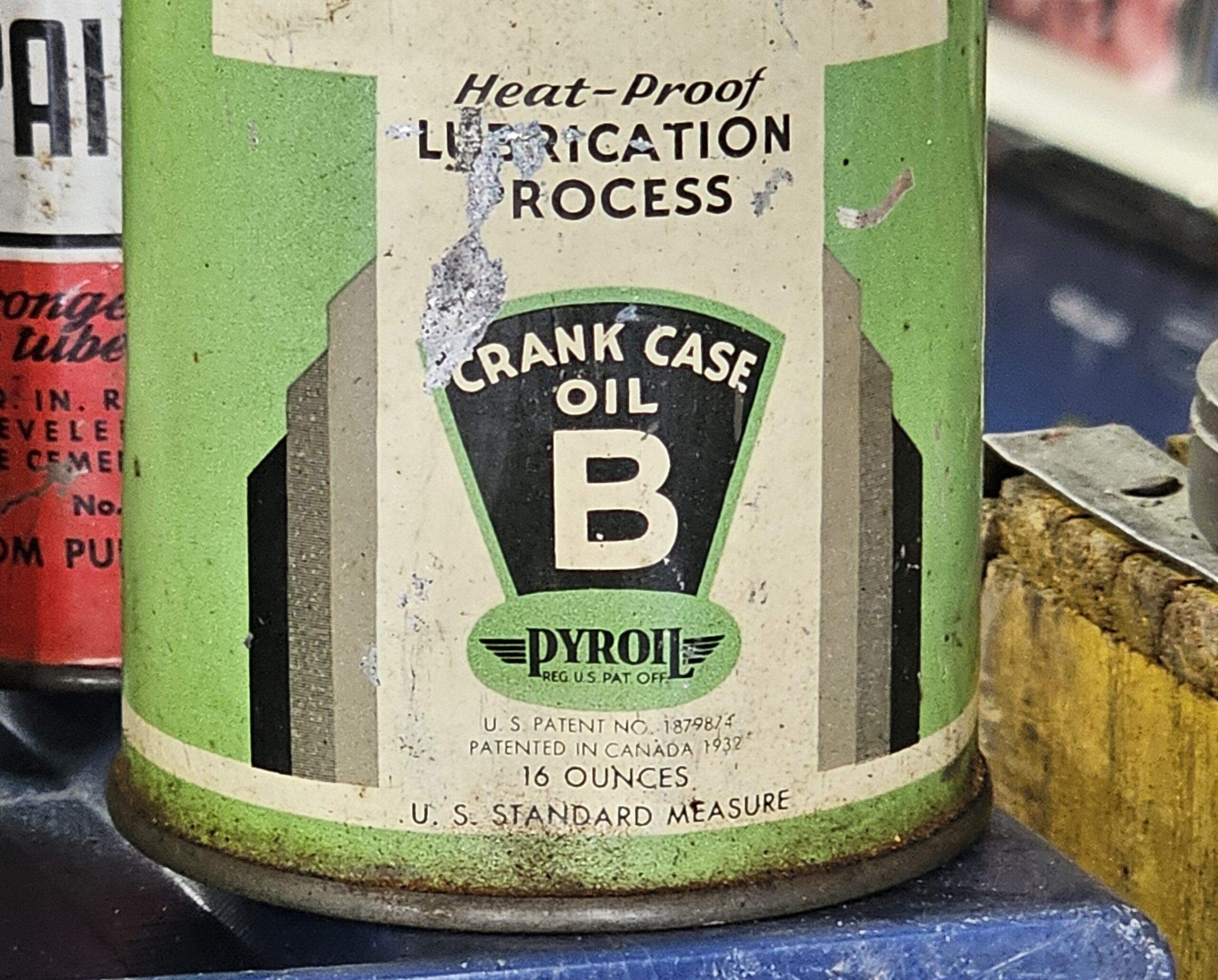 Genuine Pyroil Crank Case Oil Cone Top Neat smaller cone top. Has scratch at front and some denting and has original cap. Early 1950s 16 ounce can, U.S. standard measure. Neat addition to your oil can or Pyroil collection. Grumps Collectibles So-Cal.