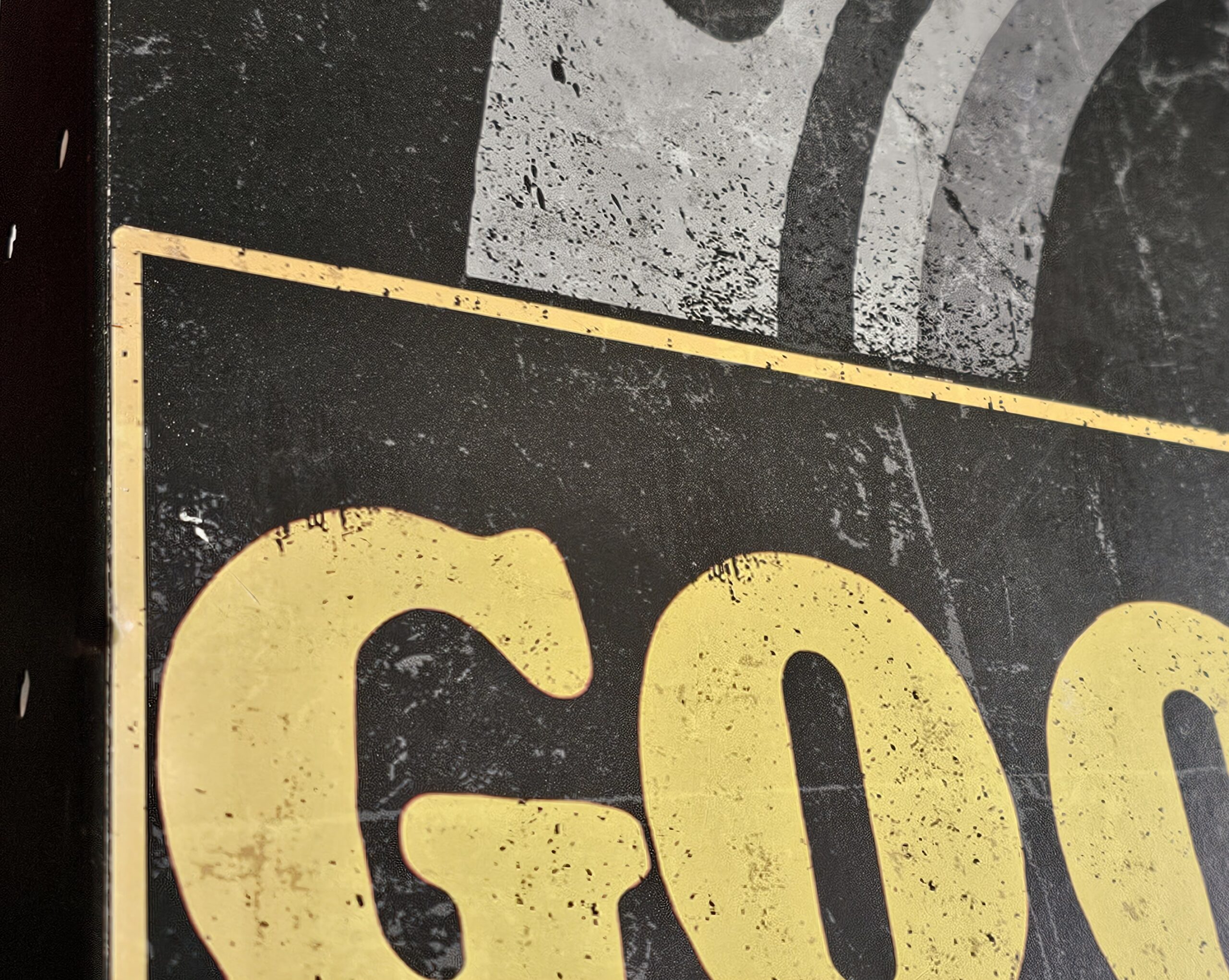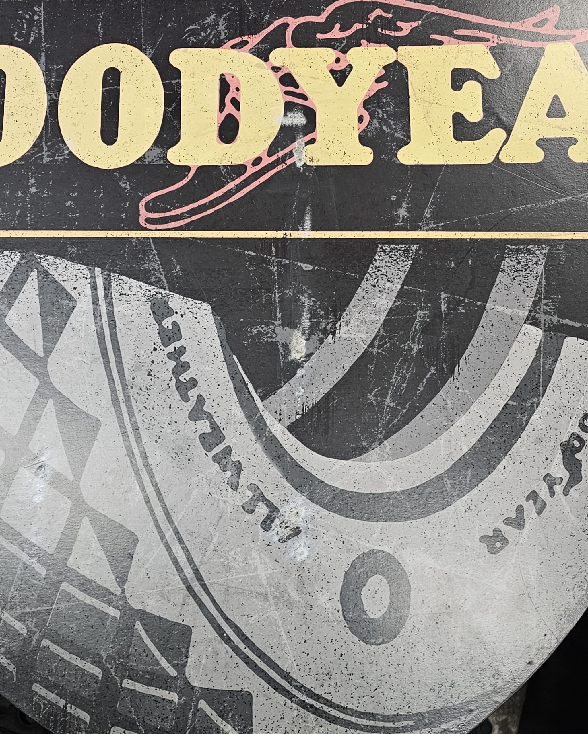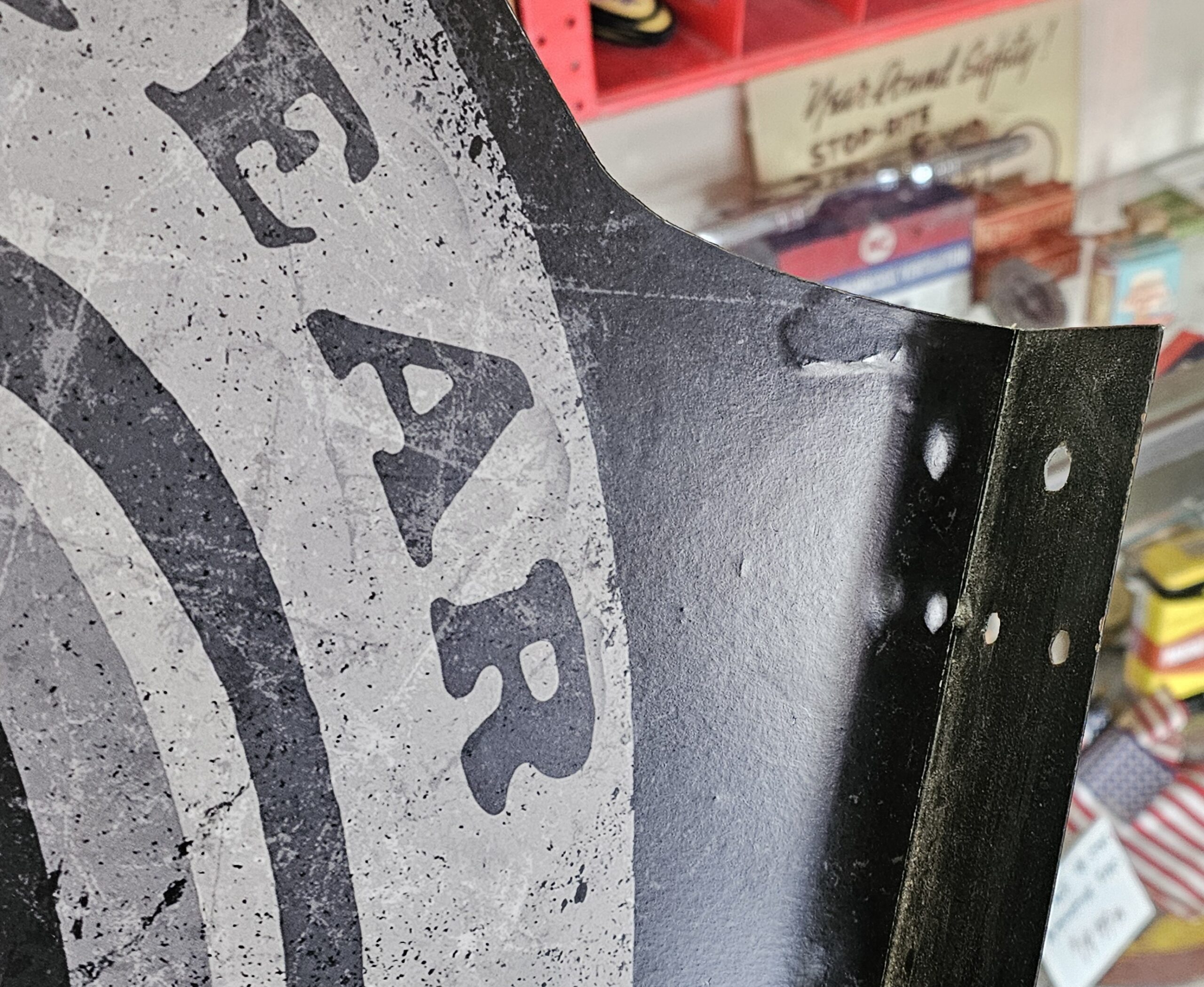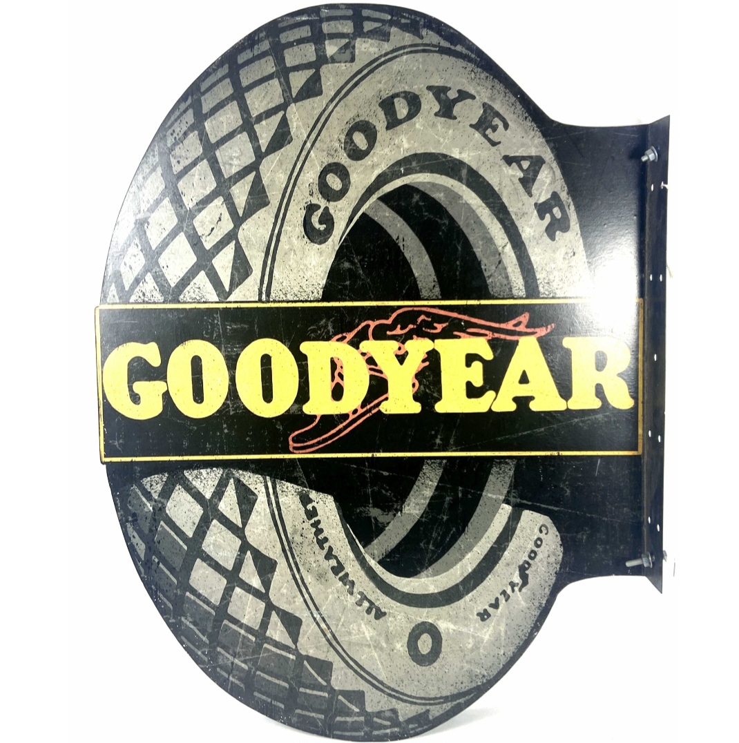 Goodyear Tires Flange Sign This is a early reproduction of the original porcelain sign. This is tin, double sided of course. This is new, but has been moved through 2 shop moves and displayed for 19 years. As pictures show, it is very nice but has small area of rubbing, a little bubble and a couple small chips. Measures 30 1/4" X 22 1/2". Grumps So-Cal.