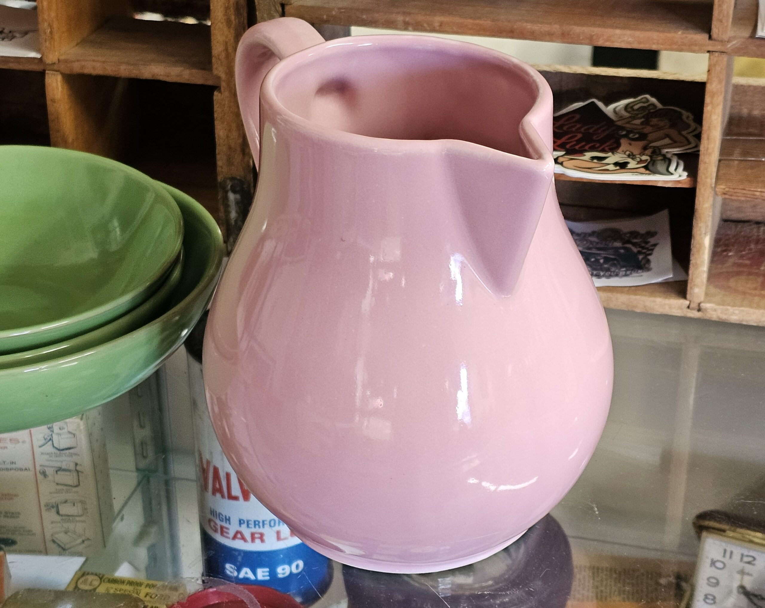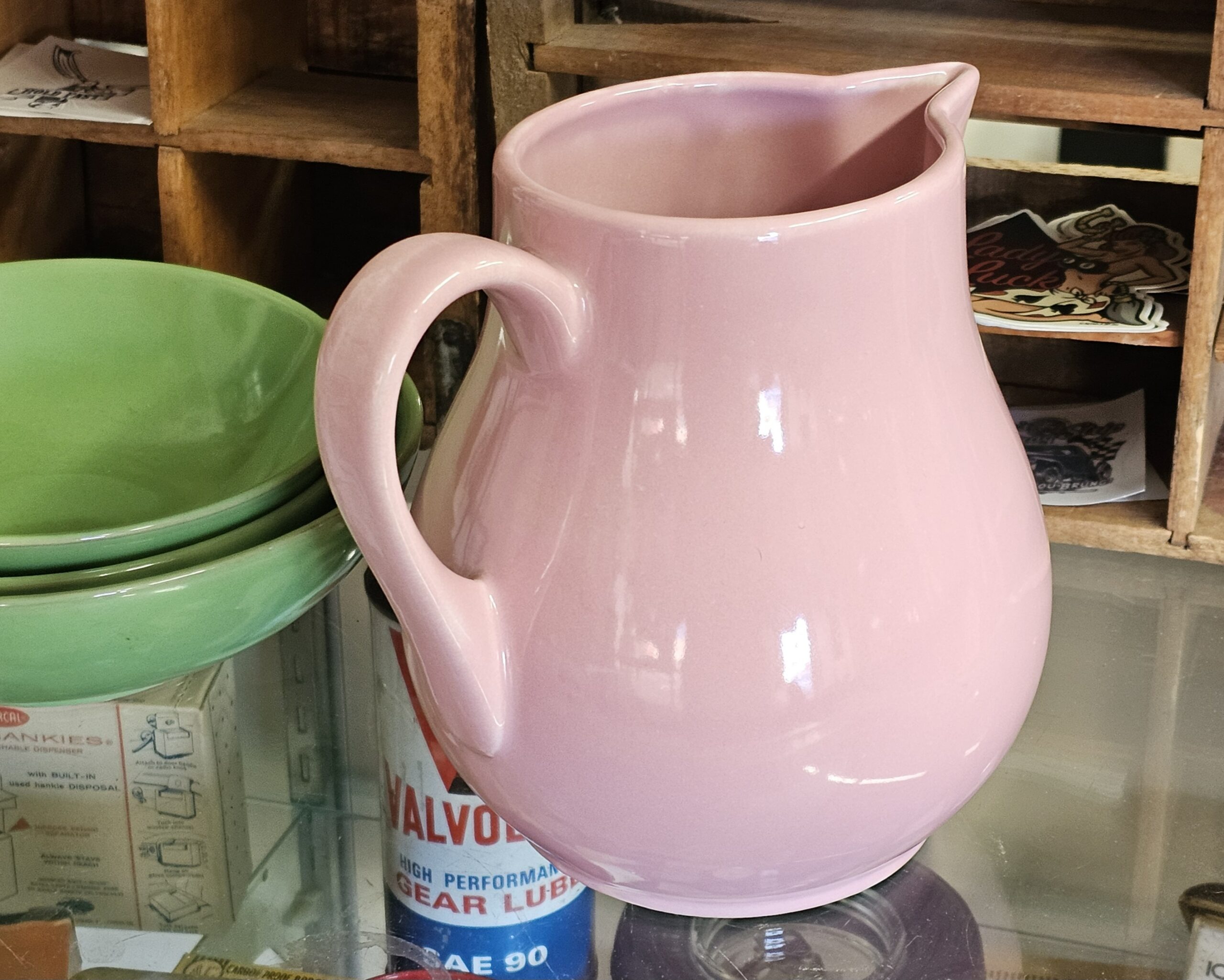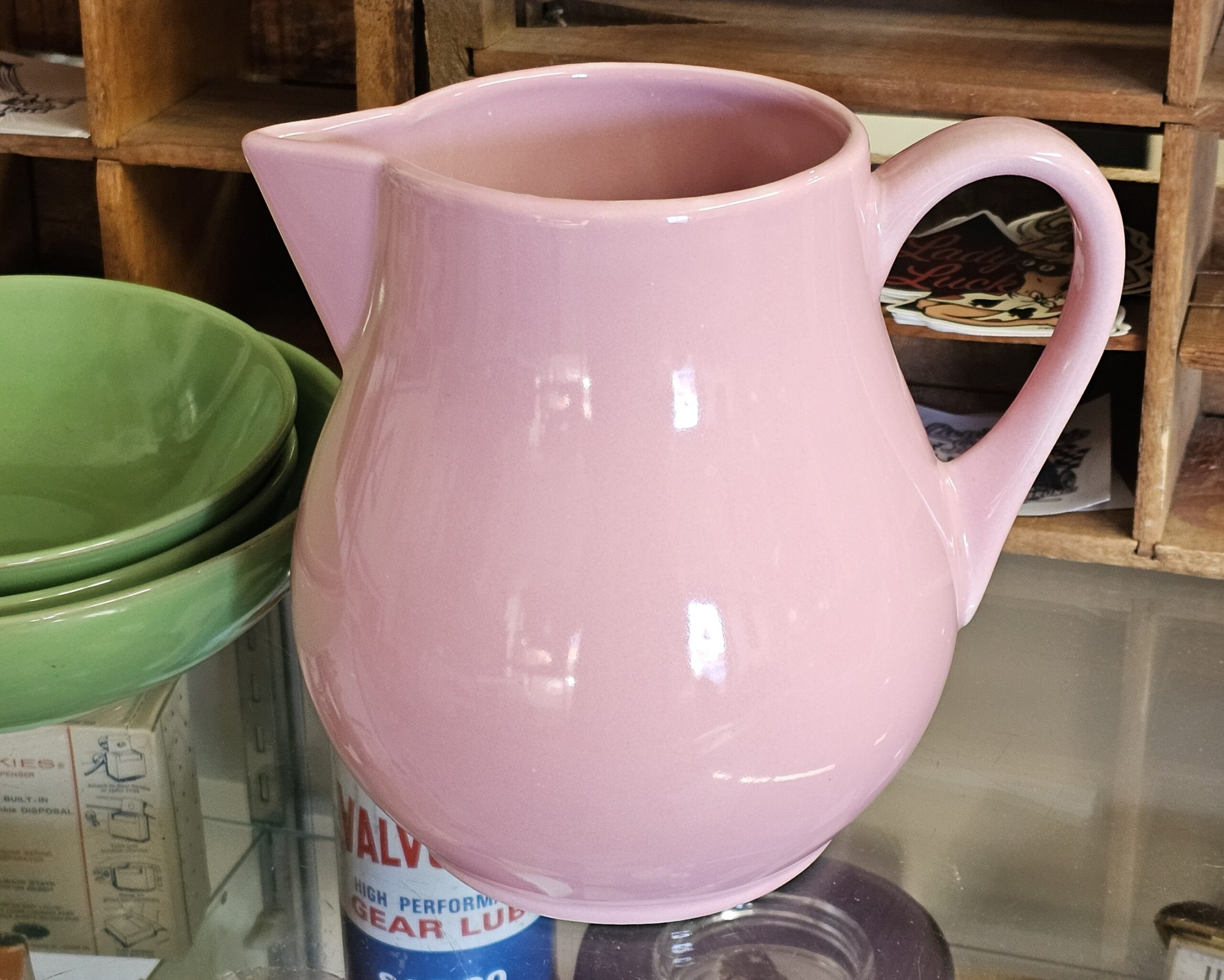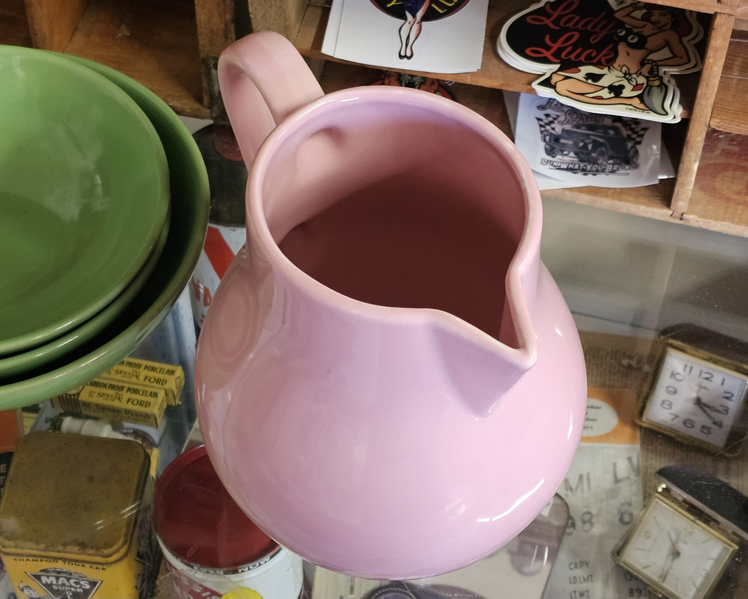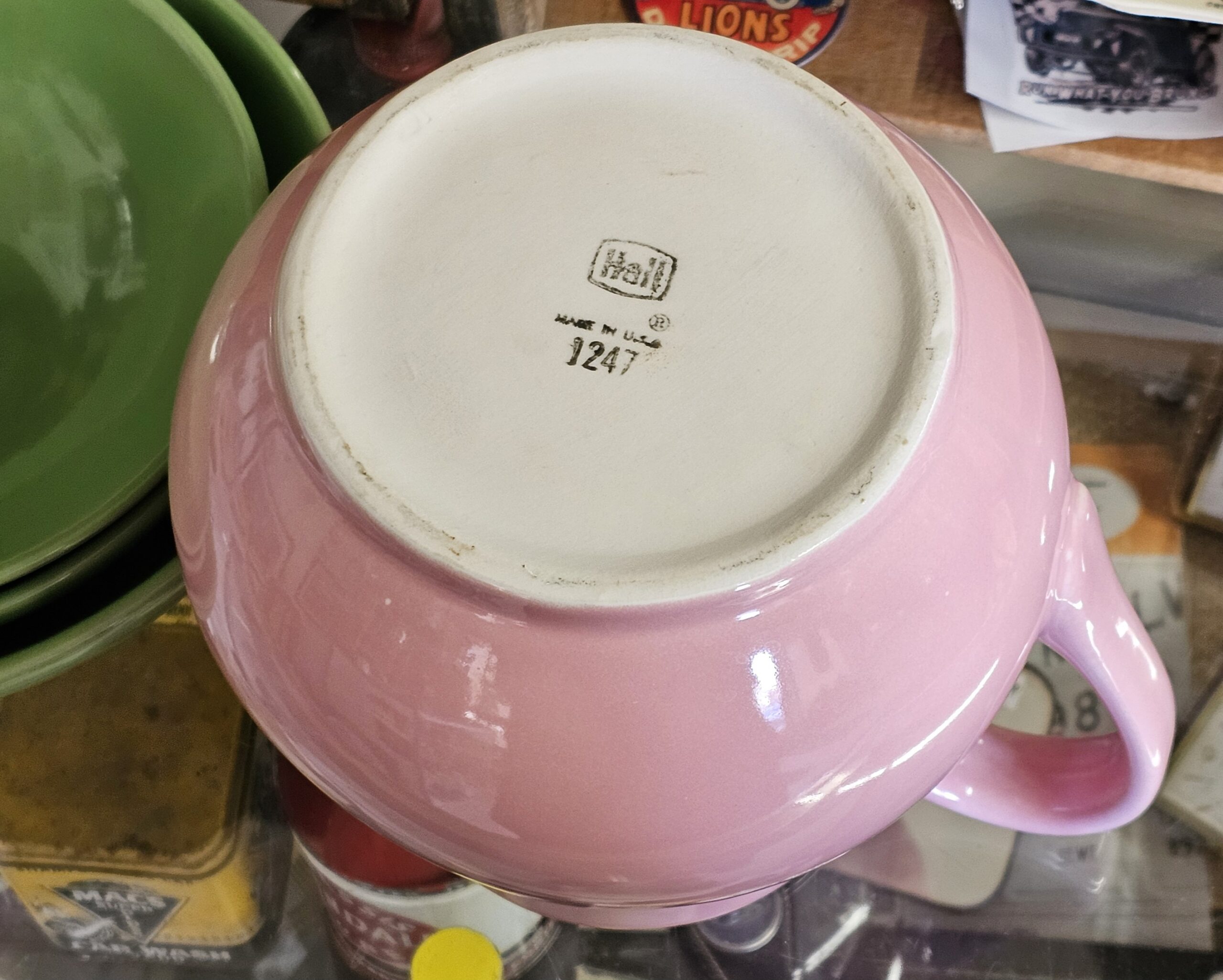 Hall Pink Water Pitcher 1247 No cracks or chips of any kind. Fantastic condition, and ready for home use. Made in U.S.A. by the Hall China Company, a prominent American pottery manufacturer known for its durable and collectible ceramics. The number "1247" identifies the specific design or mold used for this pitcher, which was produced in various colors over time. This style of pitcher is often referred to as a "ball pitcher" or "water pitcher" due to its rounded shape and common use for serving water or other beverages.