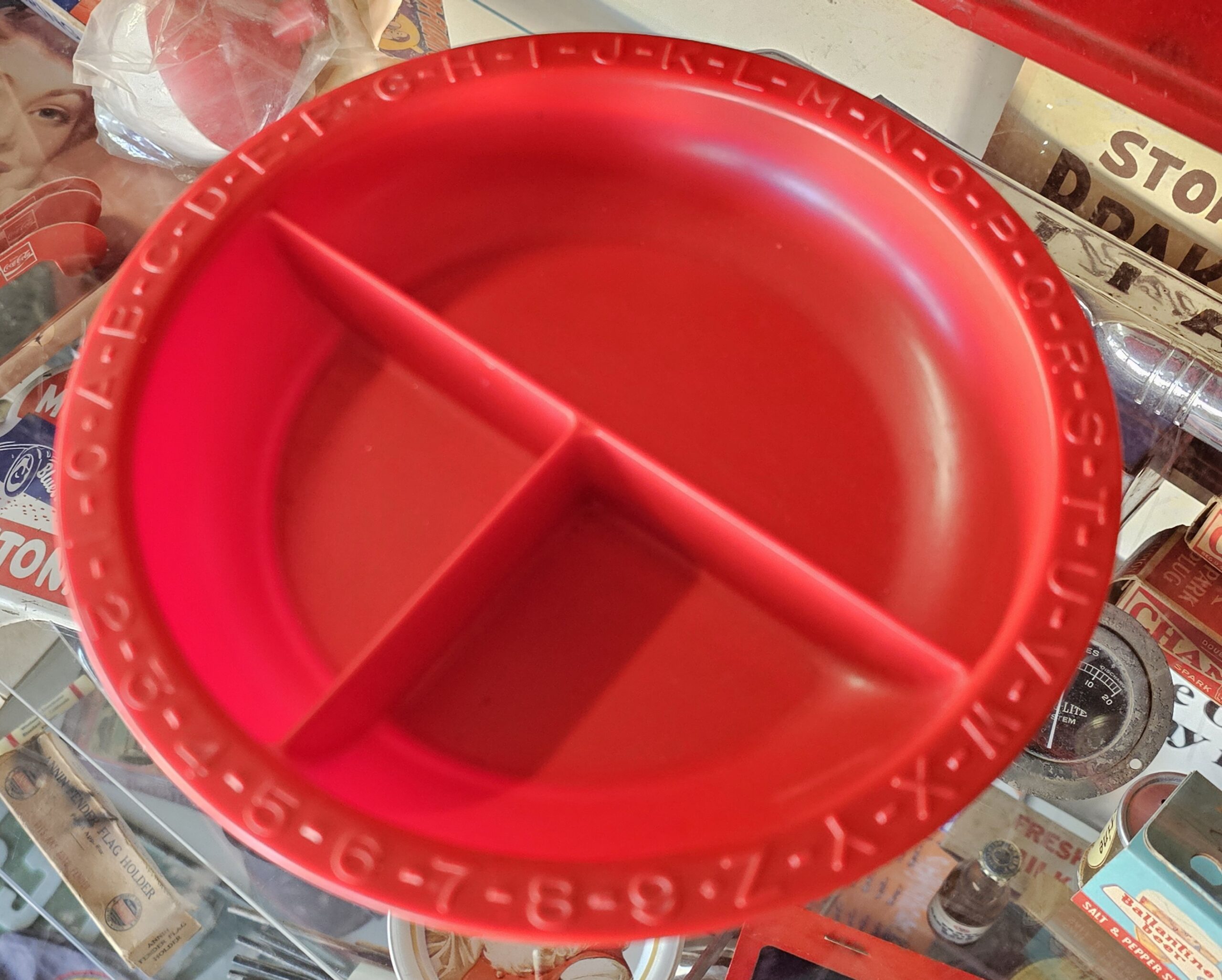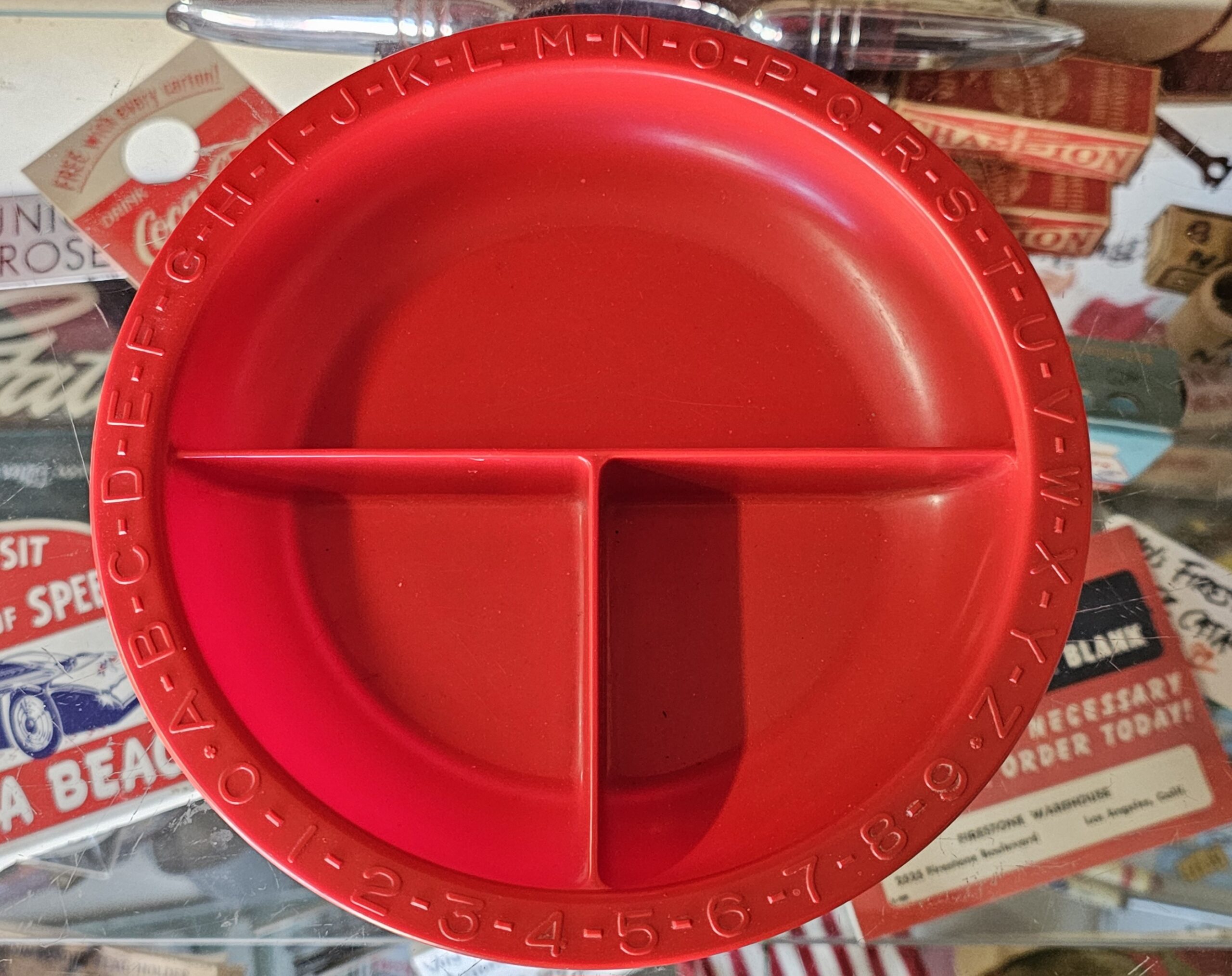 HEMCOWARE Childs Learning Divided Plate It is a red, three-compartment plate with the alphabet and numbers embossed on the rim in fantastic condition. These plates were designed to help children learn to eat independently and are part of a feeding set that also includes a spill-proof cup (not included).
