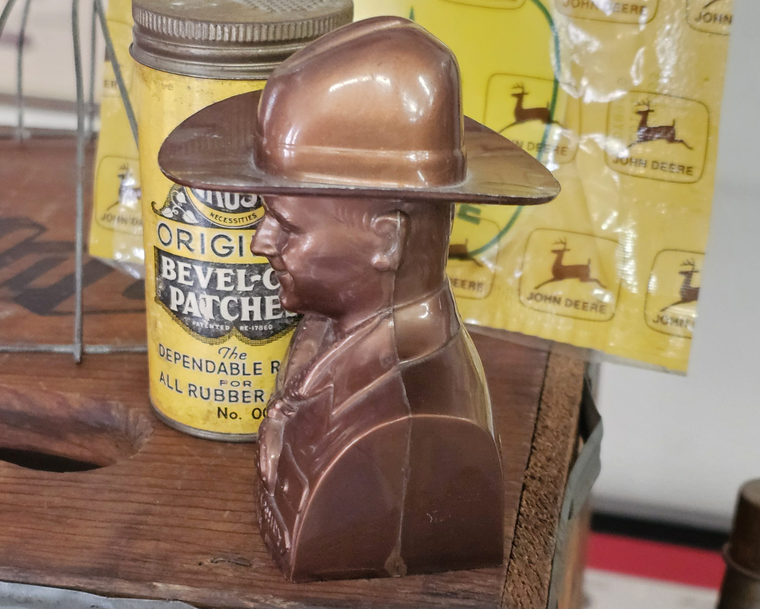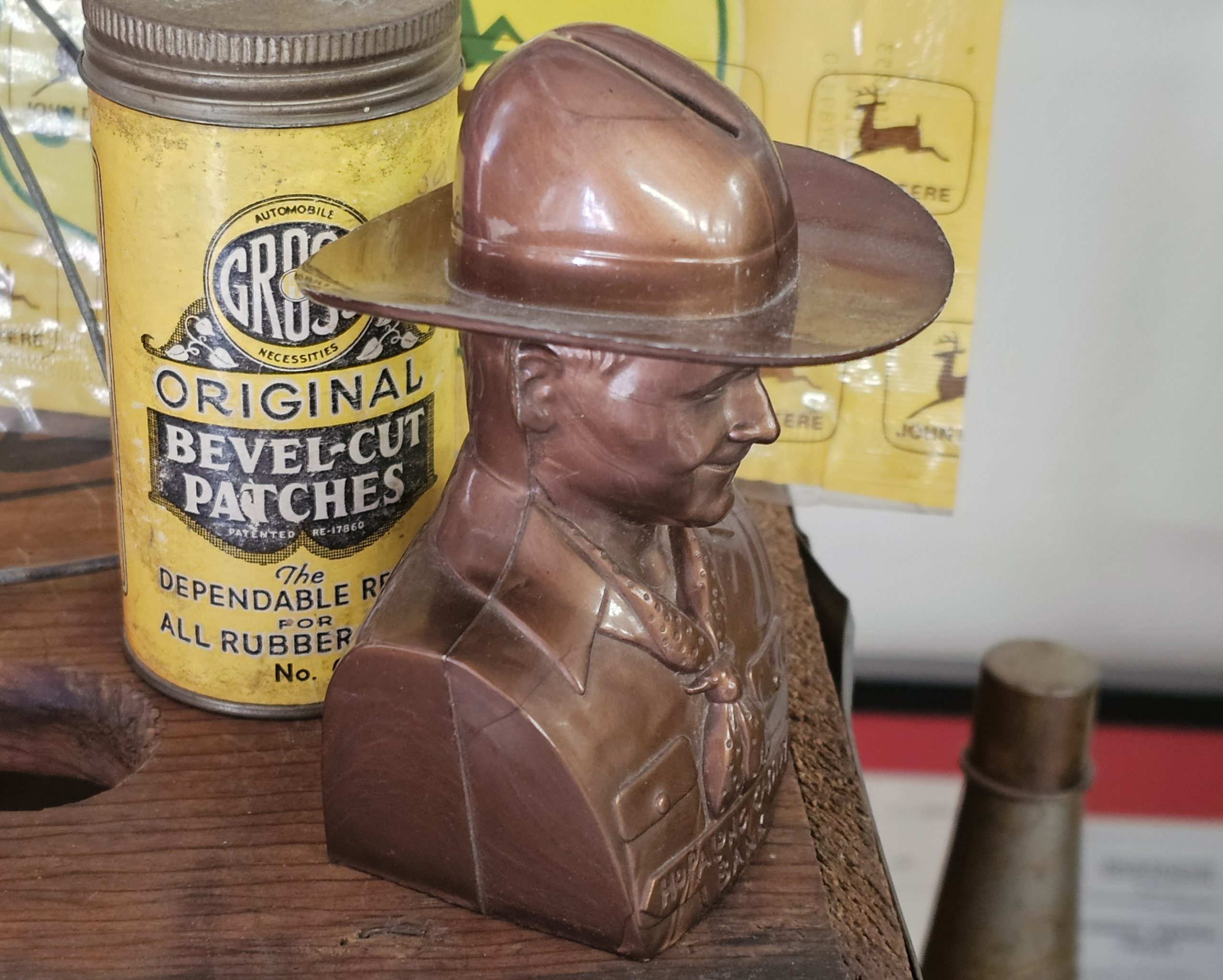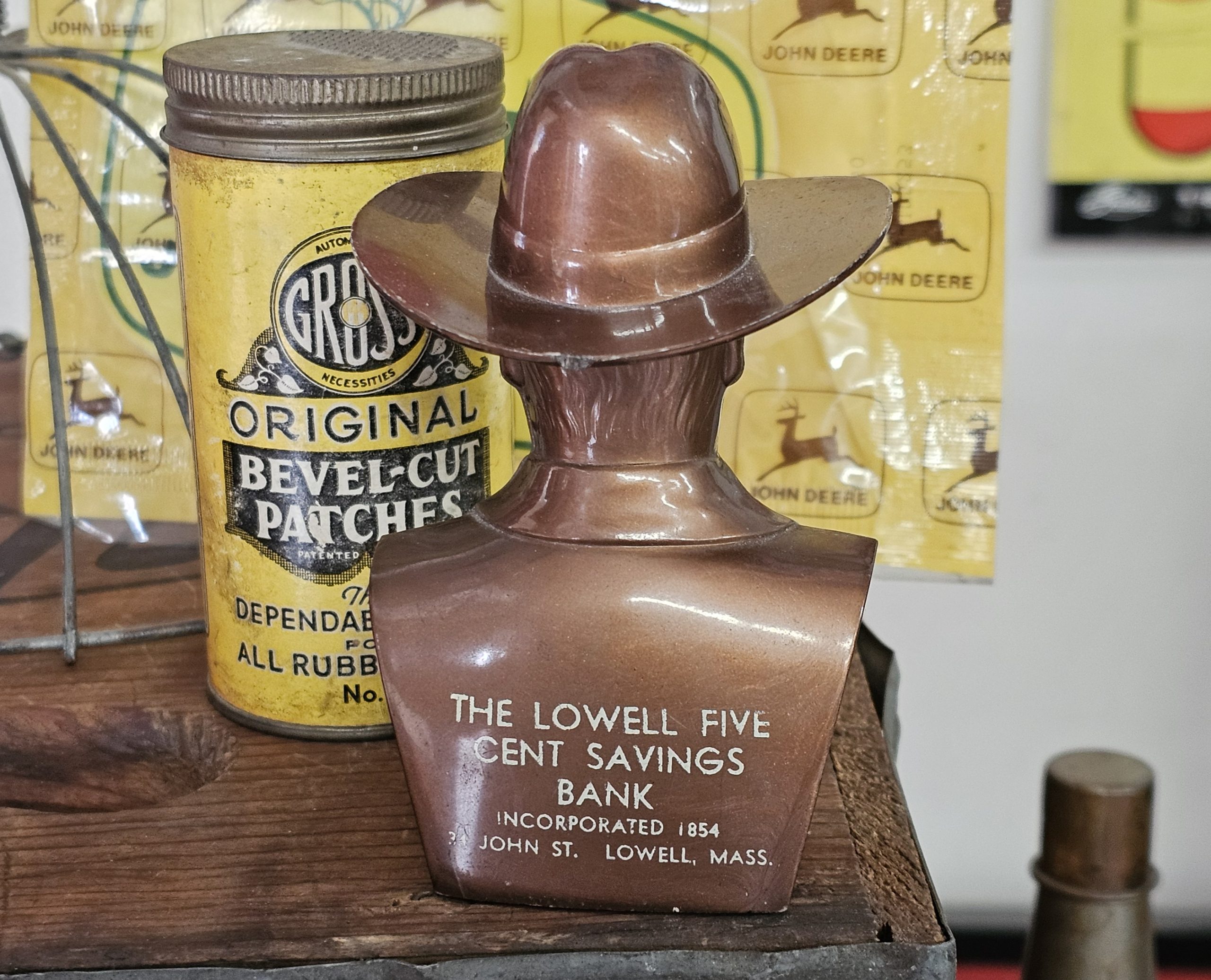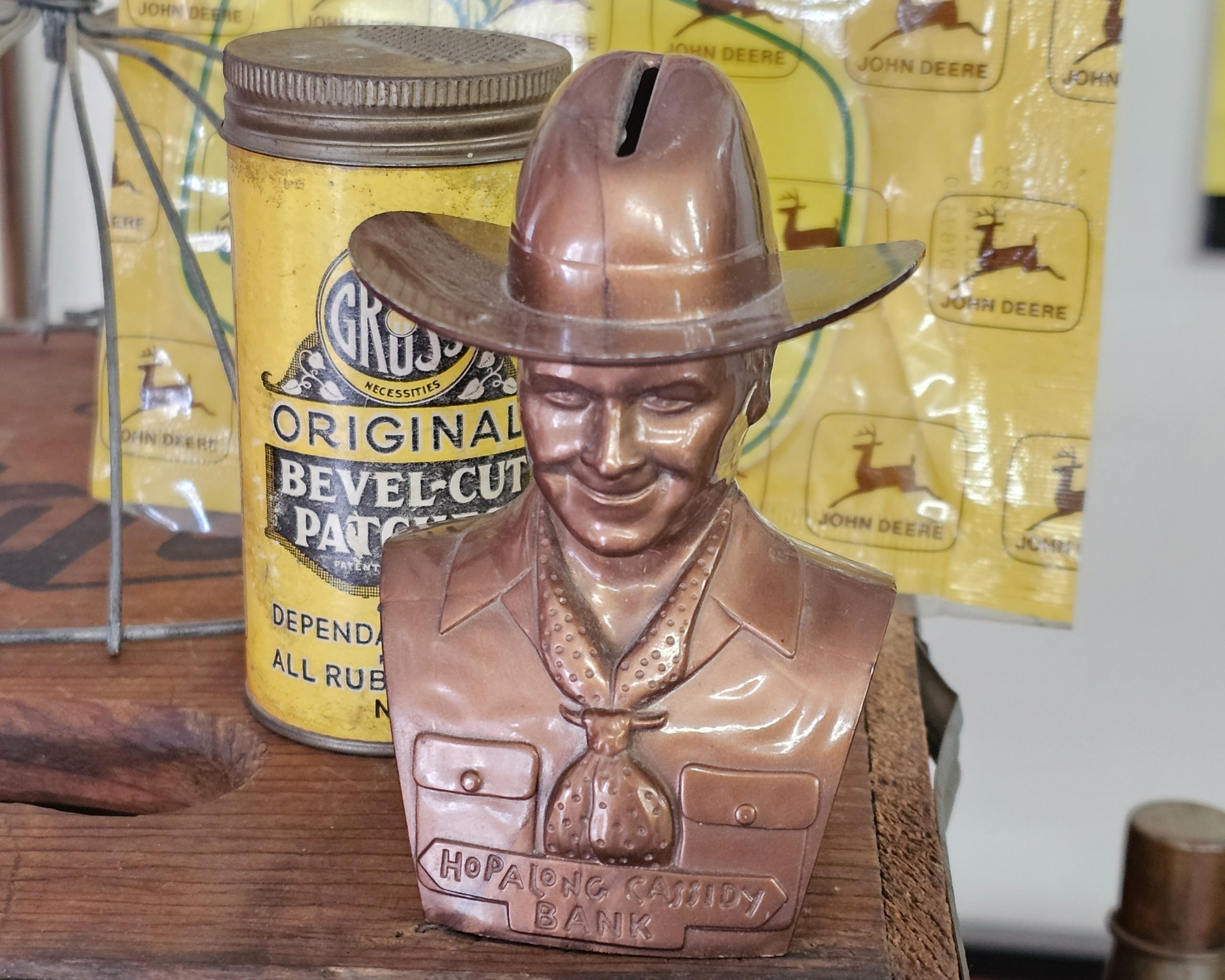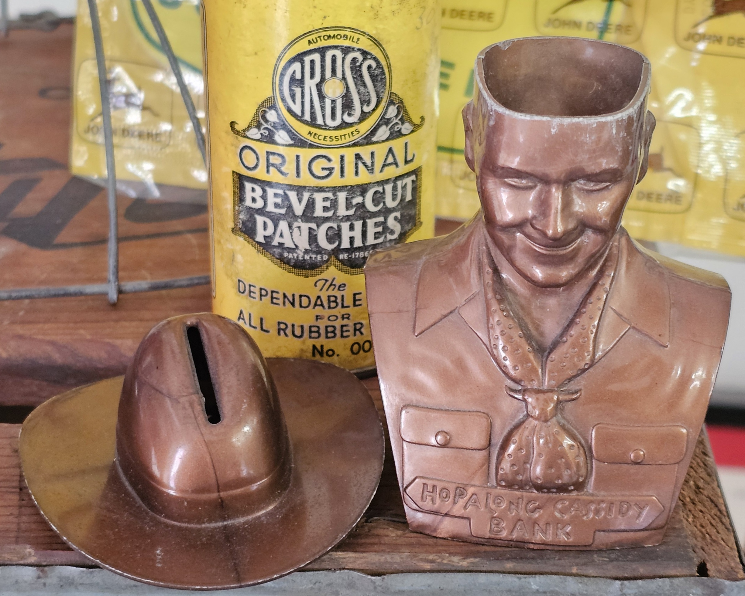 Hopalong Cassidy Advertising Bank Like new with no box. This was a giveaway version listed below since it has bank info on back. Hat comes off to empty. Plastic, featuring the likeness of Hopalong Cassidy, a popular cowboy character from books, films, and television shows of the mid-20th century (specifically the 1950s). These banks were often promotional items given away by banks or sold as merchandise.