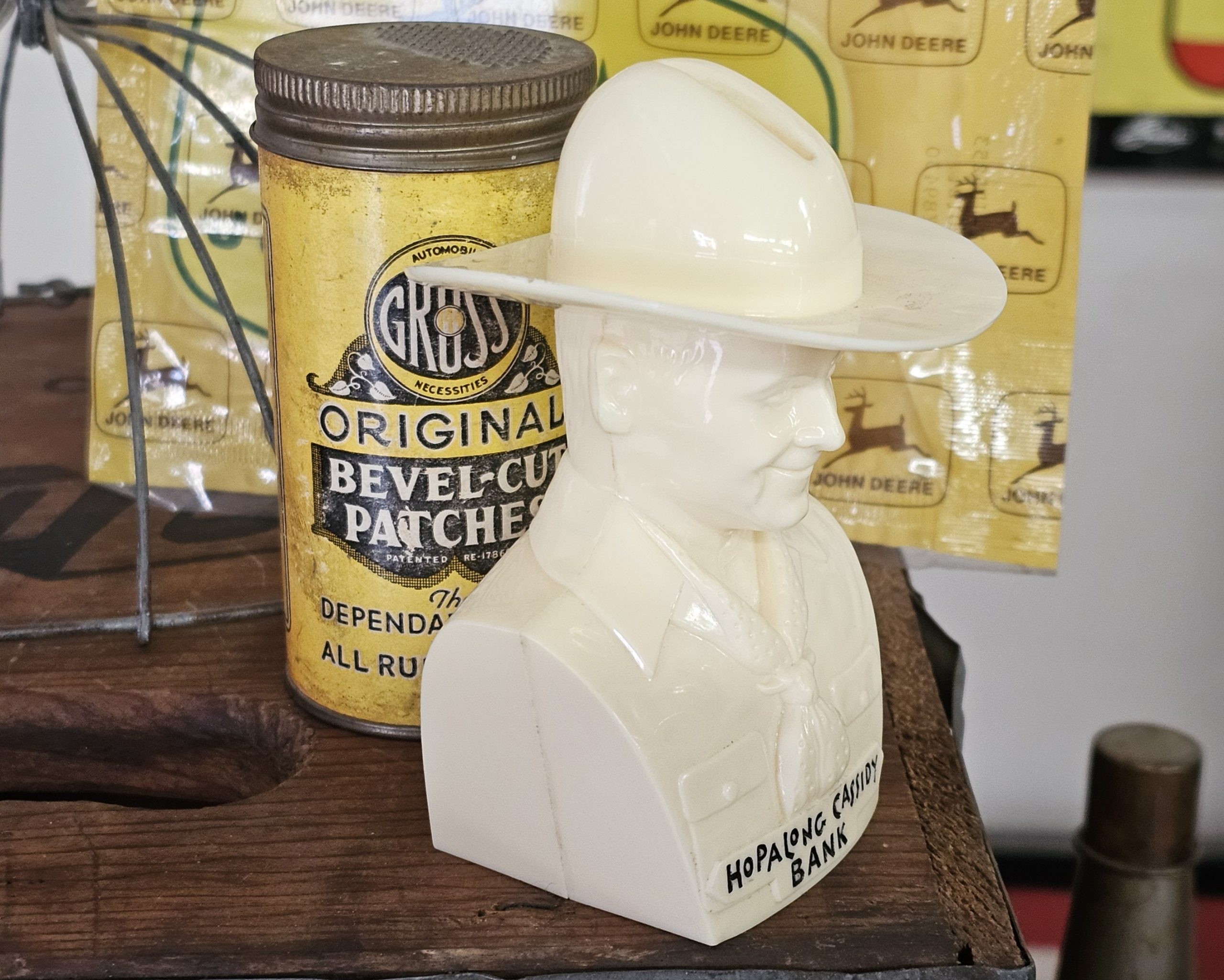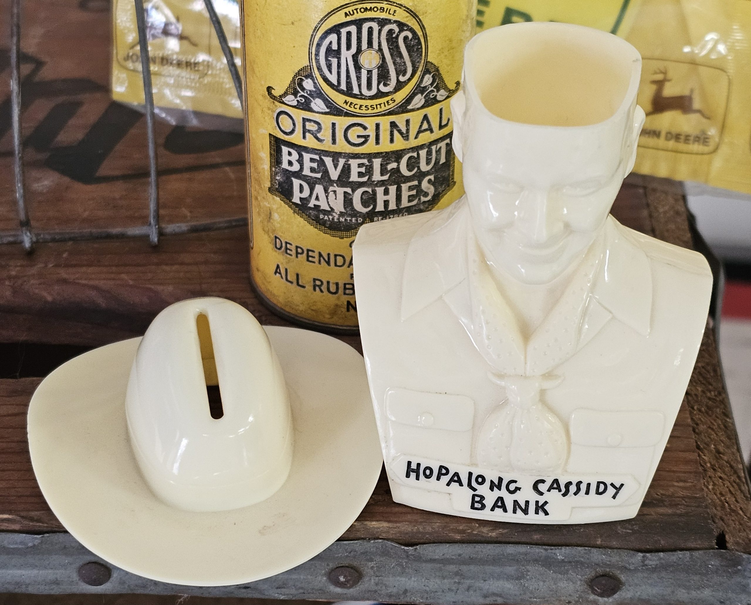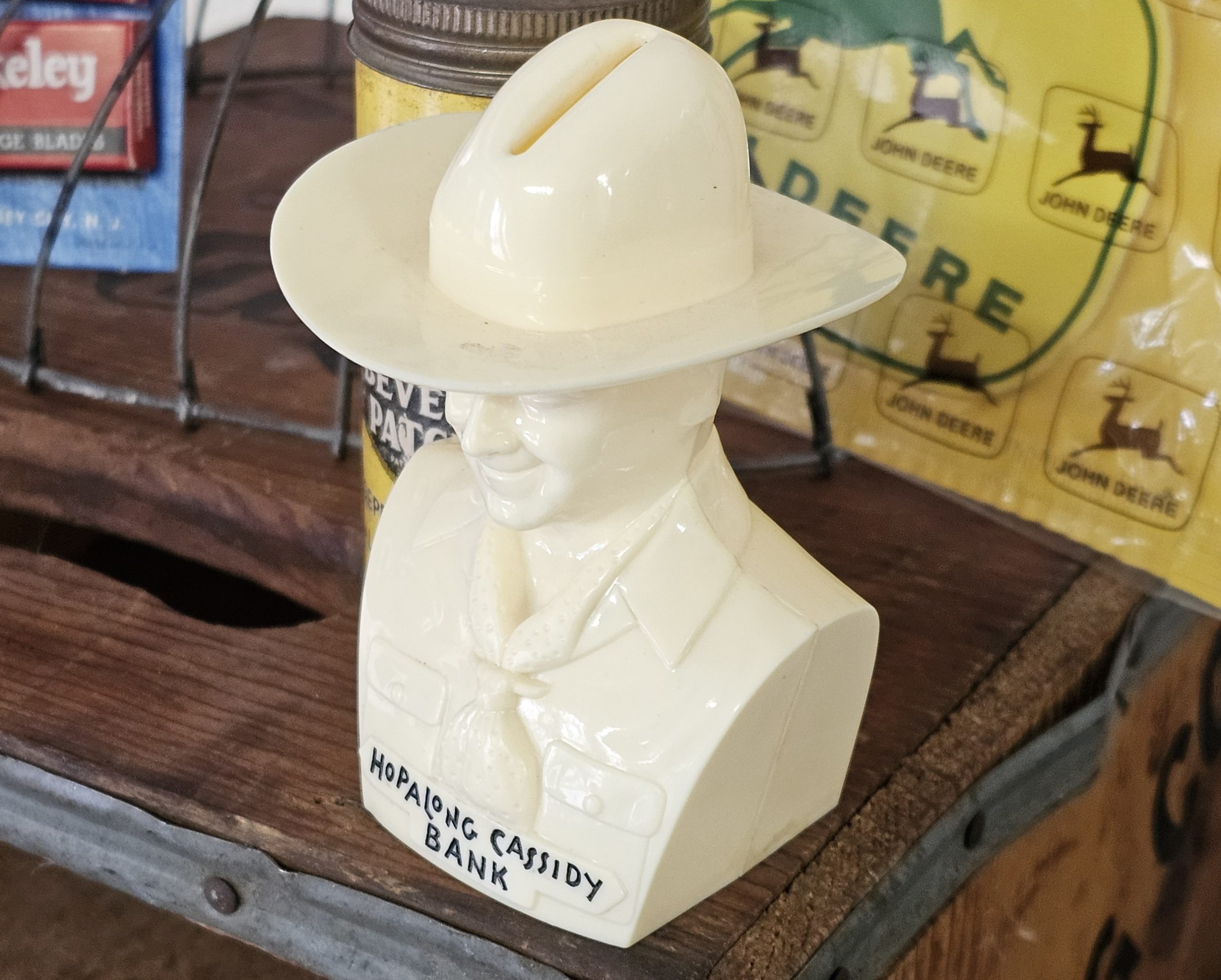 Hopalong Cassidy Bank Like new with no box. This was the merchandise version listed below since no other advertising markings. Hat comes off to empty. Plastic, featuring the likeness of Hopalong Cassidy, a popular cowboy character from books, films, and television shows of the mid-20th century (specifically the 1950s). These banks were often promotional items given away by banks or sold as merchandise.