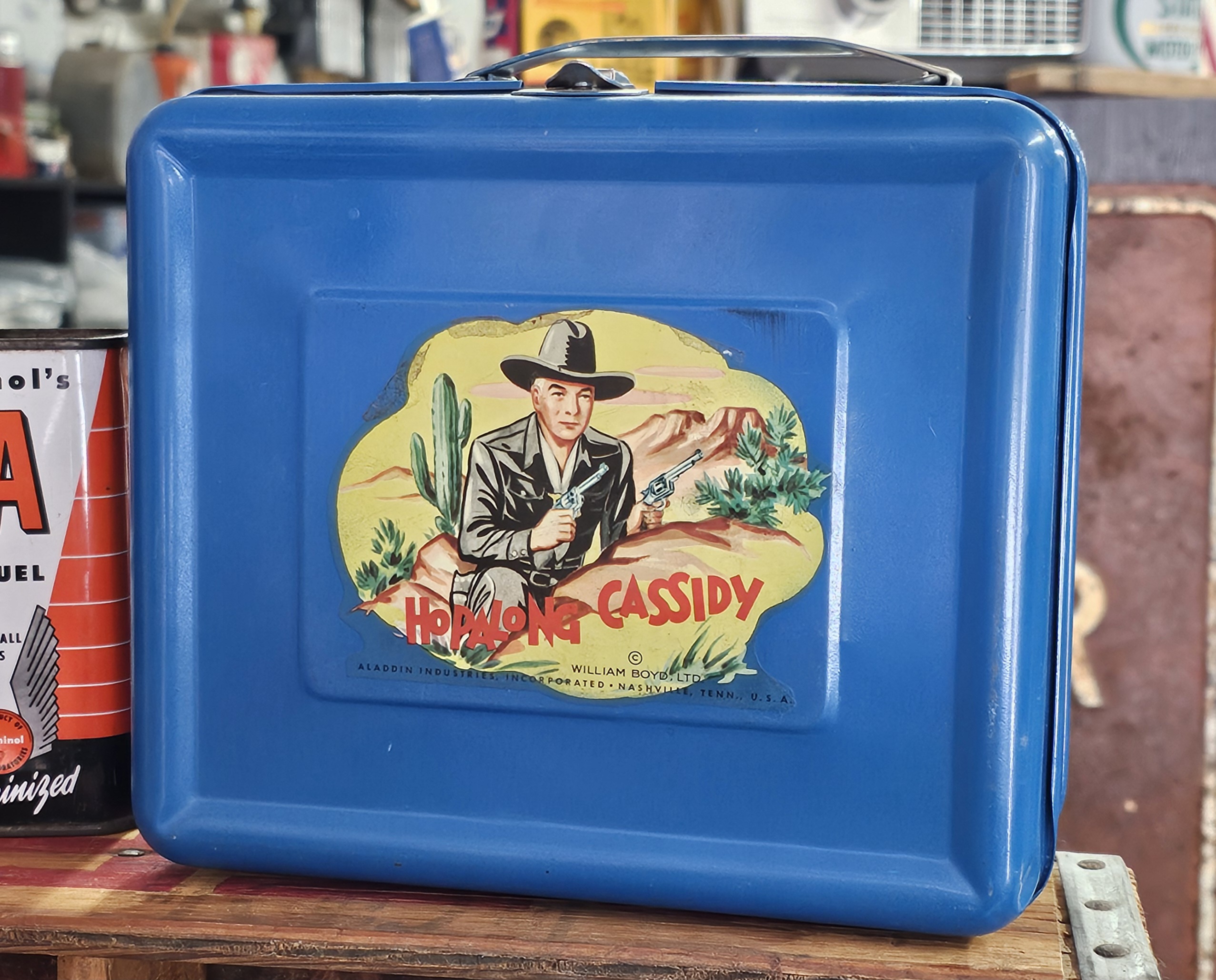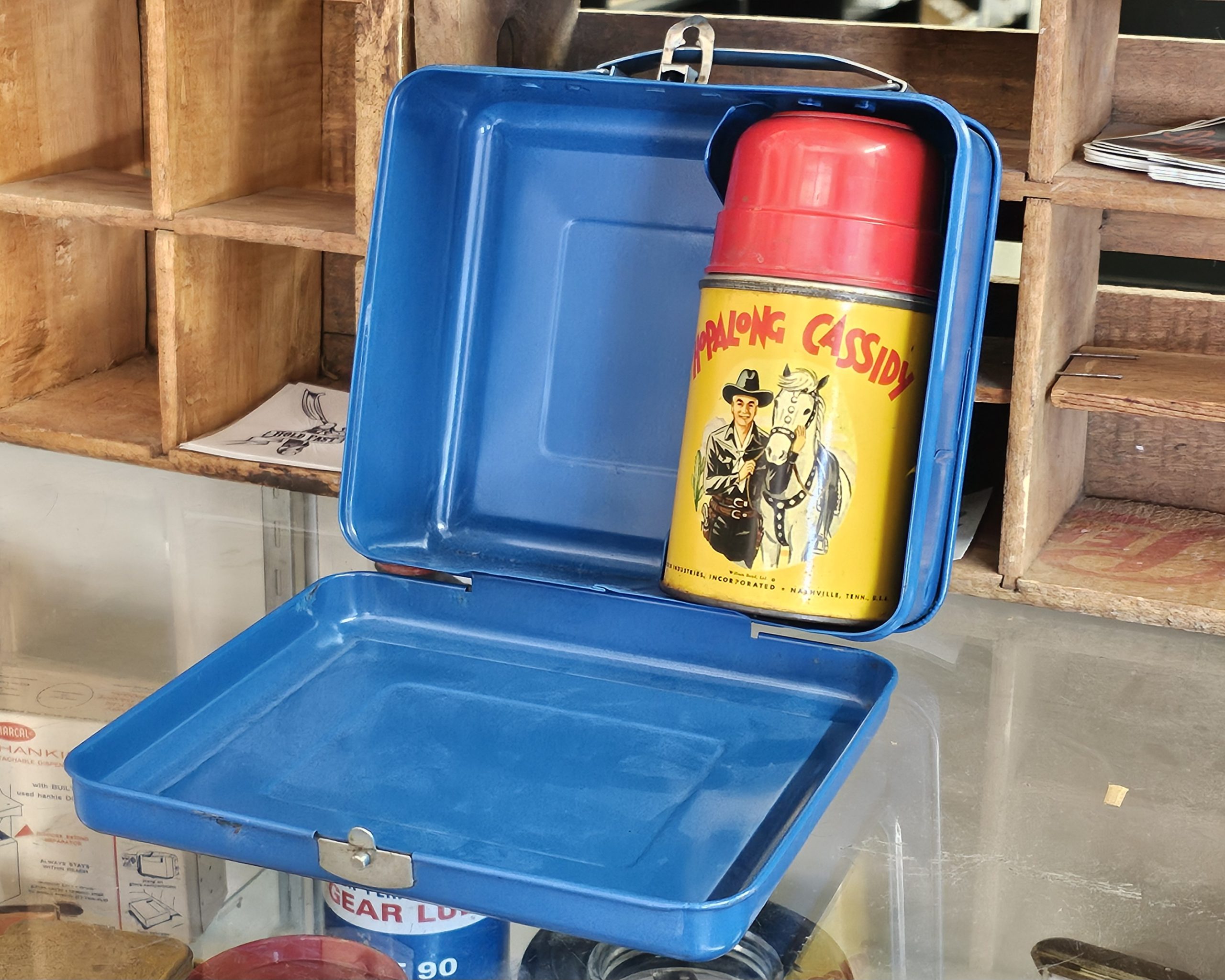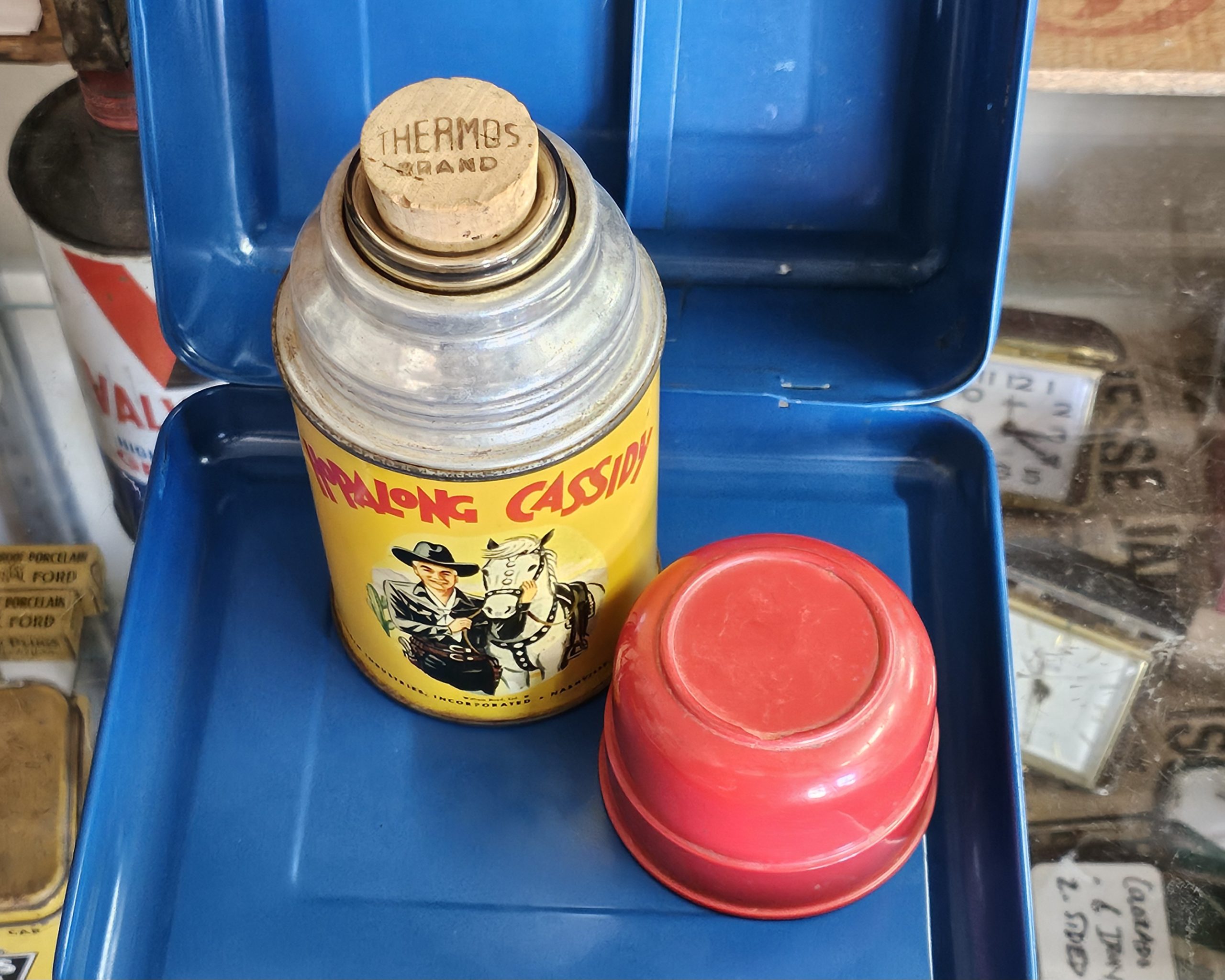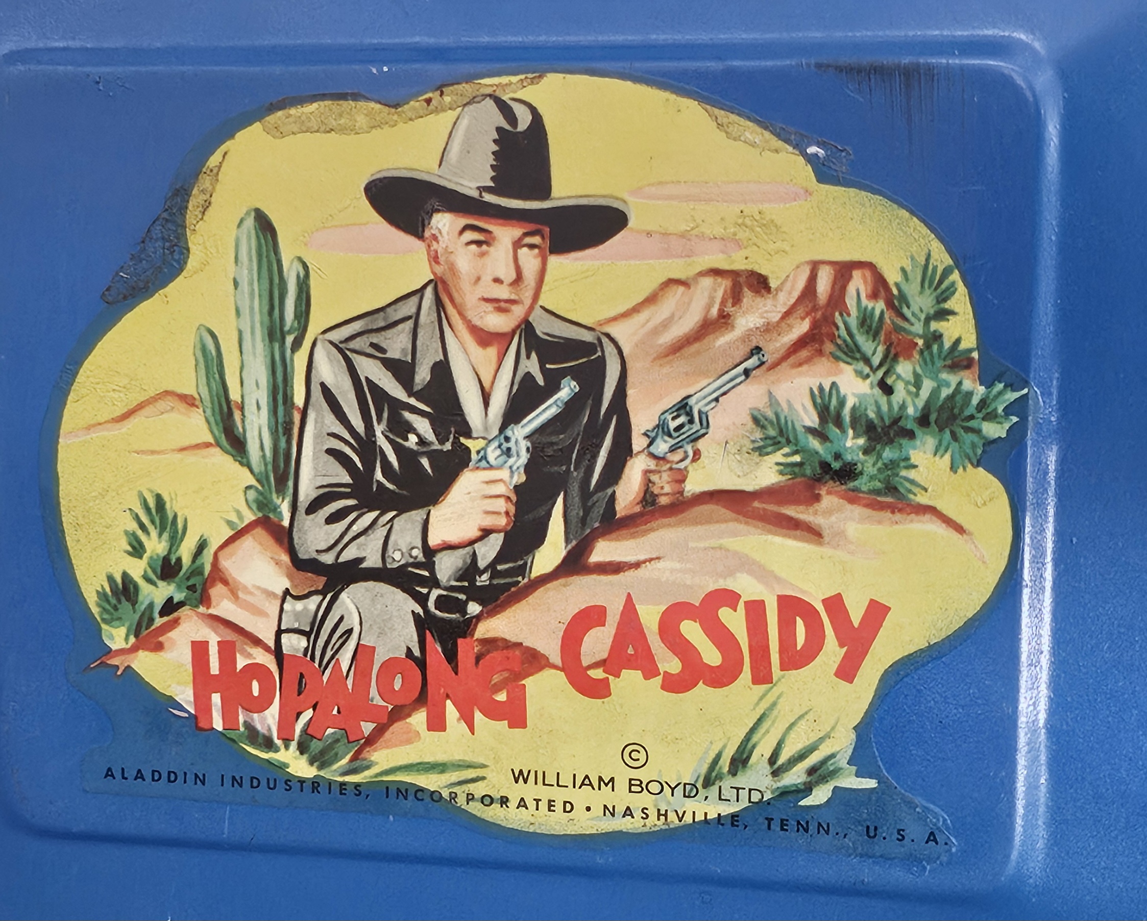 Hopalong Cassidy Lunchbox Thermos  This is an original 1950s lunchbox in fantastic shape.  Minor dings on back but no scratching to see.  Thermos is in good shape with minor rusting along bottom edge, original Aladdin cork was missing so I put a Thermos one in.  This particular lunchbox is notable as it was the first character-licensed metal lunchbox, featuring the popular TV cowboy hero Hopalong Cassidy.