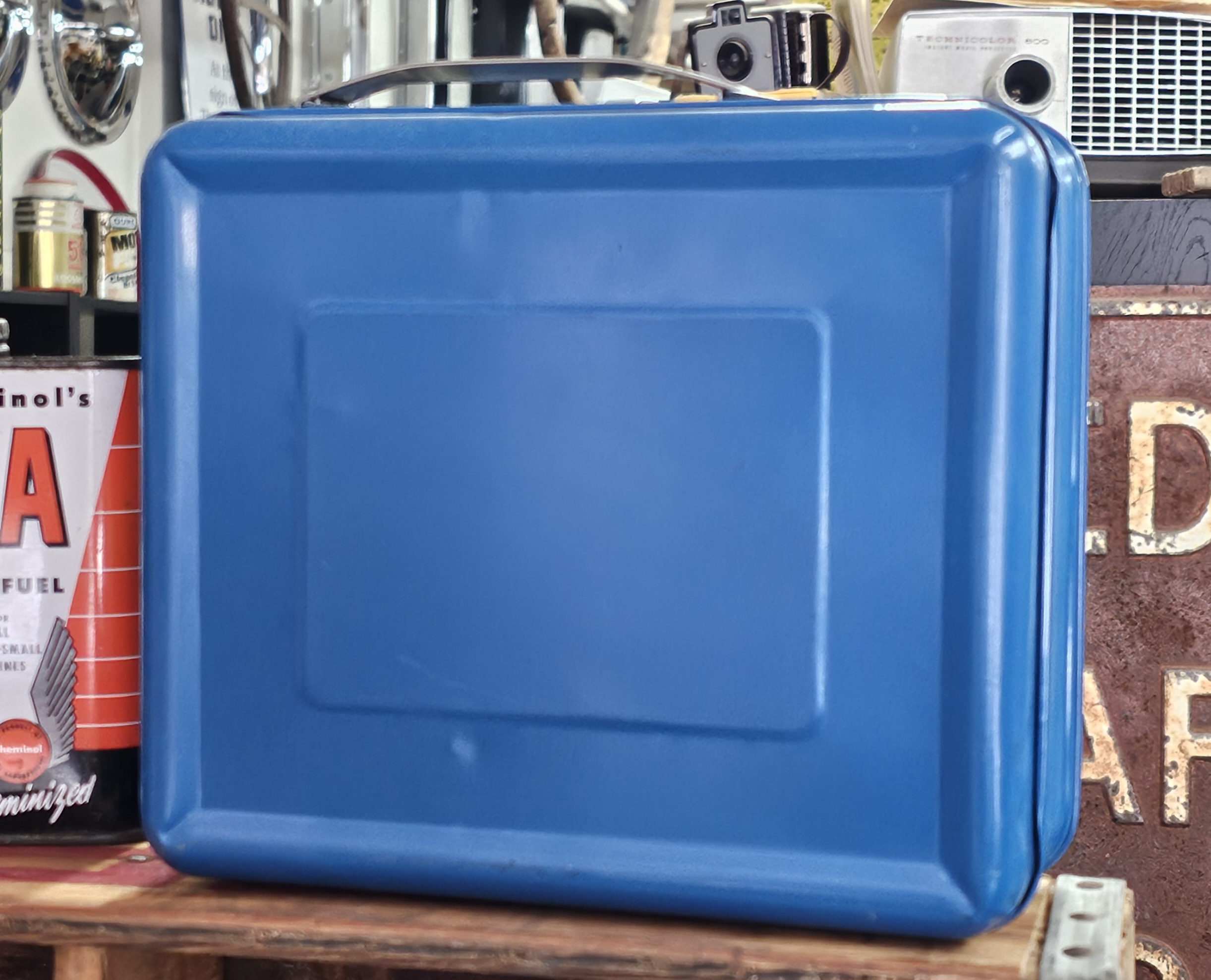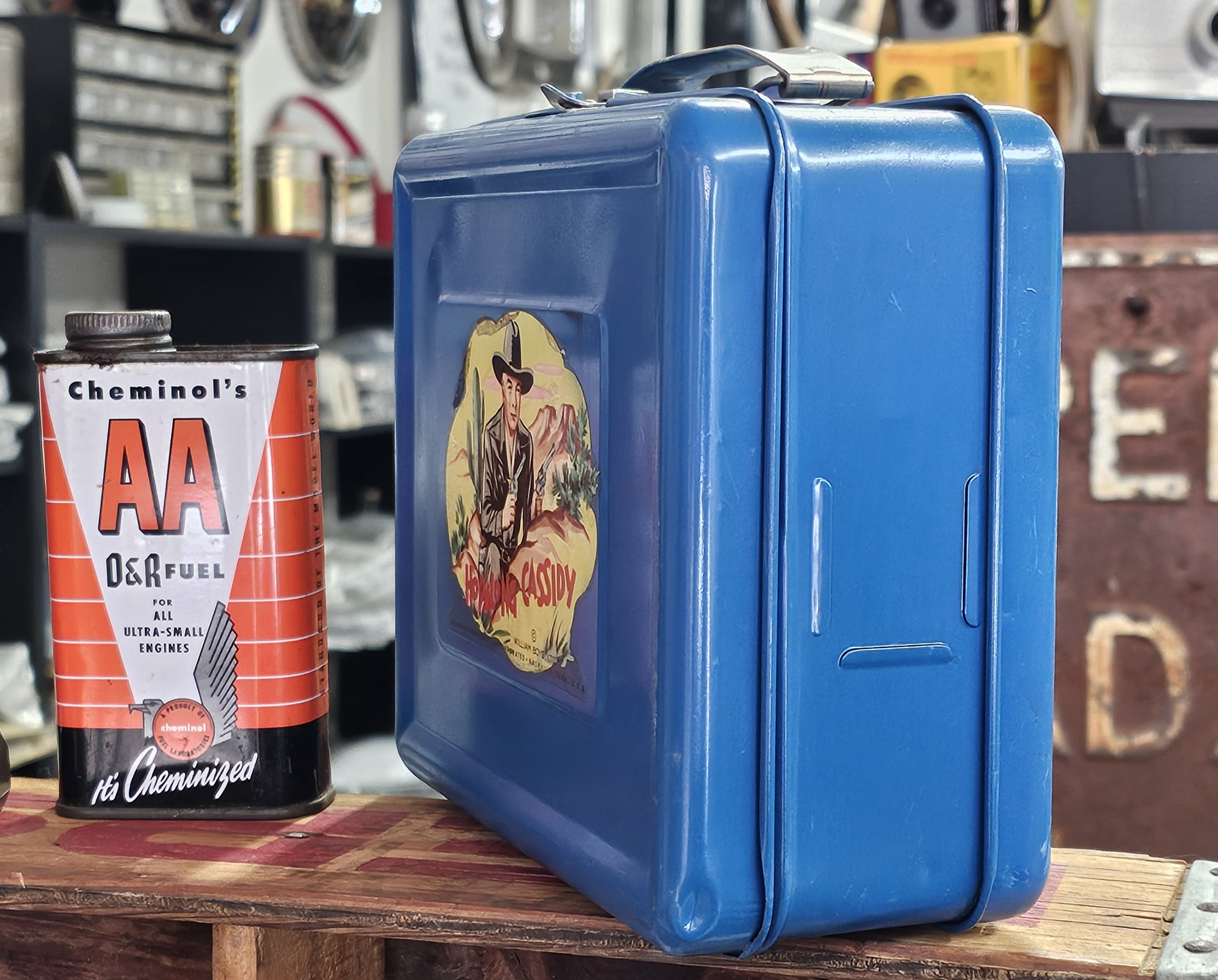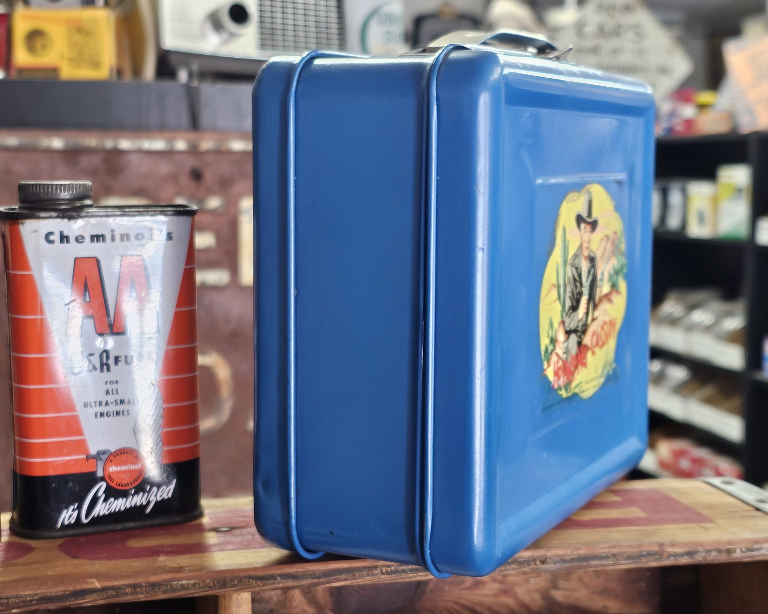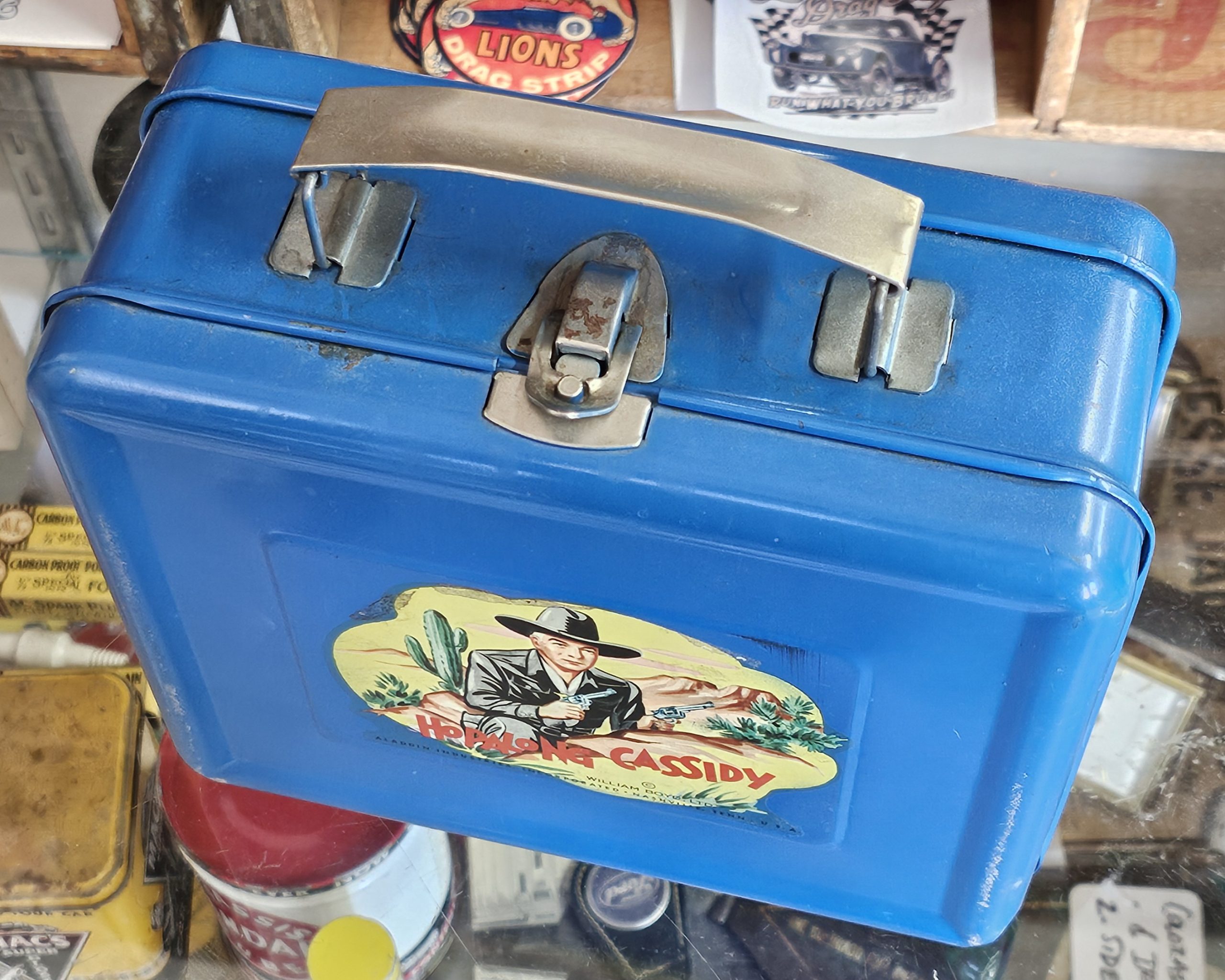 Hopalong Cassidy Lunchbox Thermos  This is an original 1950s lunchbox in fantastic shape.  Minor dings on back but no scratching to see.  Thermos is in good shape with minor rusting along bottom edge, original Aladdin cork was missing so I put a Thermos one in.  This particular lunchbox is notable as it was the first character-licensed metal lunchbox, featuring the popular TV cowboy hero Hopalong Cassidy.