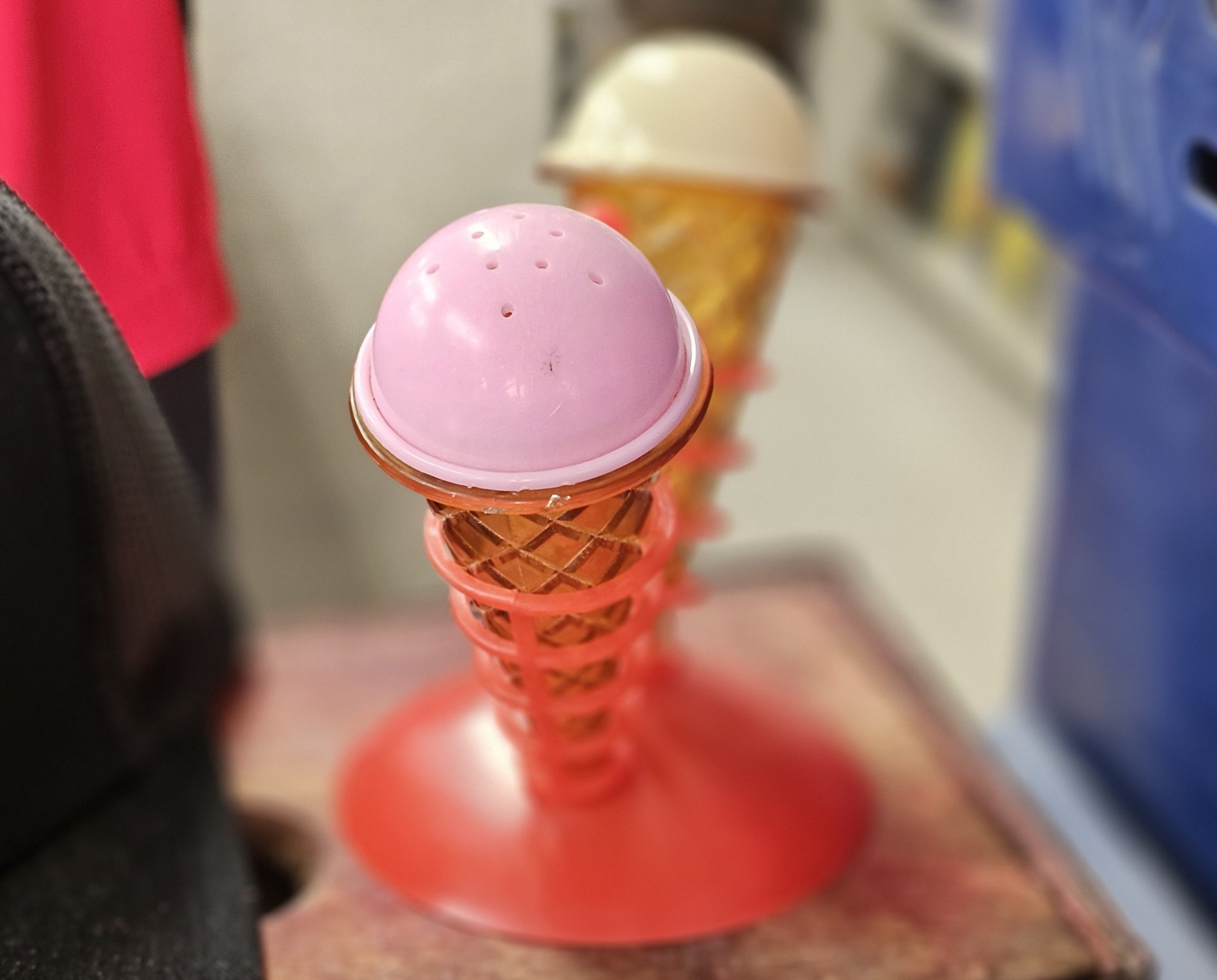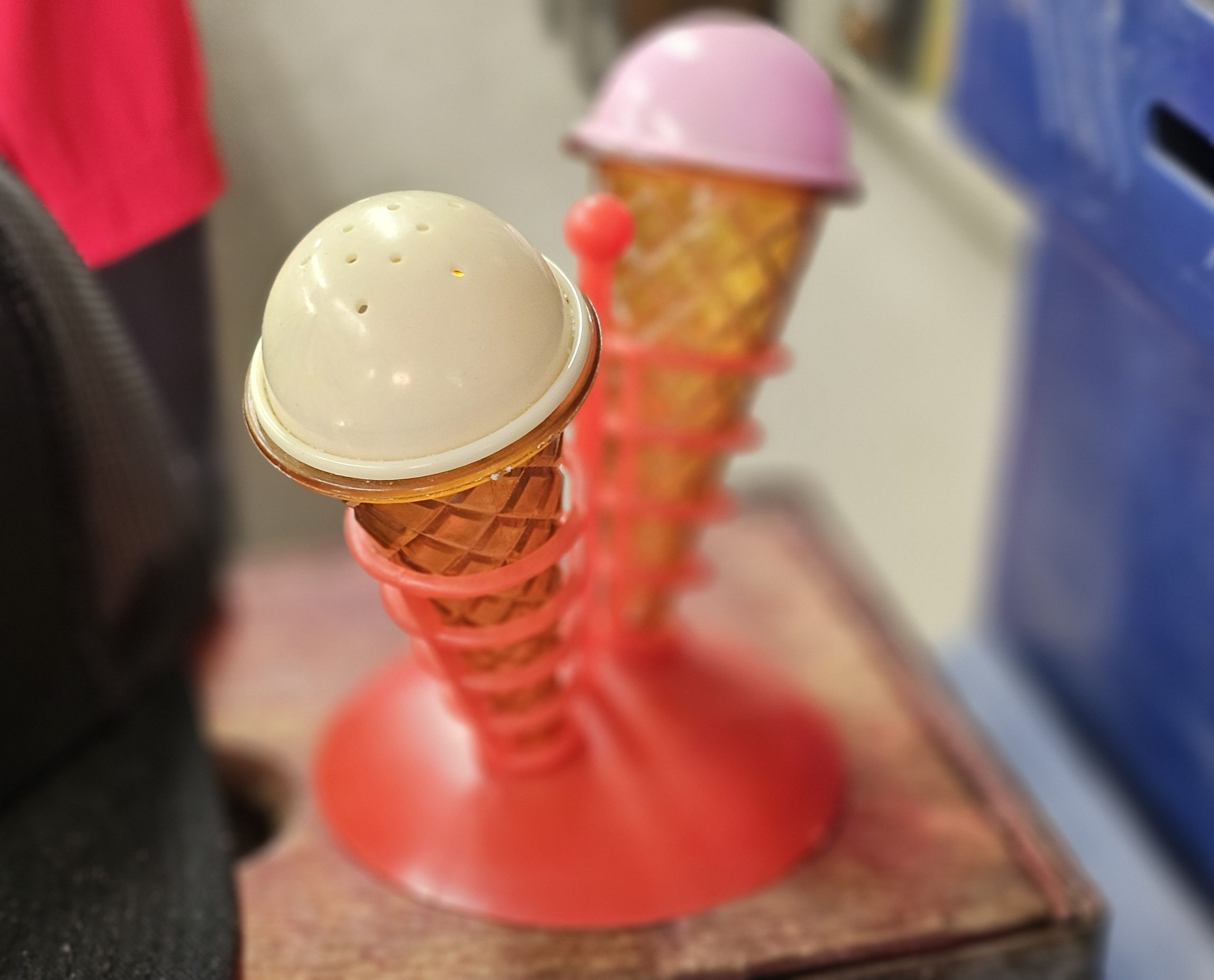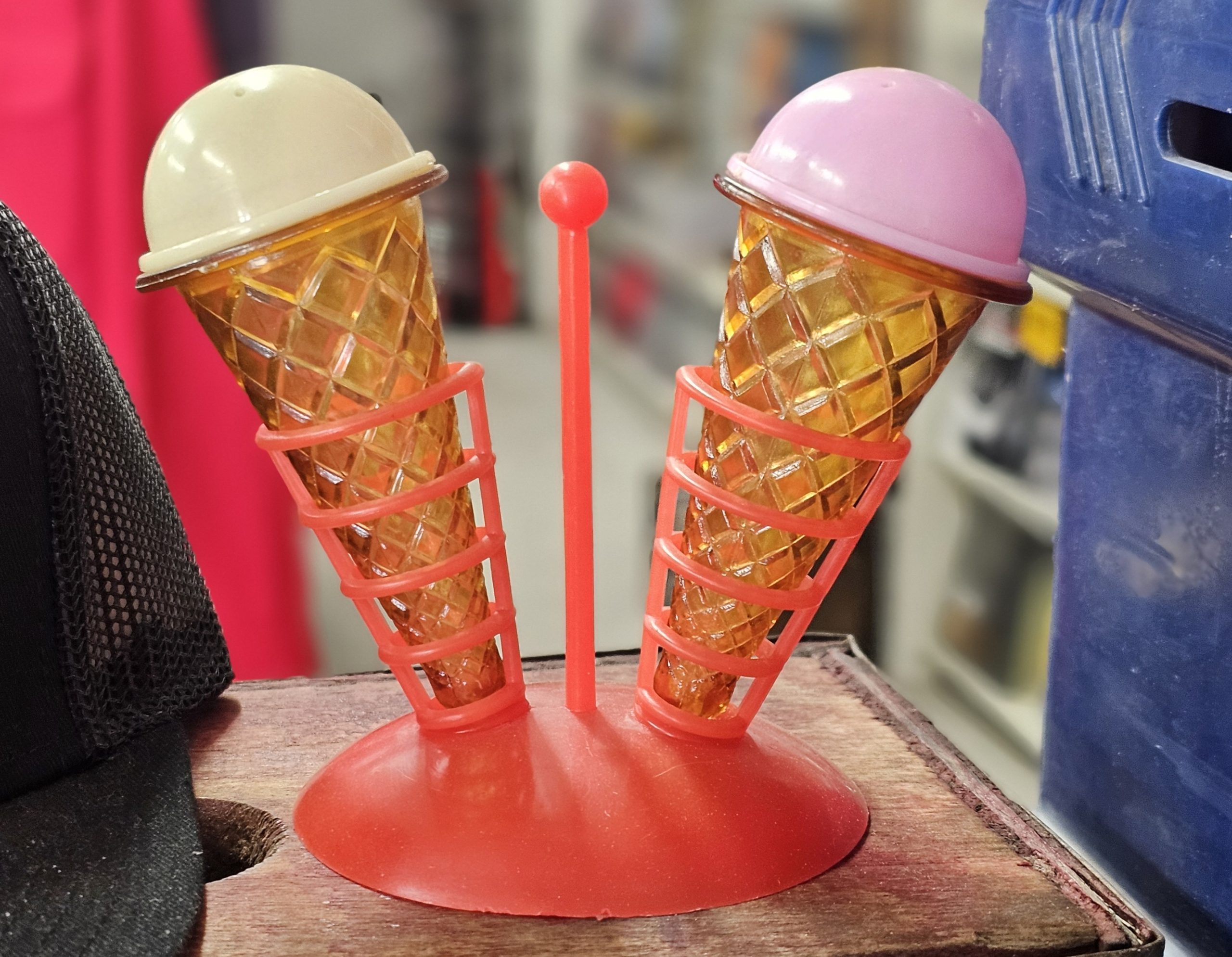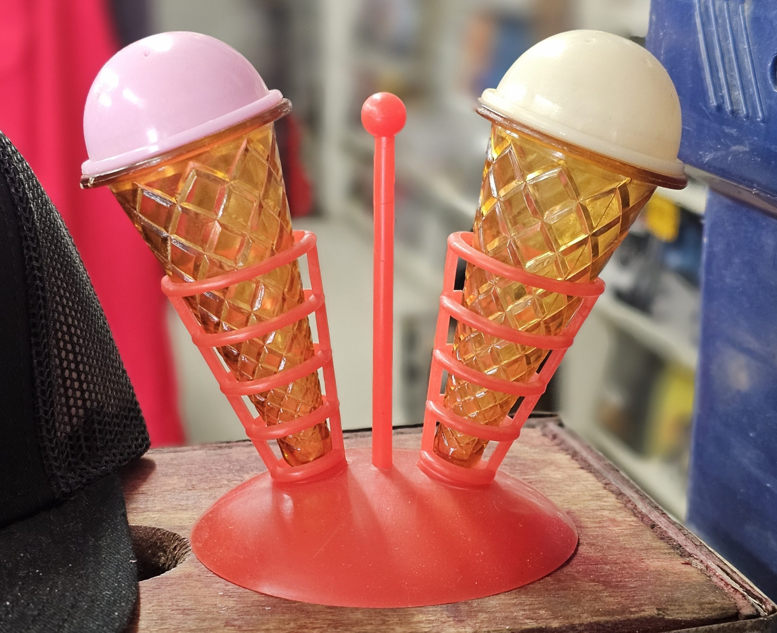 Ice Cream Cone Salt Pepper Shaker Set This set features two ice cream cone-shaped shakers, typically one for salt and one for pepper, housed in a matching stand. The shakers are made of plastic and have a kitschy, whimsical aesthetic, commonly found in vintage kitchenware.