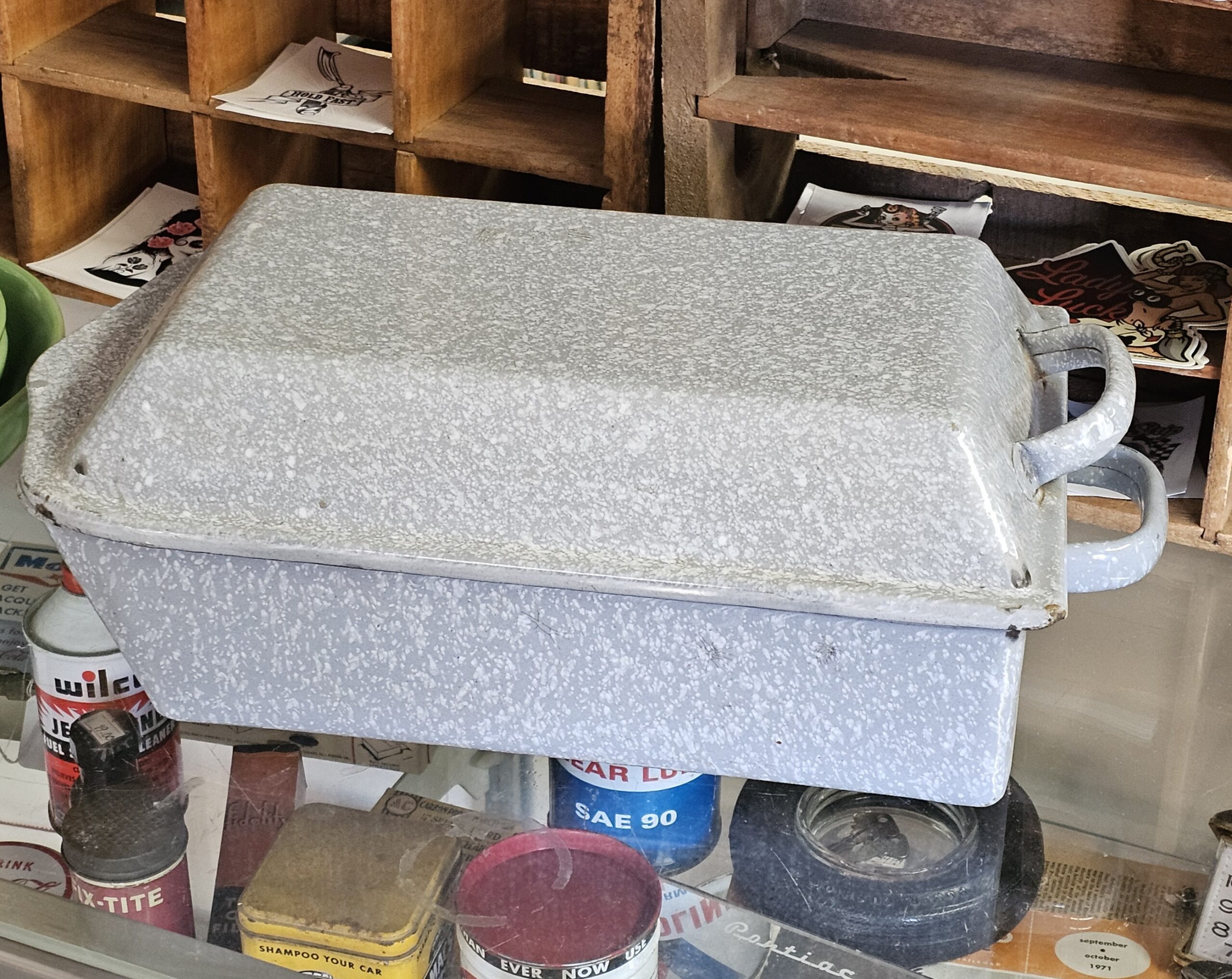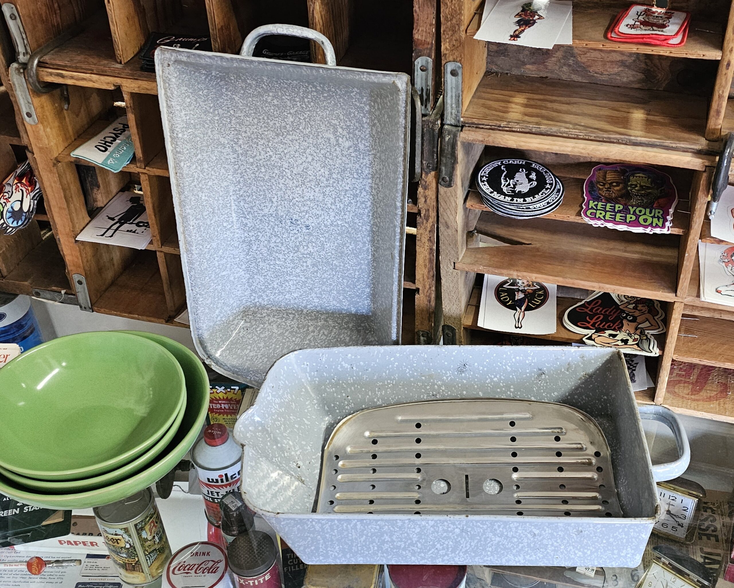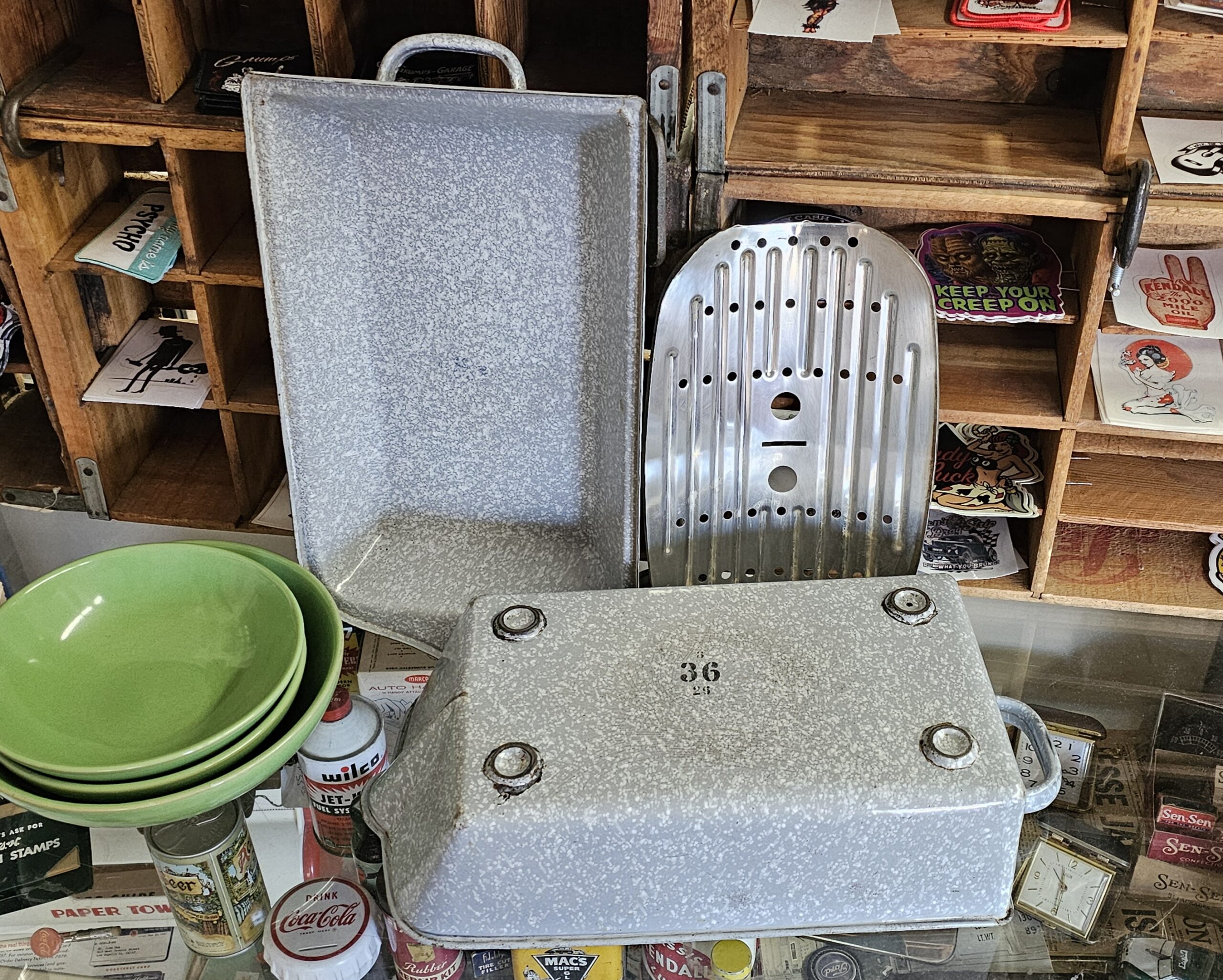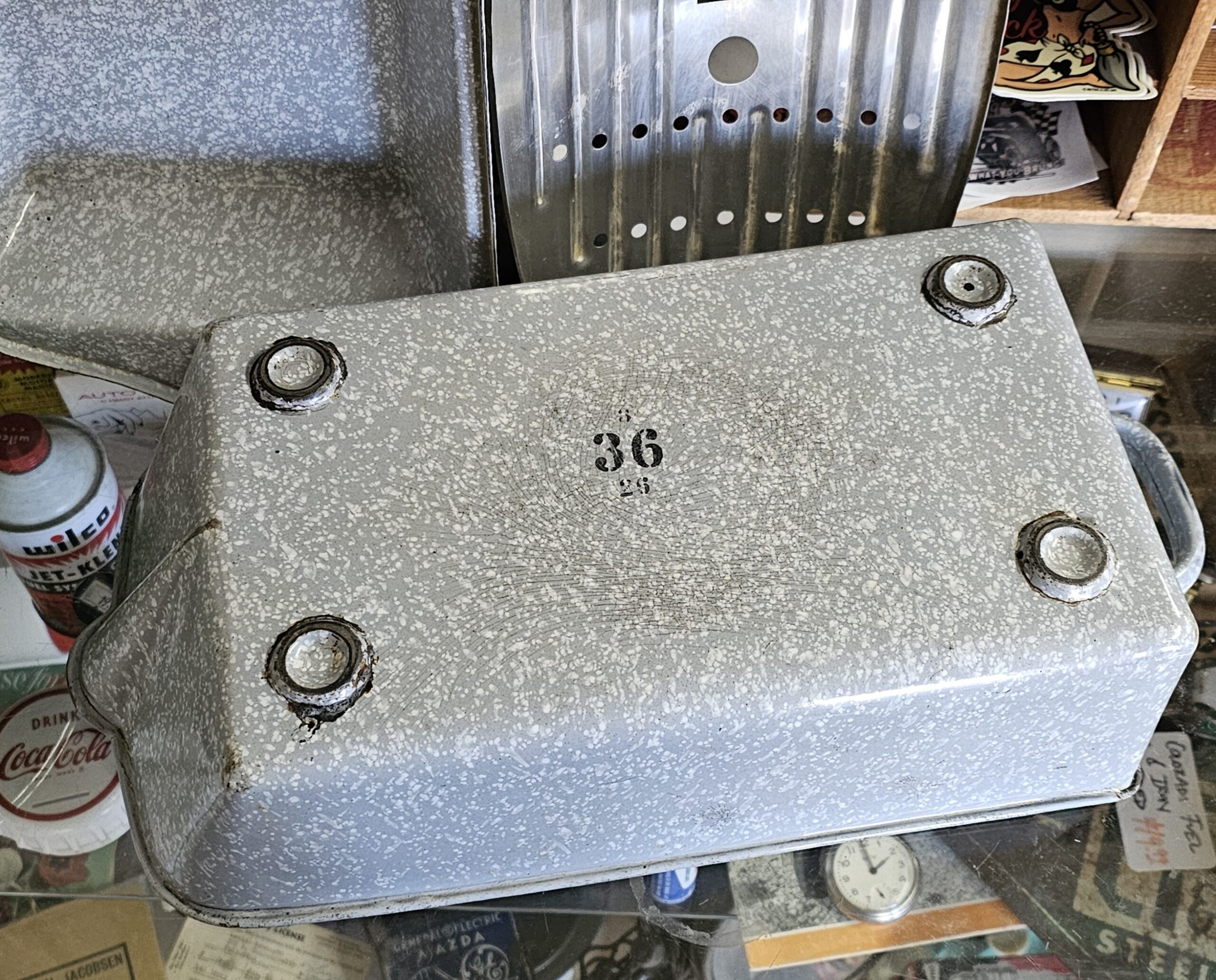 Light Grey Enamelware Roasting Pan  Rectangular shape with a metal insert.  Very good shape with some wear seen on edges and bottom.  Needs a good cleaning and it will be ready to use.  Still better than any imported pan today if taken care of.  Made in USA.
