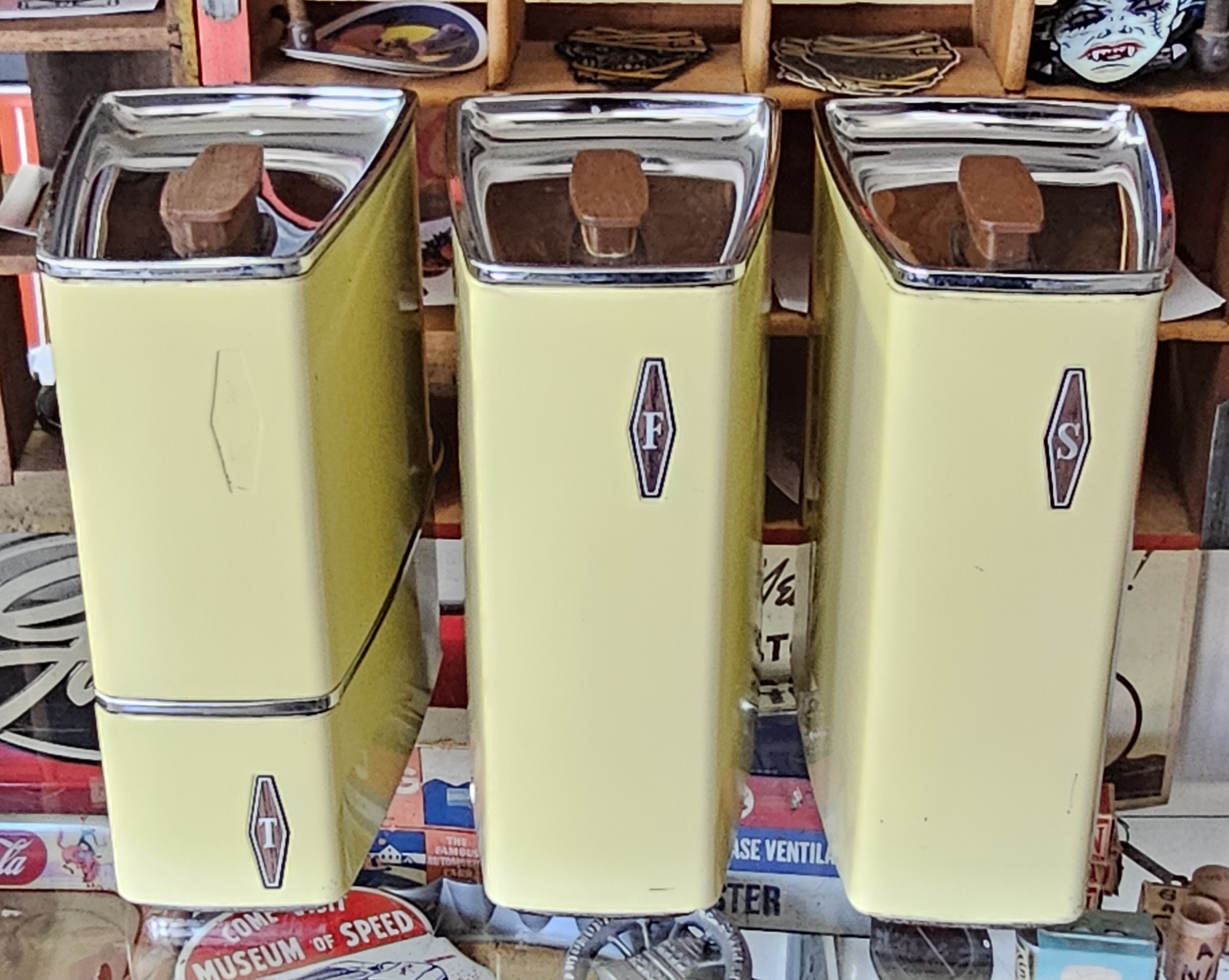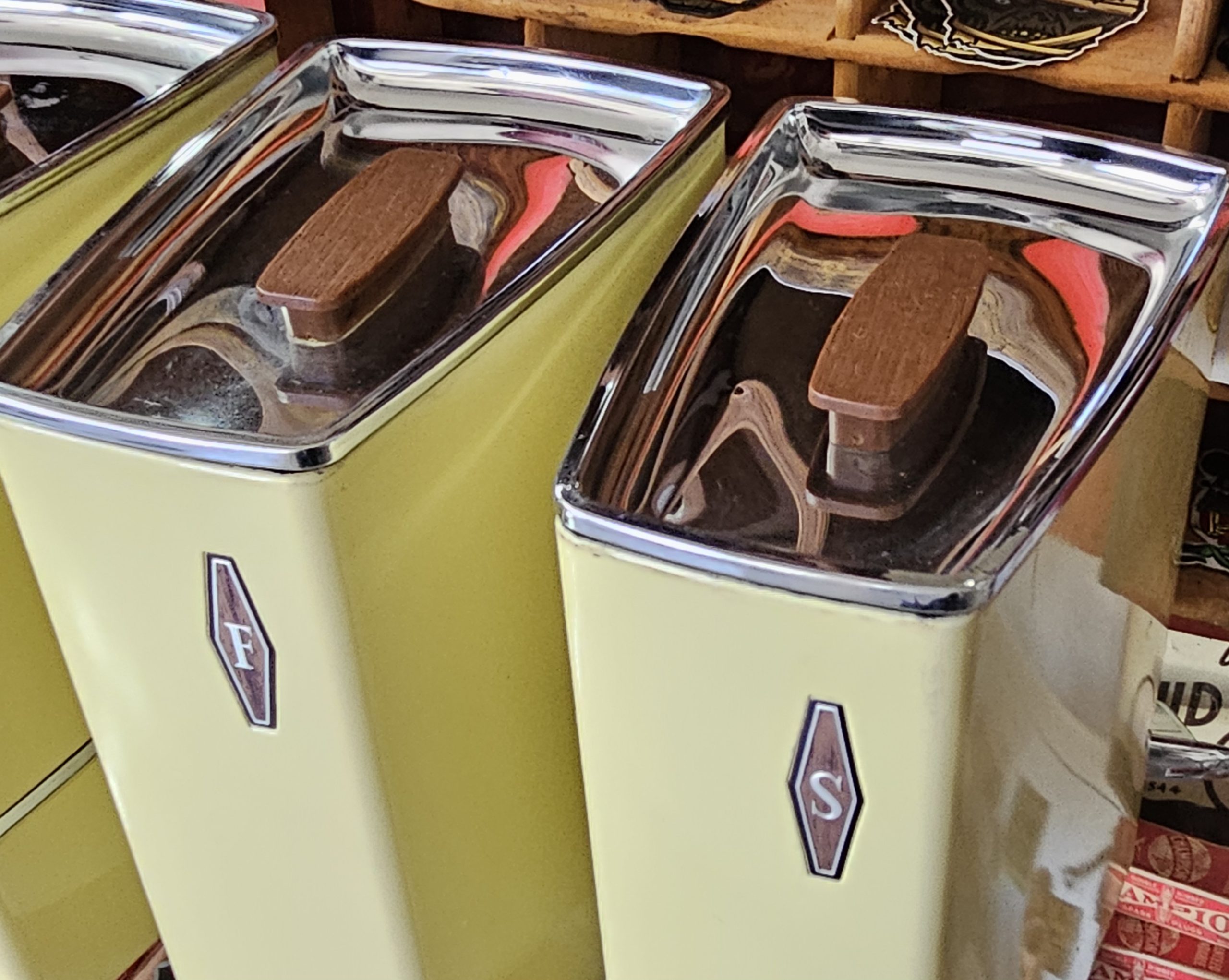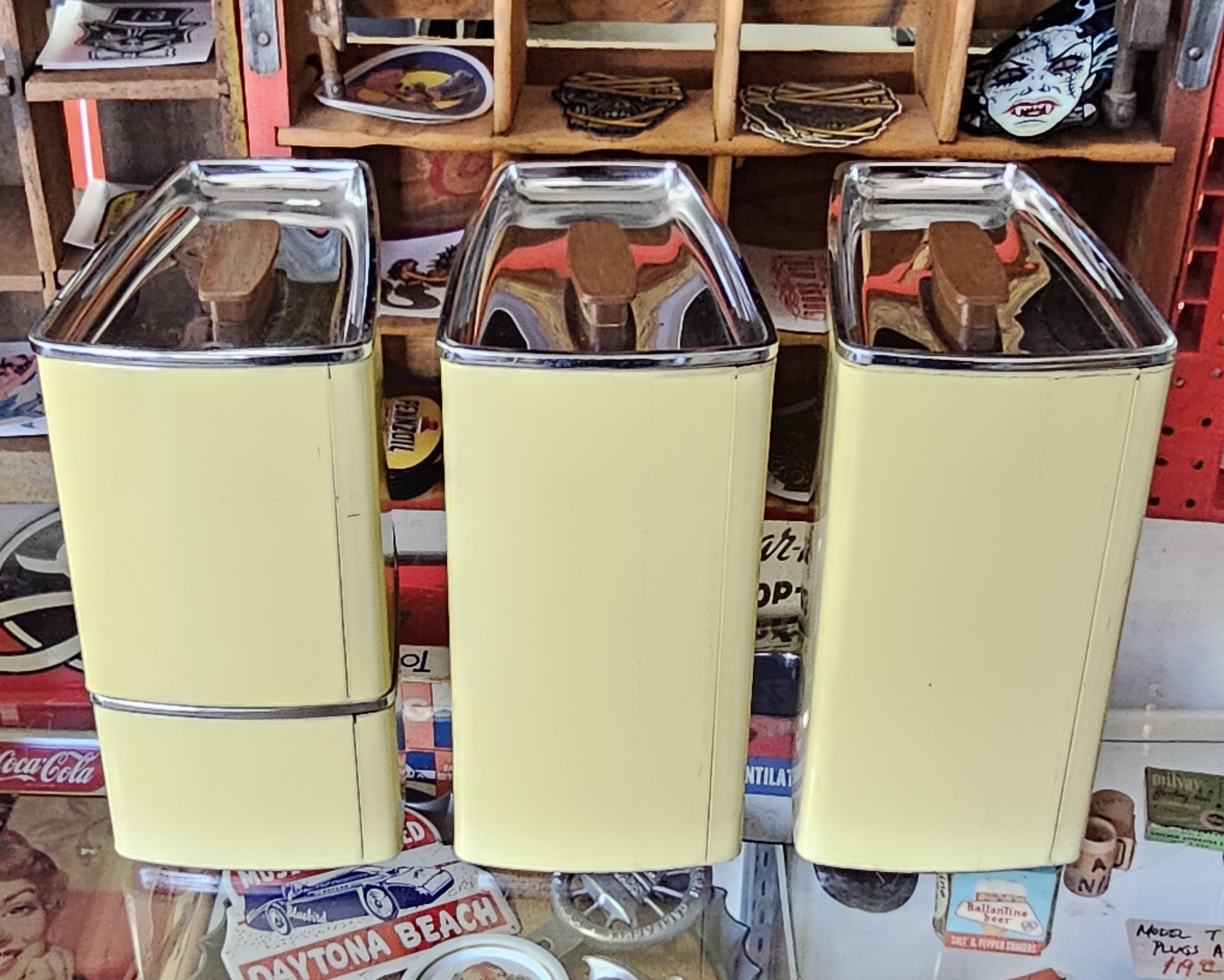 Lincoln Reality Angled Canister Set This is an original mid-century set of coffee, tea, flour & sugar. When I found them they were coated with contact paper. Once removed they showed their original yellow beauty, The 'C' for coffee badge is missing, but they are very nice. Minimal markings and chrome lids and wood handles are very nice. Bottoms do show use, insides are very clean.