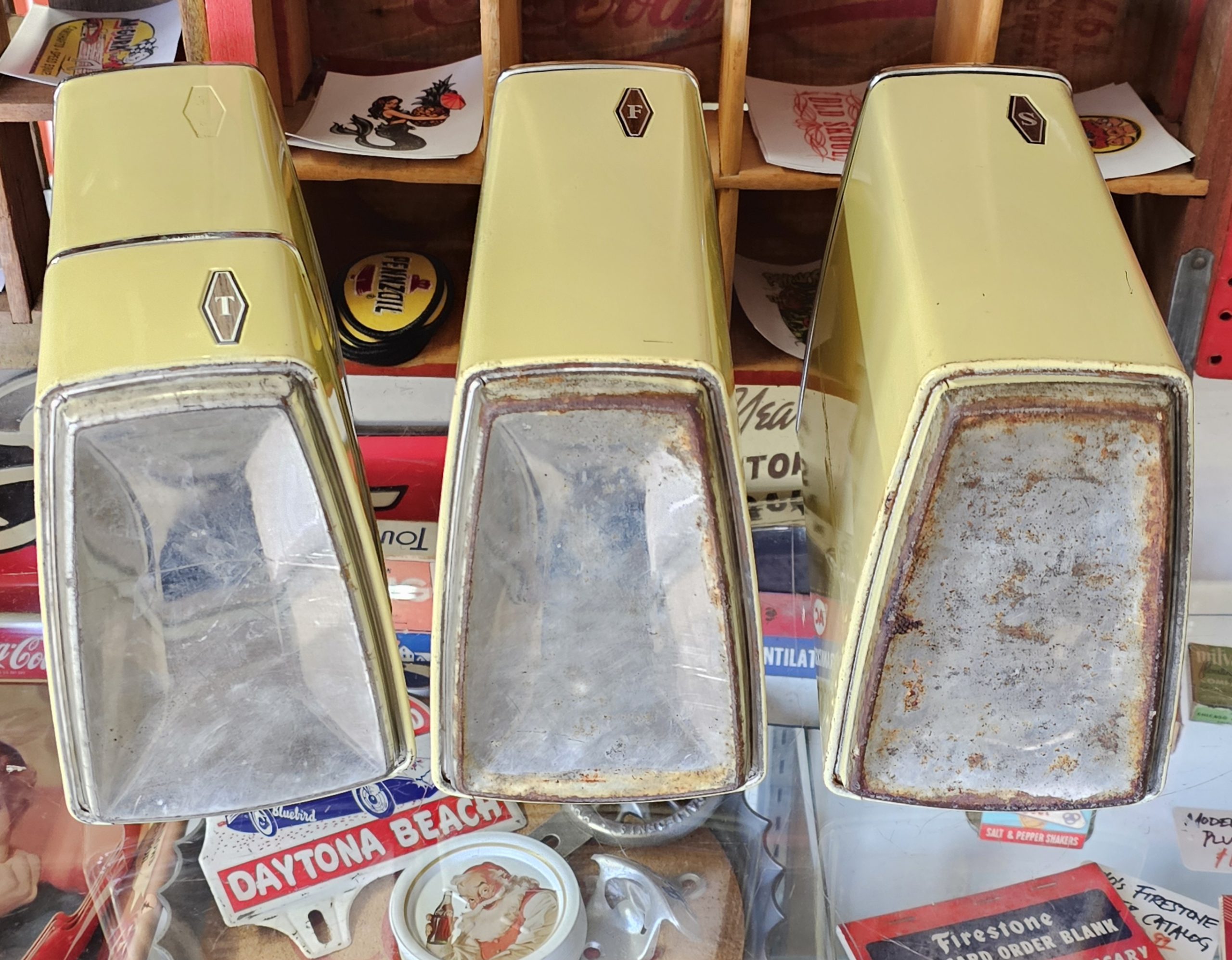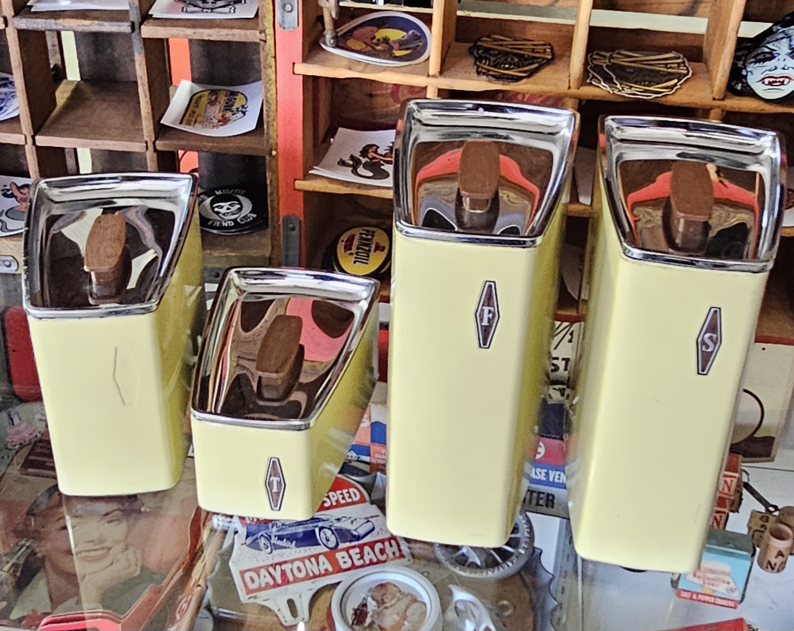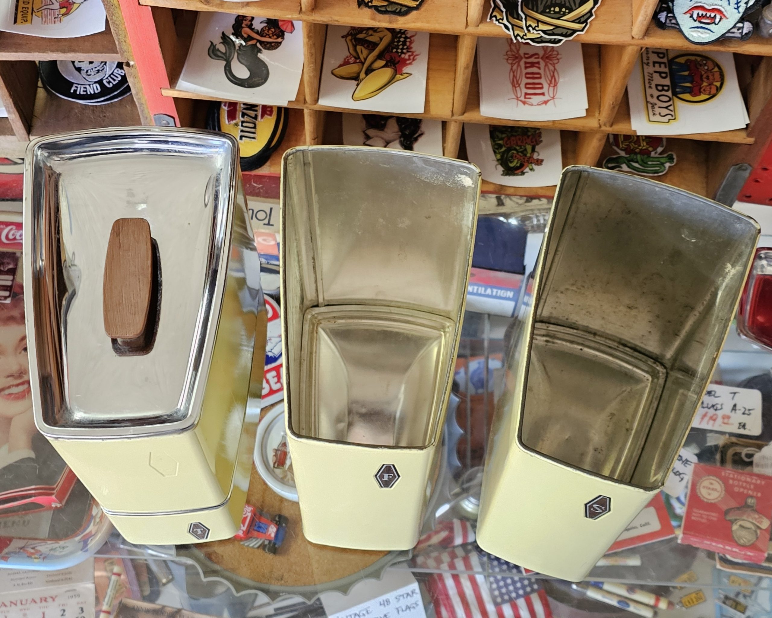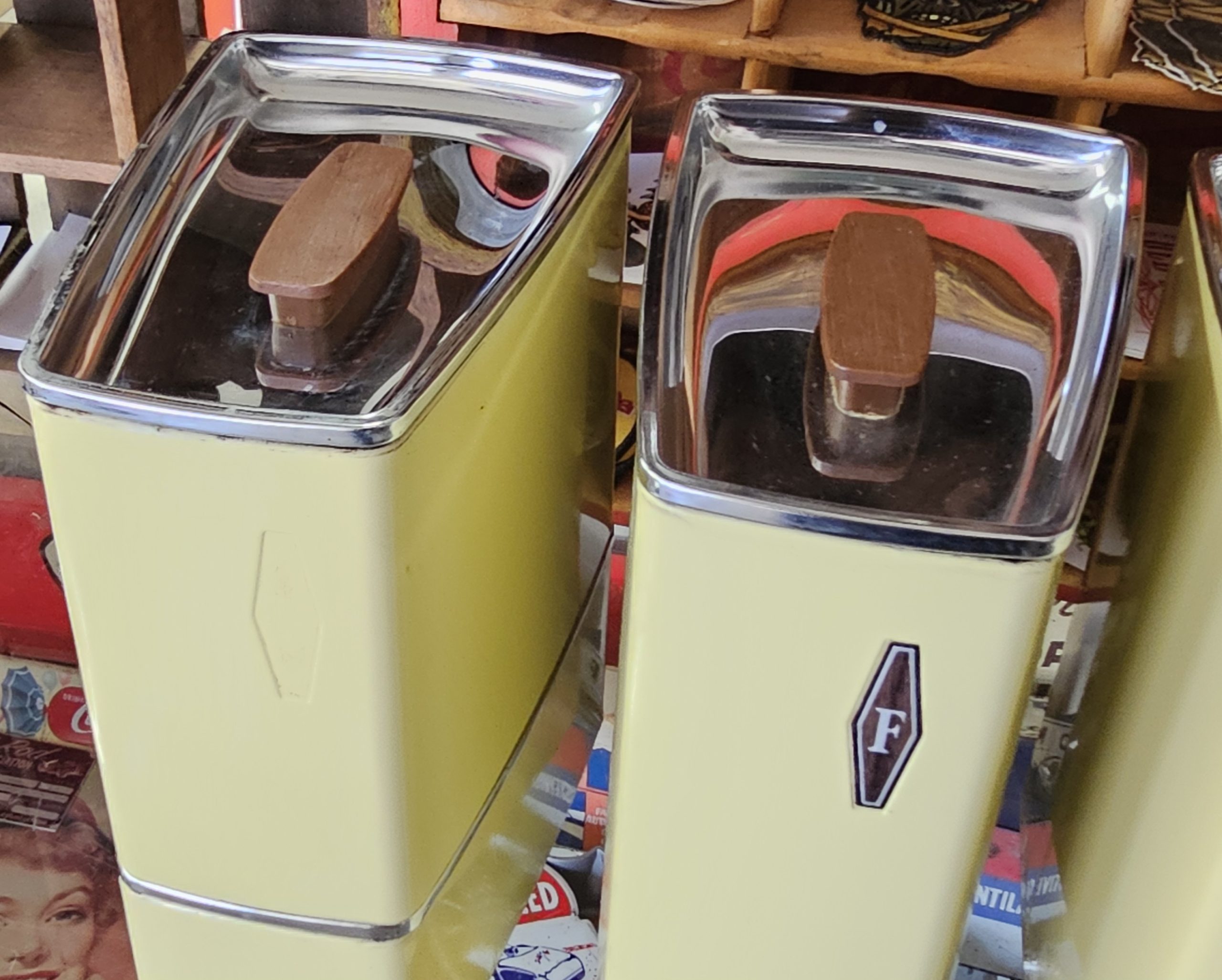 Lincoln Reality Angled Canister Set This is an original mid-century set of coffee, tea, flour & sugar. When I found them they were coated with contact paper. Once removed they showed their original yellow beauty, The 'C' for coffee badge is missing, but they are very nice. Minimal markings and chrome lids and wood handles are very nice. Bottoms do show use, insides are very clean.