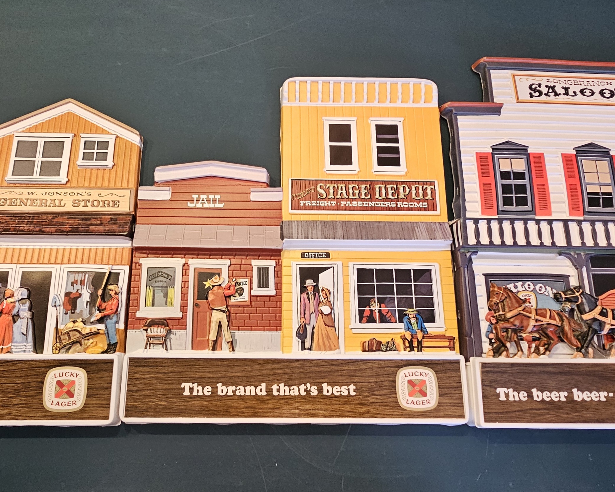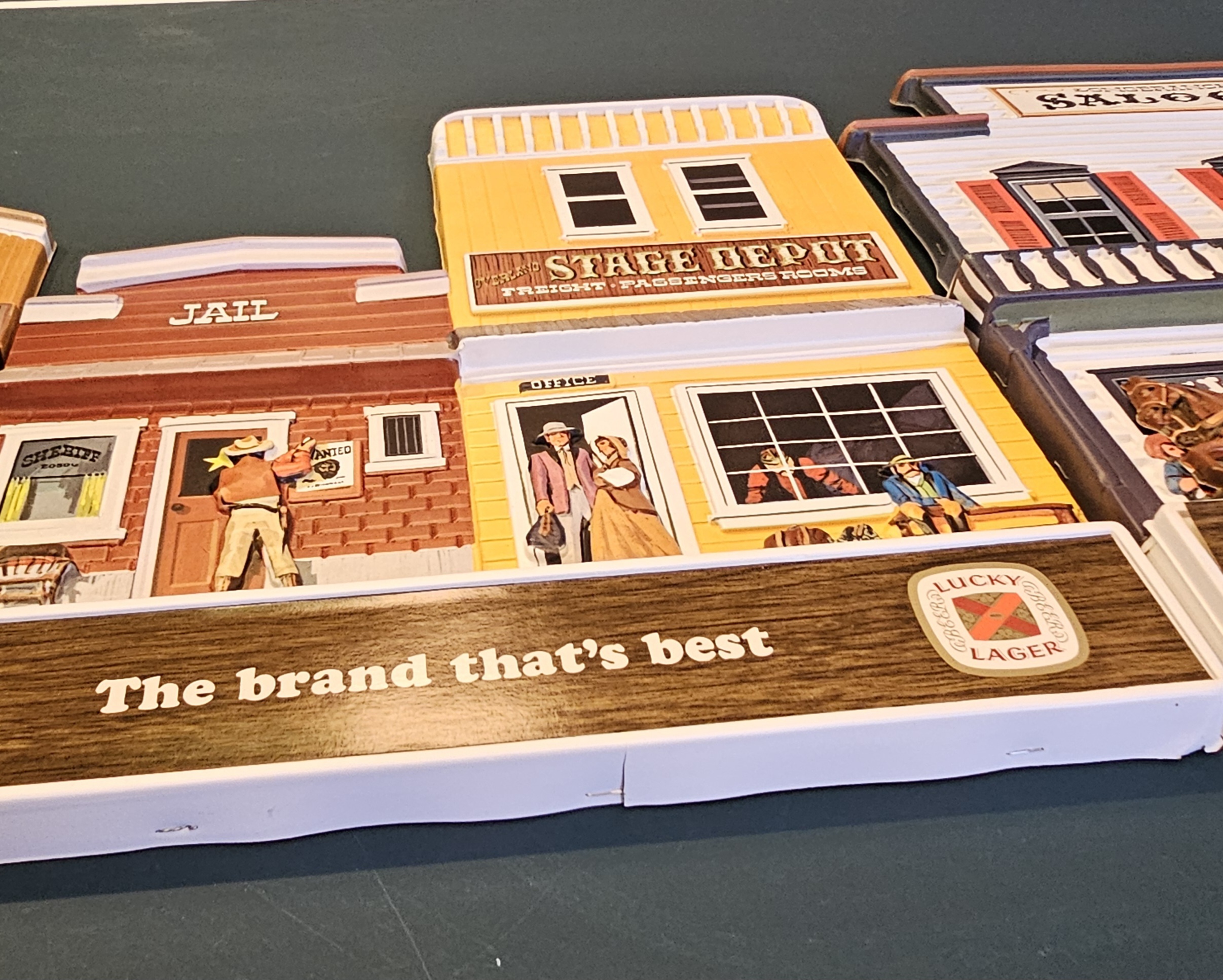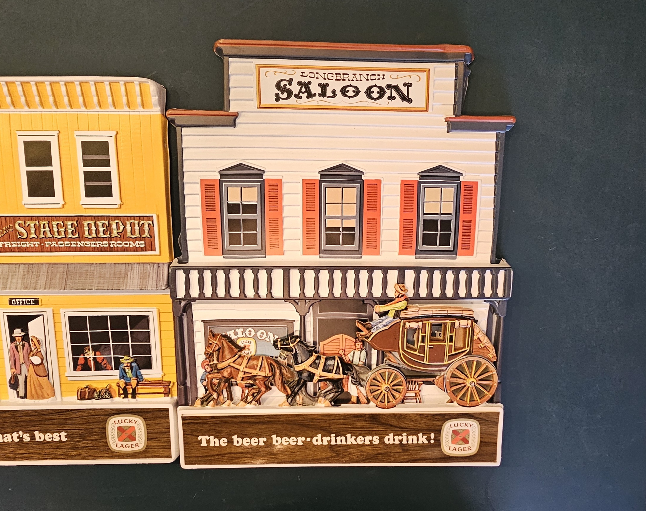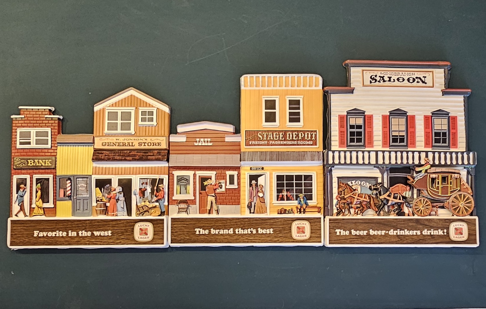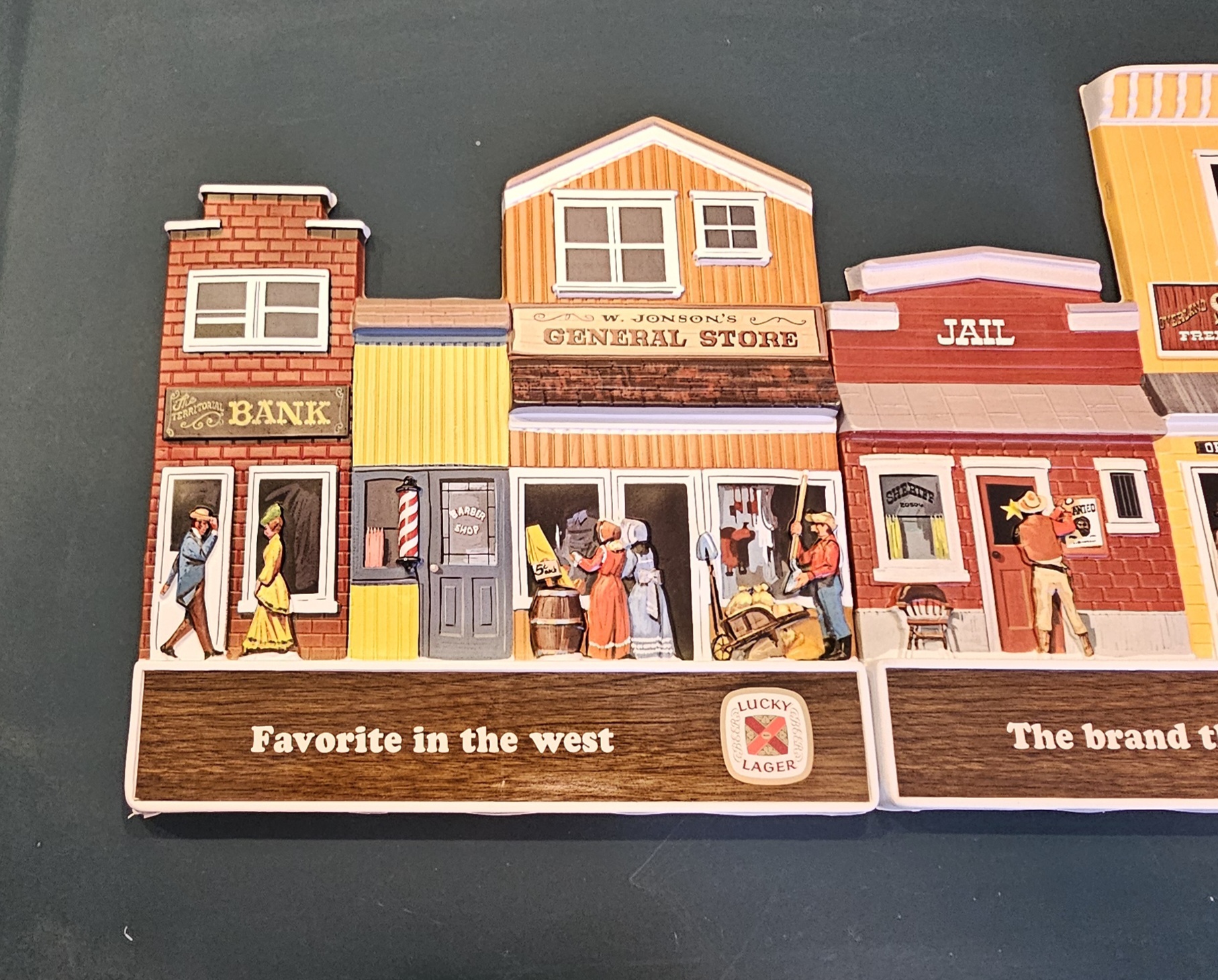 Lucky Lager Western Town Sign  This is a really cool new old stock 3-piece molded plastic advertisement.  Complete with typical scene of an old west town complete with a Bank, General Store, Jail, Stage Depot and of course a Saloon.  Slogan reads "Favorite in the West, The brand that's best, The beer beer-drinkers drink! Made during the 1960s, this is in fantastic shape.  Only major flaw is small crack at bottom of one (shown in picture).  Can mount with sticky backing or built in hanger.