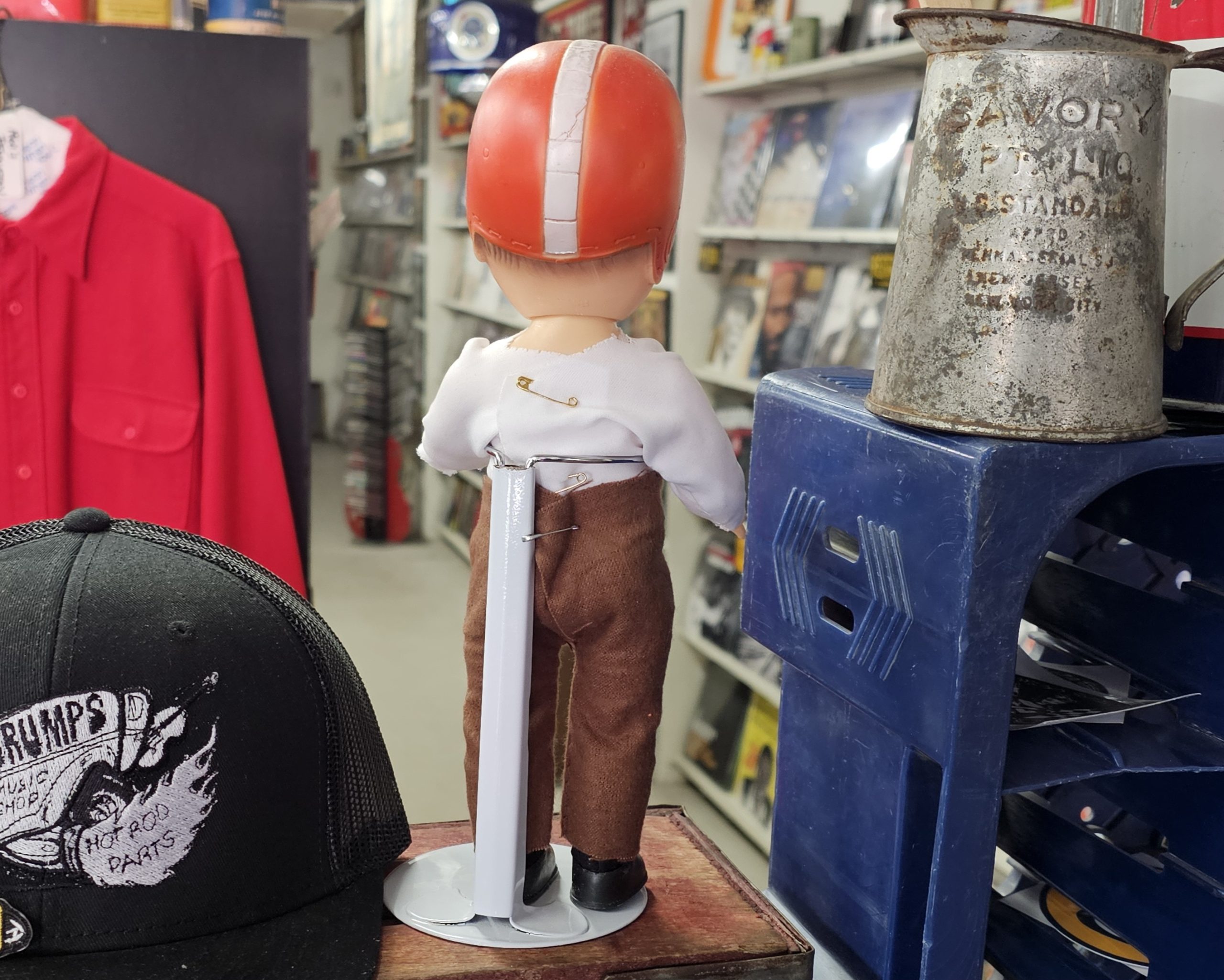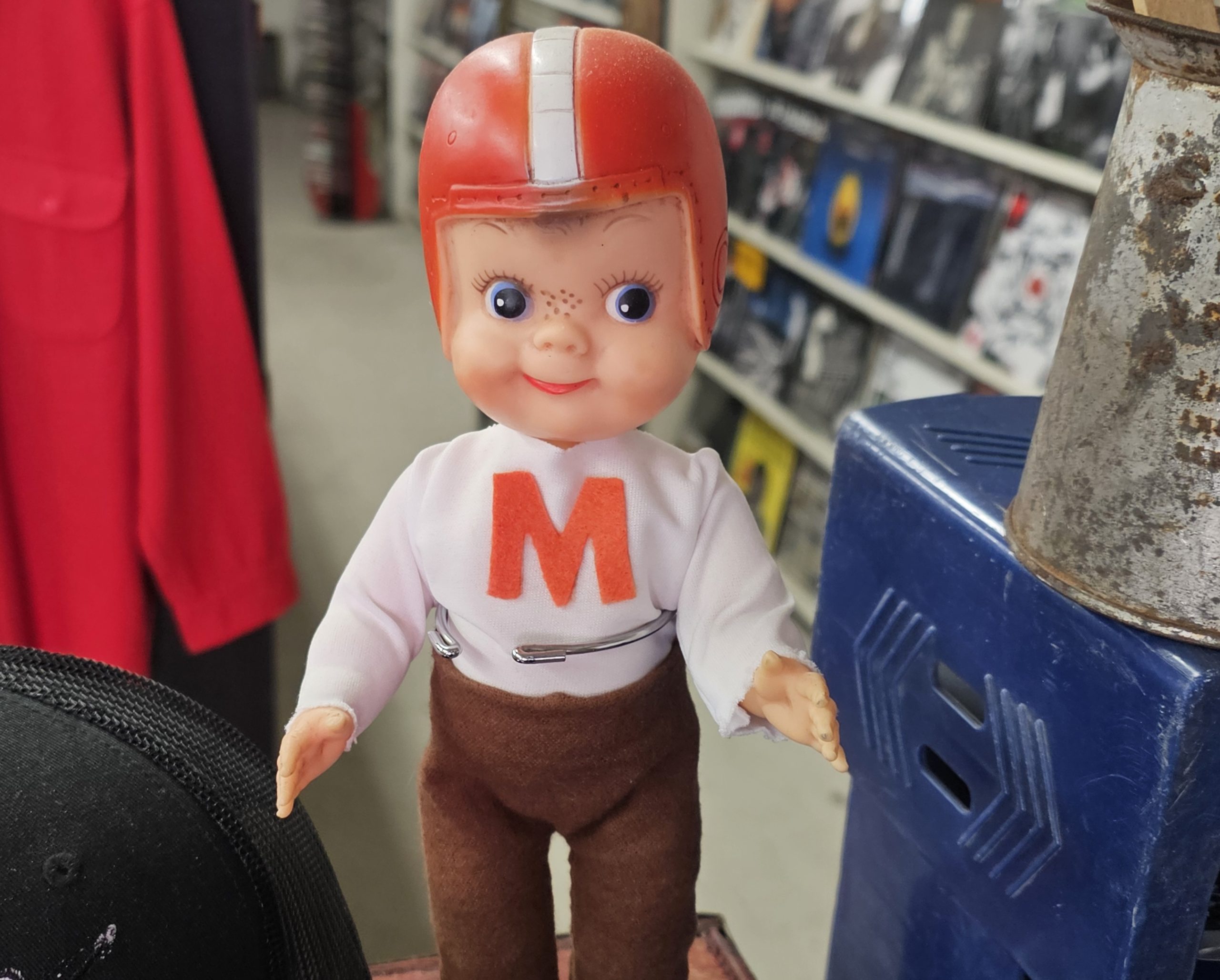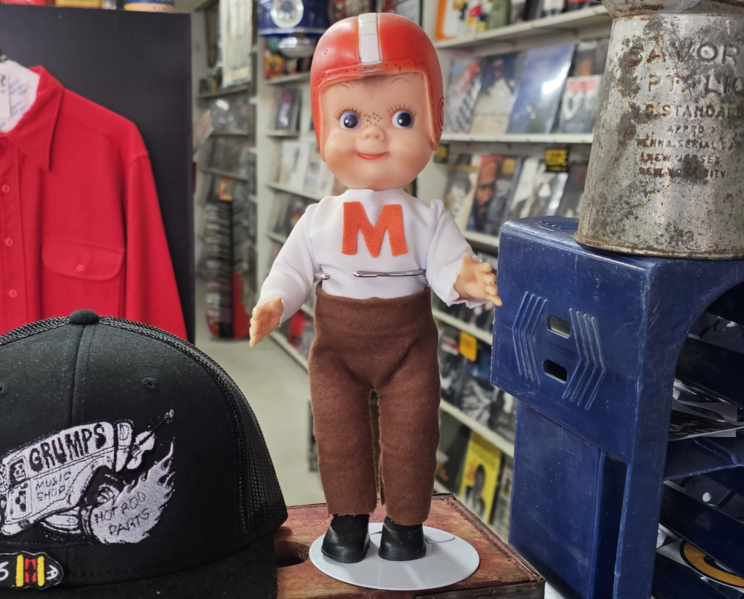 Mickey All American Football Doll  Effanbee 1950s original.  Effanbee made this series from 1956-1972.  The doll is made of vinyl and stands about 10-11" tall.  Stand is included.  It features painted eyes, freckles, a closed mouth, and molded hair.  The doll in the picture is wearing a football uniform, including a red helmet and a white shirt with an "M" on it.  Effanbee dolls are known for their realistic proportions and quality craftsmanship.