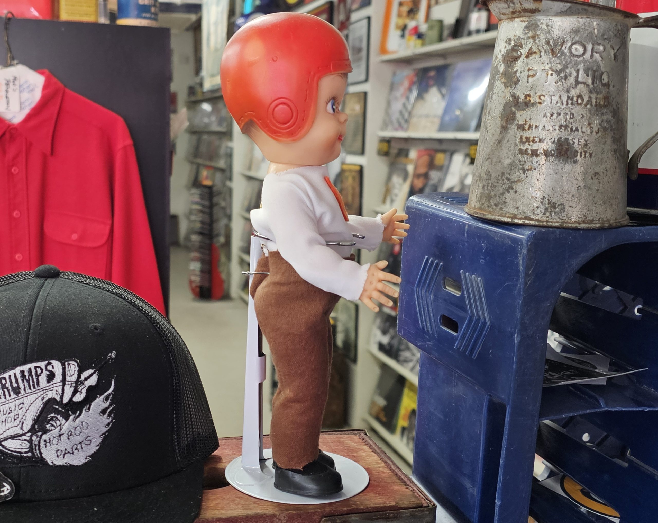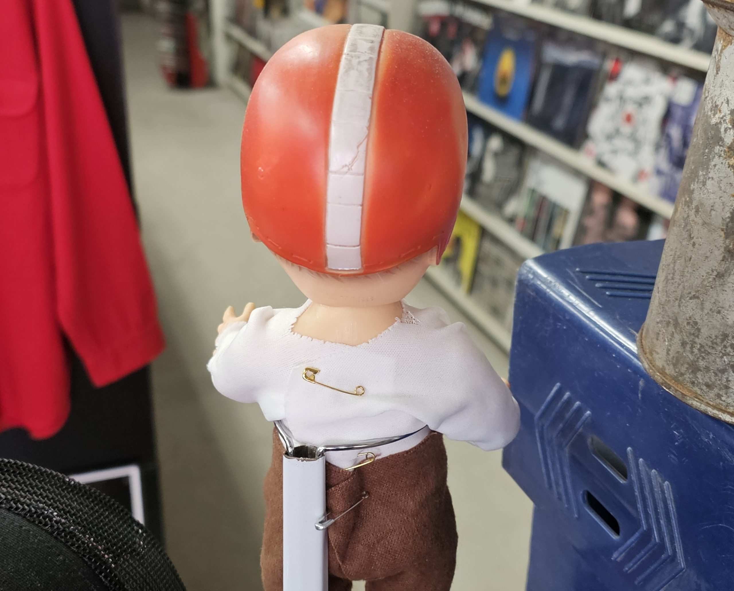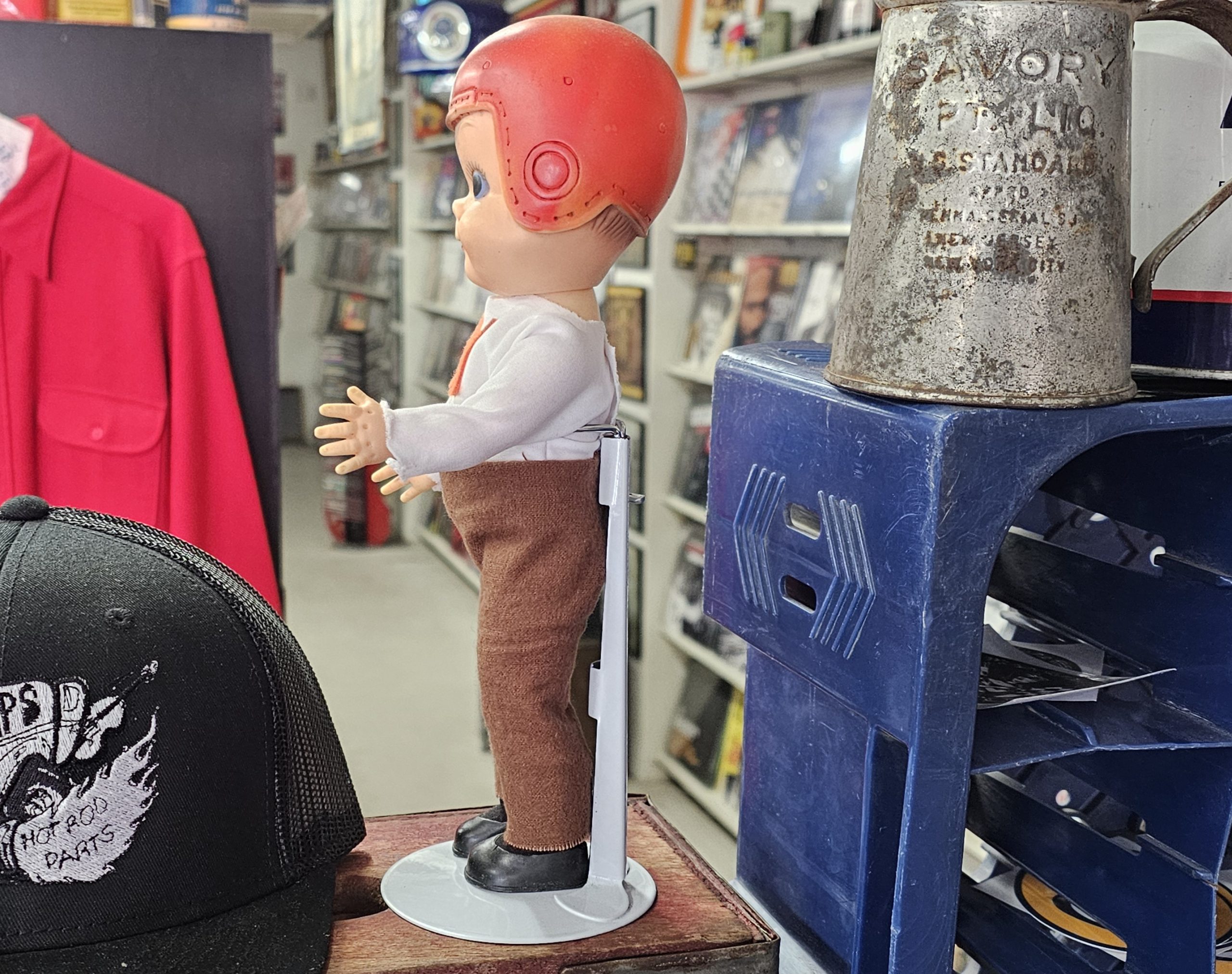 Mickey All American Football Doll  Effanbee 1950s original.  Effanbee made this series from 1956-1972.  The doll is made of vinyl and stands about 10-11" tall.  Stand is included.  It features painted eyes, freckles, a closed mouth, and molded hair.  The doll in the picture is wearing a football uniform, including a red helmet and a white shirt with an "M" on it.  Effanbee dolls are known for their realistic proportions and quality craftsmanship.