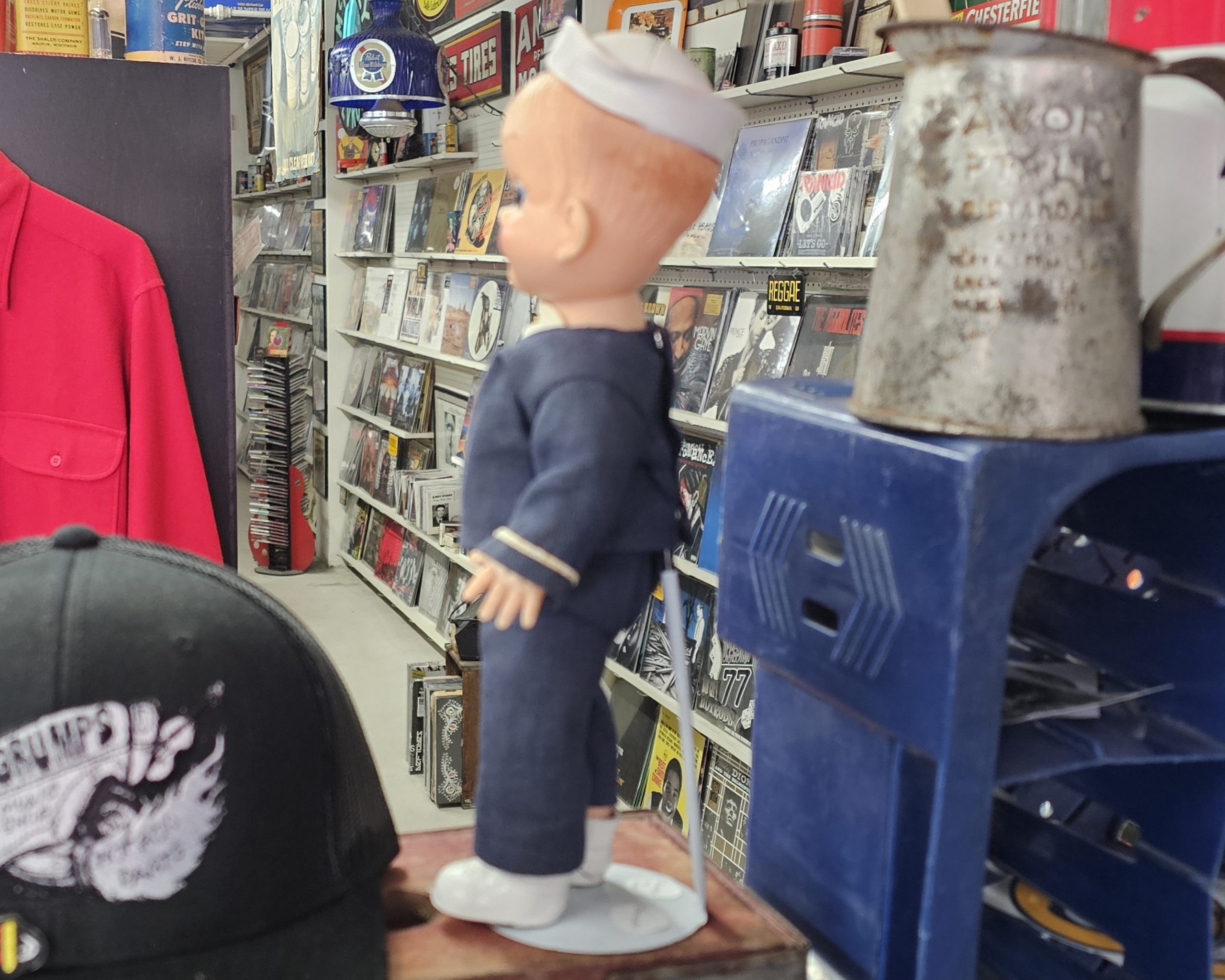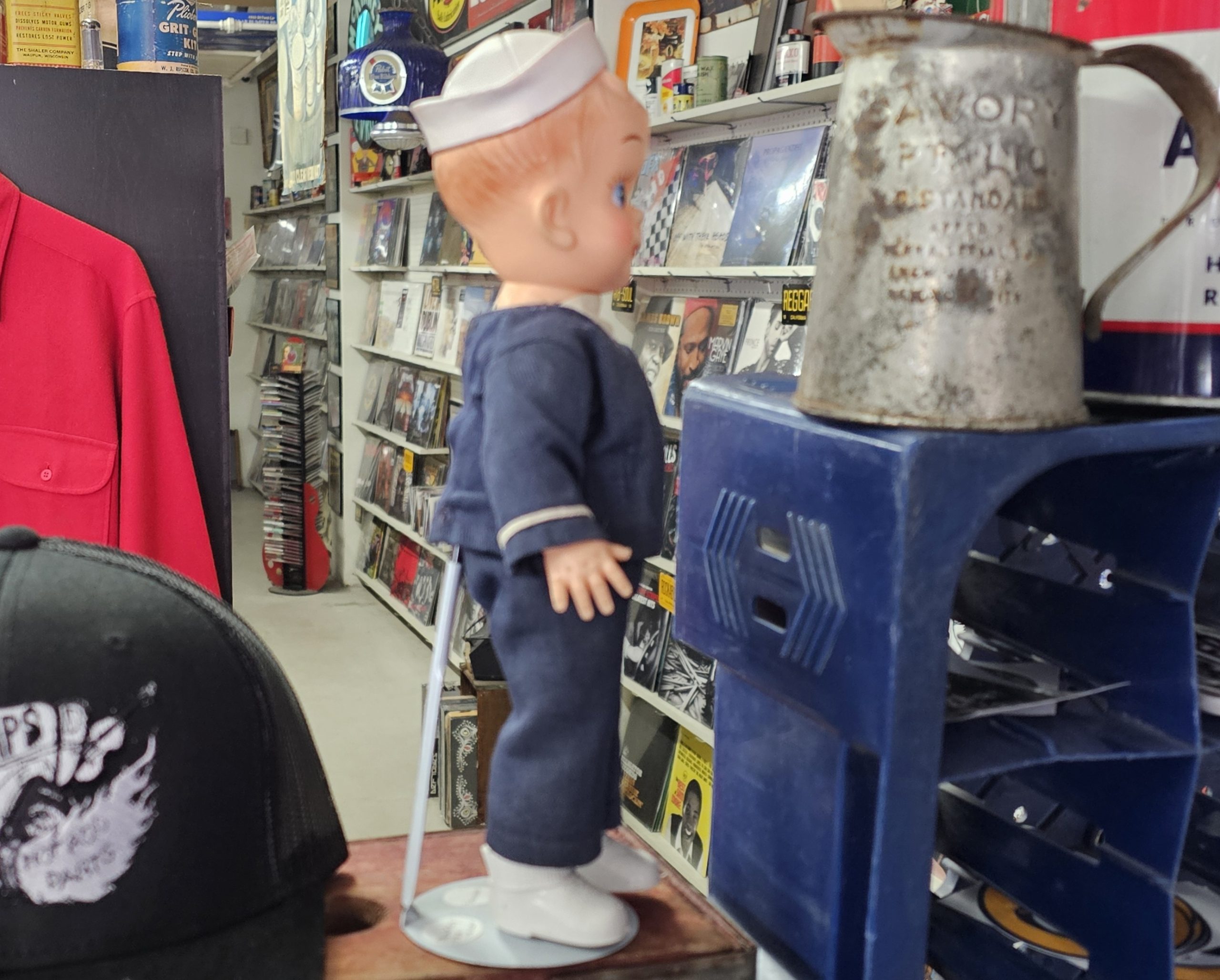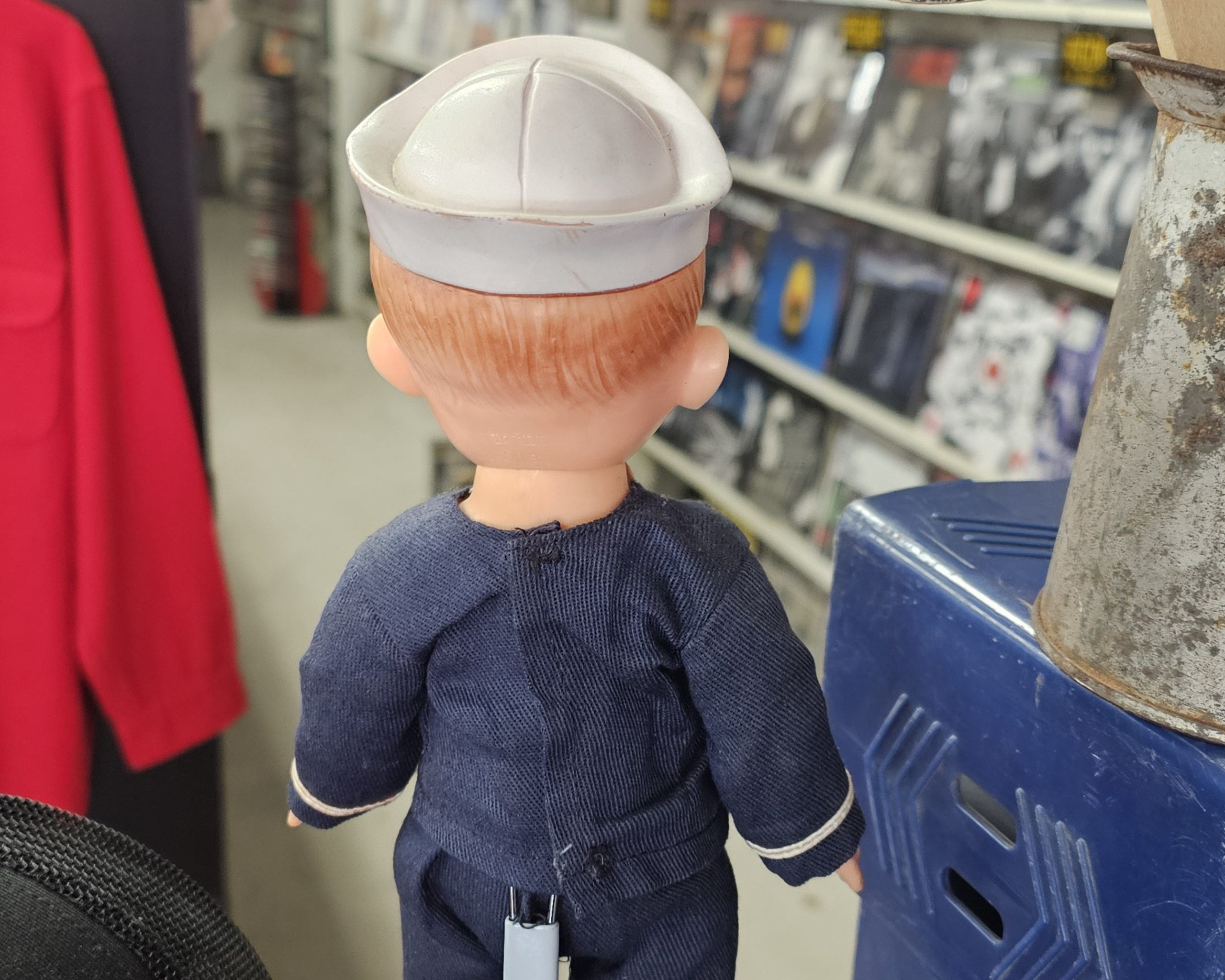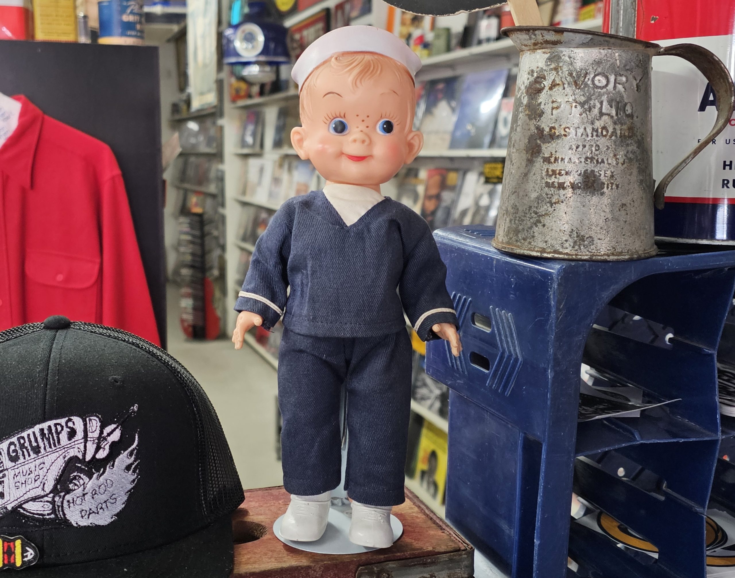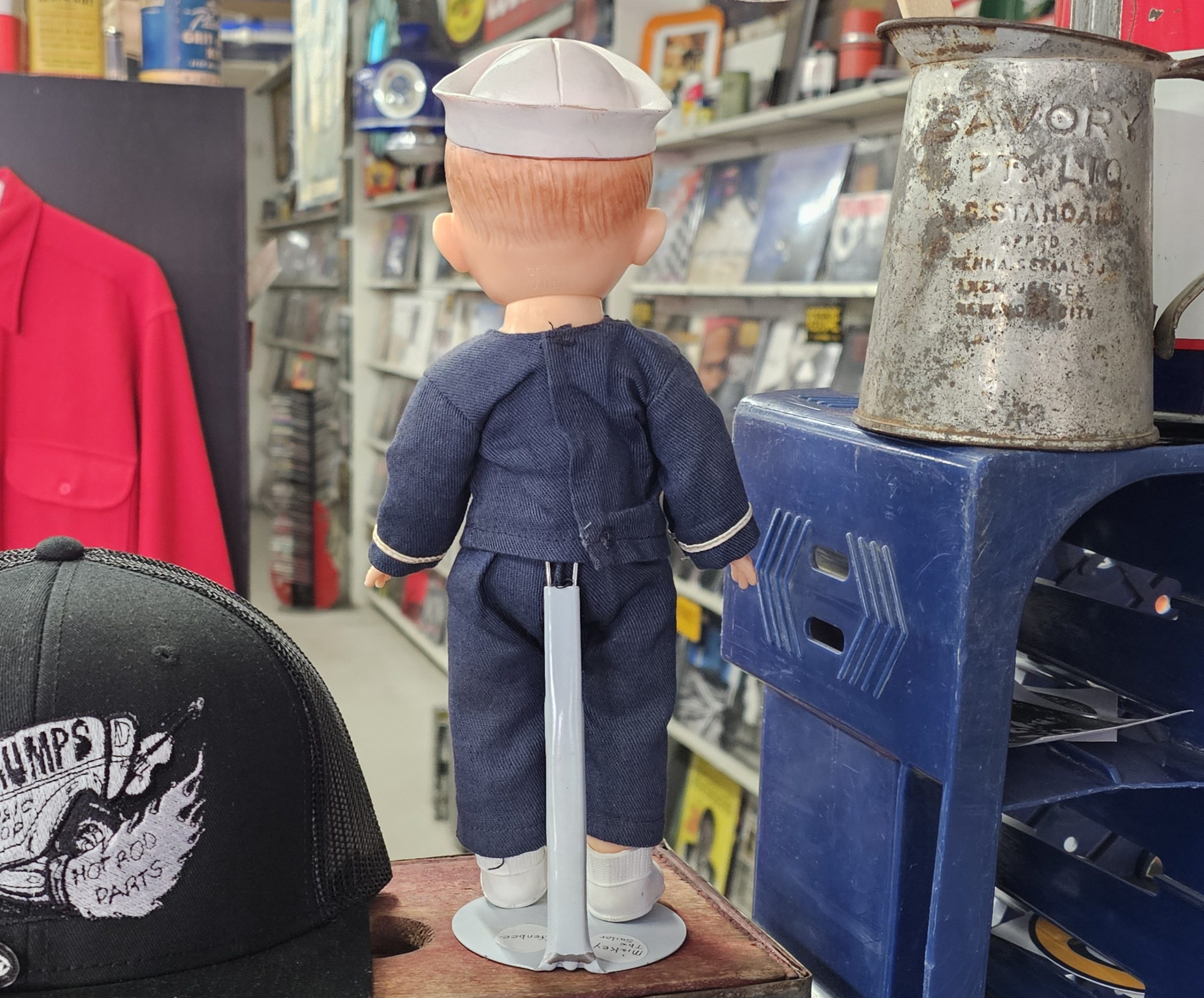 Mickey The Sailor Boy Effanbee Doll This is a 1950s original in great shape. Stand is included. This doll is approximately 11" tall. He is dressed in a navy blue sailor suit and a sailor cap. He has molded blonde hair, blue eyes, and a light complexion. The doll is jointed at the arms and legs, and his head turns.