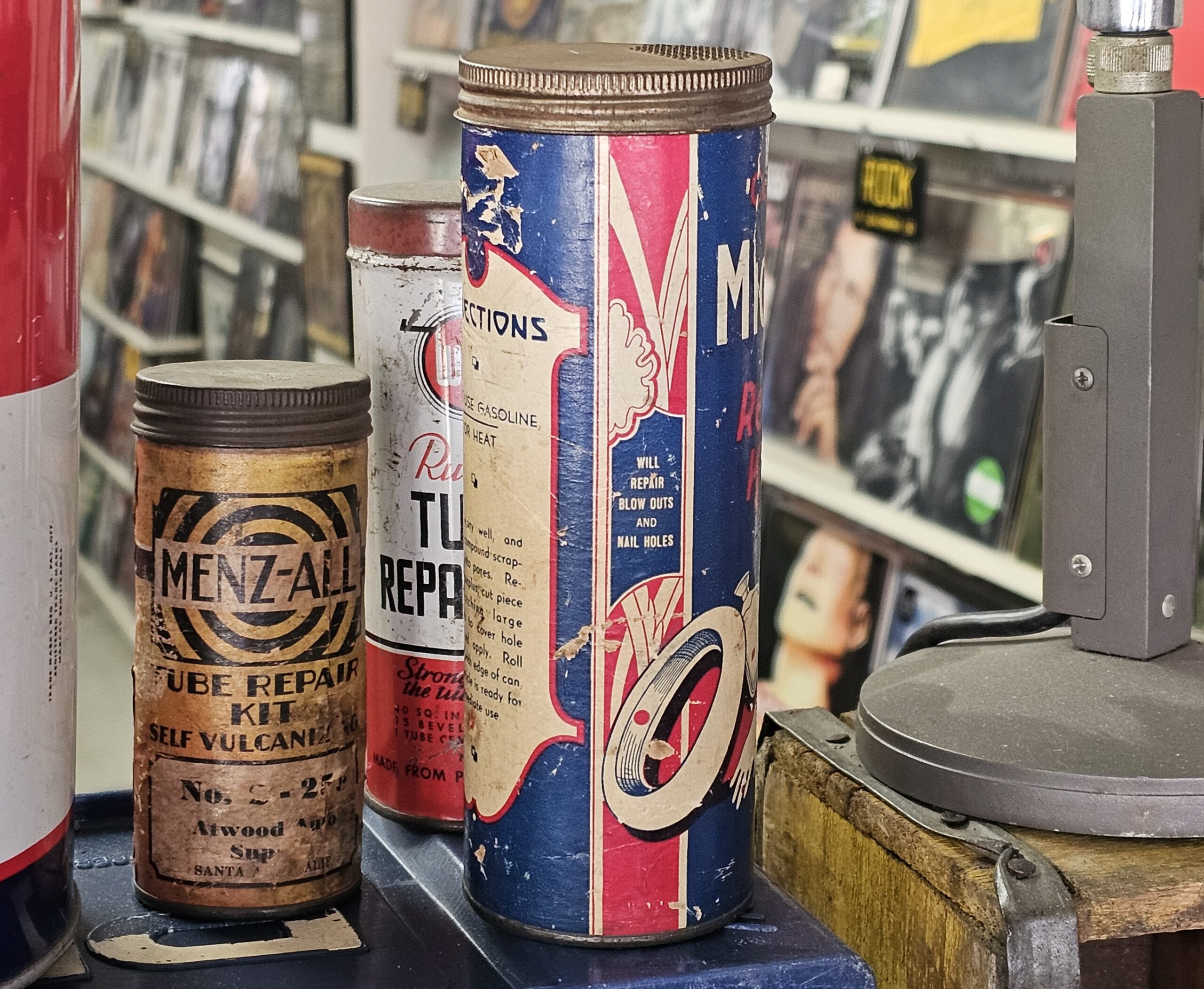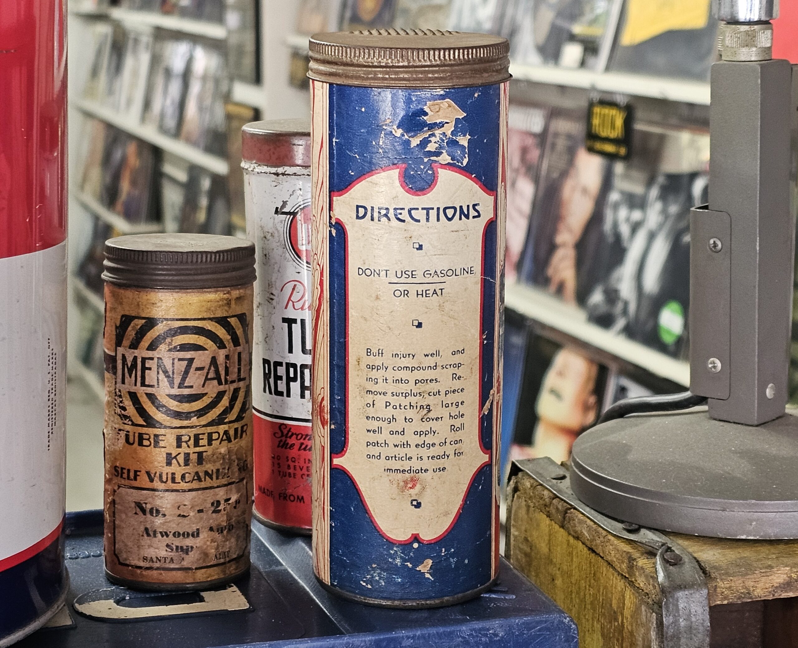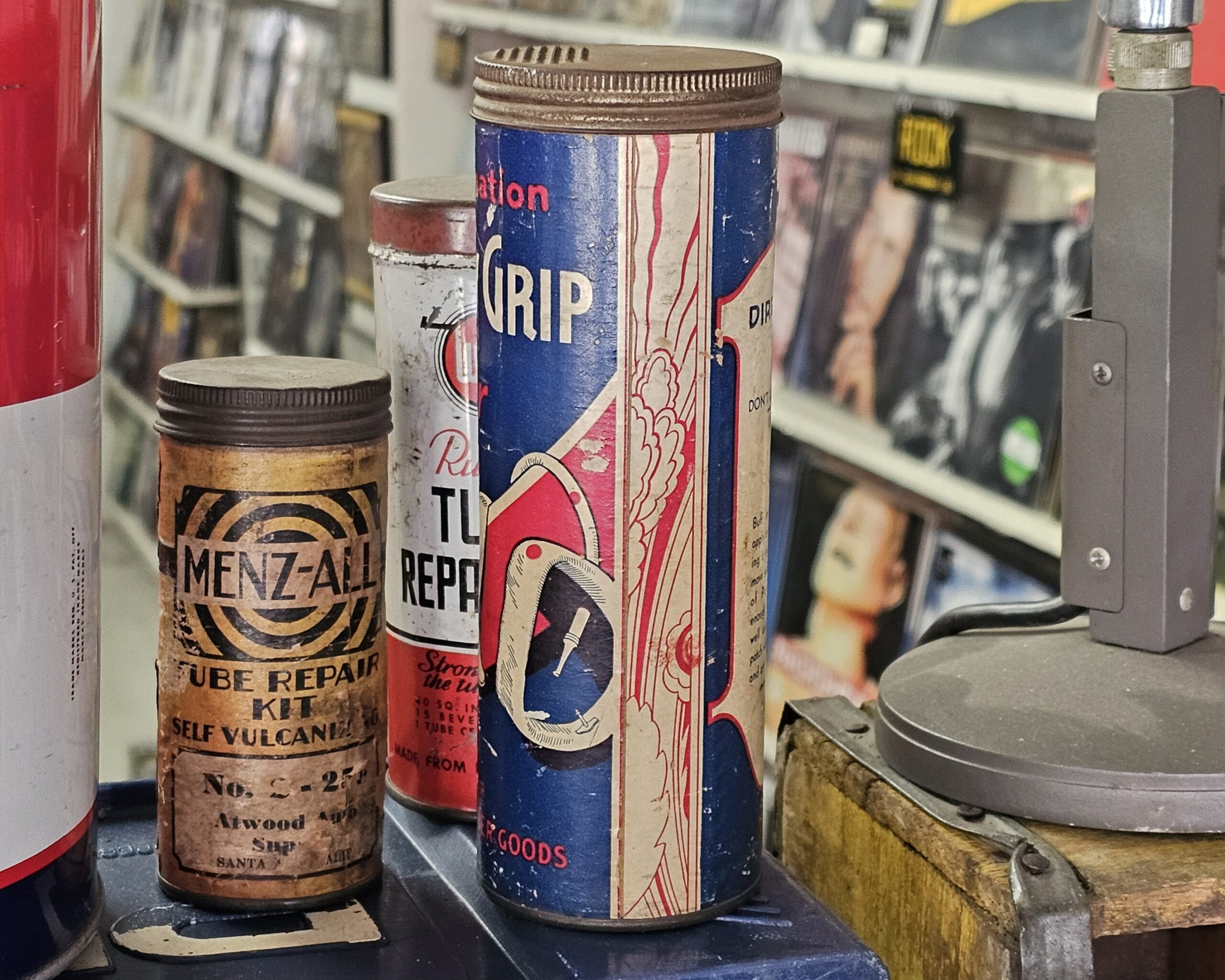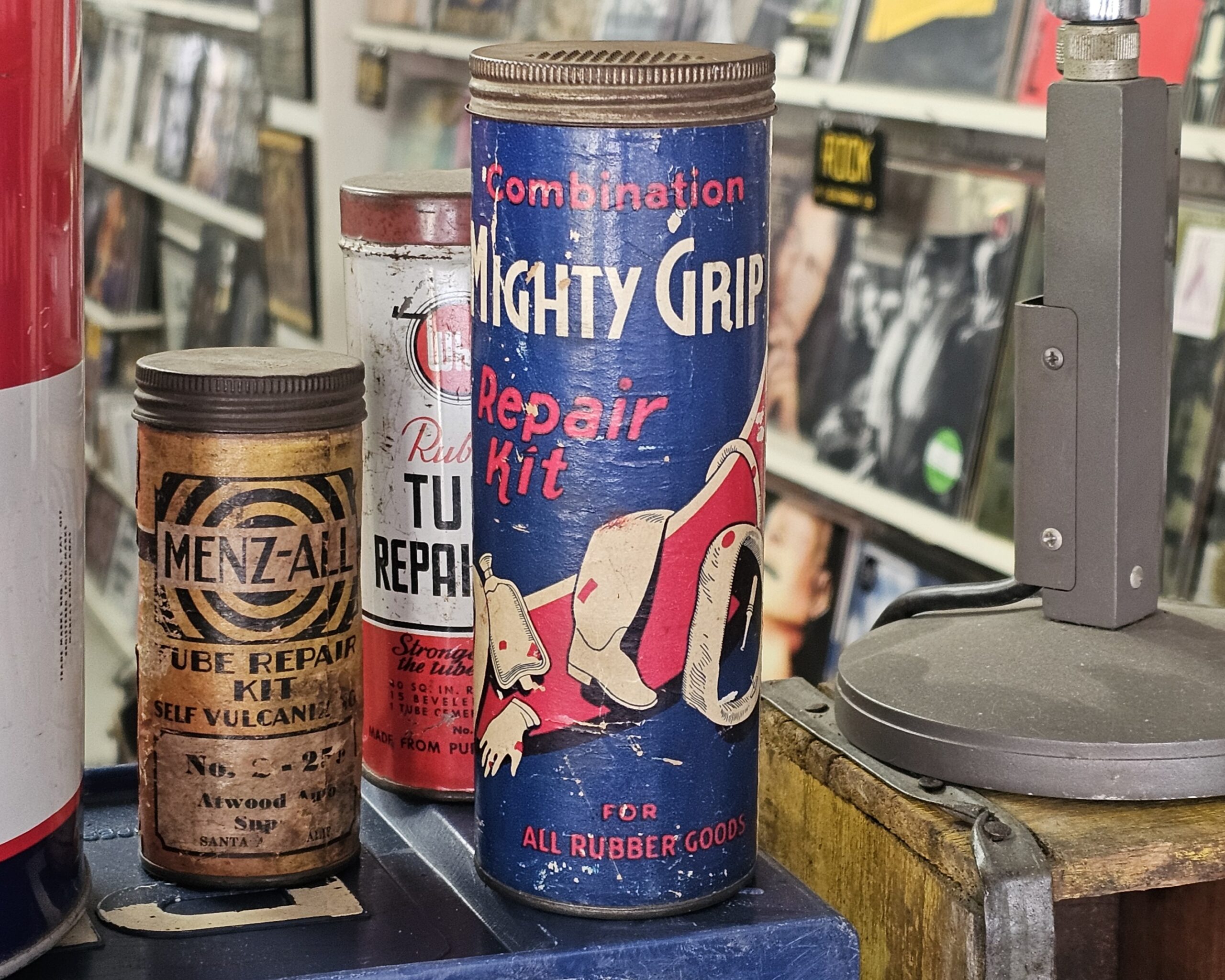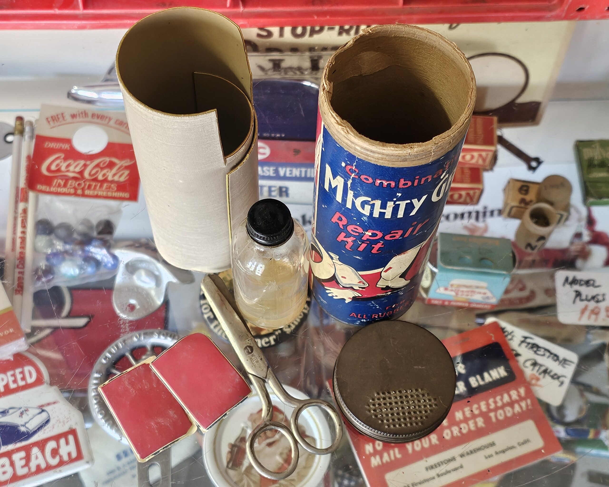 Mighty Grip Combination Repair Kit This is a cardboard bodied kit that has cement glass jar, scissors and rubber. Made for all rubber products, does have small pushed in area at top back (see picture). Directions for original use on back. 1940s-50s. Grumps Collectibles So-Cal.