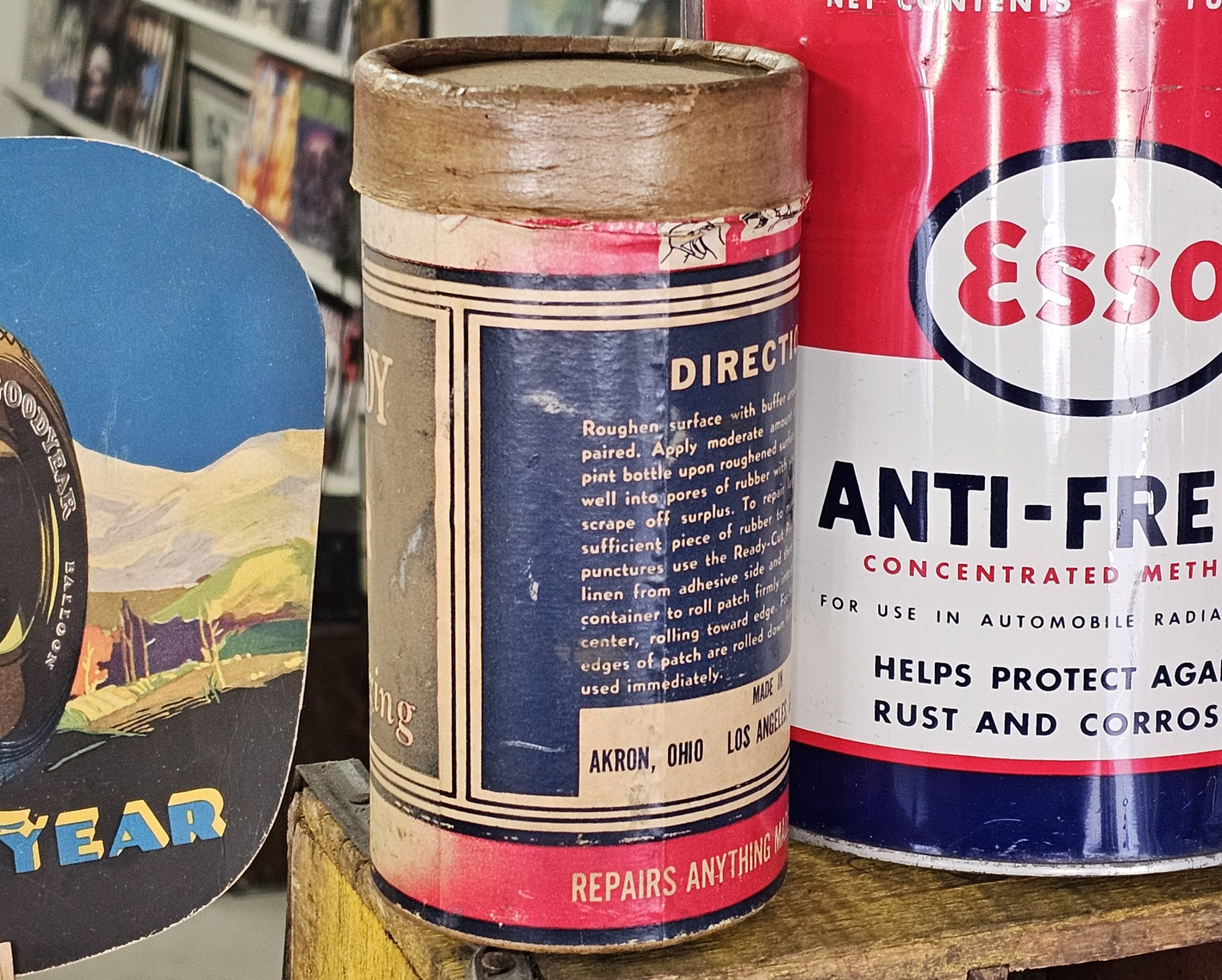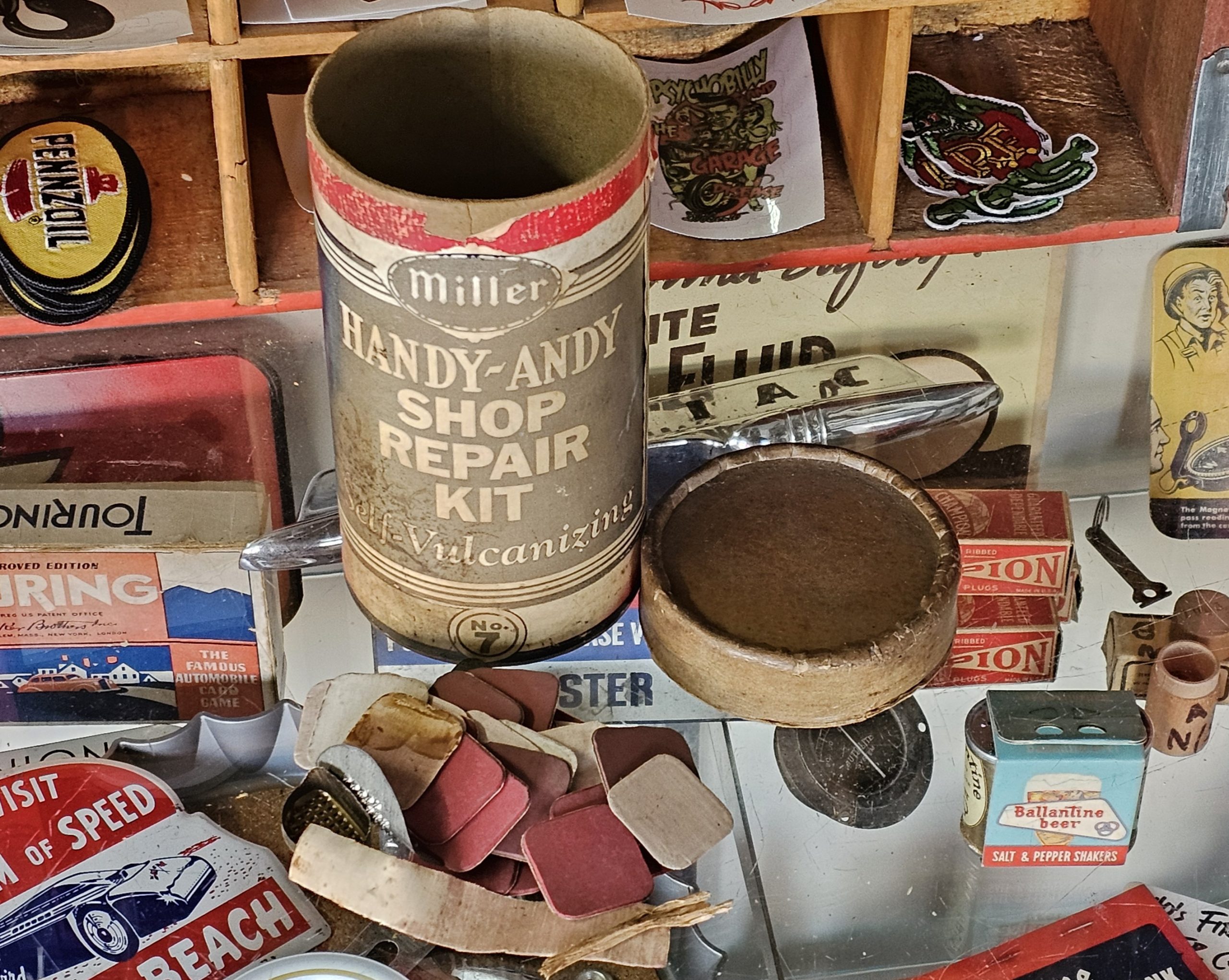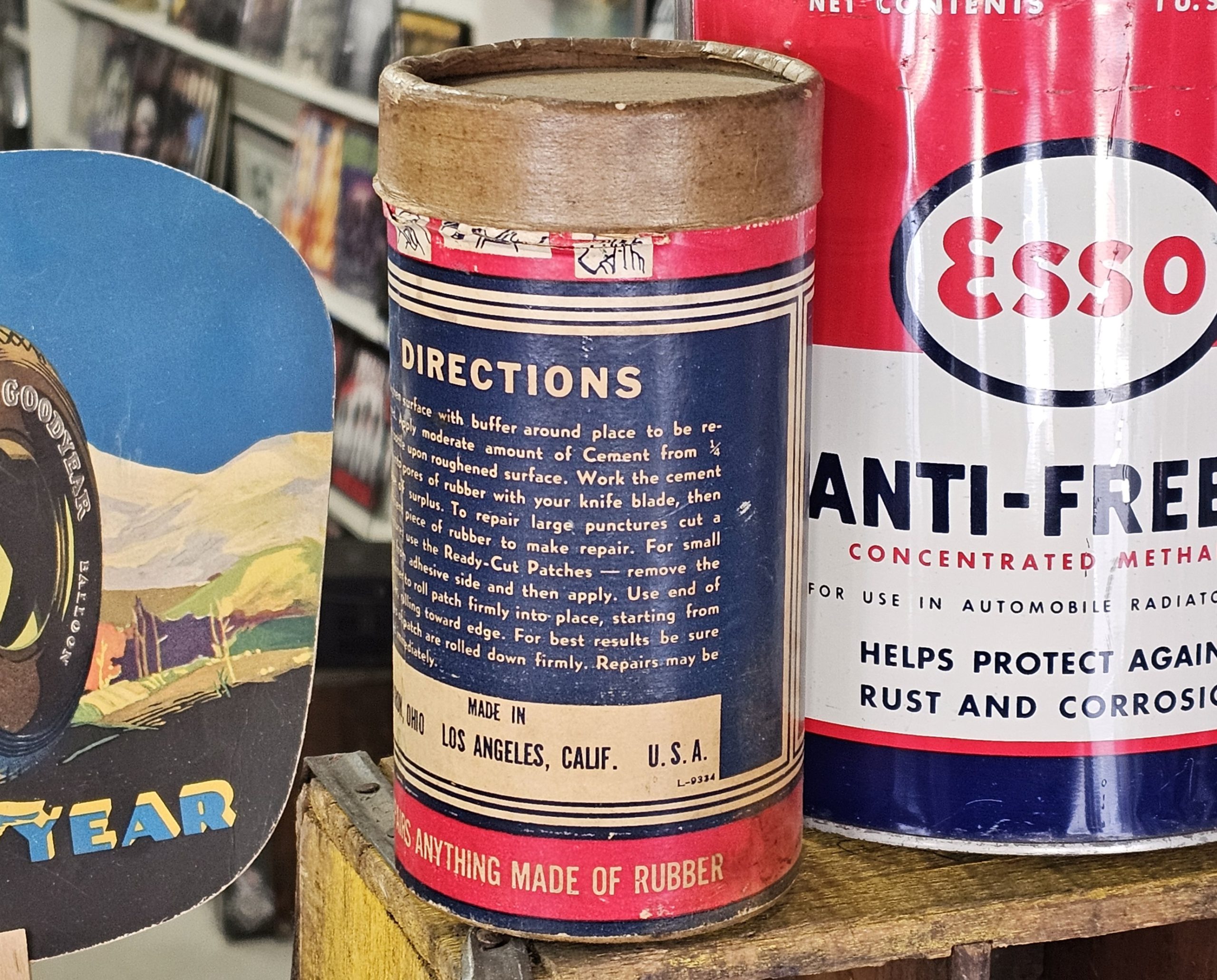Miller Handy-Andy Shop Repair Kit No 7 Manufactured by The Miller Rubber Company Akron, OH. In rough shape, but on the rarer side to find a larger shop kit. All cardboard, including top. As you can see one side is faded and paper label has some damage, but has quite a bit of original product.. Perfect for shop or garage décor, or even use as a prop for auto show. Keeping the past alive one item at a time.