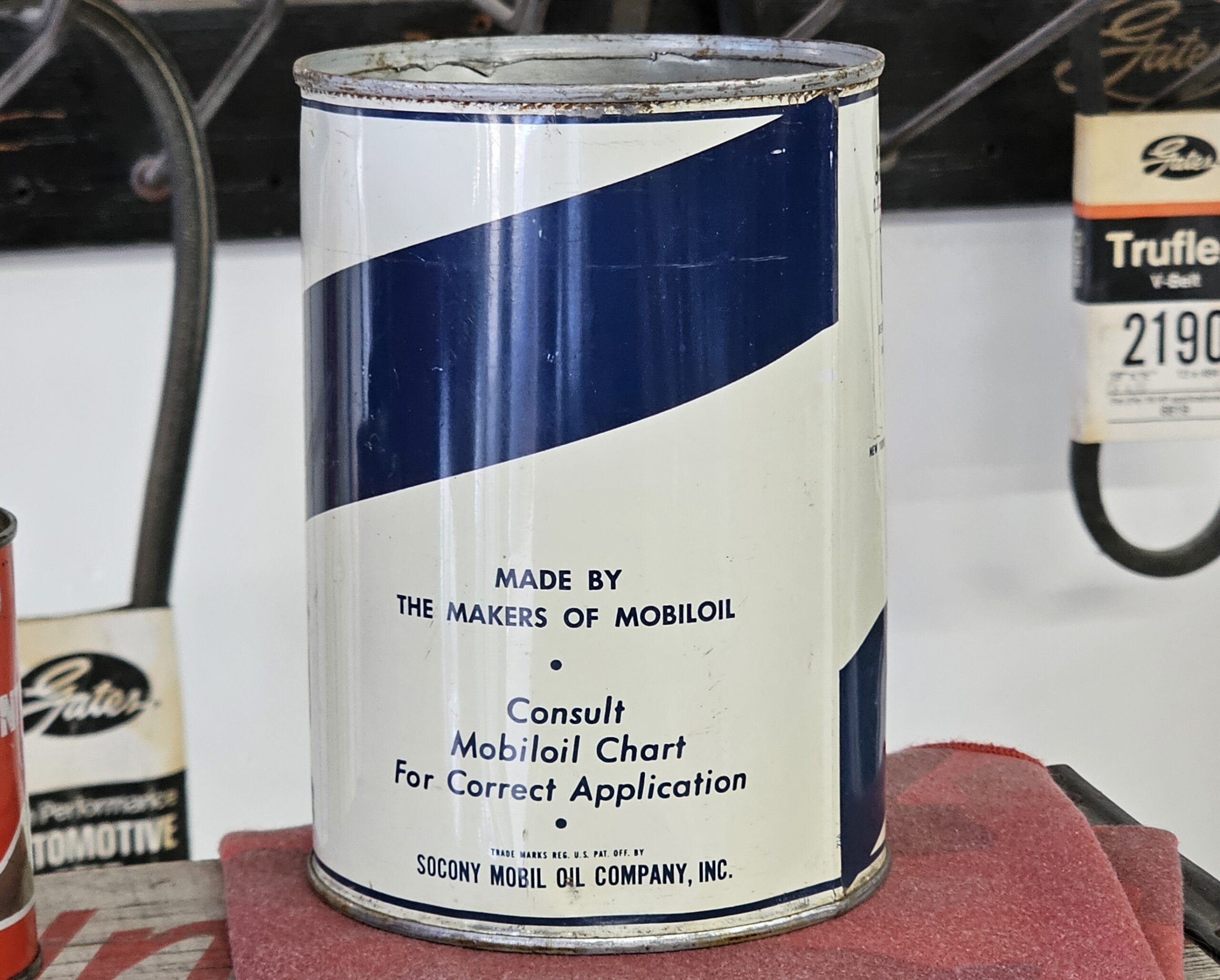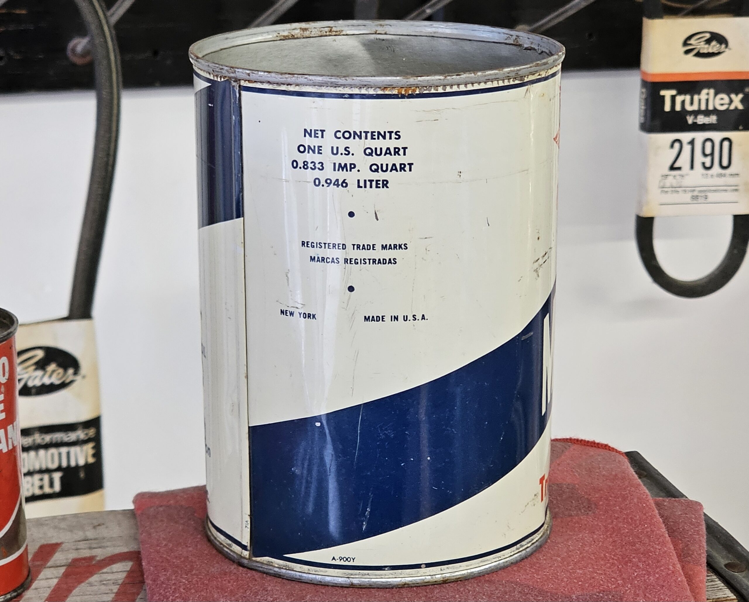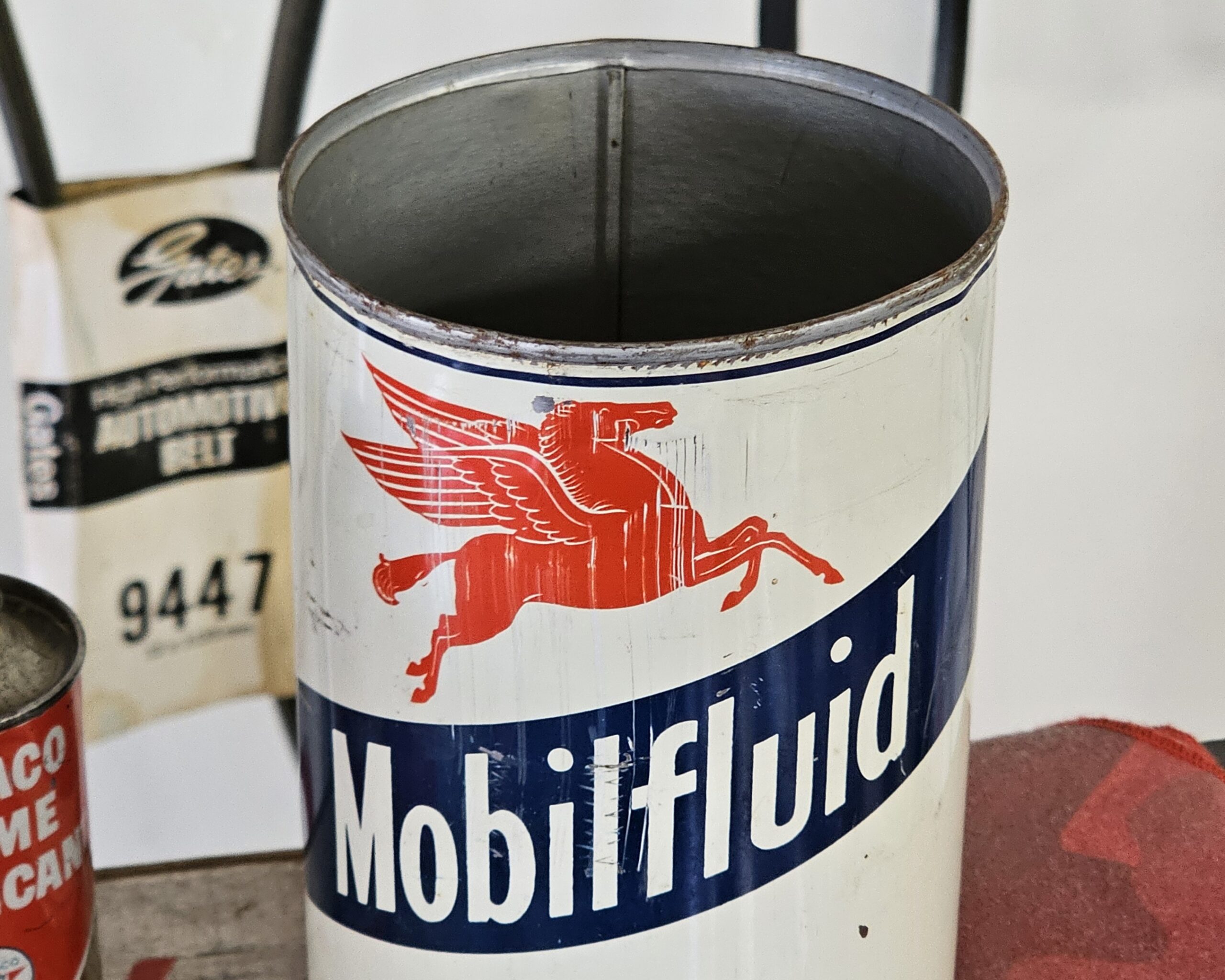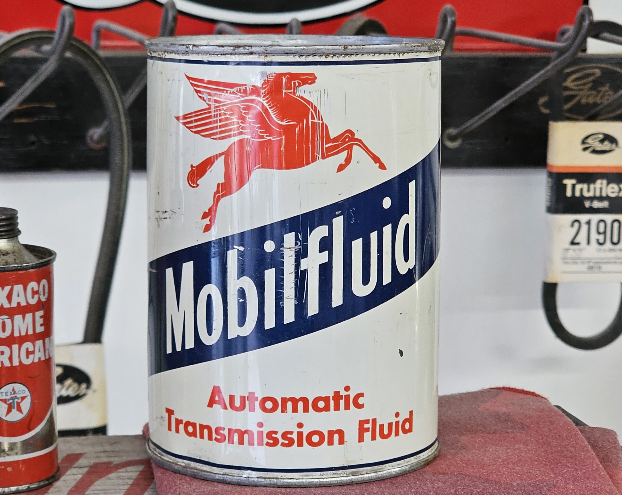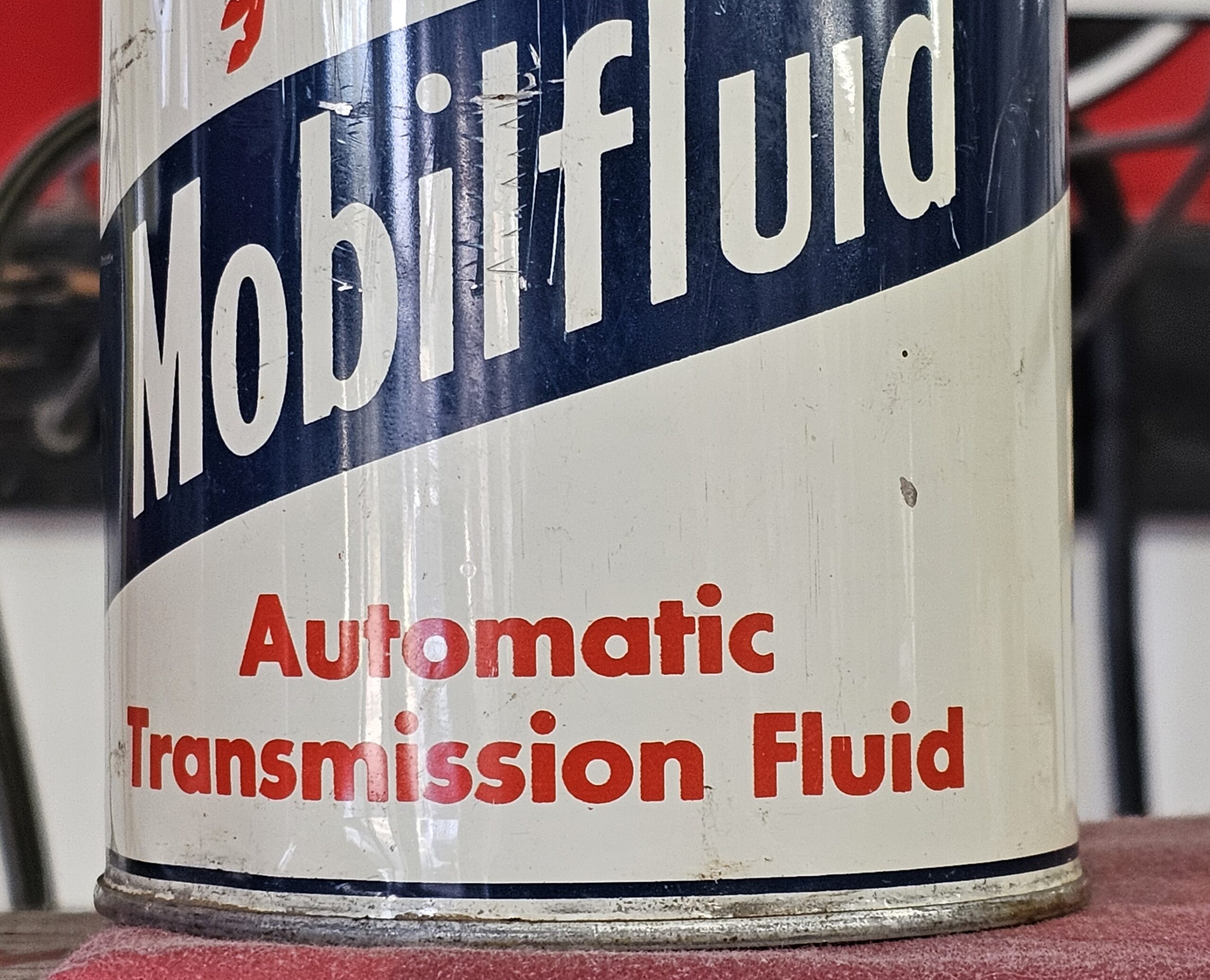 Mobilfluid Automatic Transmission Fluid This is an original 1950s tin can, has no top at all. Has some minor scratching and small dent at bottom. Pegasus and color remains very vibrant. Perfect addition to any Mobil Oil collection, or to display in your garage or man cave.