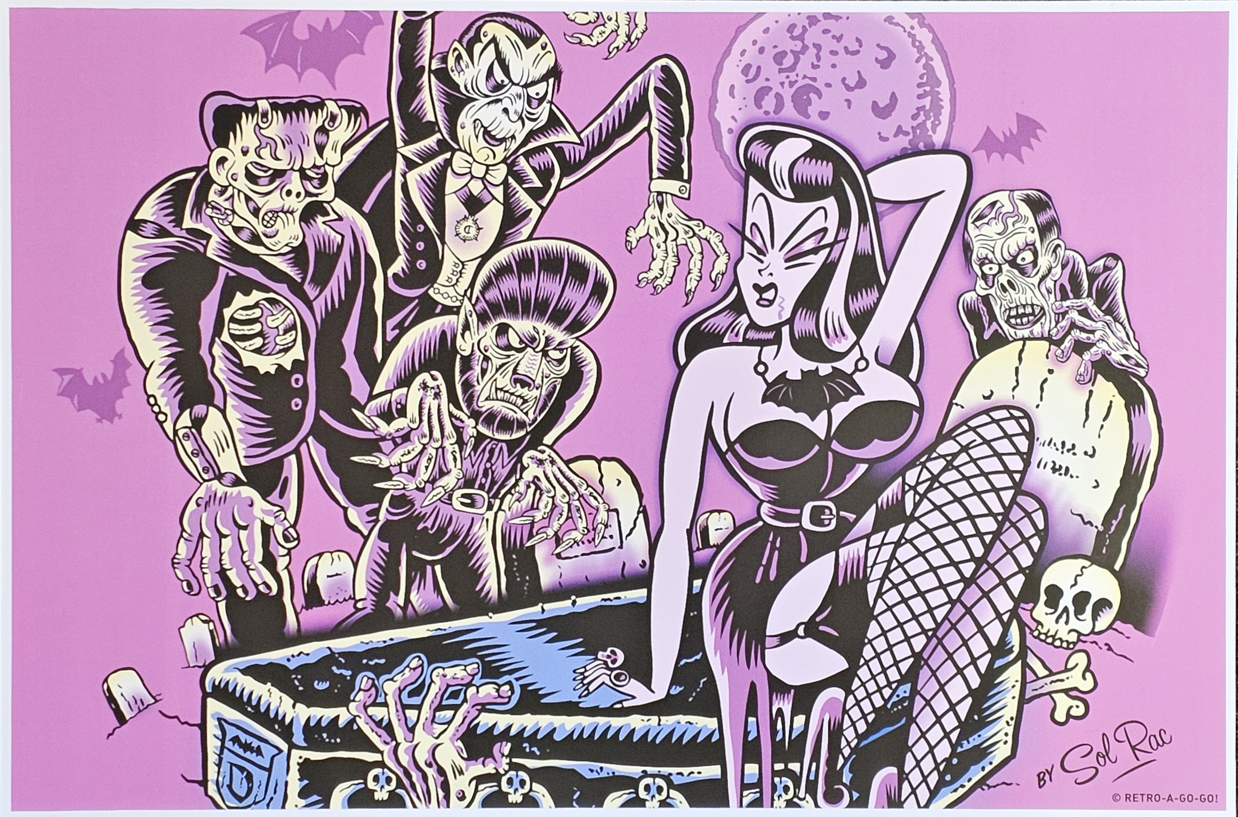 Monster Mash  Art print of Sol Roc.  12" X 18" digital print.  Printed on uncoated 80# stock.  Smooth, uniform finish for better resolution and Acid-free for archival quality.  Prints ship flat, in an acid and lignin free clear bag with a rigid backer.  Quality art for your walls.