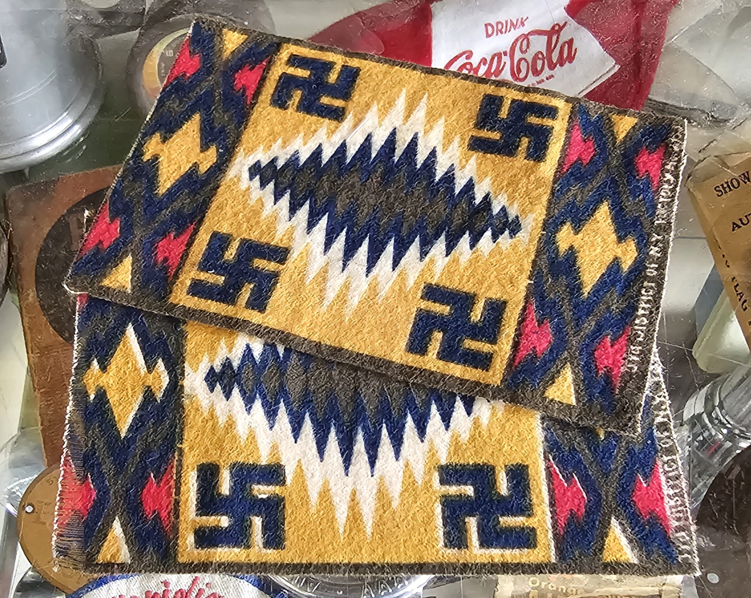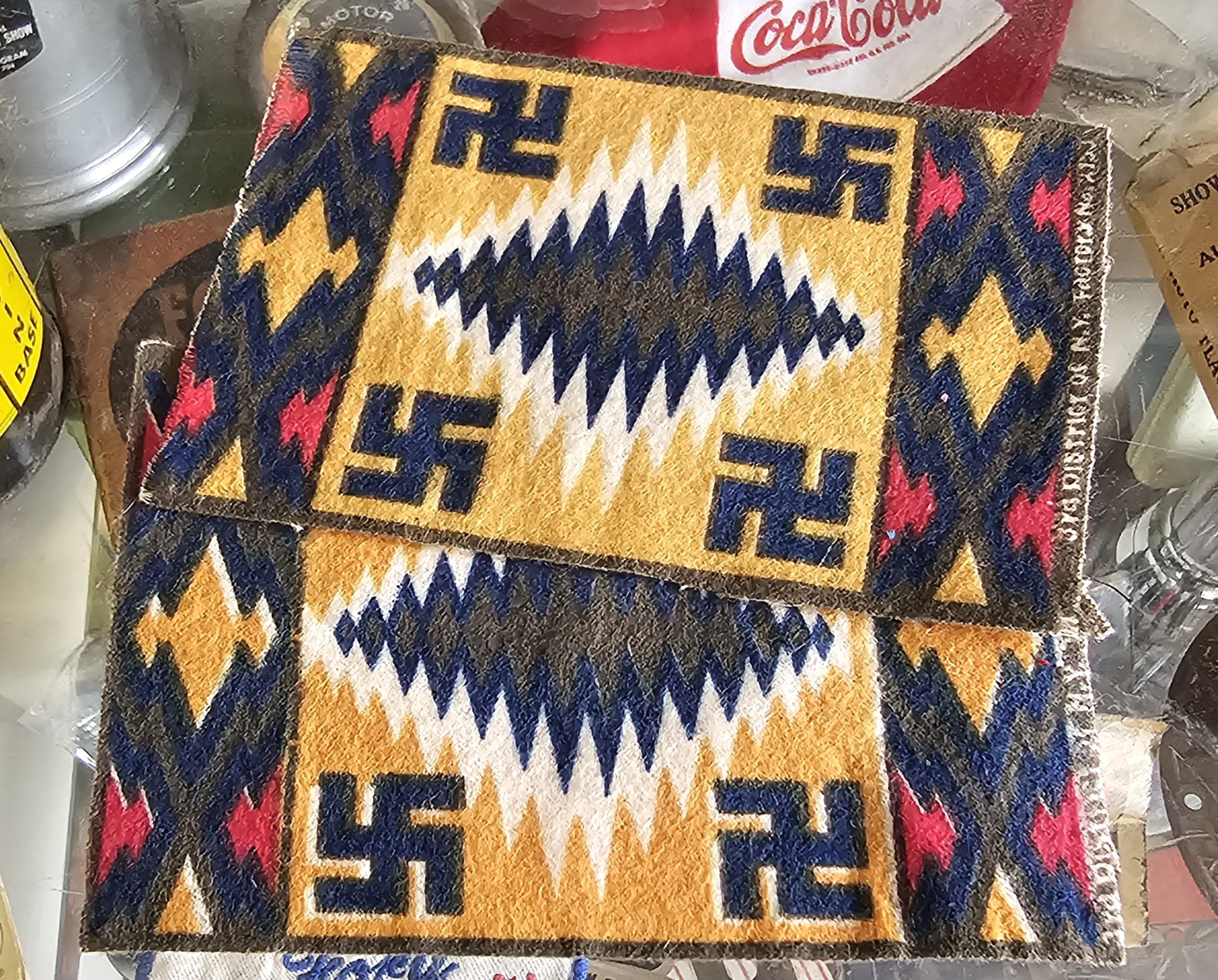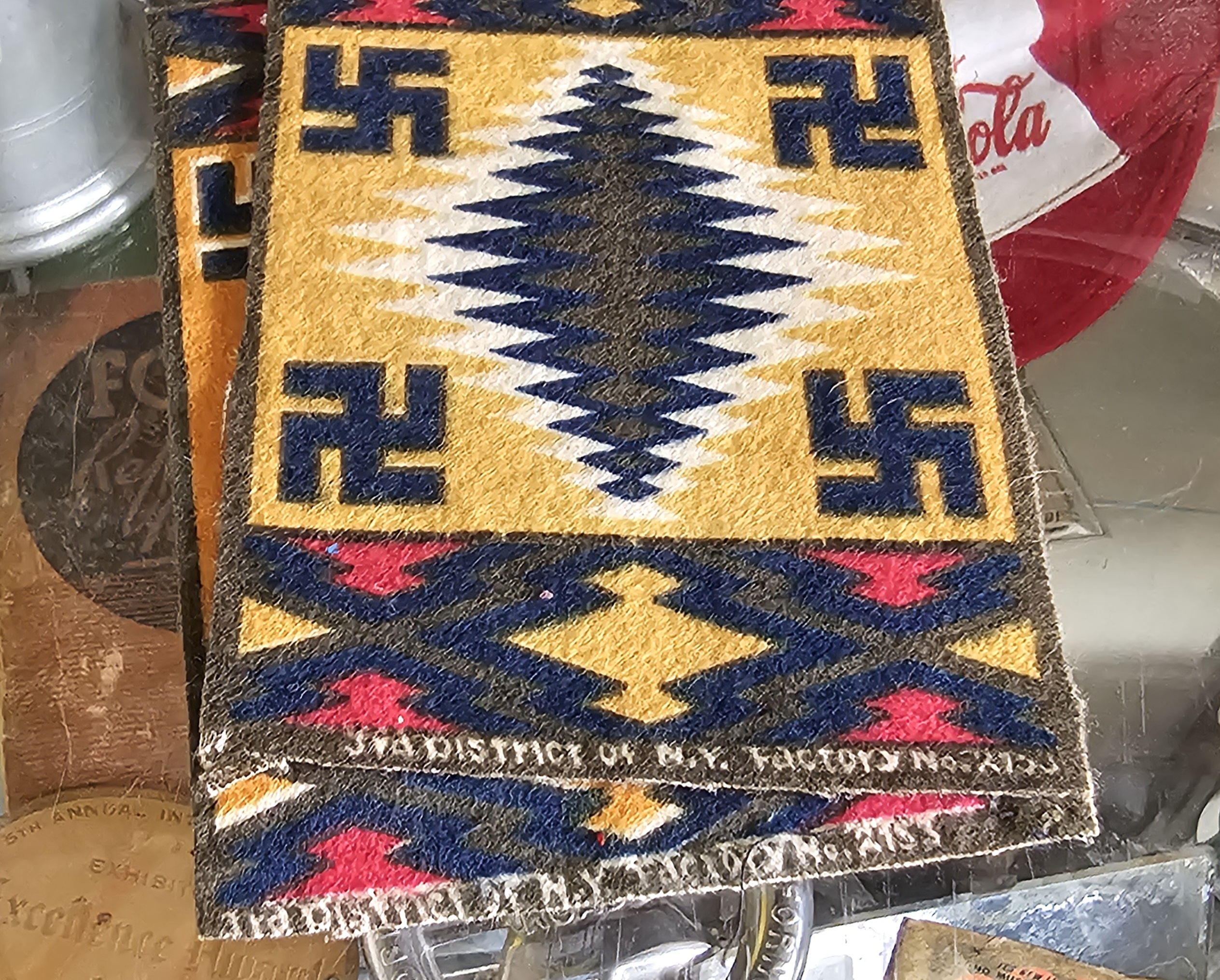 Navajo Swastika Tobacco Felt Rug Pair These are 2 matching rugs. Measure 5 1/4" X 3 1/2" and were made in 3rd District Of N.Y. We also offer a rug set (different colors). Tobacco felts, also known as tobacco rugs, were small pieces of fabric given away by tobacco companies as incentive for buying their product. These small pieces of fabric were often used for quilts and pillows. Felts were replaced by coupons around 1916.