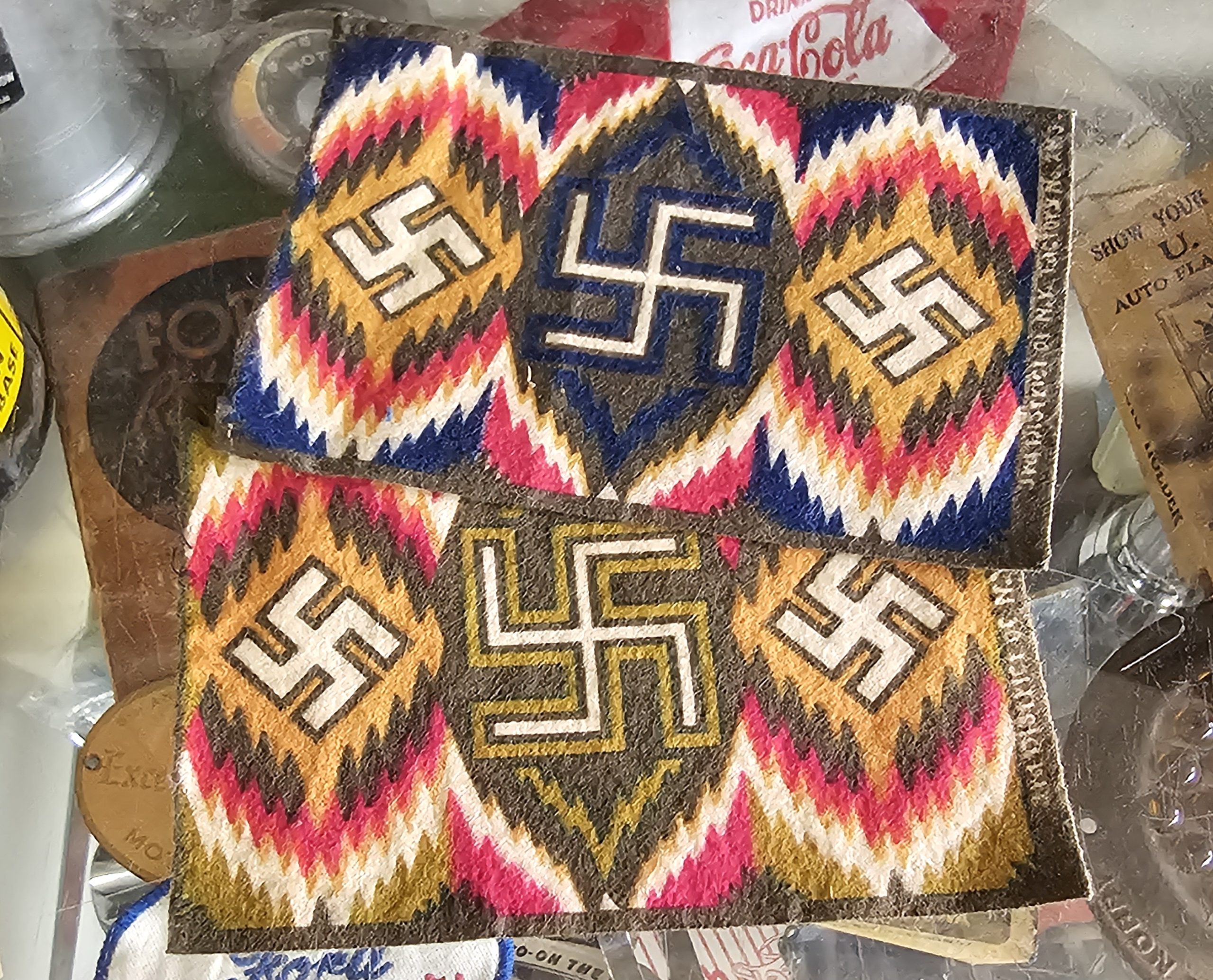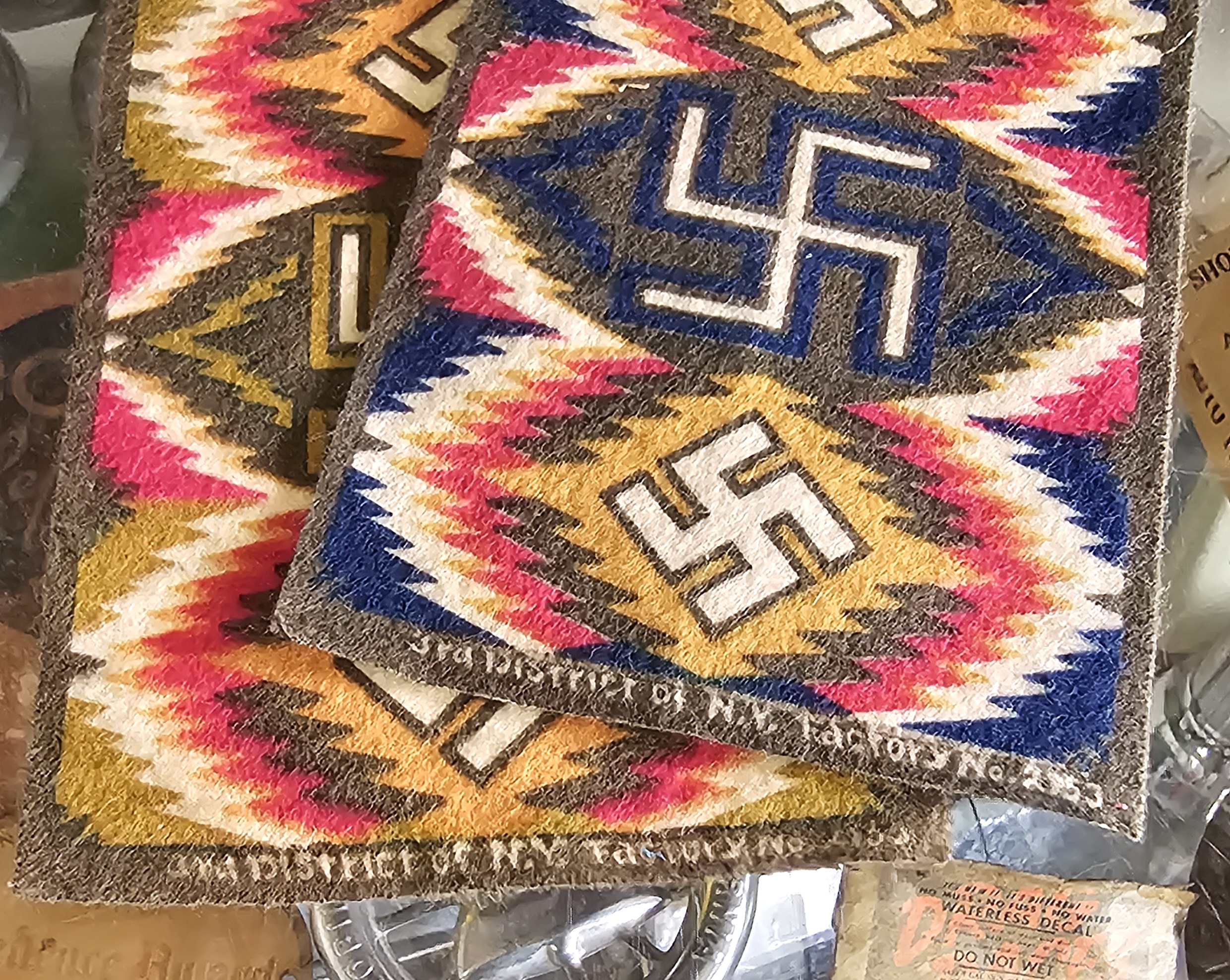 Navajo Swastika Tobacco Felt Rug Set These are 2 same designs in different colors. Measure 5 1/4" X 3 1/2" and were made in 3rd District Of N.Y. We also offer a rug pair (both same) Tobacco felts, also known as tobacco rugs, were small pieces of fabric given away by tobacco companies as incentive for buying their product. These small pieces of fabric were often used for quilts and pillows. Felts were replaced by coupons around 1916.