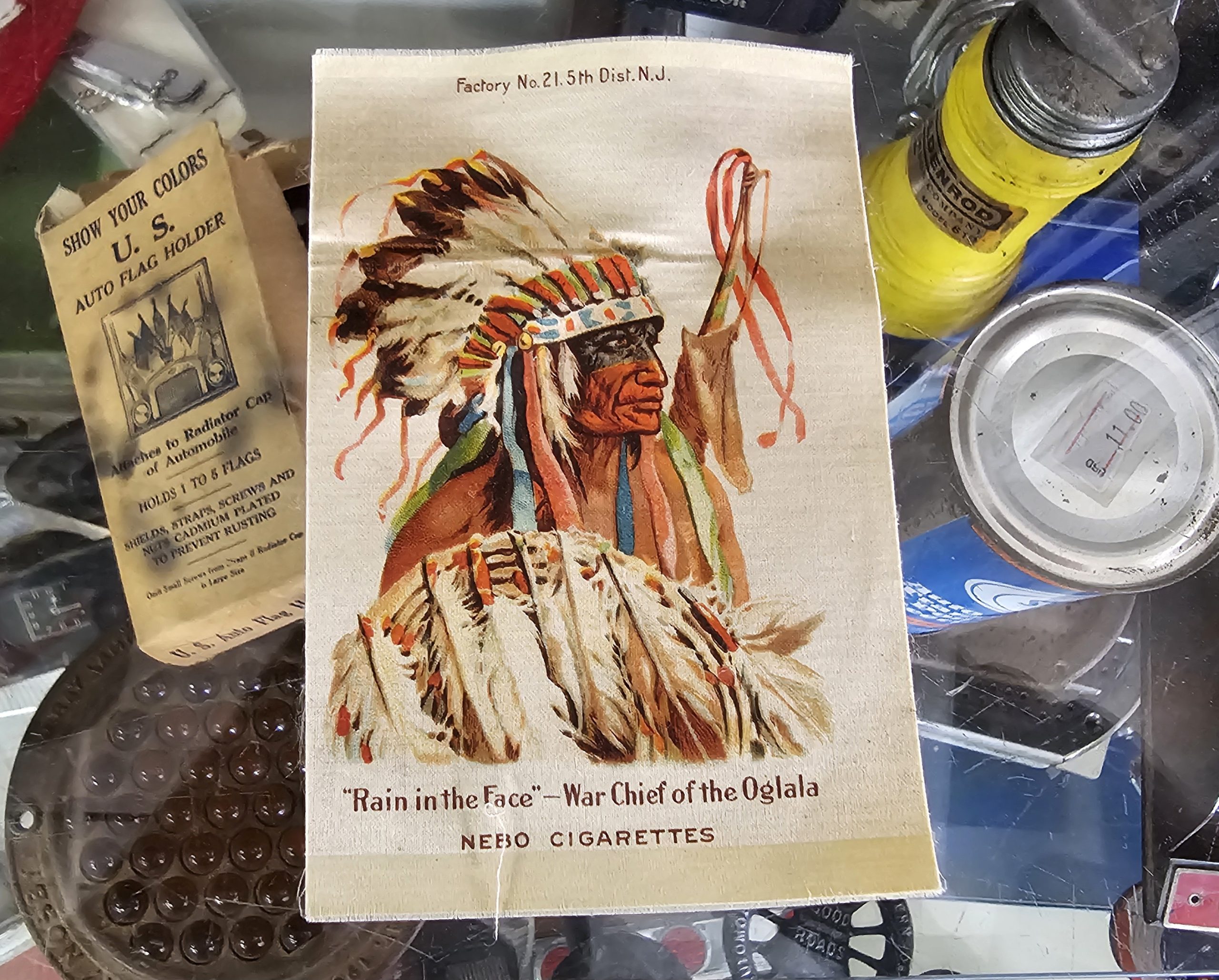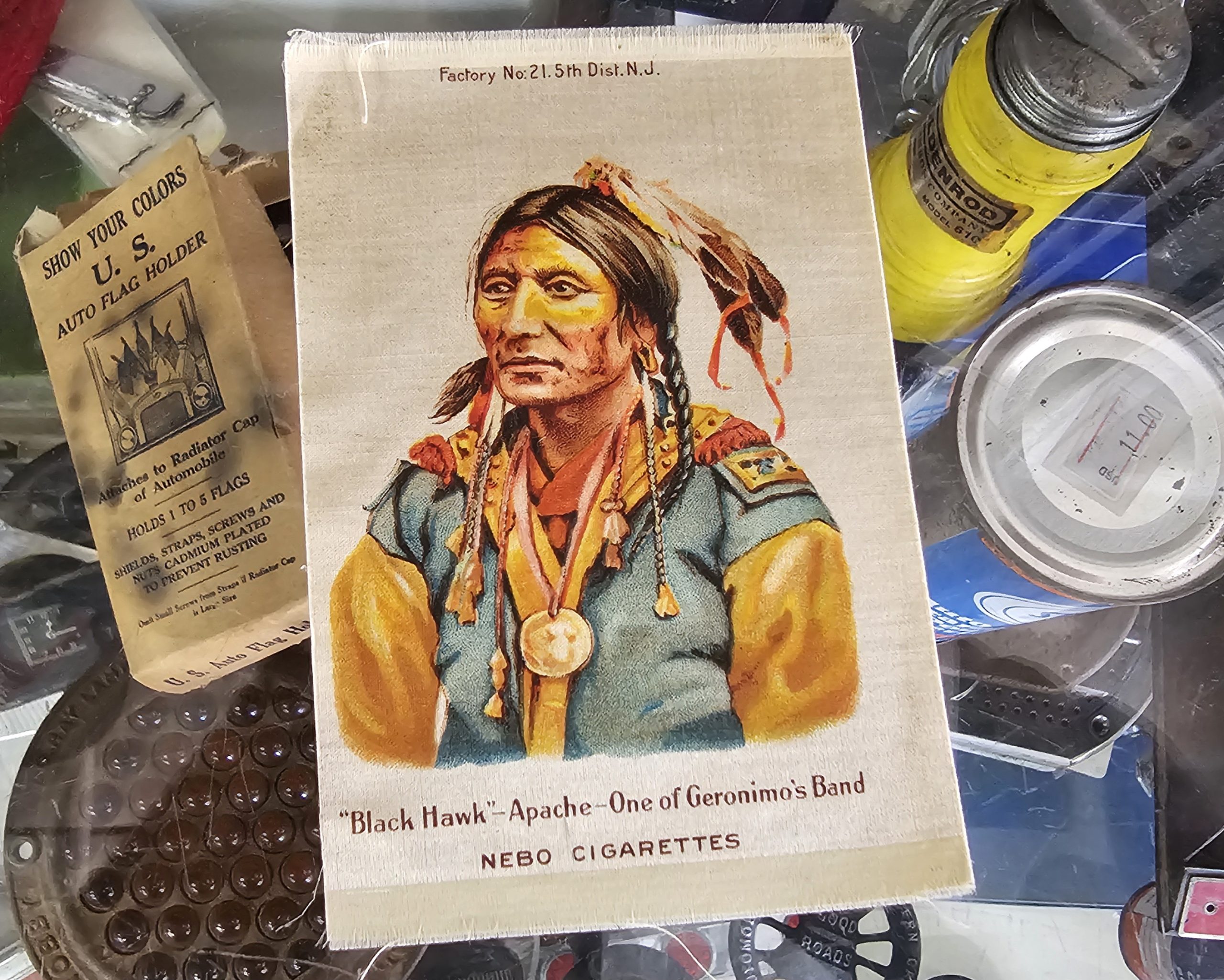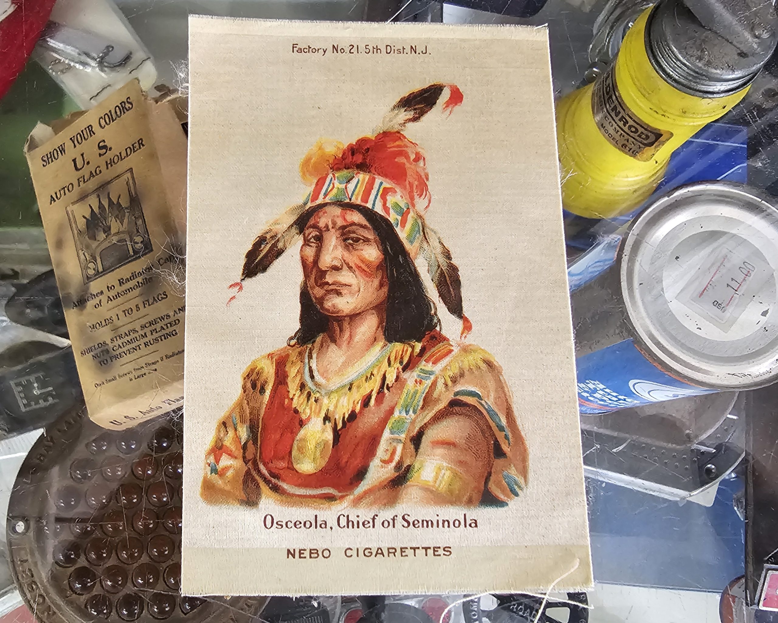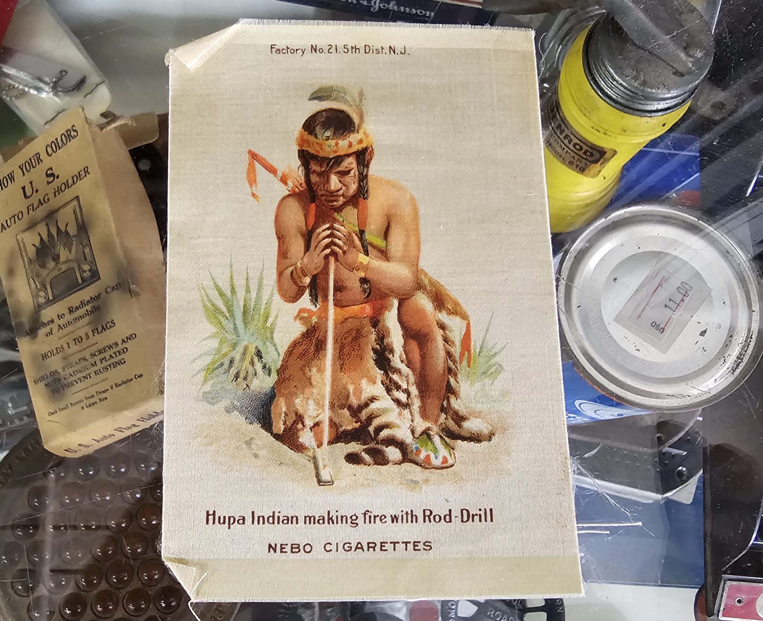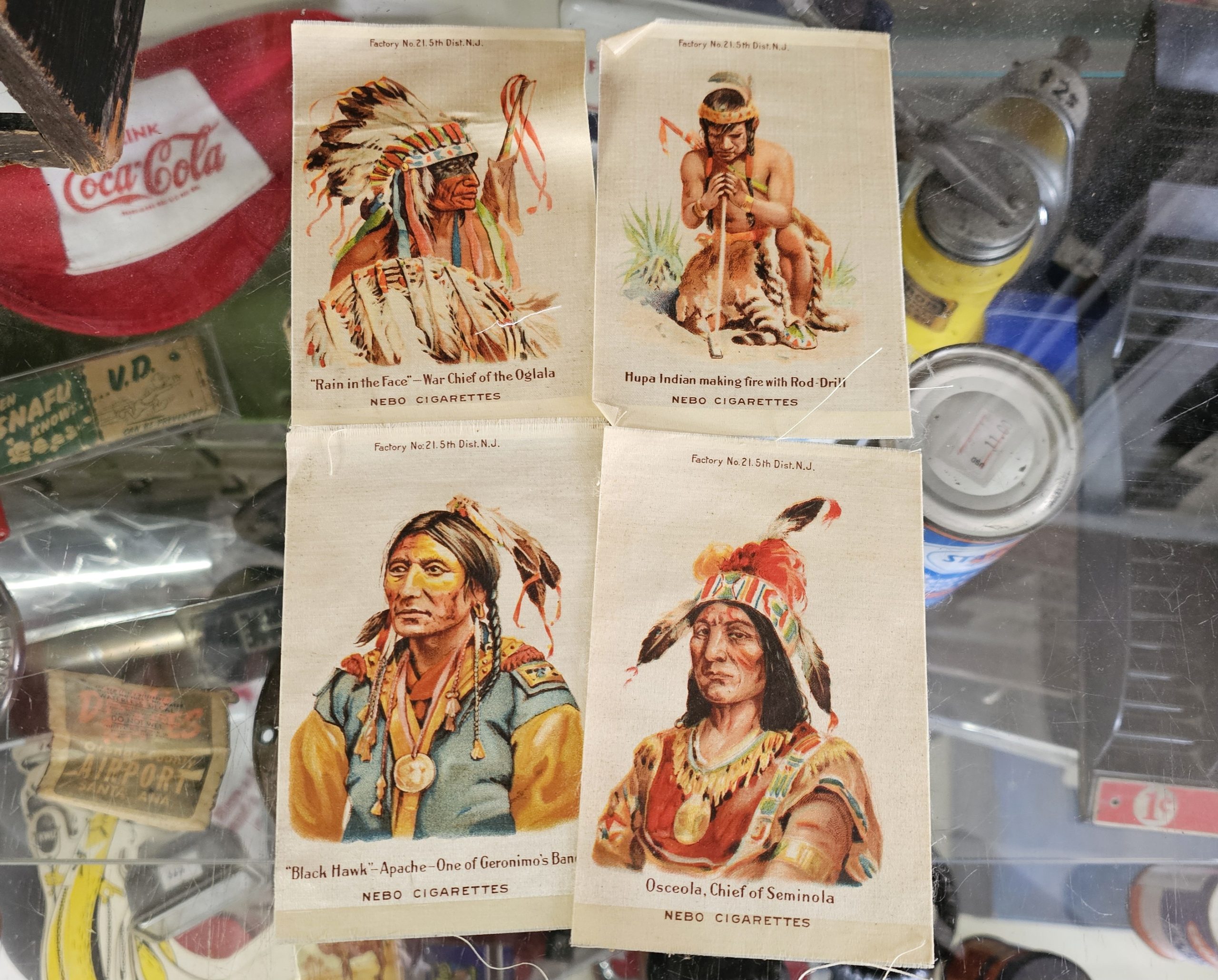 Nebo Cigarettes Indian Tobacco Felt Rugs These are 4 different Native American designs. Measure 5" X 3 1/4" and were made in Factory No. 21 5th Dist. of N.J. Tobacco felts, also known as tobacco rugs, were small pieces of fabric given away by tobacco companies as incentive for buying their product. These small pieces of fabric were often used for quilts and pillows. Felts were replaced by coupons around 1916.