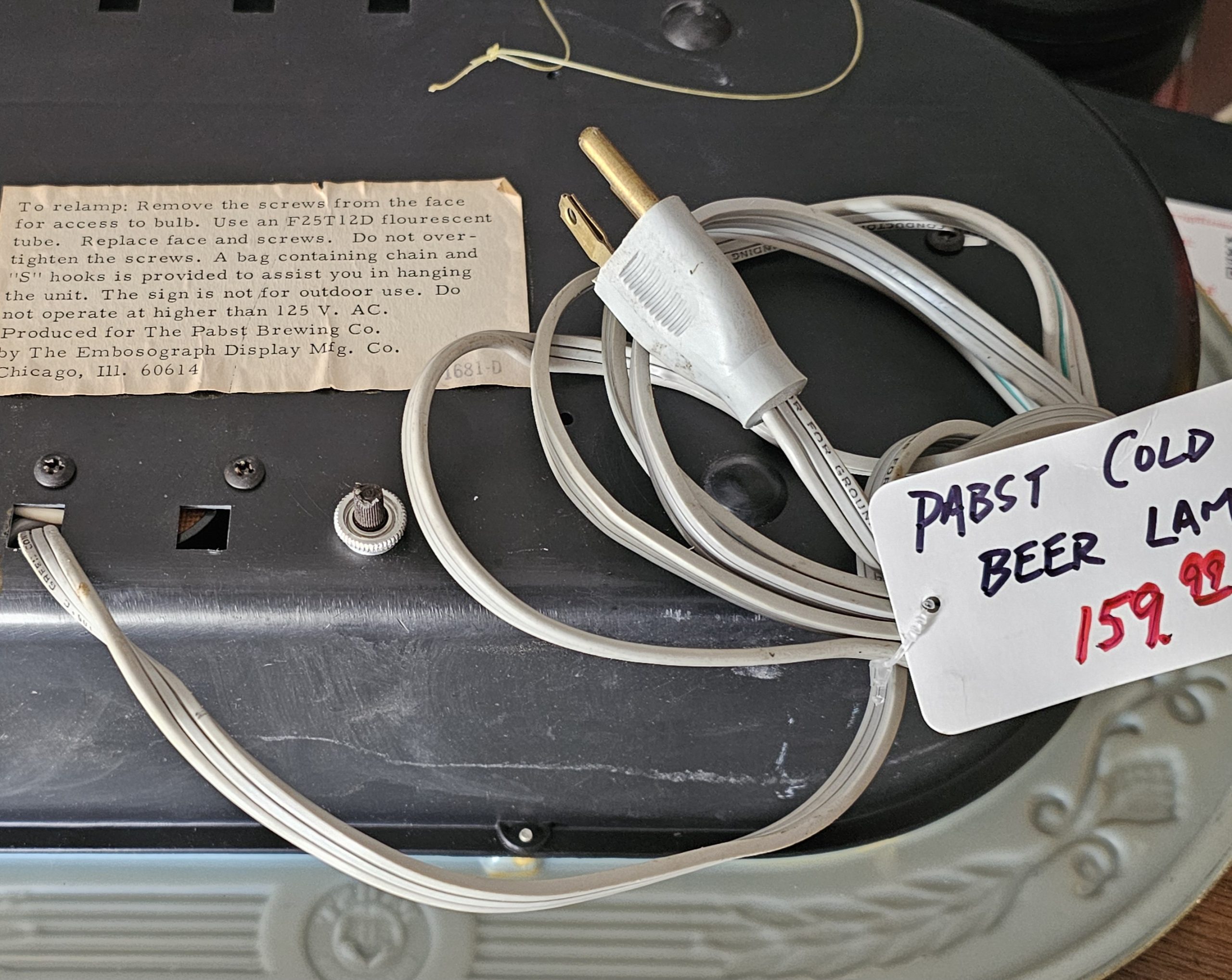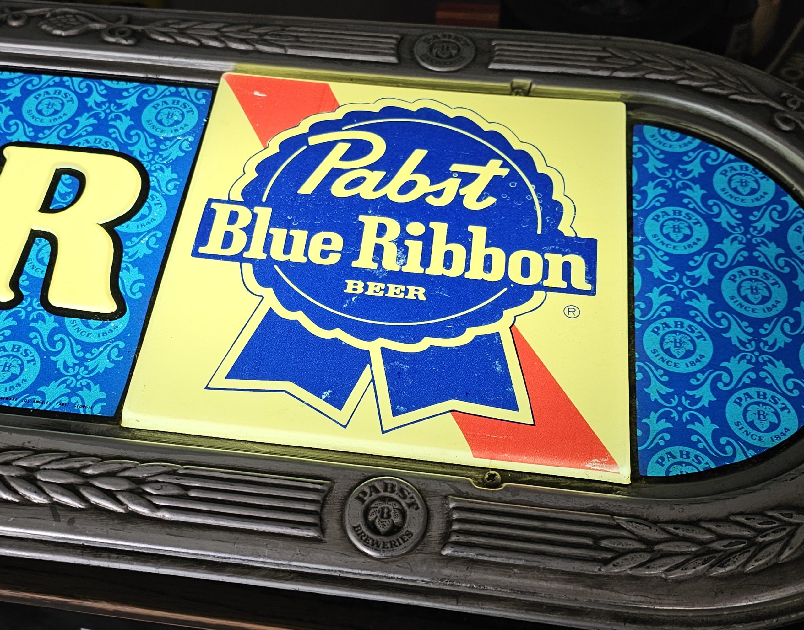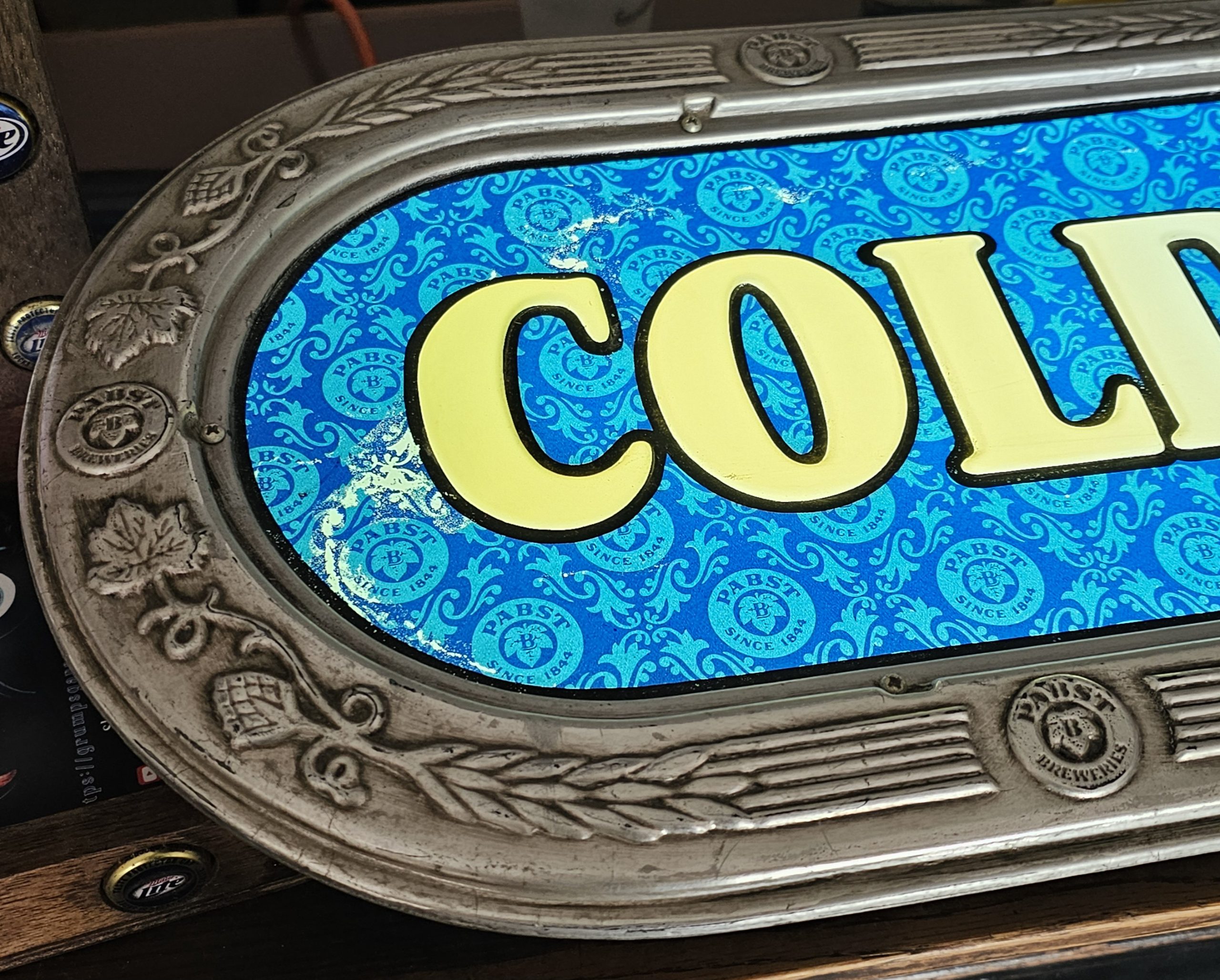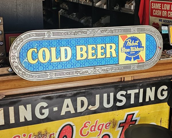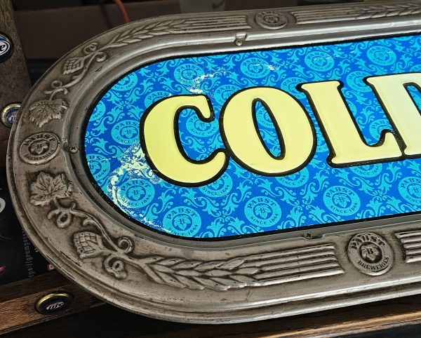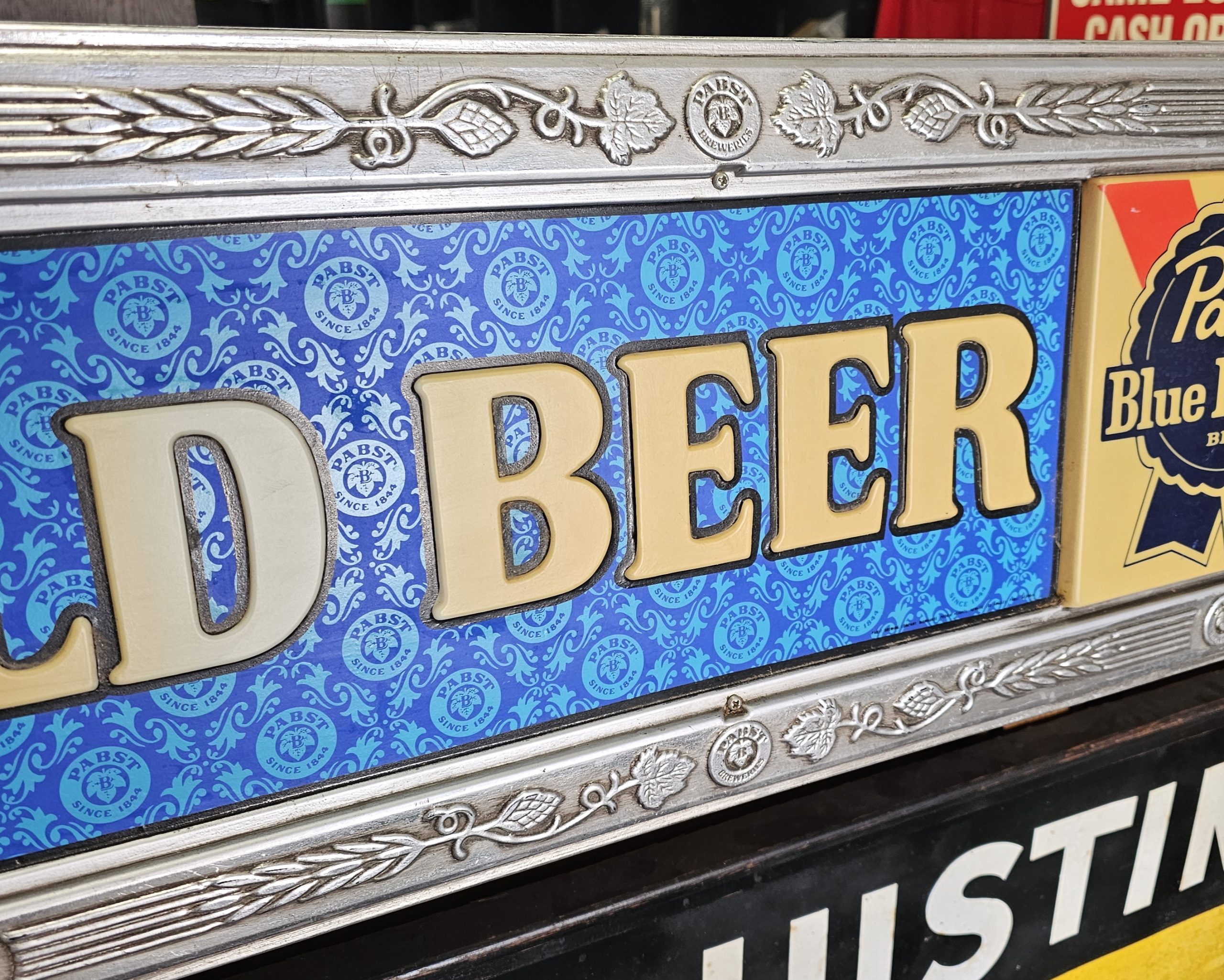 Pabst Blue Ribbon Cold Beer Bar Lamp  This is a lighted late 1960s Pabst Beer Sign.  It lights up nicely, has a crack to the right of screw hole of right side of ribbon pictured below.  Some slight discoloring to white lettering, does show some age.  Has hanging brackets, but no chain.  Great shape for over 50+ years.  Website only (GV).  **The video below is of a previous lamp, pictures are up to date for this particular lamp**