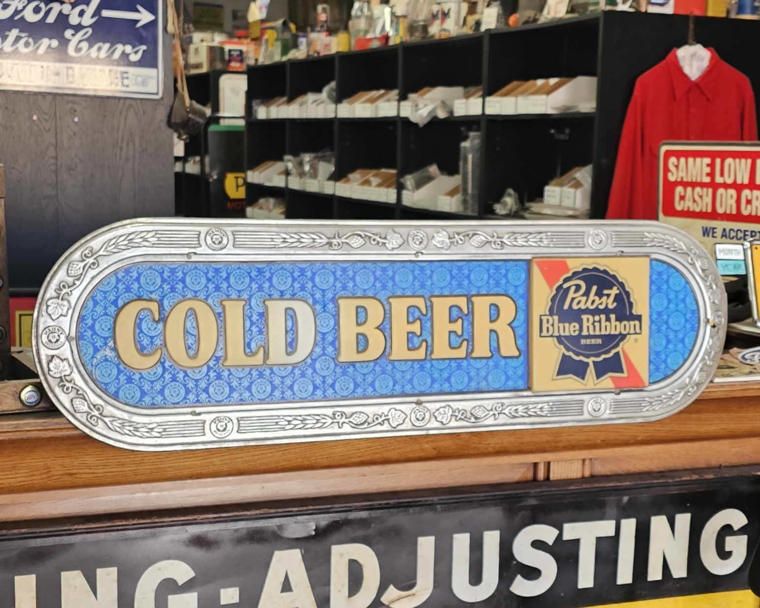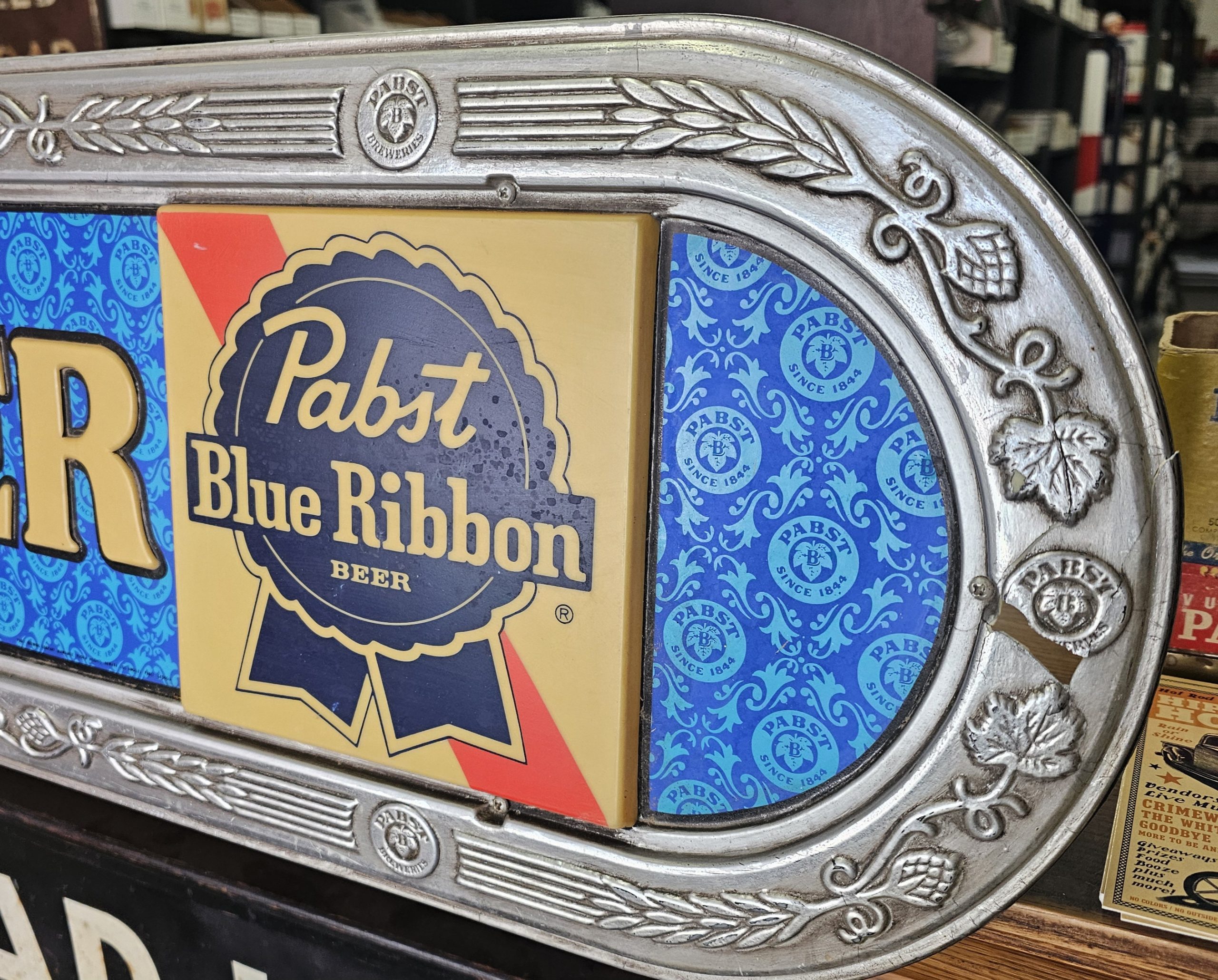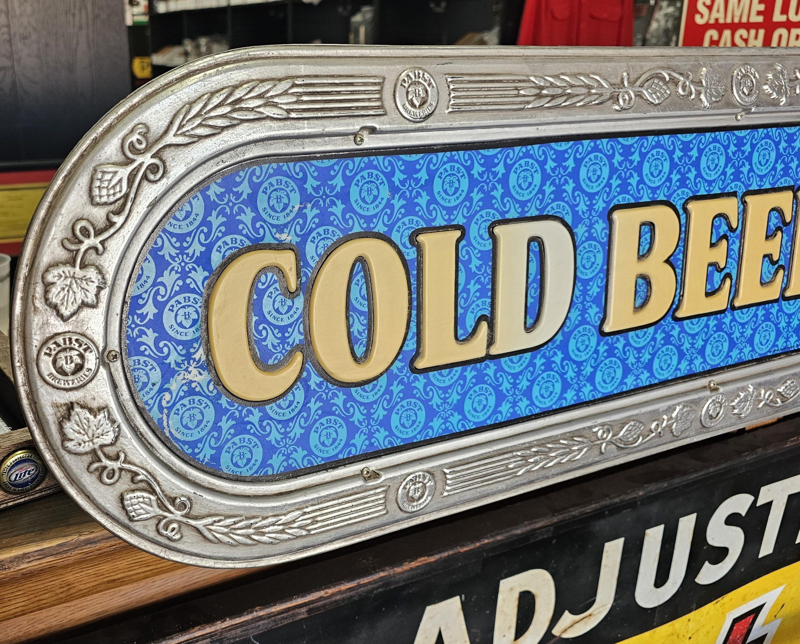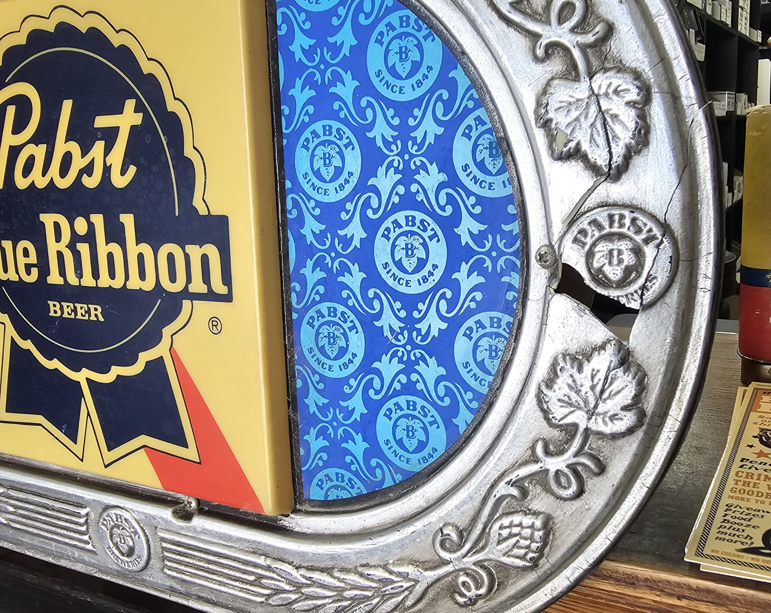 Pabst Blue Ribbon Cold Beer Bar Lamp  This is a lighted late 1960s Pabst Beer Sign.  It lights up nicely, has a crack to the right of screw hole of right side of ribbon pictured below.  Some slight discoloring to white lettering, does show some age.  Has hanging brackets, but no chain.  Great shape for over 50+ years.  Website only (GV).  **The video below is of a previous lamp, pictures are up to date for this particular lamp**