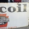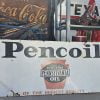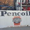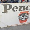 Pencoil Oil Porcelain Sign LOCAL PICKUP ONLY, OR BUYER ARRANGED SHIPPING. Here's a really rare, Pencoil double sided porcelain sign measuring 60" X 28". Pencoil was the predecessor to Pennzoil, and that was the name it went by when it was first invented. Somewhere around 1928 the name was officially changed from 'Pencoil' to 'Pennzoil'. This particular sign is pictured in as found condition. As you see graphics remain nice while there are some damaged corners and mounting holes and a bend at top and one at bottom.