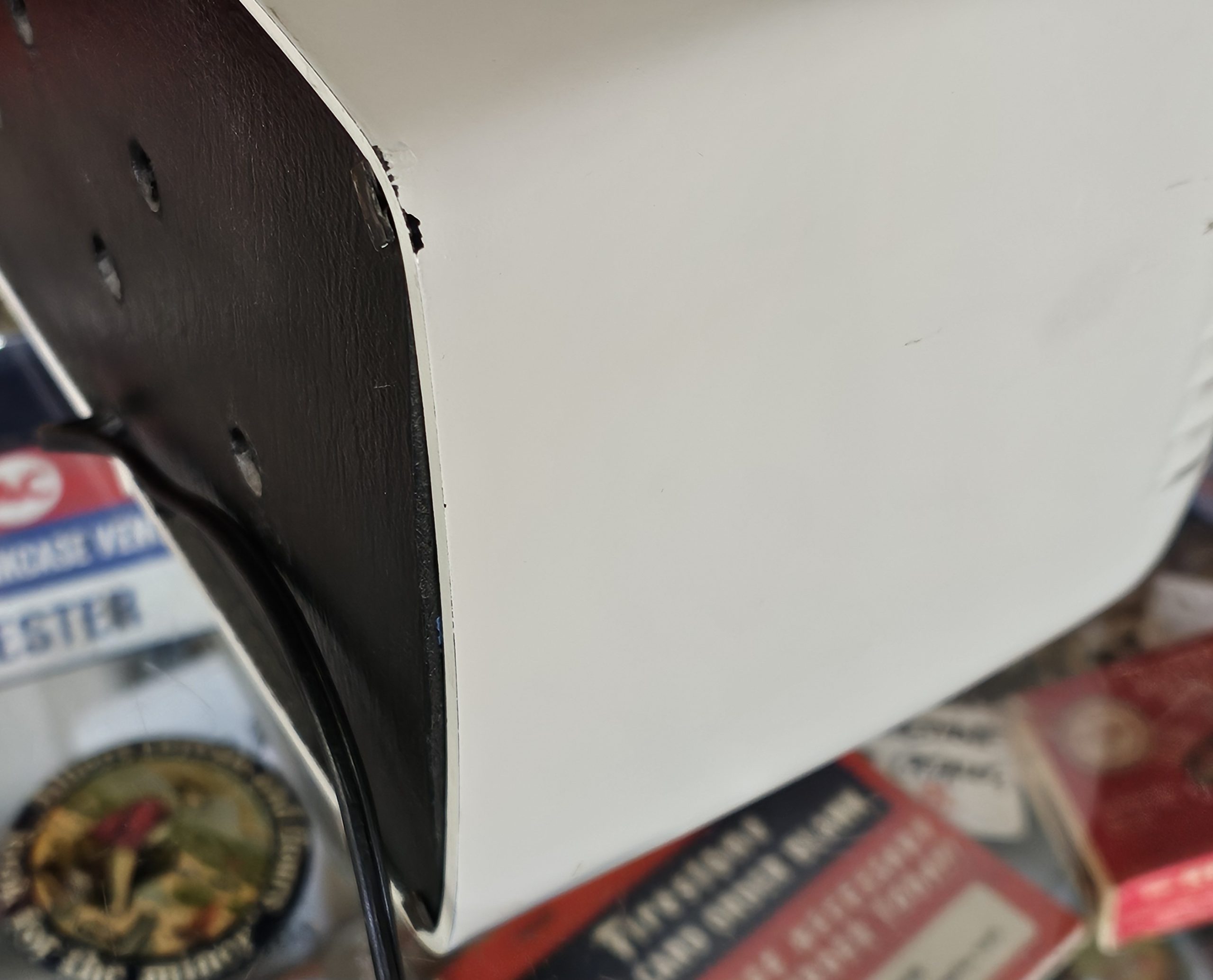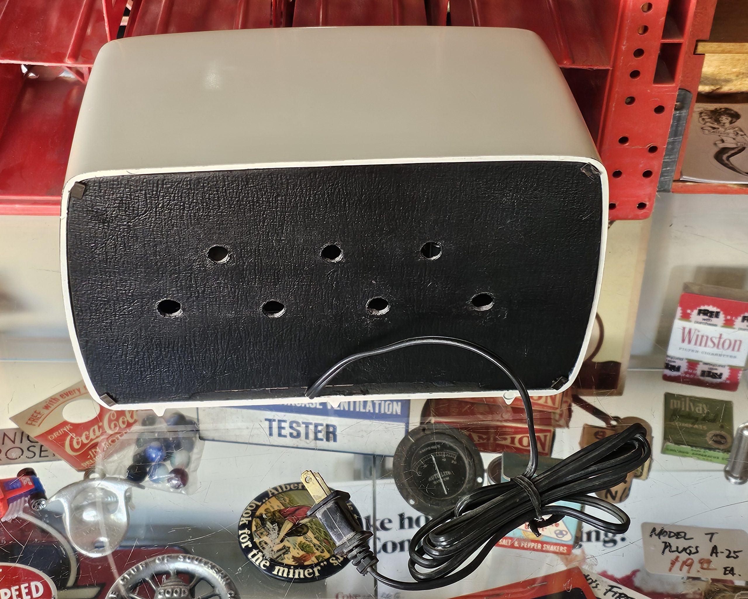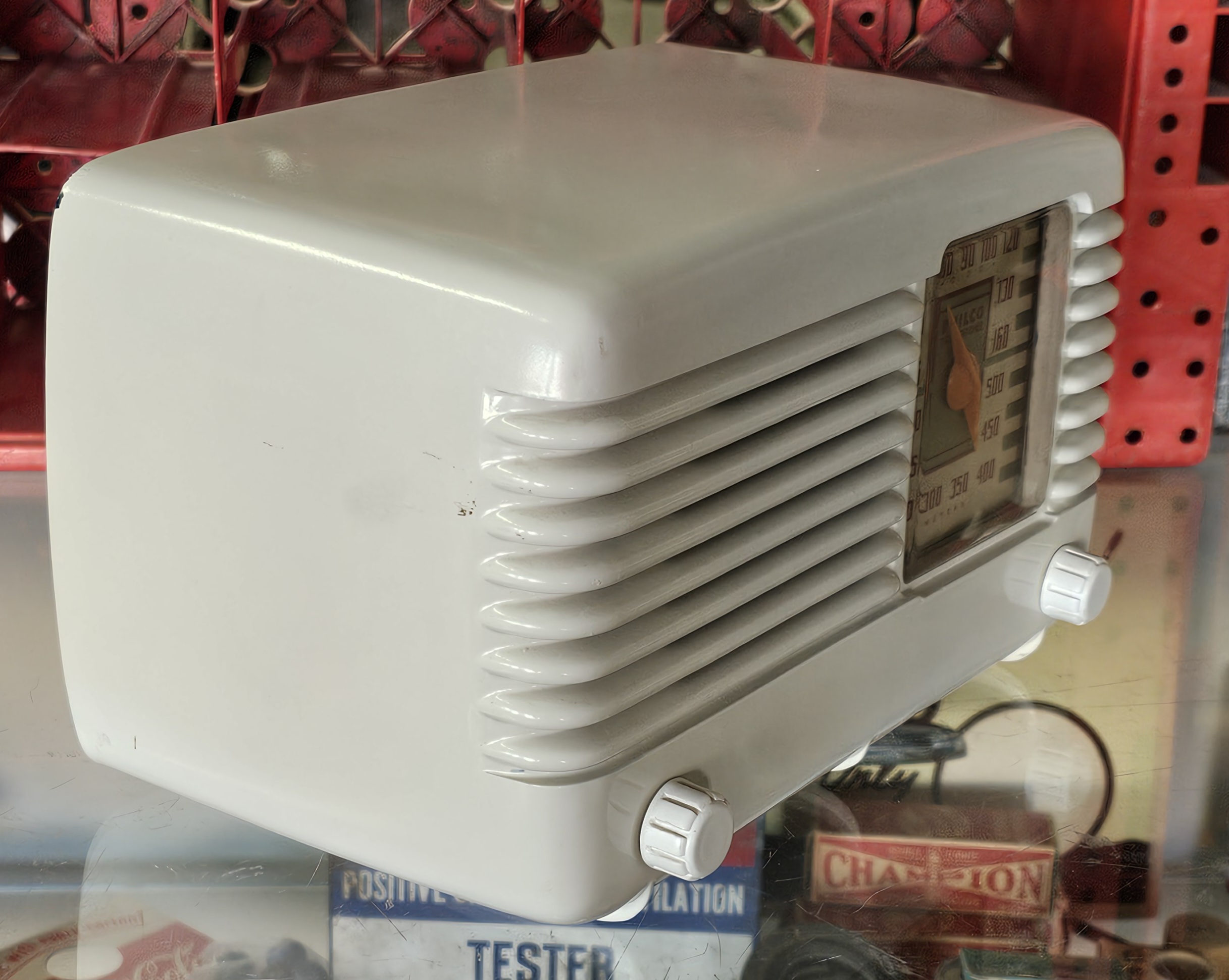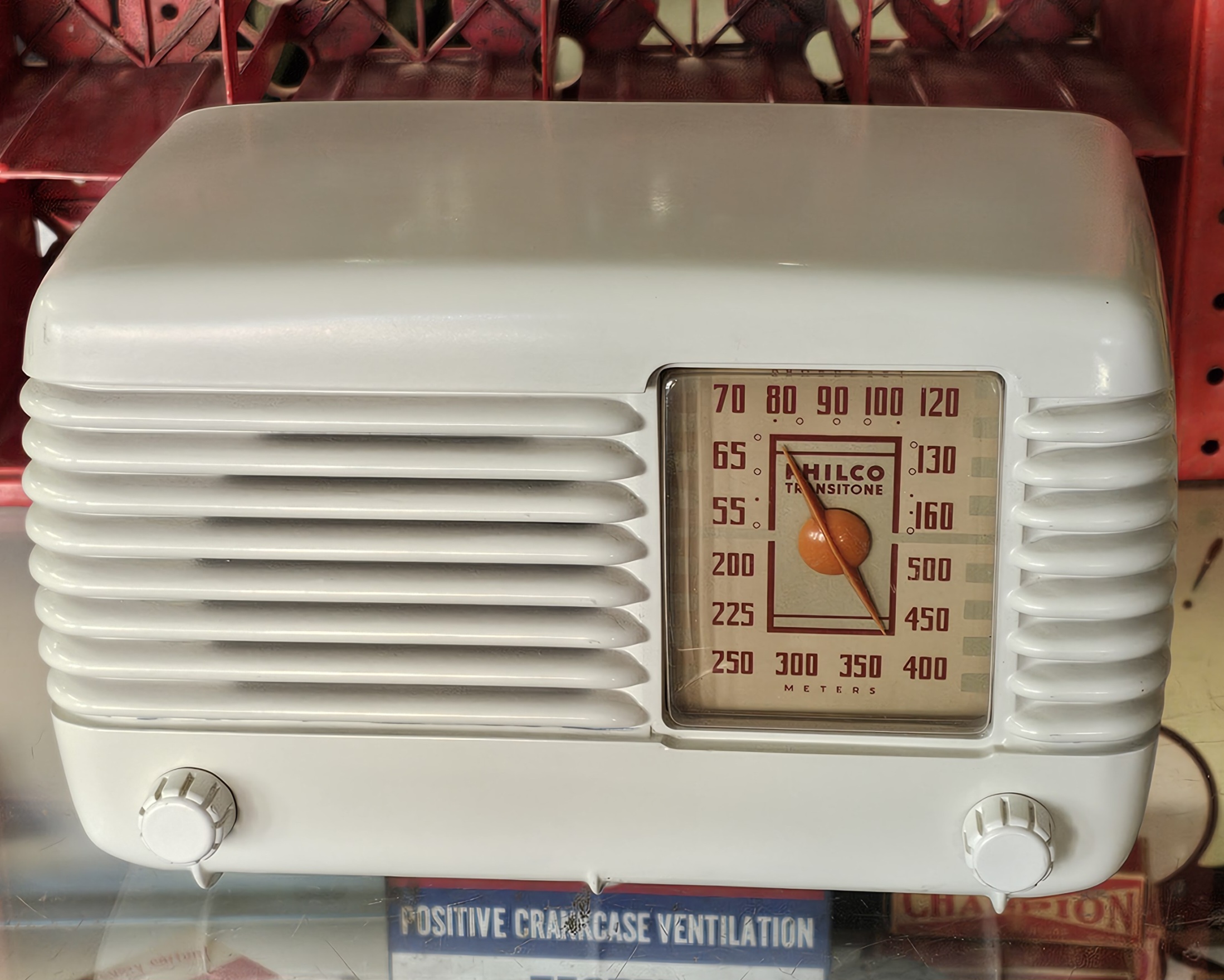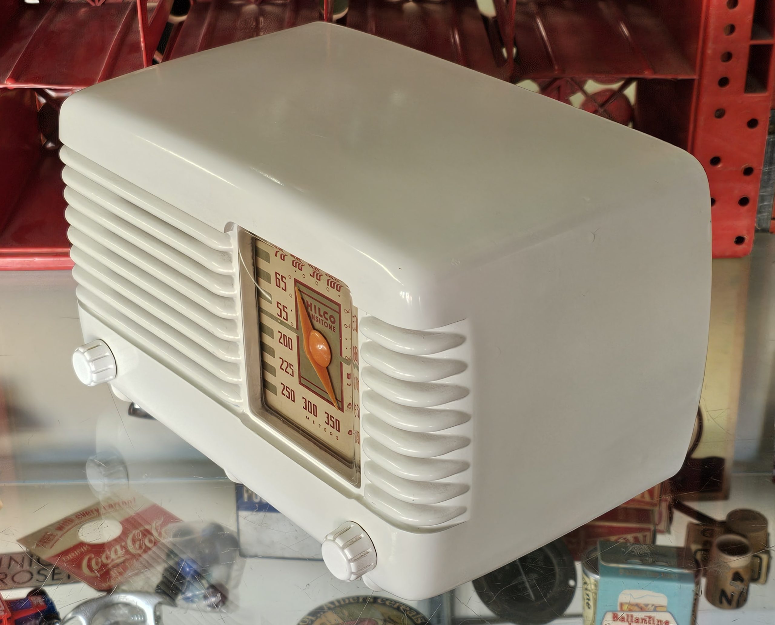 Philco Transitone 48-200 Bakelite Radio  This model number is from 1948.  Well known because of the white Bakelite case with wraparound louvers, giving it a simple and elegant look.  Has been restored, new back and electric plug.  Lights up and works beautifully.  One small scratch on left rear pictured.