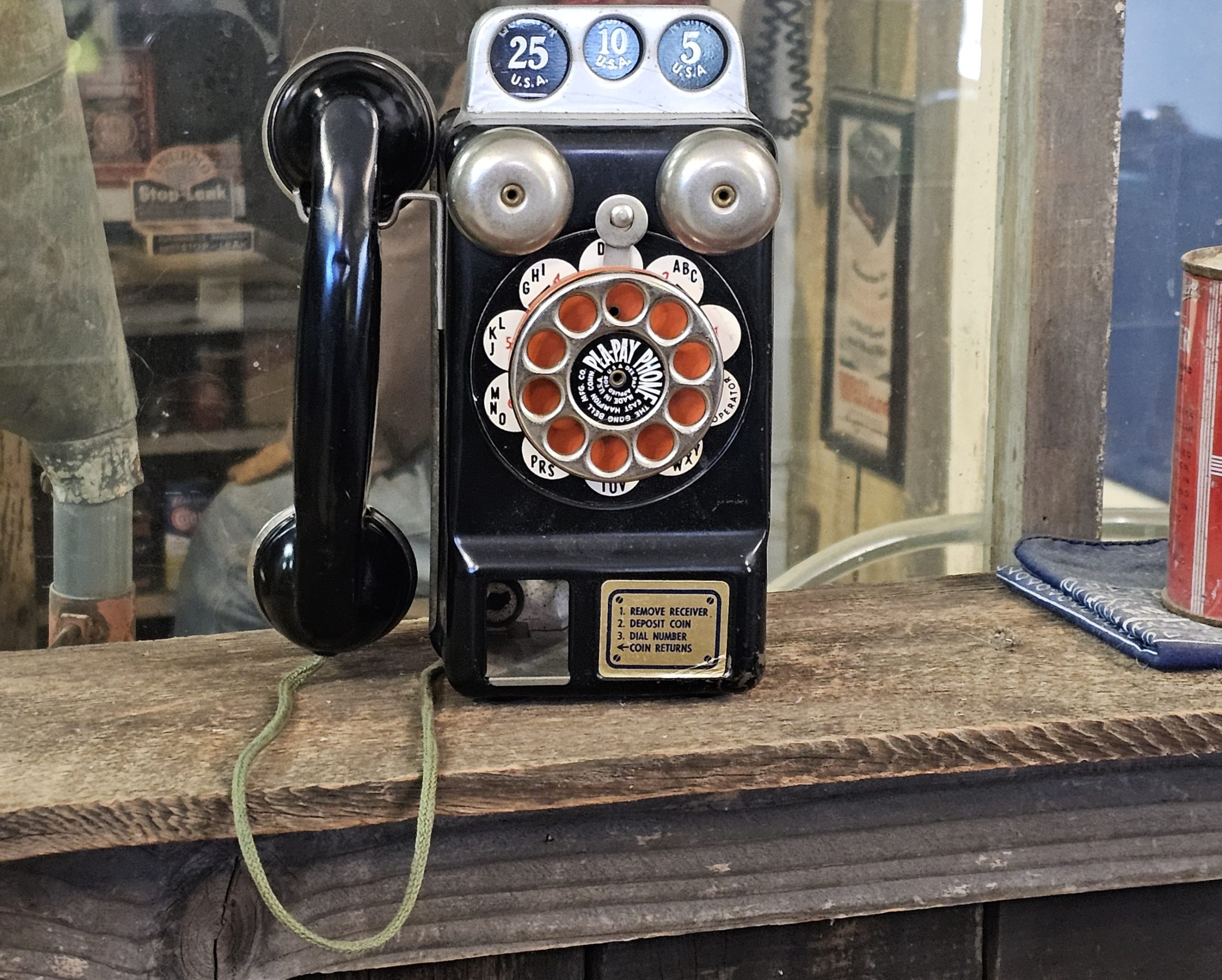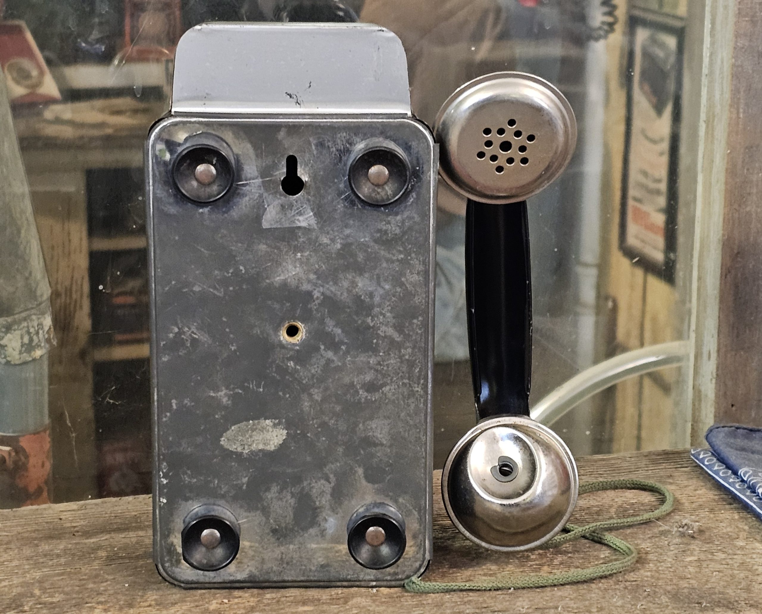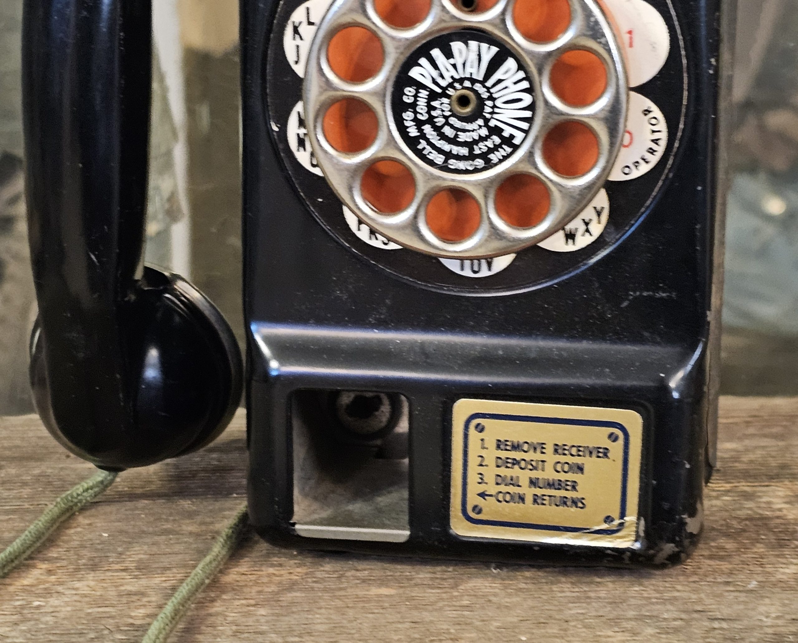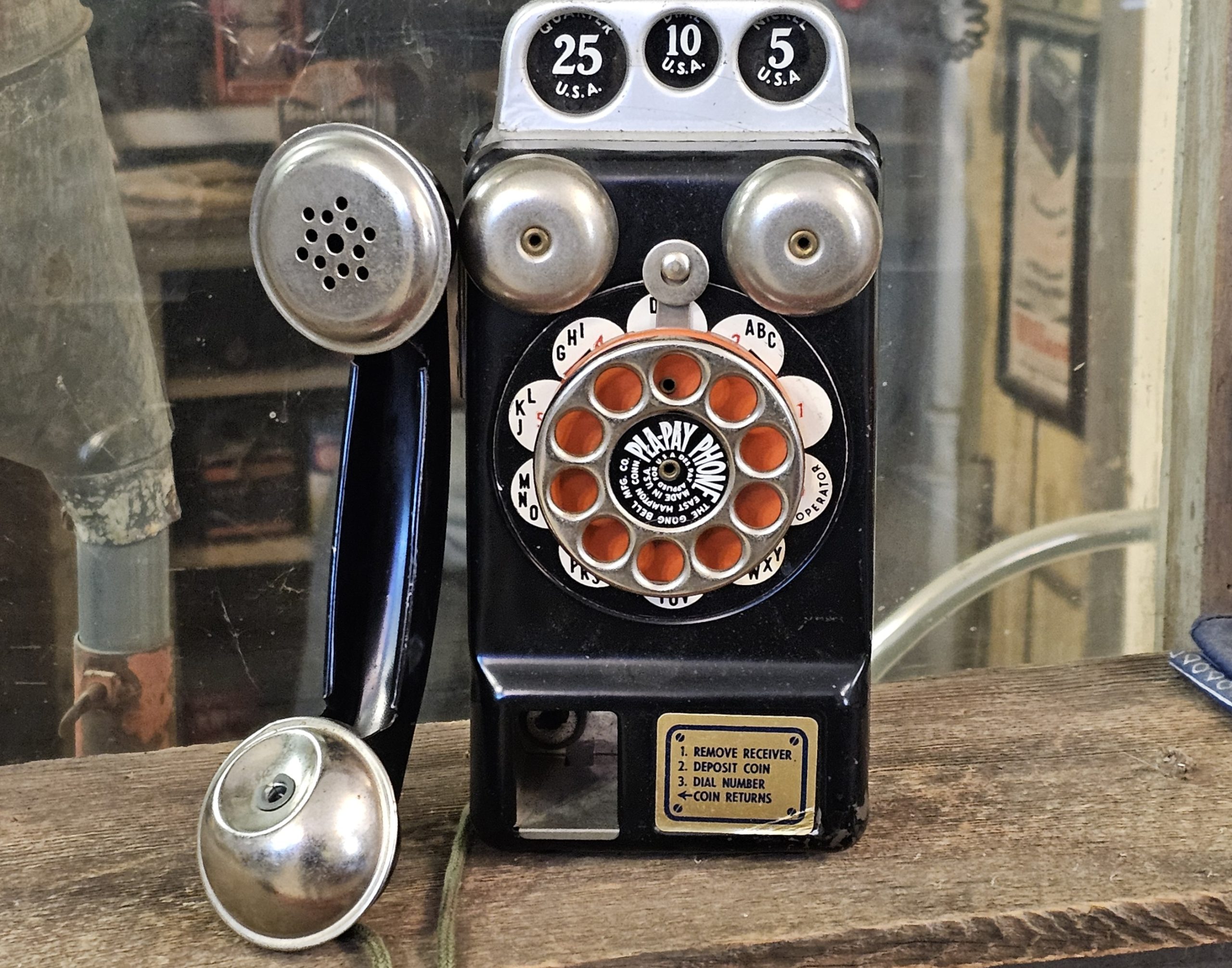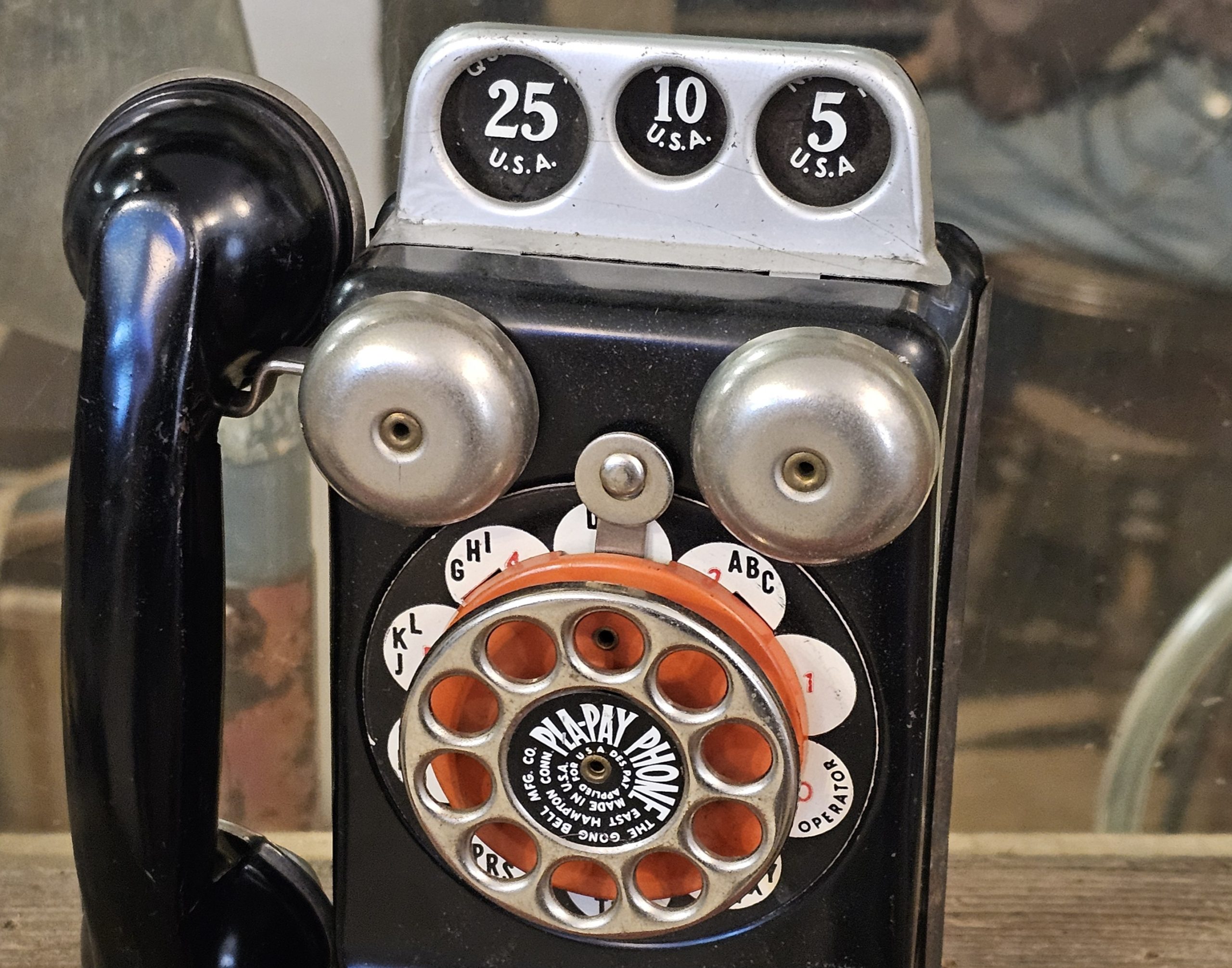Pla-Pay Phone 1940s Tin This is in fantastic condition. Tin toy telephone manufactured by the Gong Mfg. Co., known for its bell and movable receiver hook. The phone features a rotary dial and coin slots for 5, 10, and 25 cents, mimicking a real payphone. It also includes instructions for use: "1. REMOVE RECEIVER 2. DEPOSIT COIN 3. DIAL NUMBER COIN RETURNS". These toy phones were popular in the 1940s.