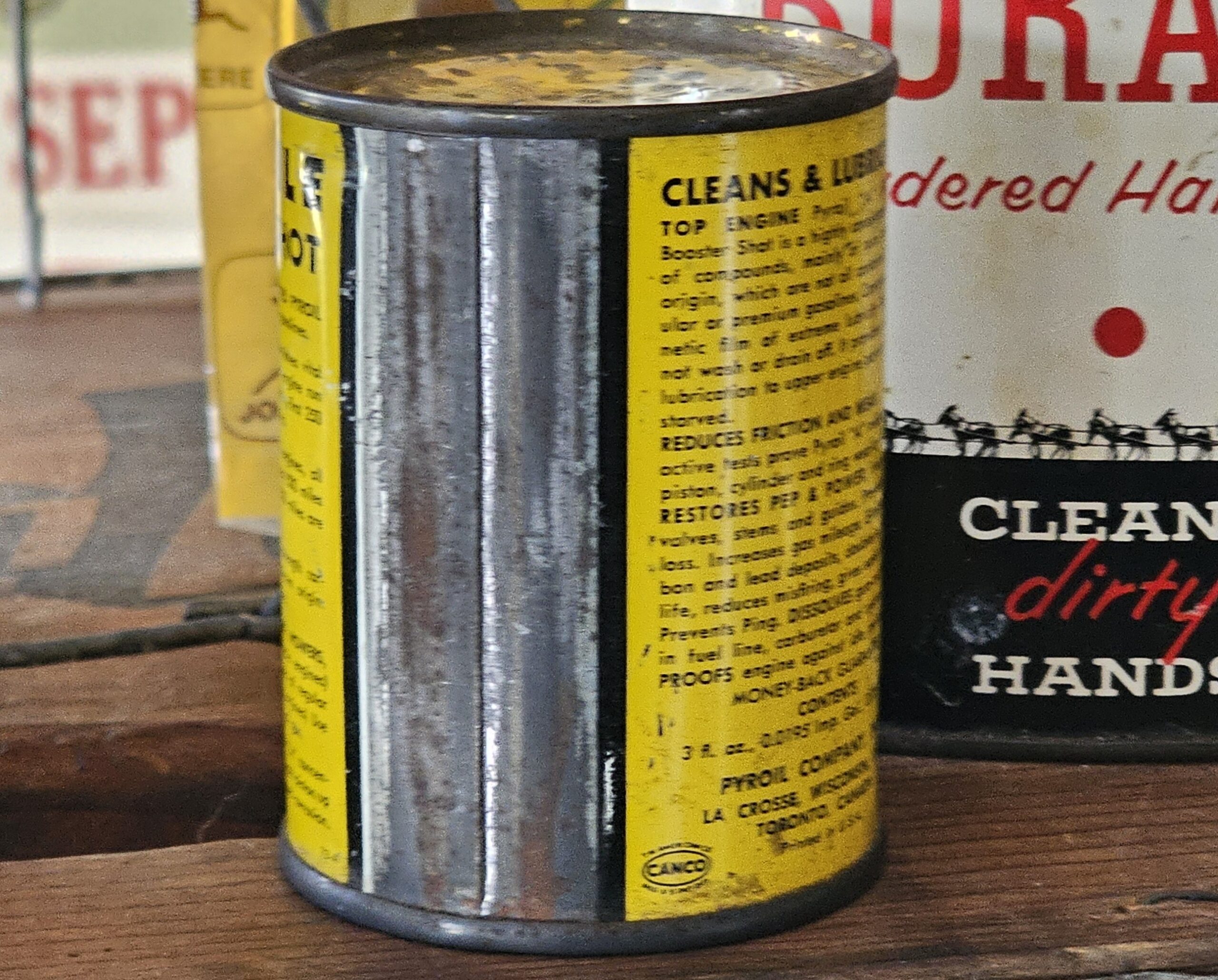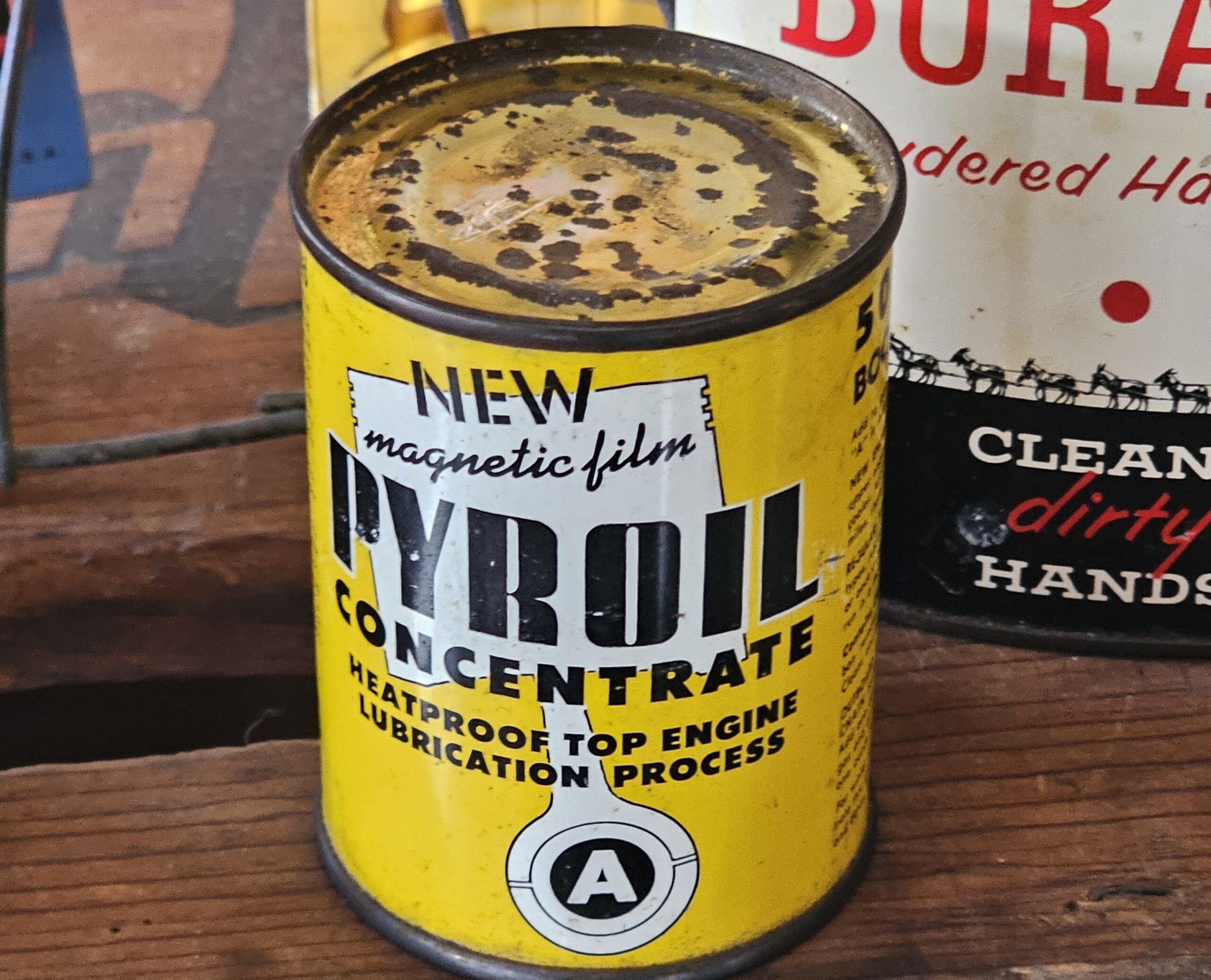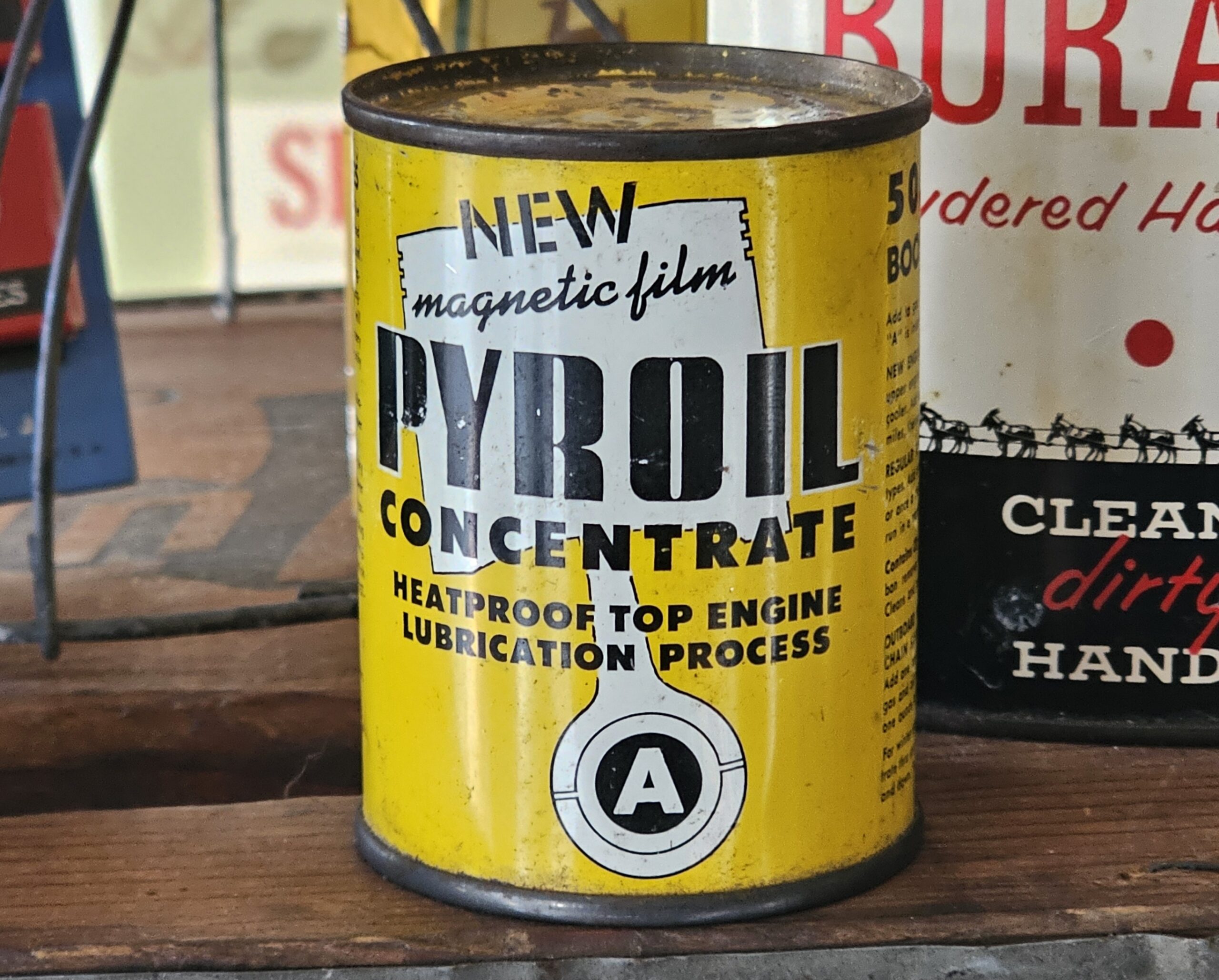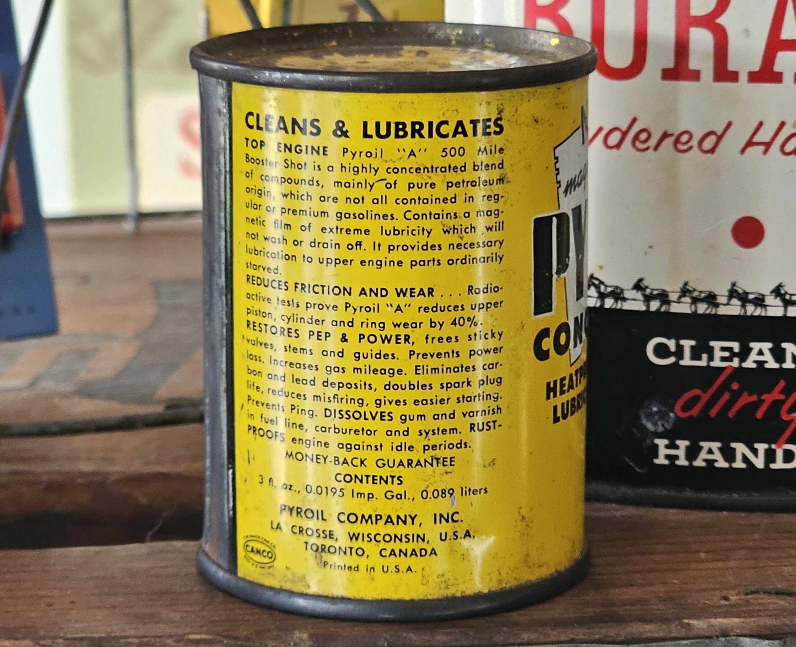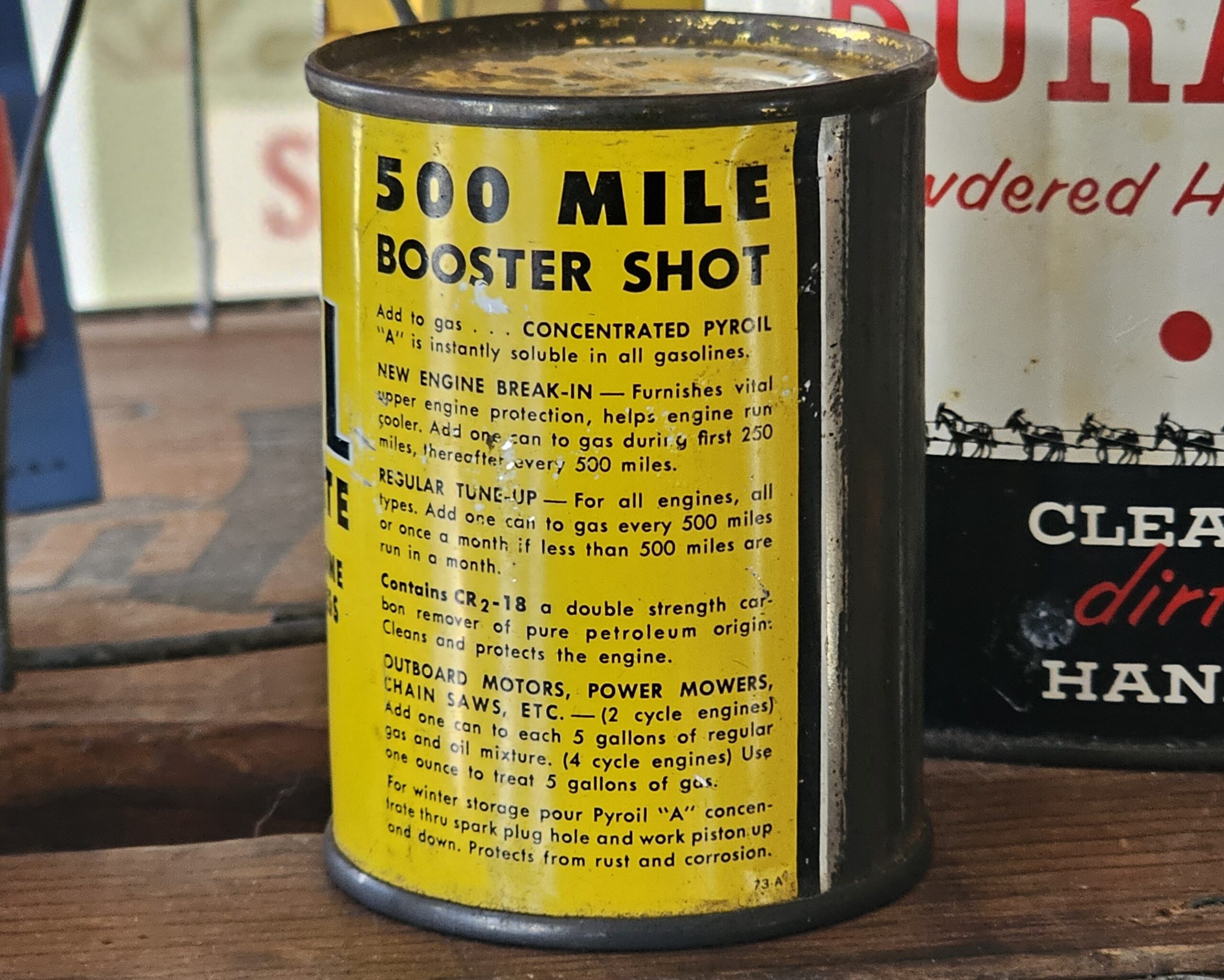 Pyroil Concentrate Fuel Additive Can  This is an early 1960s new old stock can.  Touted as a 500 Mile Booster Shot or to be used for New Engine Break-In.  Lid shows age, but very good shape overall.  4 oz. Canco can manufactured for the Pyroil Company, Inc.